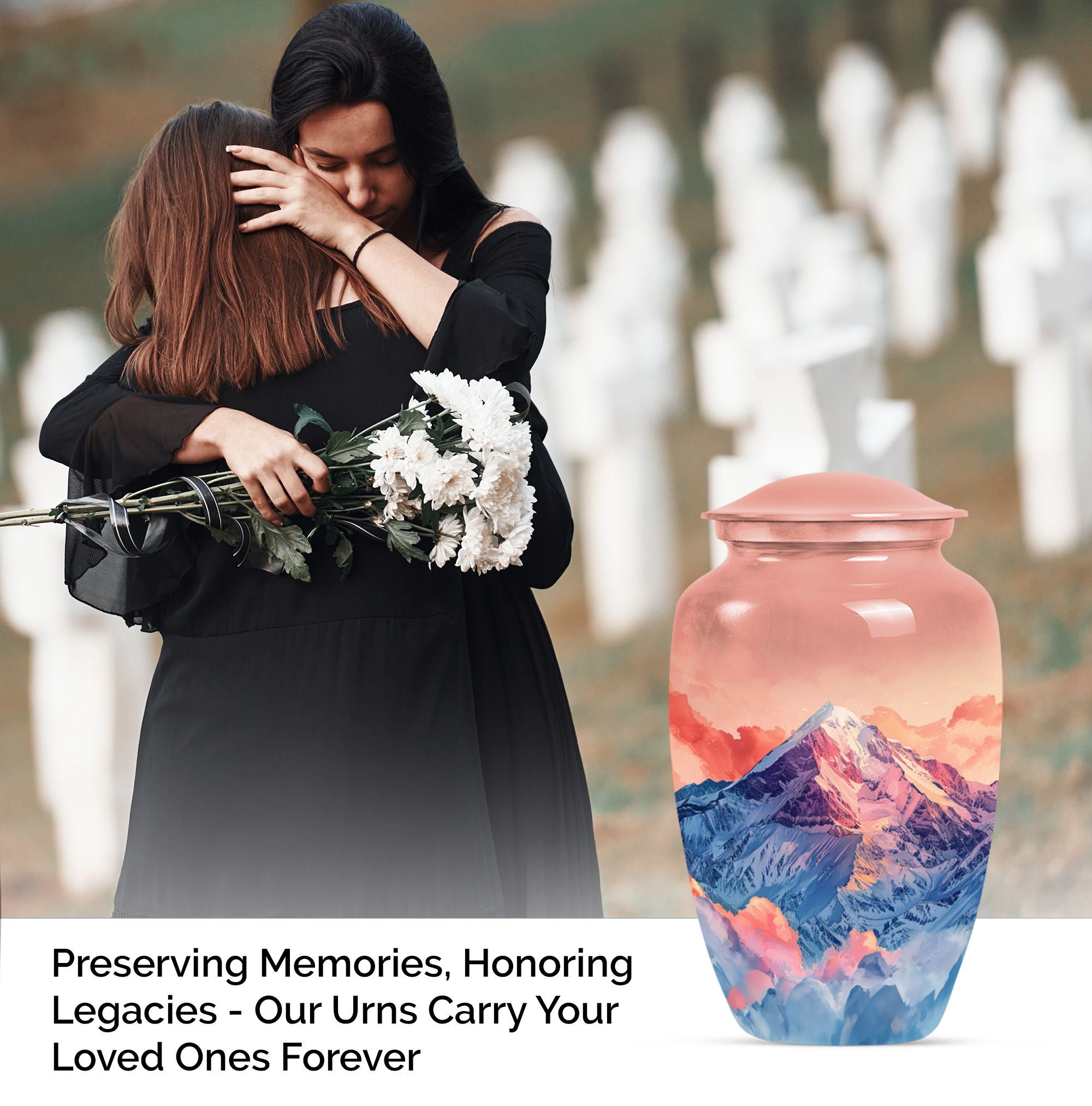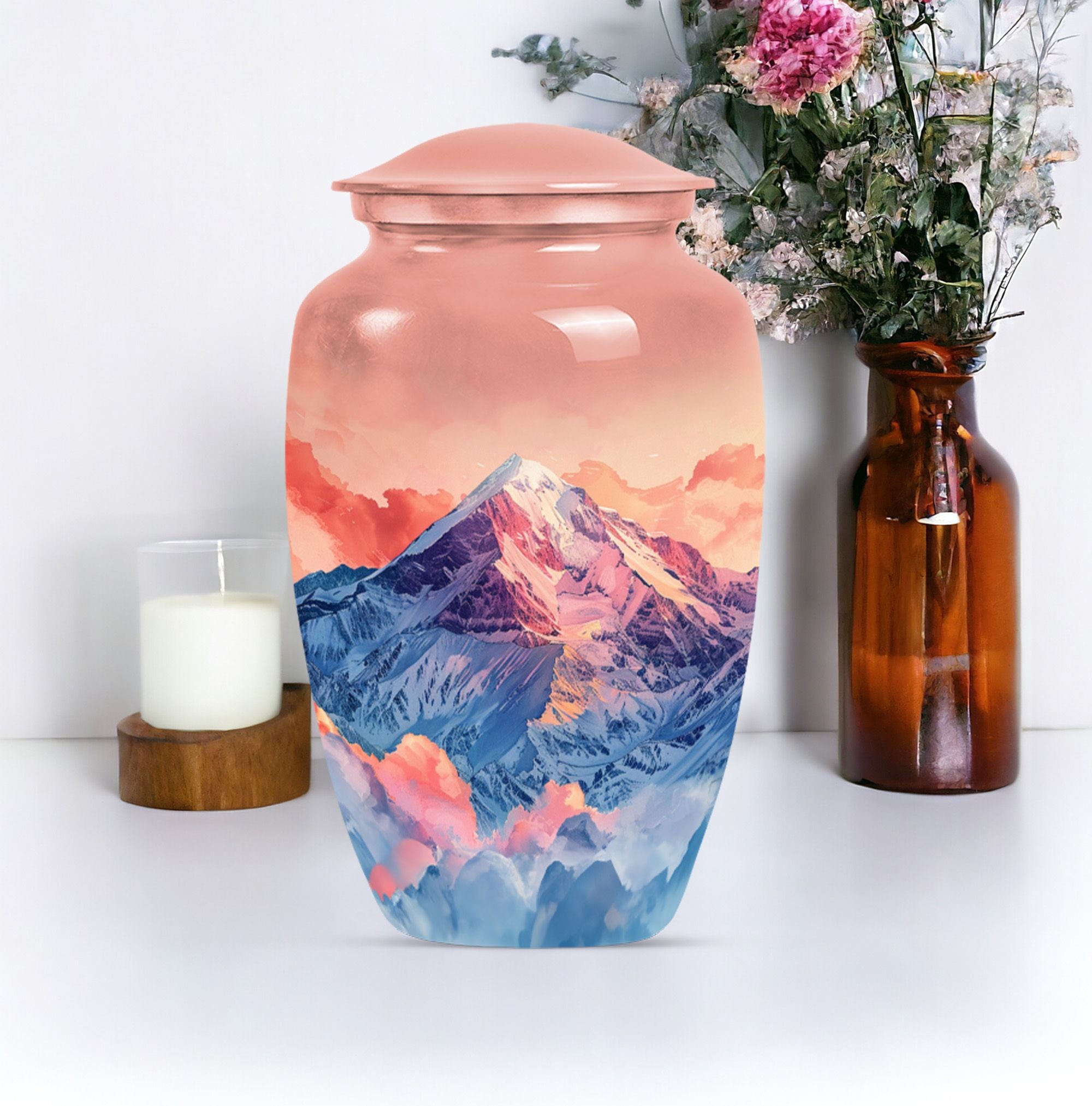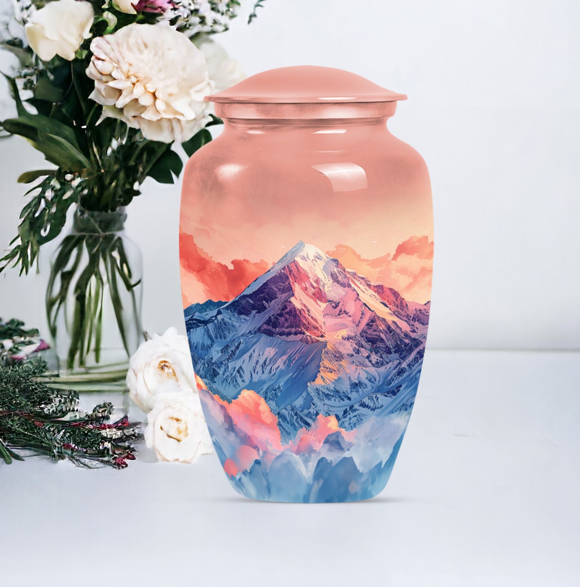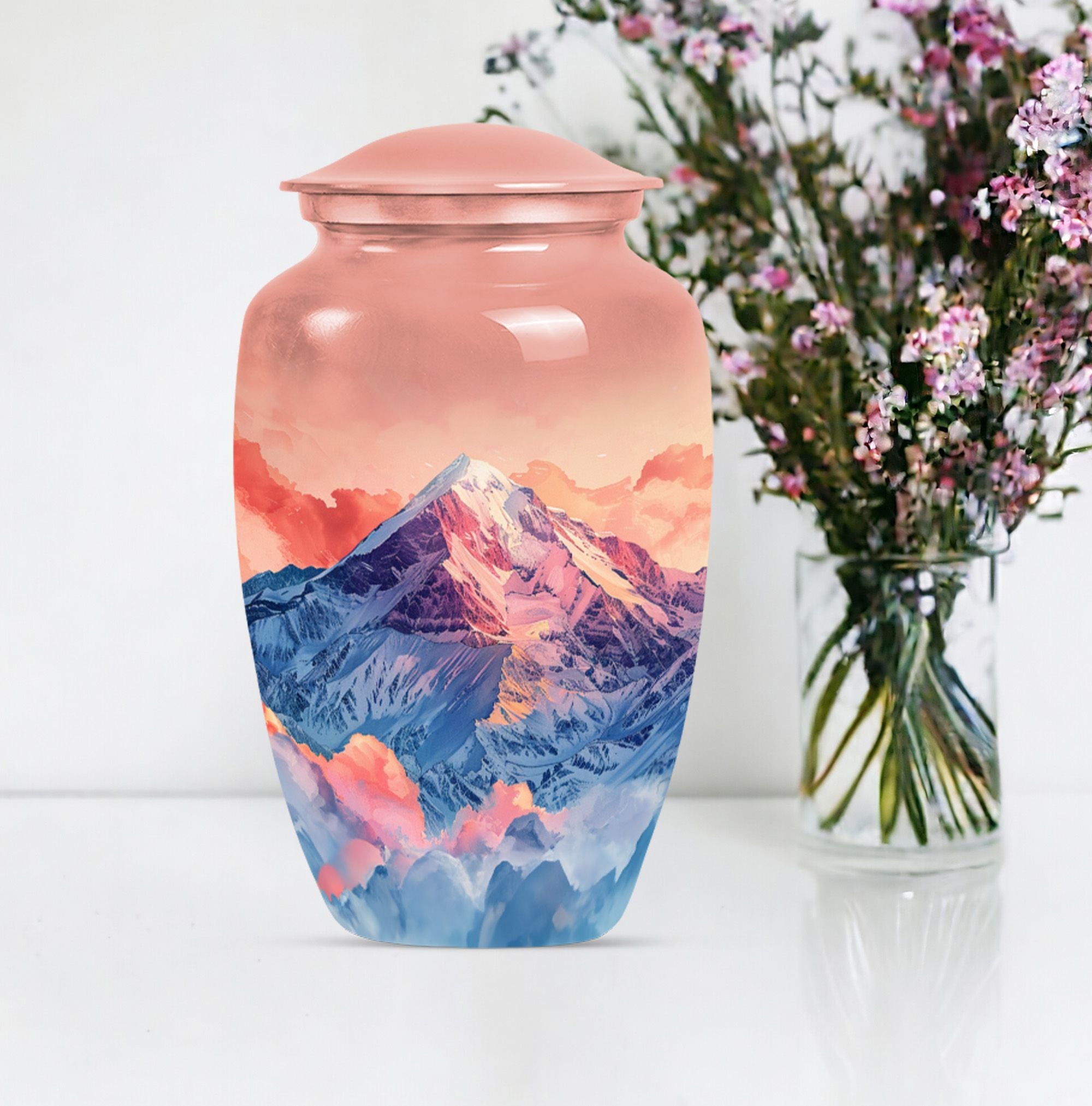 Honor your loved one's memory with this meticulously crafted 'mountains Urn', a symbol of everlasting tranquility. This remarkable cremation large urn, with an abstract theme, stands an impressive 10 inches tall, perfect for seniors and adults seeking funeral urns for memorial ceremonies. Crafted with the longevity of aluminium, it weighs a sturdy 3.3 pounds to ensure stability. The urn offers a generous 200 cubic inches capacity, apt for containing human ashes. It arrives with a velvet pouch for secure containment of ashes, emphasizing its dignified purpose. What sets this large urn apart is the capability to personalize it with engraved names, creating a bespoke testimonial. This Burial ashes urn, combining practicality with sentimentality, is a beautiful tribute to your loved one's life. Boost your spiritual sanctuary by integrating this human ash urn into your space, and ensure a devoted commemoration of the departed.
