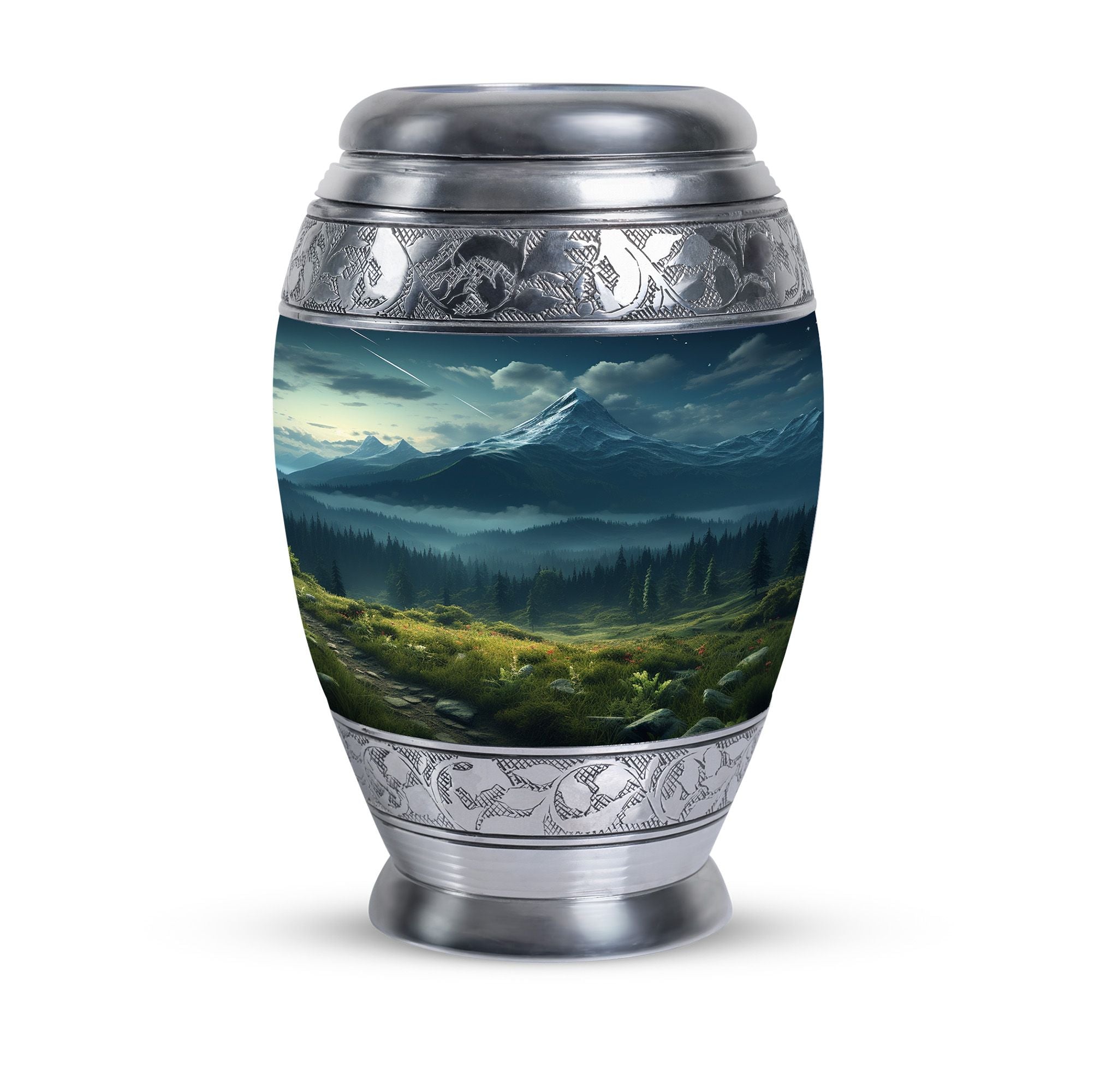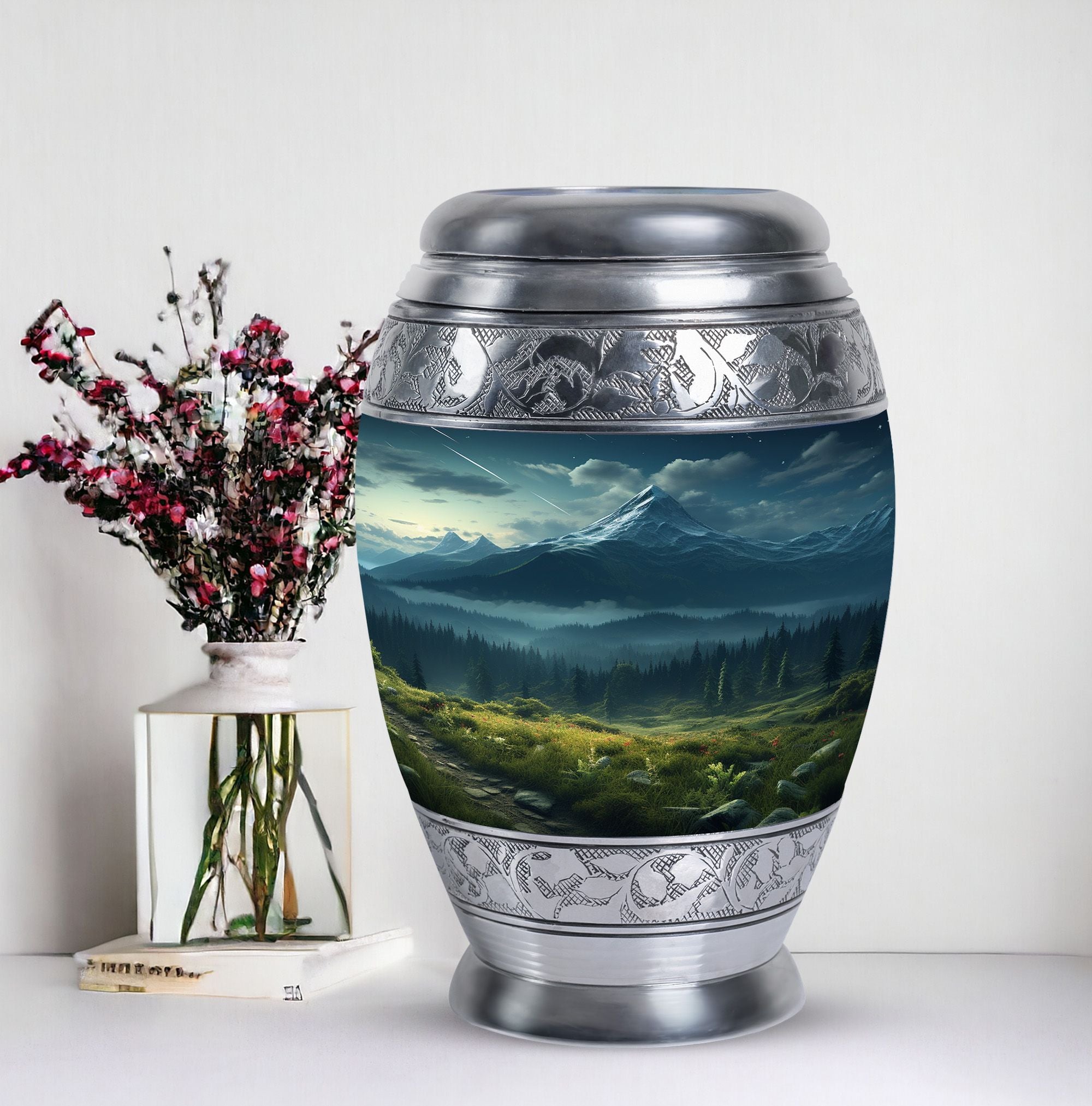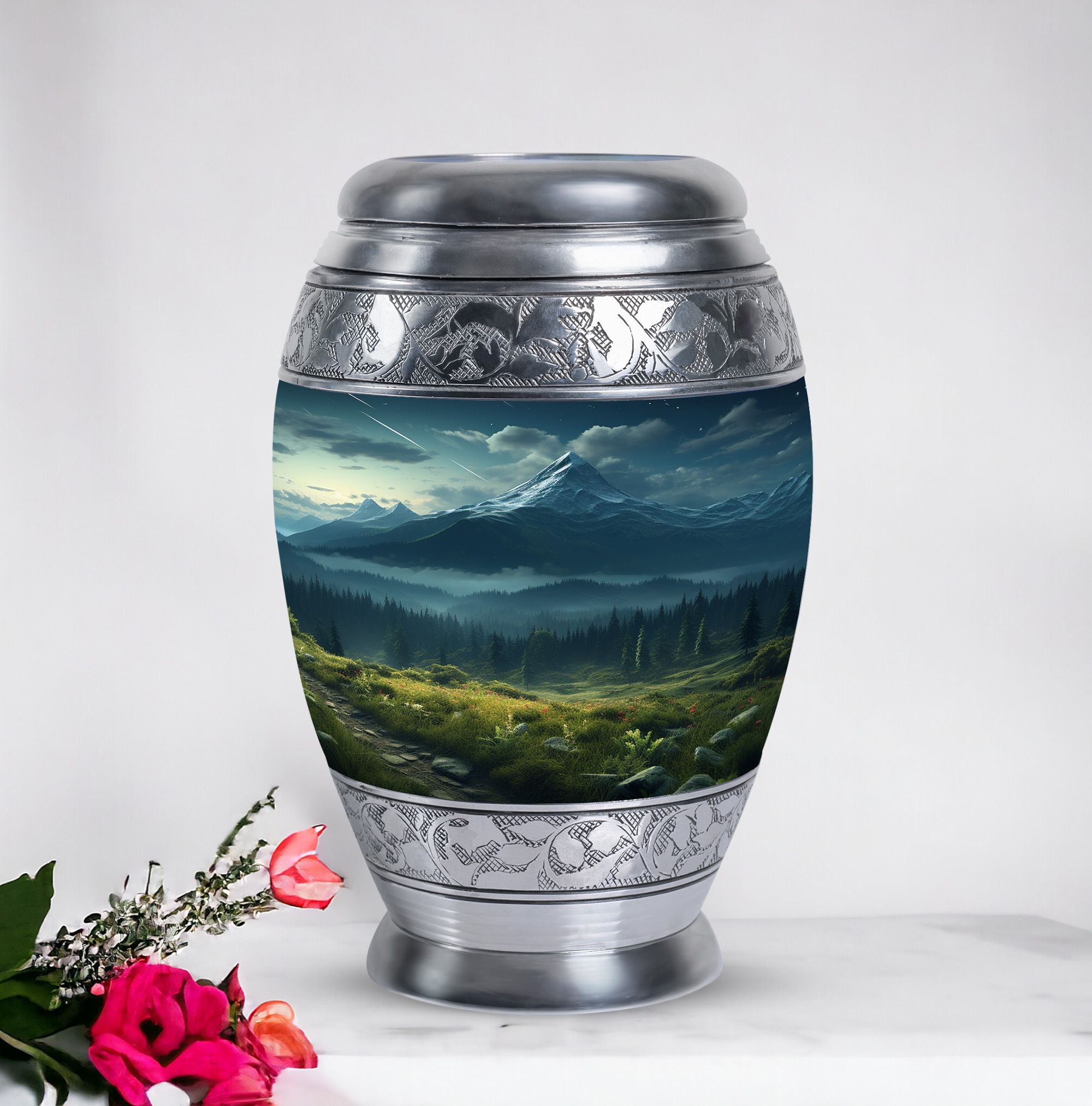 Honor the memory of your dearly departed with our uniquely designed Mountains Urns For Ashes. These small keepsake burial urns offer a special sanctuary for the last earthly remains of your loved ones. Crafted to hold ashes for both adult male and female, our urns capture the timeless essence of your cherished memories. Ideal as cremation companion urns, this treasure offers a comforting presence, a healing solace in your most private moments. Constructed with a large capacity to accommodate human ashes, it could be used as a reverential resting place for your mom or any other loved one. Wrapped with an original design, infused with uncommon terminology, our Mountain Urns transcend the norm, expressing honor, love, and eternal remembrance. Unleash a new dimension of bereavement and remembrance, paying tribute to the spiritual journey of those who have transitioned from this life. Preserve their legacy, securing a sacred portion of their essence in our Mountain urns, the epitome of memorial ceremony supplies.