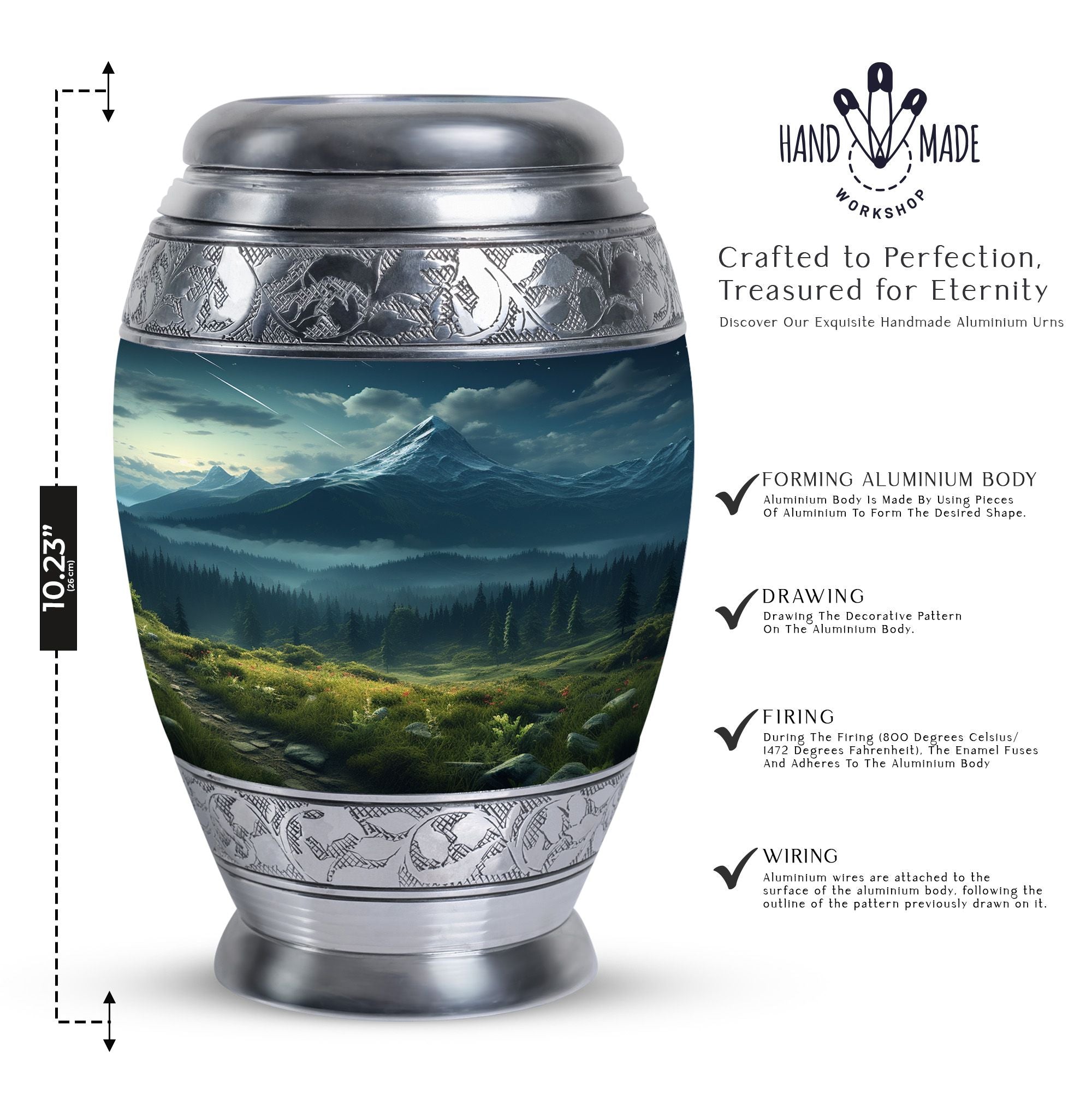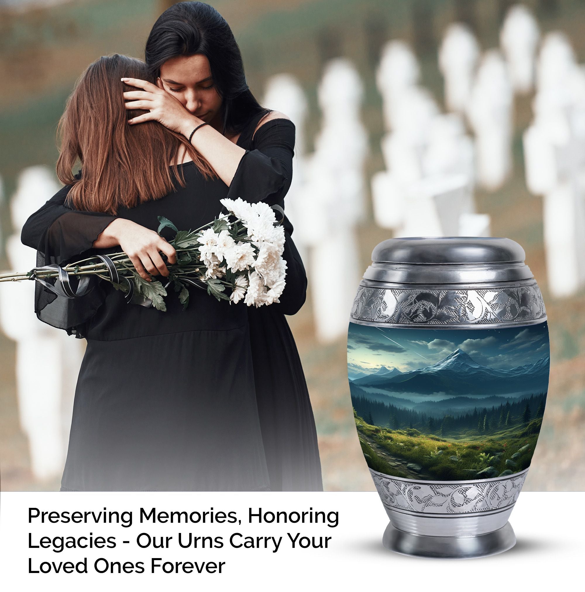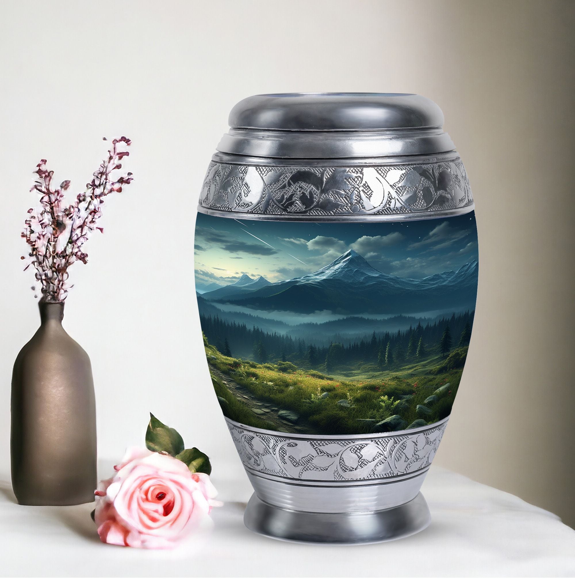Honor the memory of your dearly departed with our uniquely designed Mountains Urns For Ashes. These small keepsake burial urns offer a special sanctuary for the last earthly remains of your loved ones. Crafted to hold ashes for both adult male and female, our urns capture the timeless essence of your cherished memories. Ideal as cremation companion urns, this treasure offers a comforting presence, a healing solace in your most private moments. Constructed with a large capacity to accommodate human ashes, it could be used as a reverential resting place for your mom or any other loved one. Wrapped with an original design, infused with uncommon terminology, our Mountain Urns transcend the norm, expressing honor, love, and eternal remembrance. Unleash a new dimension of bereavement and remembrance, paying tribute to the spiritual journey of those who have transitioned from this life. Preserve their legacy, securing a sacred portion of their essence in our Mountain urns, the epitome of memorial ceremony supplies.