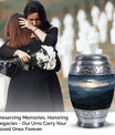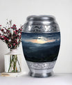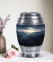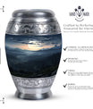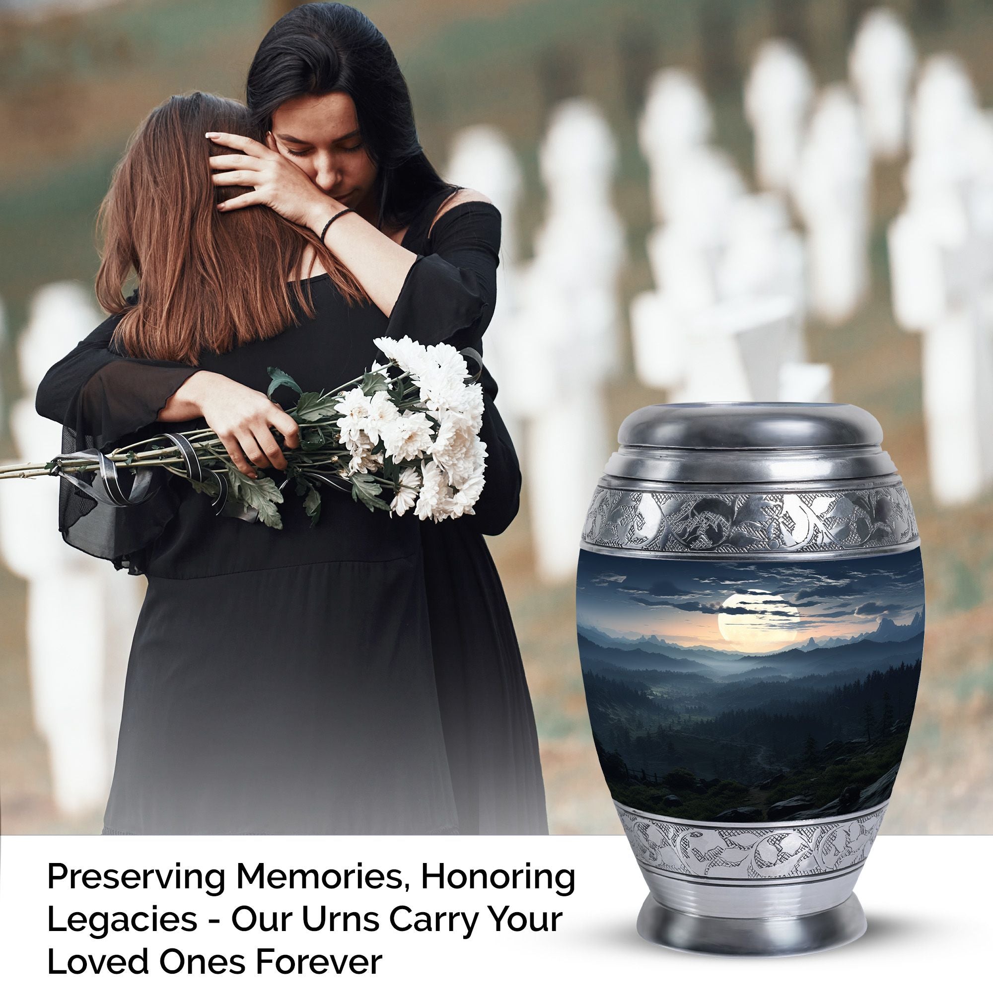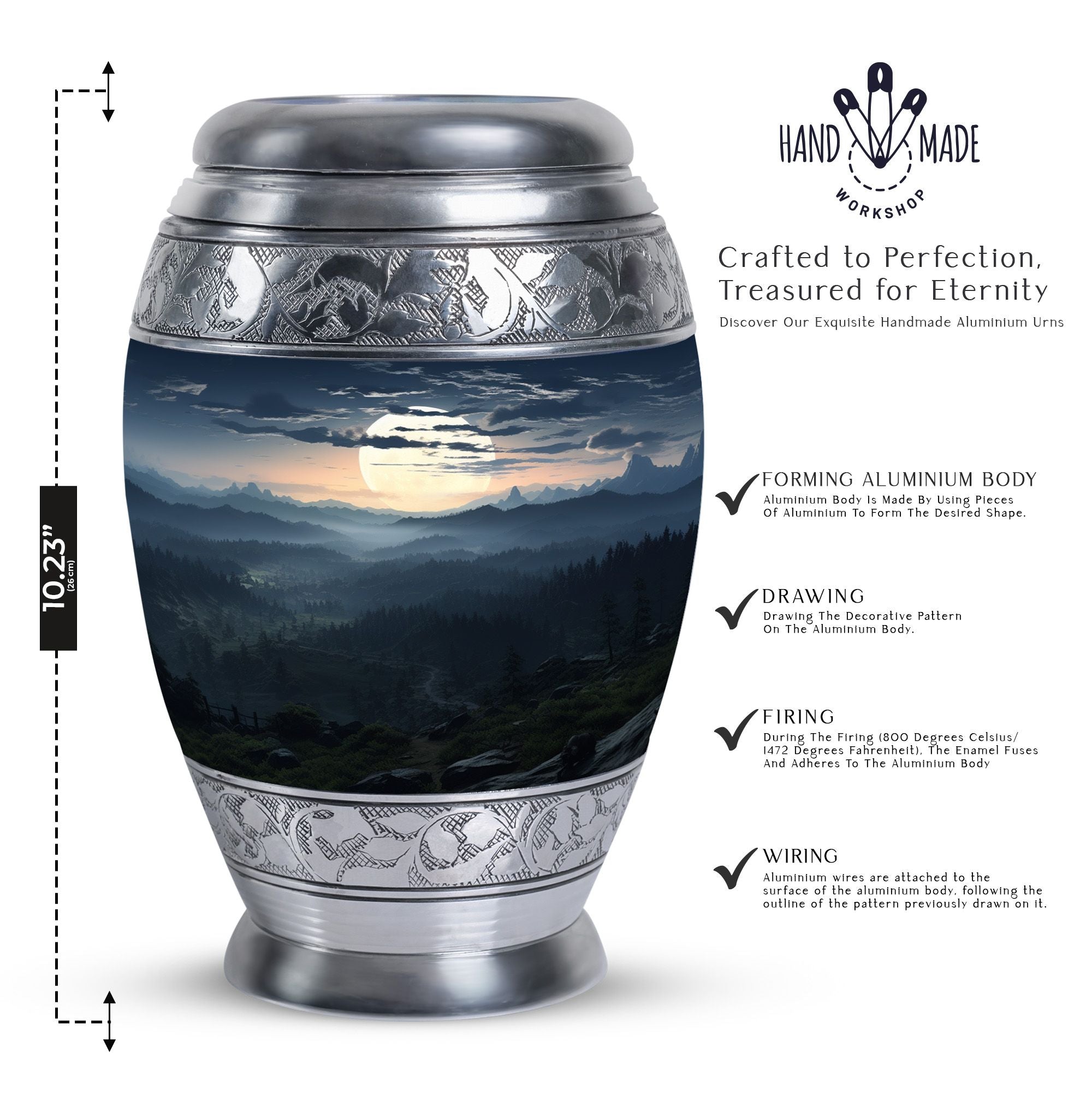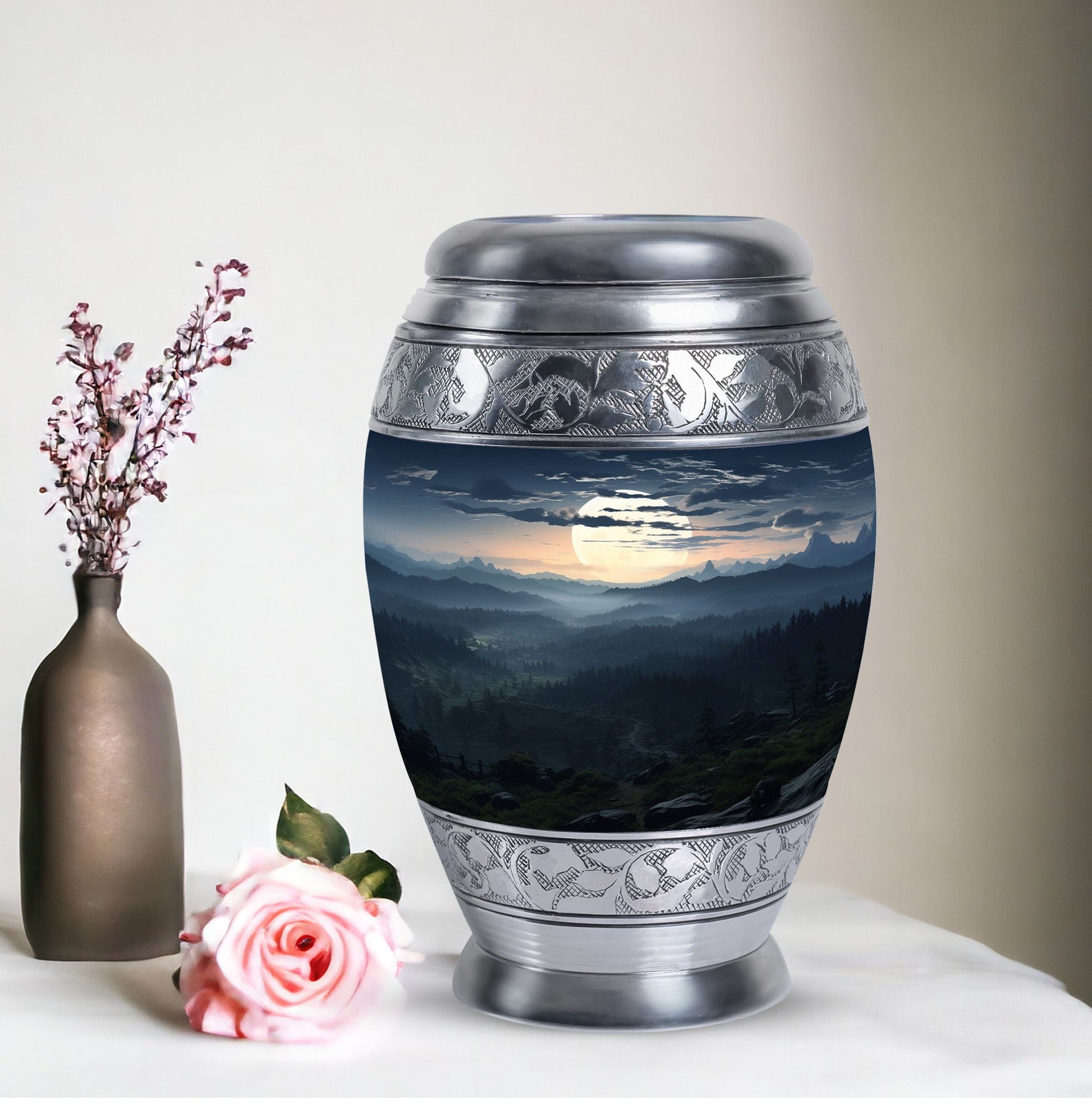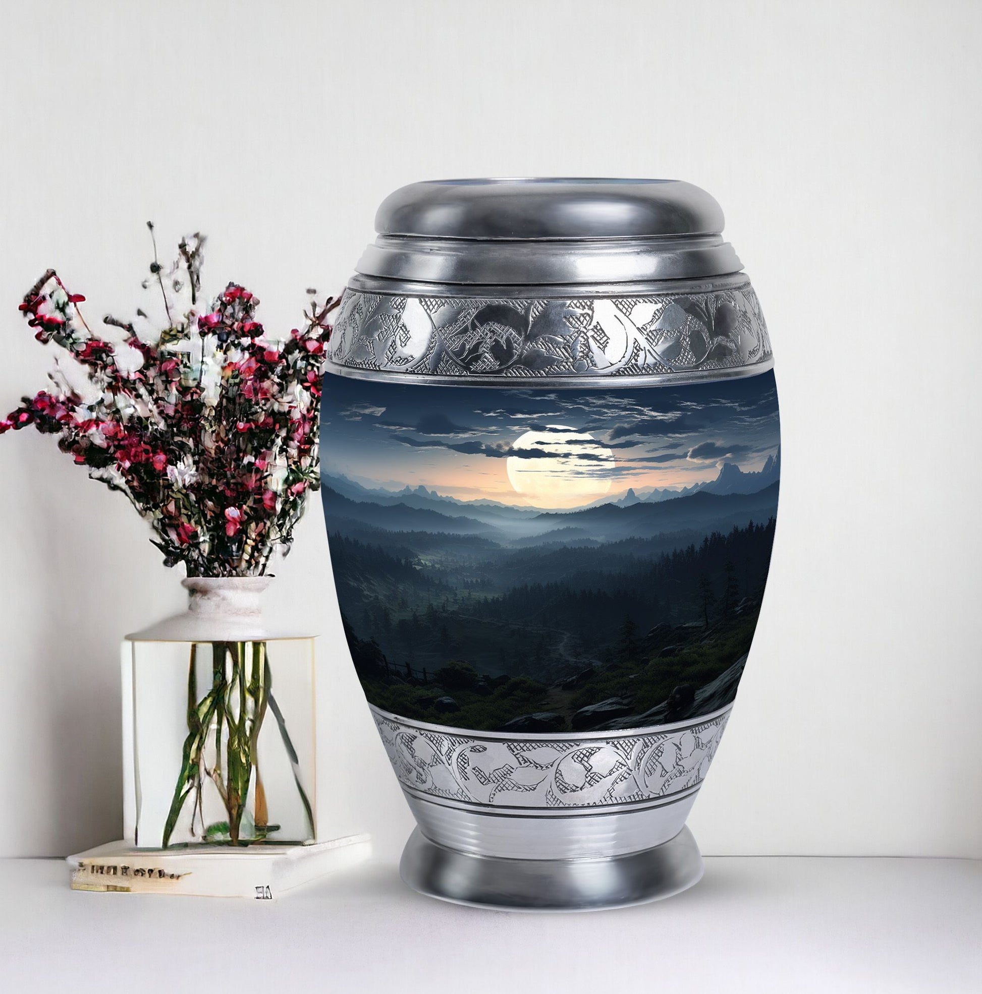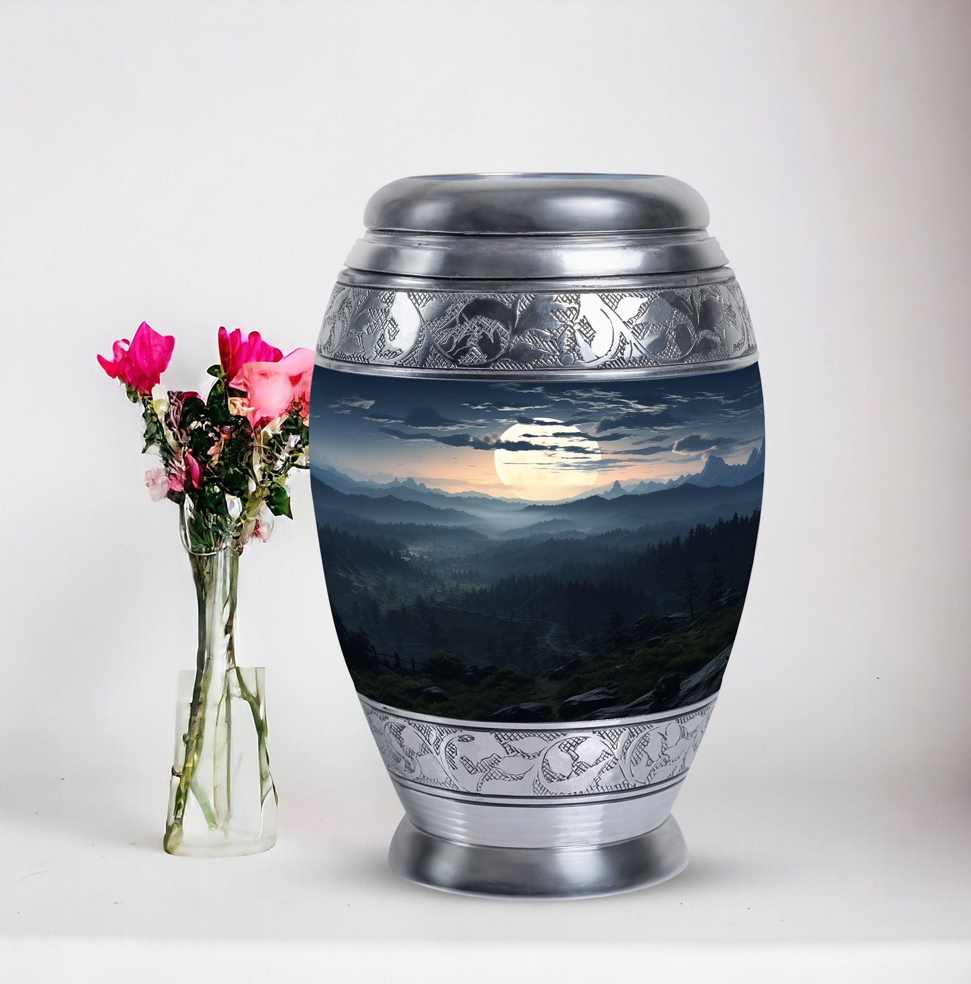 Preserve the endearing memory of your loved one with our magnificent Mountains Urn for Ashes, artistically crafted for both women and men. Fabricated with the utmost precision and dedication, this urn showcases an intricate design of mountains, symbolizing the eternal journey of life and hope. It is an elaborate cremation companion urn capable of holding the cremated remains of an adult in a capacious manner. The urn features a striking black finish, presenting an elegant yet subtle piece that seamlessly fits most interiors. Choose our large urns for human ashes to celebrate the beautiful journey your loved one embarked on. Dispensing unprecedented tranquility, our burial urns for cremated remains reassure you of a noble resting place for those dearly missed. Choose this epitome of love and respect for your cherished ones, transcending them towards eternal peace and serenity. Let their legacy thrive within the heart of your home with our Mountains Urn.