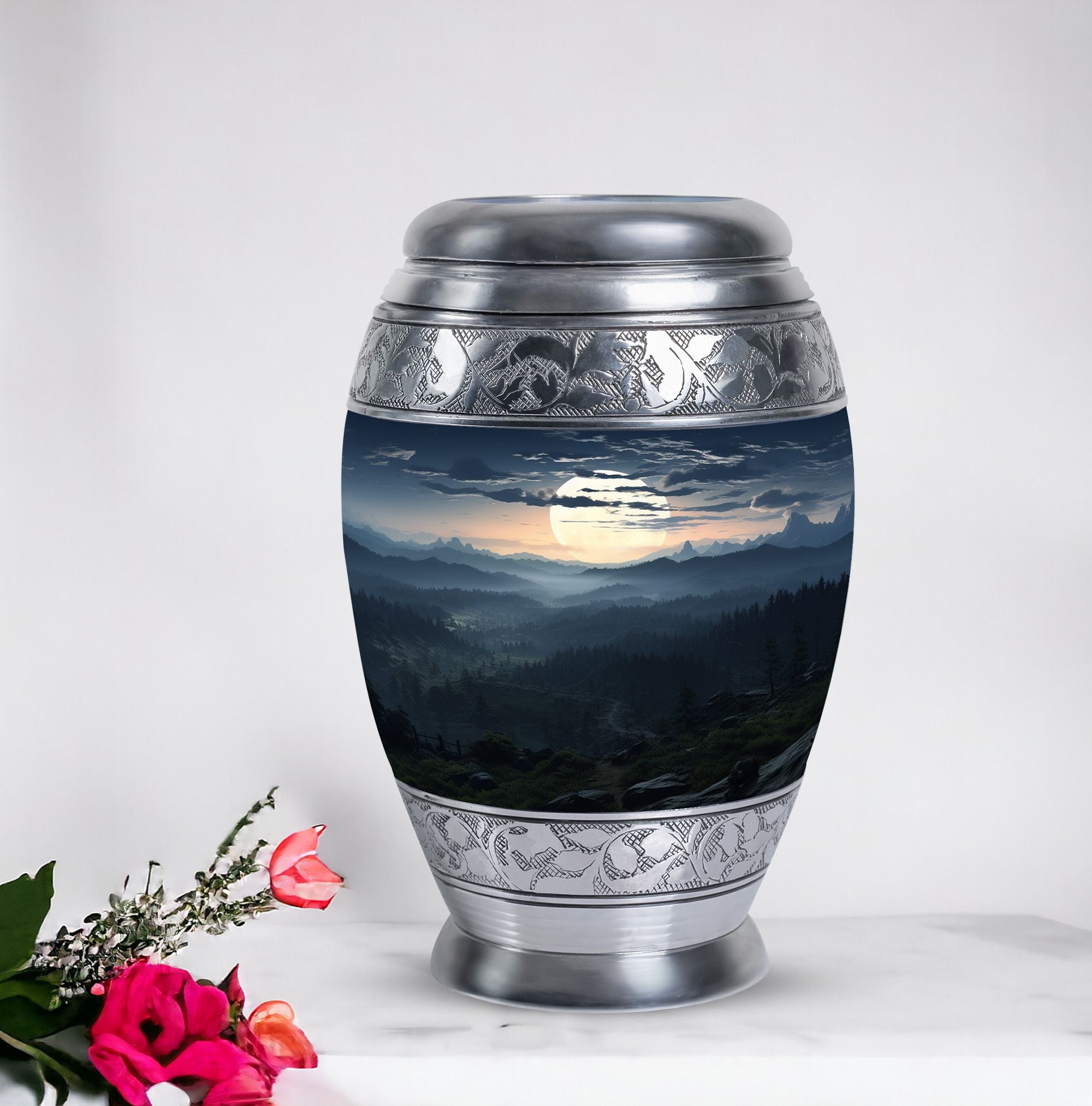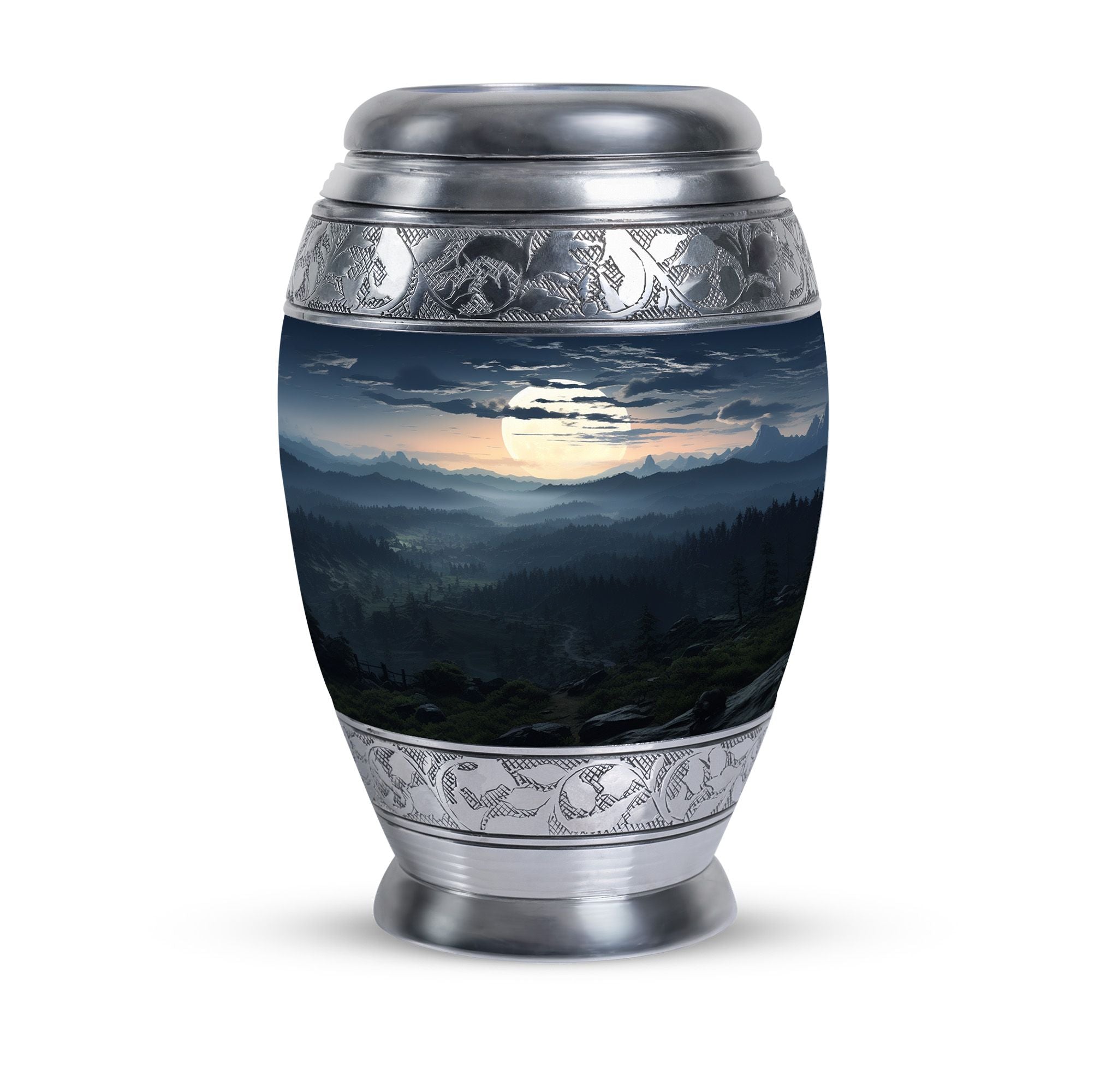 Preserve the endearing memory of your loved one with our magnificent Mountains Urn for Ashes, artistically crafted for both women and men. Fabricated with the utmost precision and dedication, this urn showcases an intricate design of mountains, symbolizing the eternal journey of life and hope. It is an elaborate cremation companion urn capable of holding the cremated remains of an adult in a capacious manner. The urn features a striking black finish, presenting an elegant yet subtle piece that seamlessly fits most interiors. Choose our large urns for human ashes to celebrate the beautiful journey your loved one embarked on. Dispensing unprecedented tranquility, our burial urns for cremated remains reassure you of a noble resting place for those dearly missed. Choose this epitome of love and respect for your cherished ones, transcending them towards eternal peace and serenity. Let their legacy thrive within the heart of your home with our Mountains Urn.