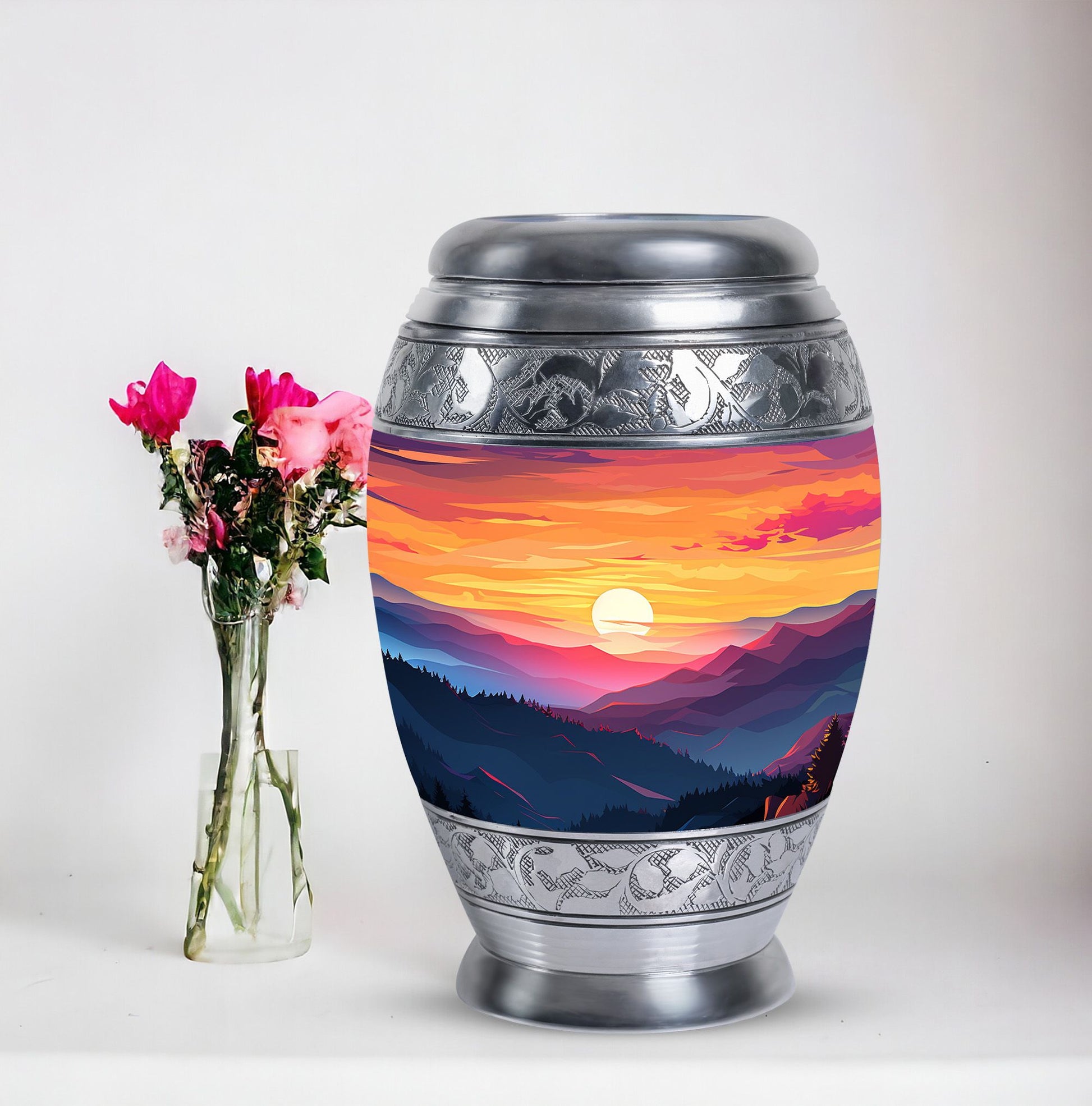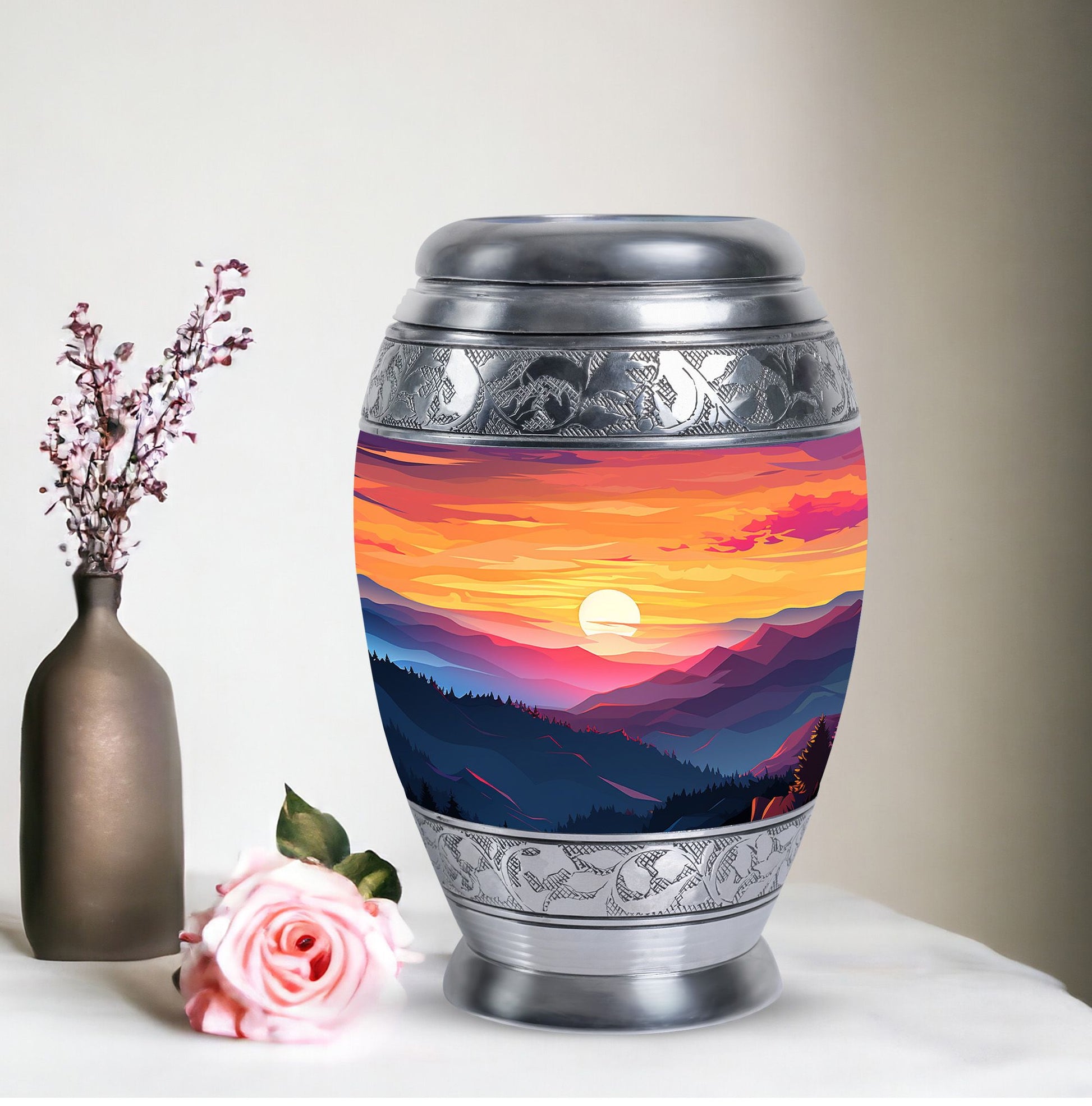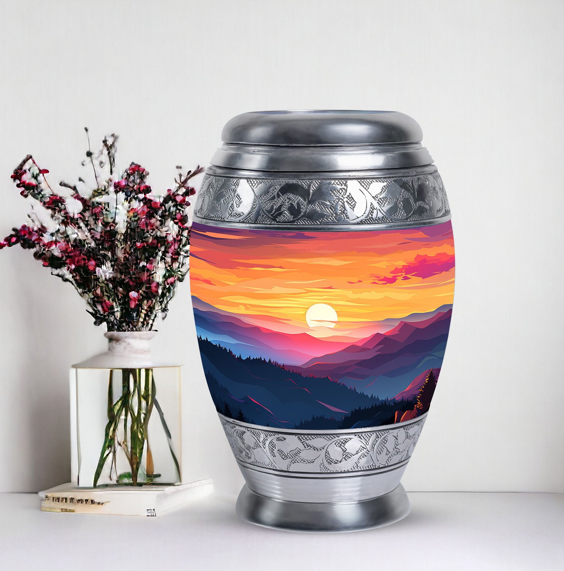 Step into serenity as you honor your loved ones with our 'Mountains Large Urns'. This cremation urn is adorned with breathtaking mountain reliefs that convey hidden depths of spiritual mysteries. Our product provides a solemn and dignified way to preserve precious memories, acting as a beautiful ash holder and equally enchanting home decor piece. Crafted specifically for adults and seniors with high-quality, robust metal, this urn is a respectful and standout choice among funeral urns. Our piece is suitable for any gender, making it an apt choice for an 'Adult Male Dad', or a 'Female Mom'. It has ample capacity making it a fitting option even for burial urns. Break the mundane with our 'Mountains Large Urns', and hold onto the memory of your loved ones in a manner just as unique as they were. With its spectacular design, this urn is sure to stand out as a tribute to those who loved to venture into the wild or had a passion for nature.