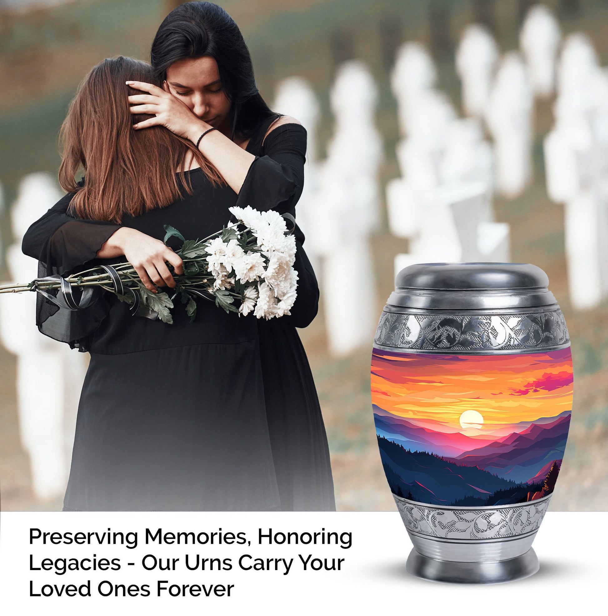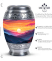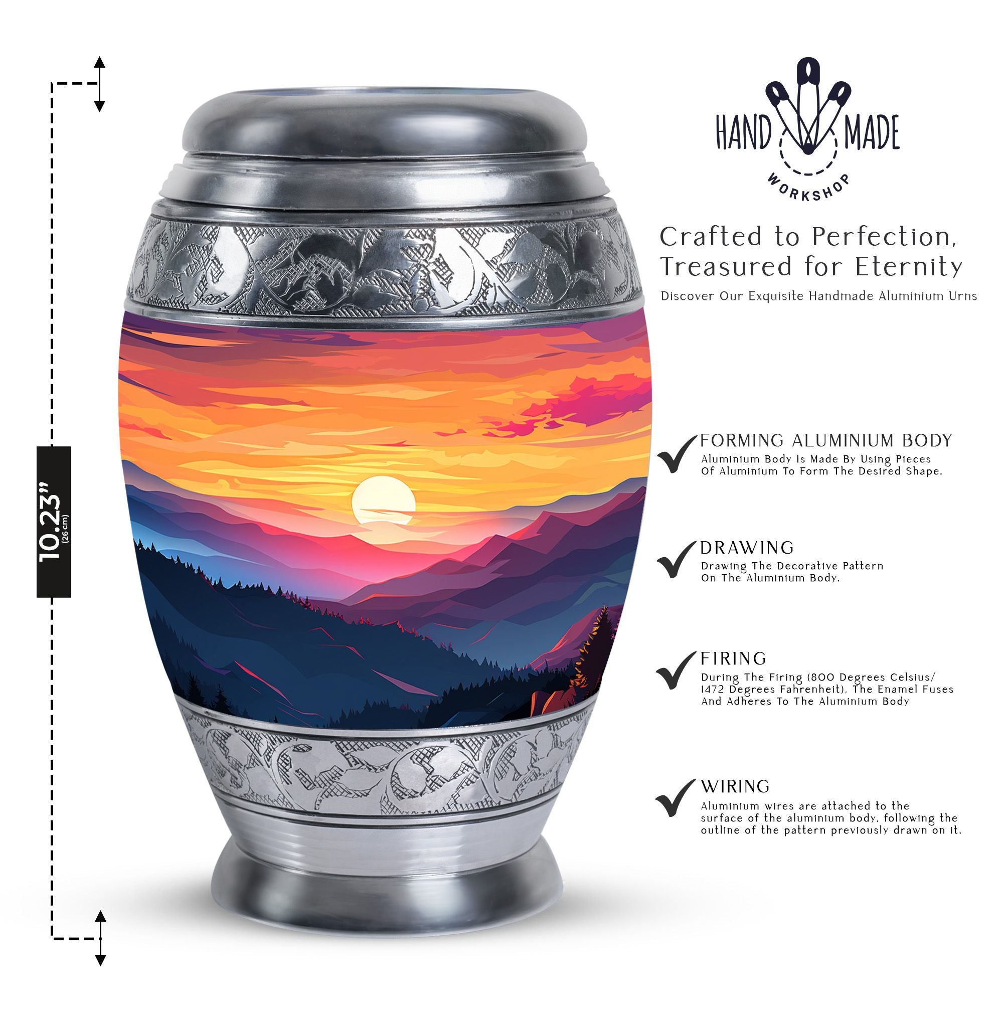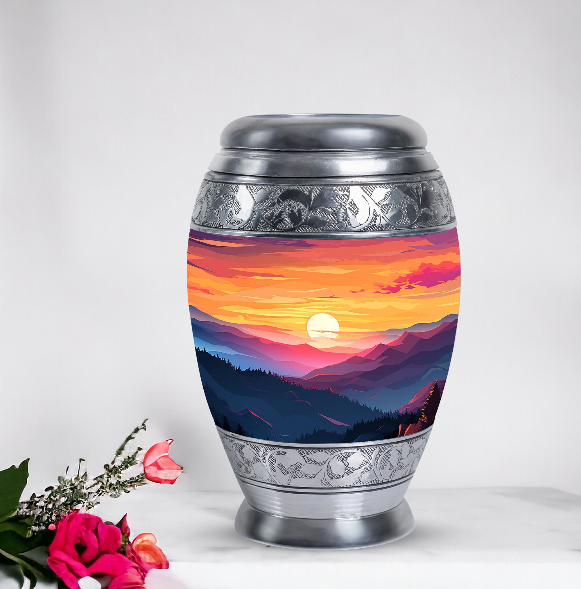 Step into serenity as you honor your loved ones with our 'Mountains Large Urns'. This cremation urn is adorned with breathtaking mountain reliefs that convey hidden depths of spiritual mysteries. Our product provides a solemn and dignified way to preserve precious memories, acting as a beautiful ash holder and equally enchanting home decor piece. Crafted specifically for adults and seniors with high-quality, robust metal, this urn is a respectful and standout choice among funeral urns. Our piece is suitable for any gender, making it an apt choice for an 'Adult Male Dad', or a 'Female Mom'. It has ample capacity making it a fitting option even for burial urns. Break the mundane with our 'Mountains Large Urns', and hold onto the memory of your loved ones in a manner just as unique as they were. With its spectacular design, this urn is sure to stand out as a tribute to those who loved to venture into the wild or had a passion for nature.