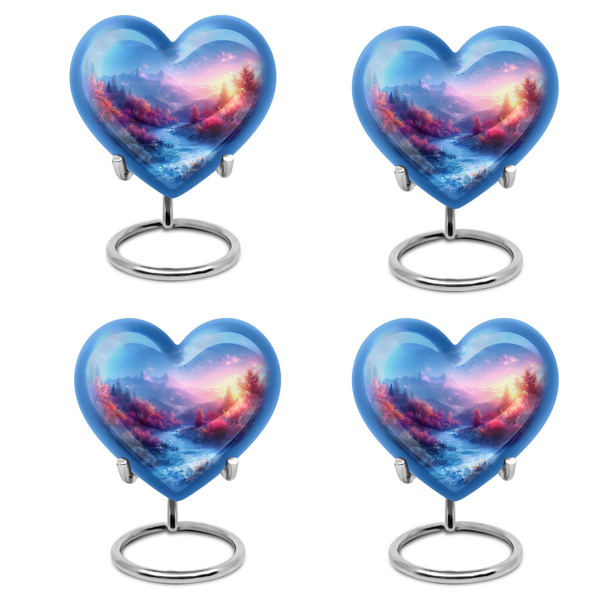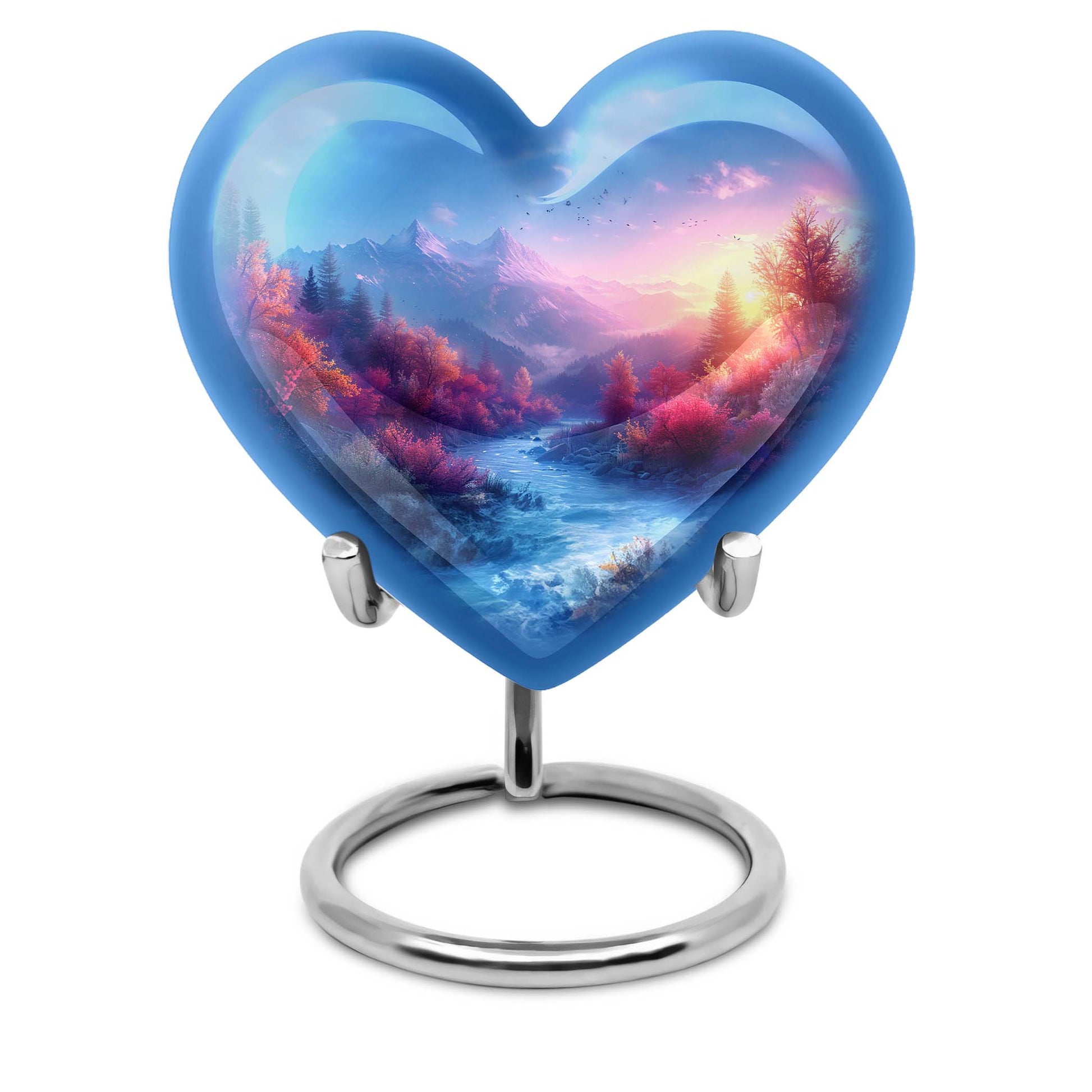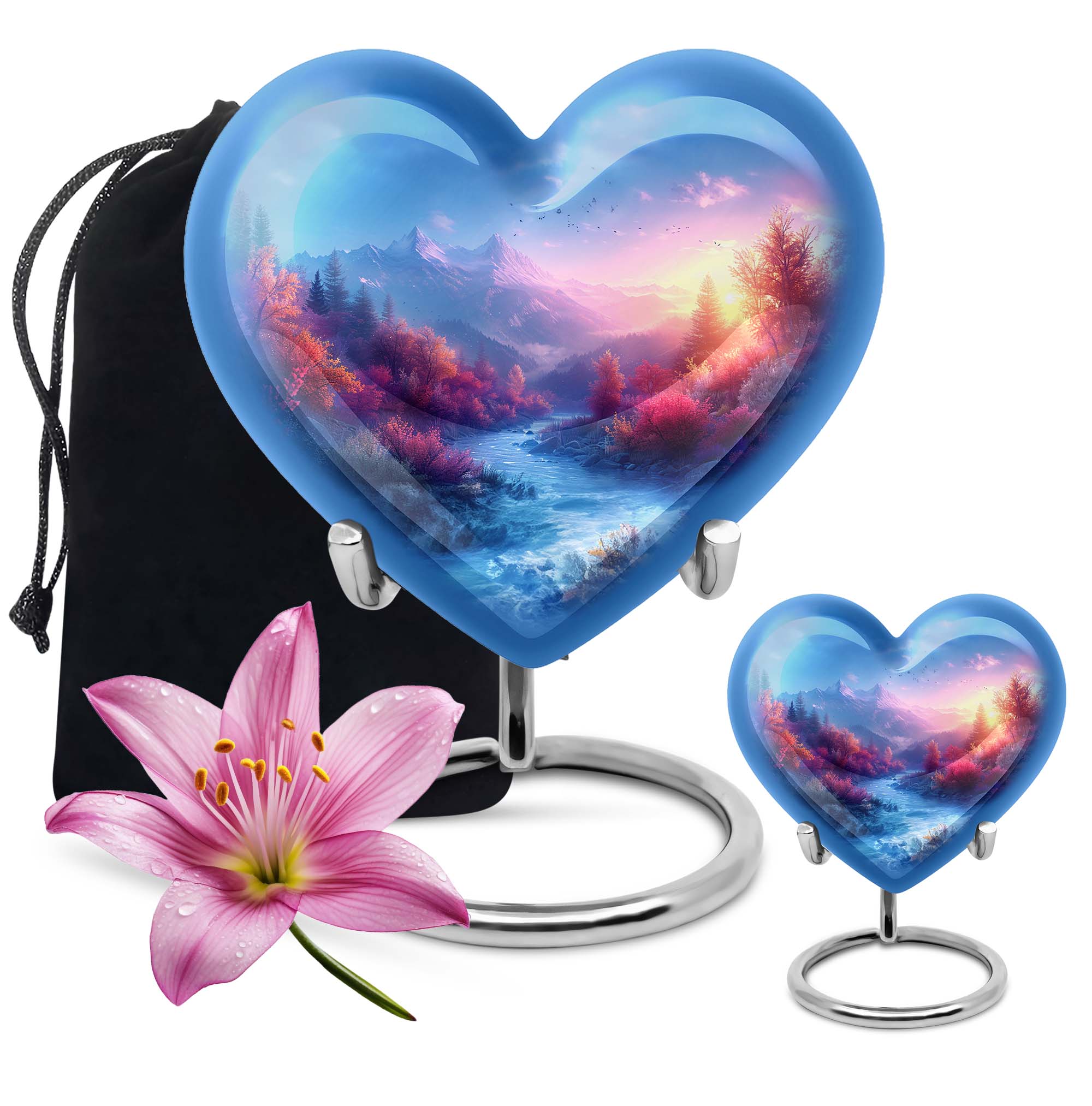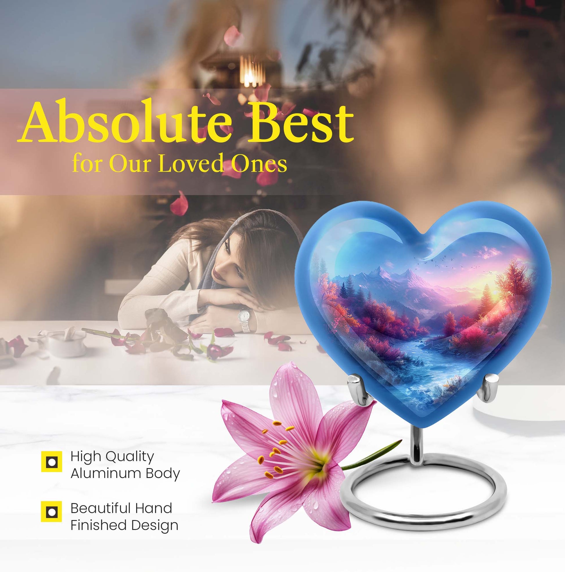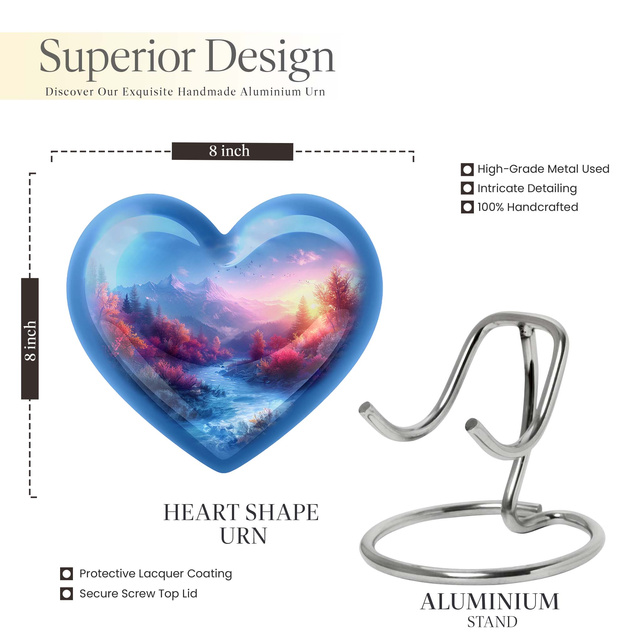 Immerse in the calm tranquility brought by the Heart Urn; an exquisite large-size urn for human ashes, serenely embodying the solace of the mountains. This stunningly abstract-themed work of art, measuring 10 inches in height with a capacity of 200 cubic inches, subtly speaks to the eternal spirit and captivating allure of nature's grandeur. Tucked away securely in a velvet pouch, this medium-sized, lightweight urn, tipping the scales at just 3.3 pounds, is designed from durable and premium quality aluminium. It features the flexibility to personalize with engraved names, allowing a highly intimate and sentimental element. Pervaded with the soft whispers of tender memories, this funeral and memorial urn perfectly cherishes the enduring love and respect for a beloved soul. Reflect on the timeless memories and precious moments, preserved safely within this memorial urn. Express your love and remembrances in a dignified, respectful manner with this eloquent, one-of-a-kind mountains urn.