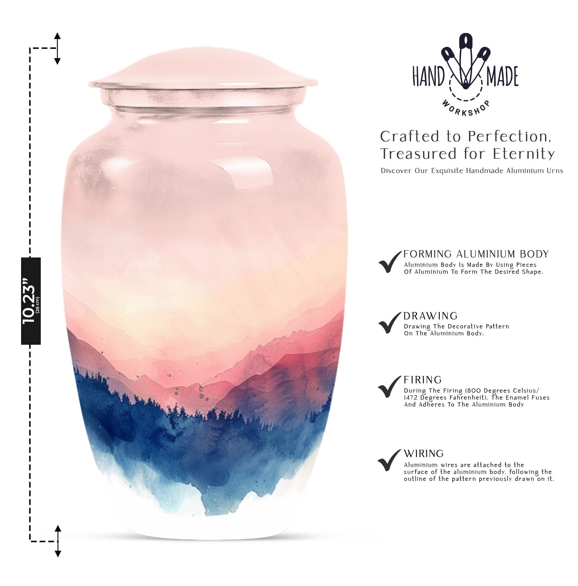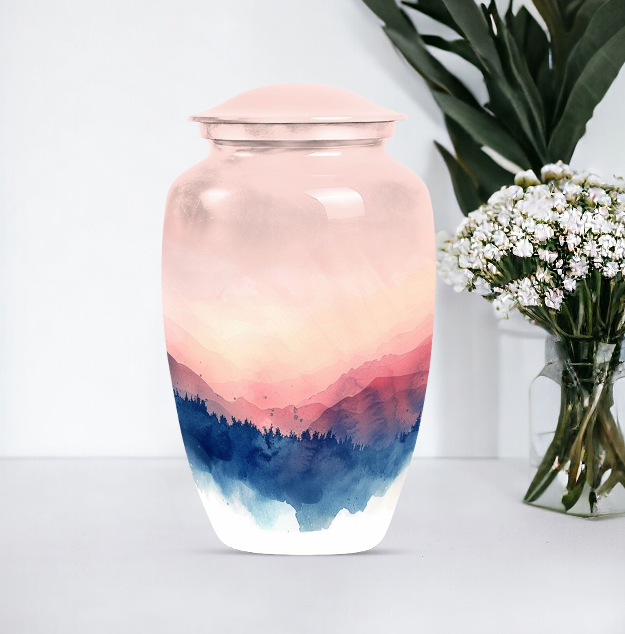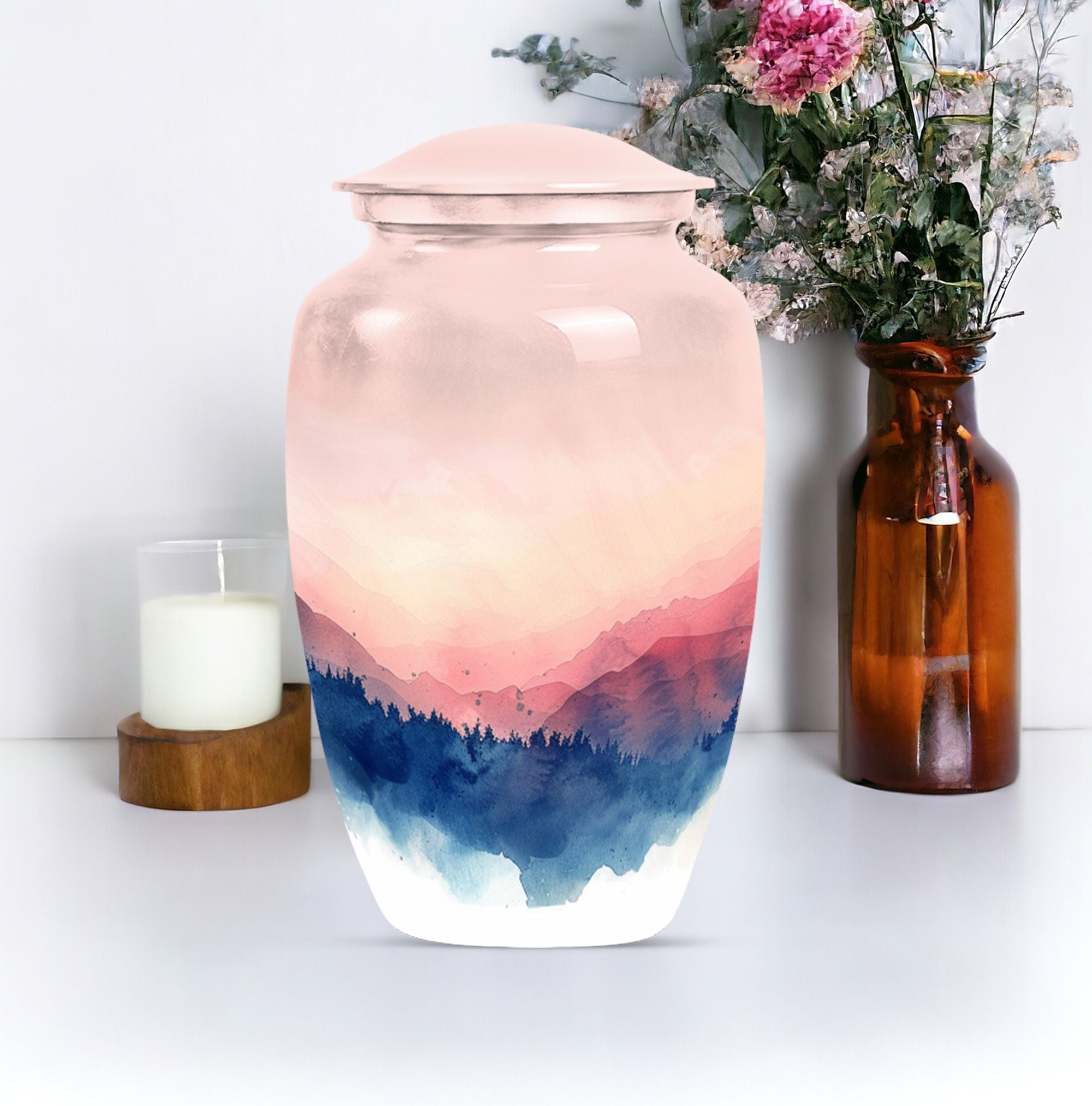 Seize the serenity and grace of final worthy inhabitation with our mountains urn, a remarkably-styled burial urn for human ashes aimed at adults. This 10-inch urn showcases an abstract theme, encapsulating the timeless elegance of our classic urn design. Made from robust aluminium, our urn weighs a solid 3.3 pounds. Its dimensions, standing at an impressive 10 inches in height, and with a capacity of 200 cubic inches, qualify it among the line-up of large urns. For a personal touch, we offer you the option to etch engraved names on the urn, making it more than just a resting place, but a memorial tribute. Our package provisions include a velvet pouch, ensuring dignified containment of the ashes. If you're seeking memorial urns that bridge craftsmanship with solemn elegance, our cremation urns indeed stand out. They're perfect for both men and women, providing a fitting memory of a loved one's life well-lived.