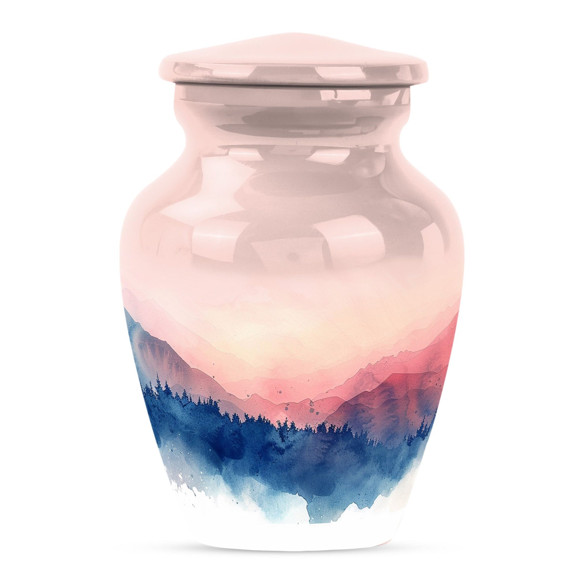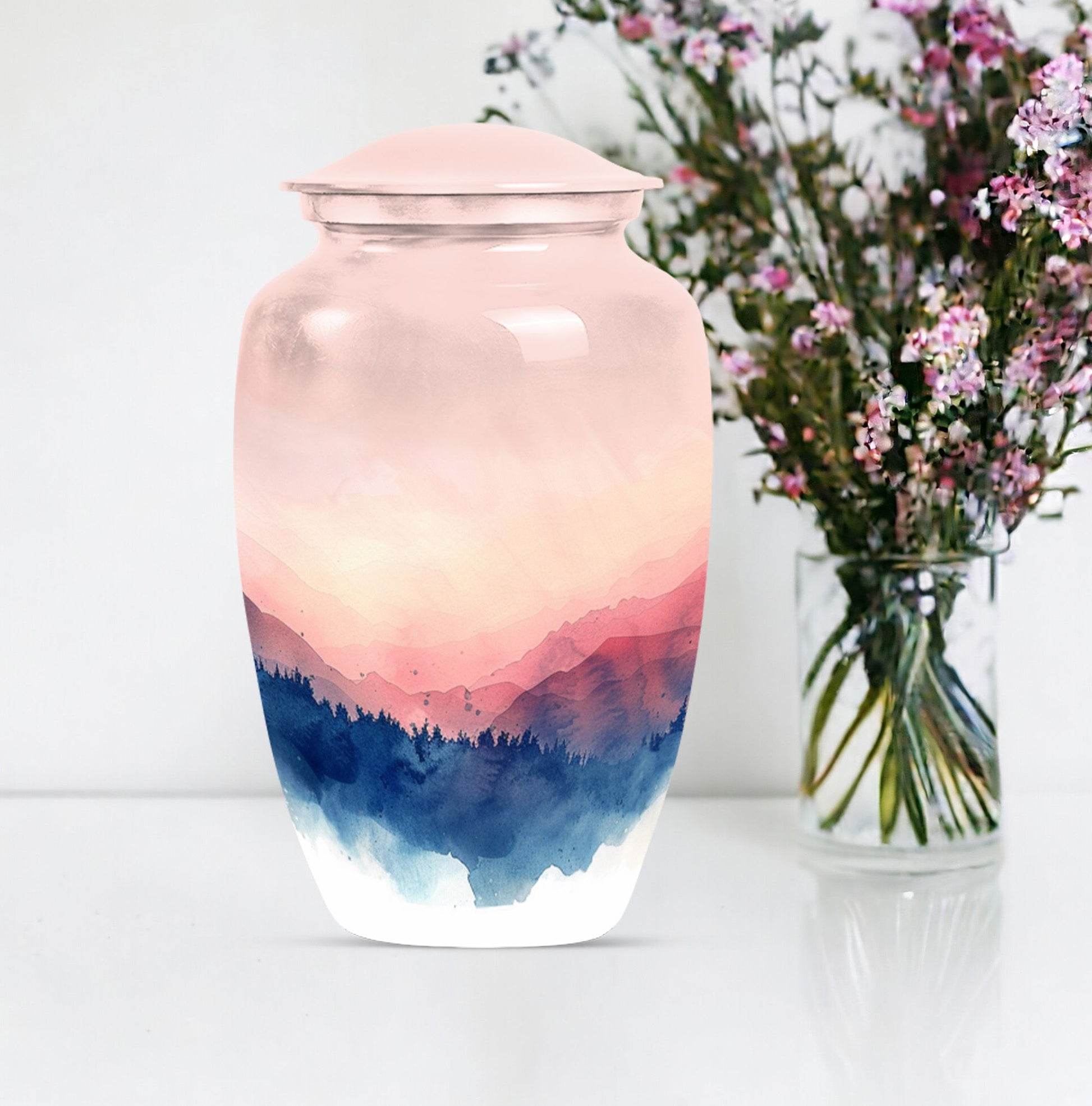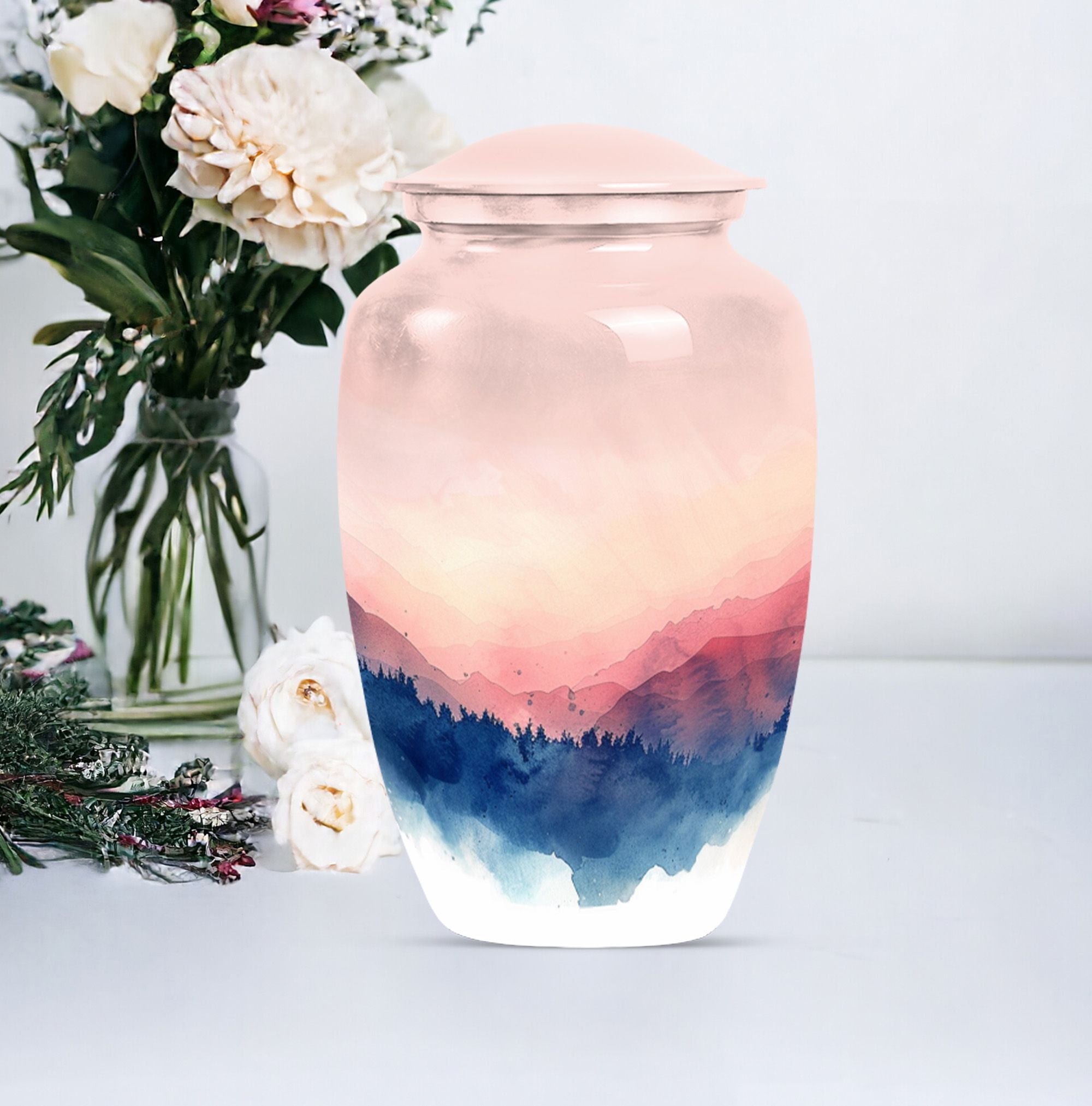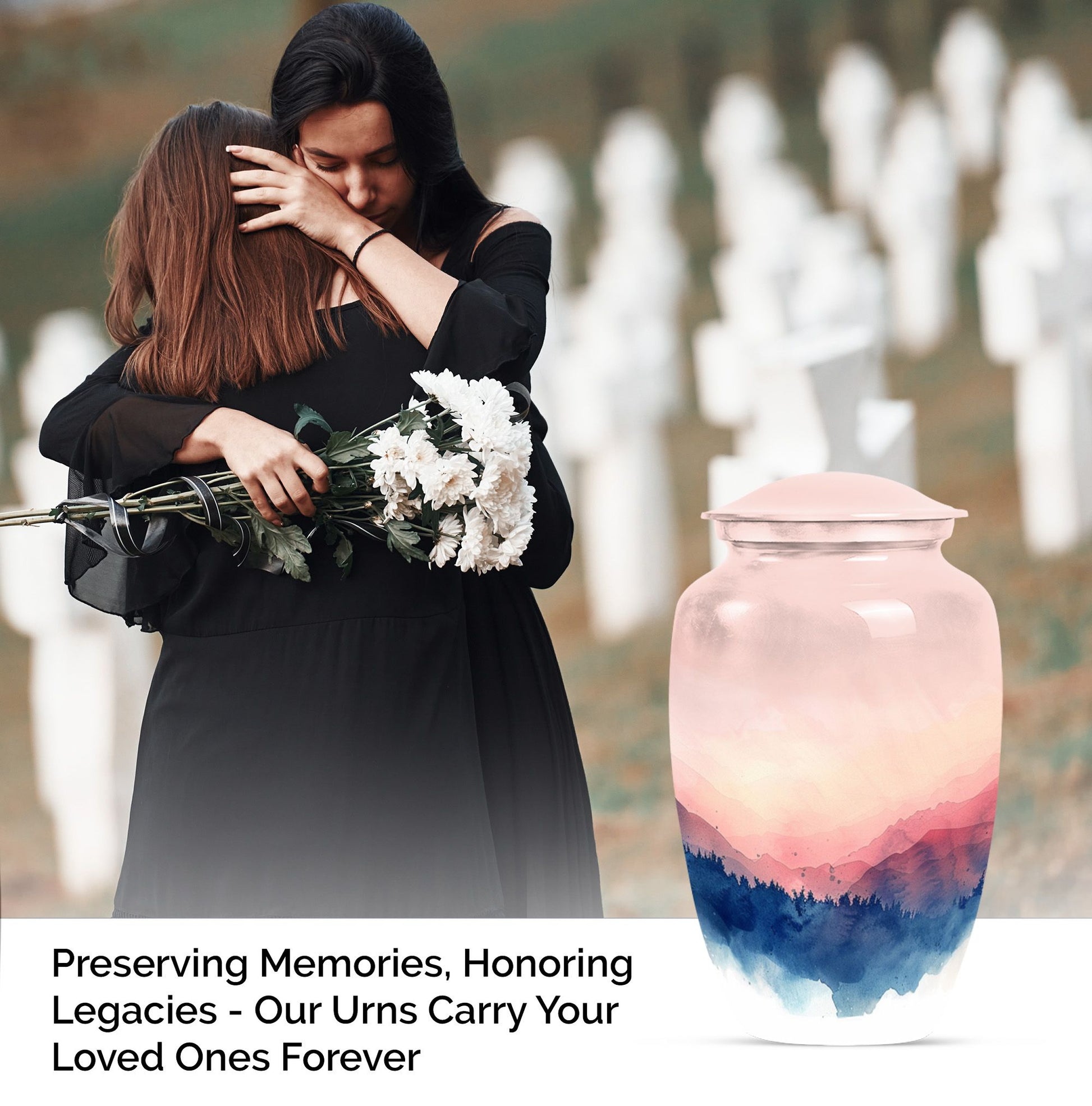 Seize the serenity and grace of final worthy inhabitation with our mountains urn, a remarkably-styled burial urn for human ashes aimed at adults. This 10-inch urn showcases an abstract theme, encapsulating the timeless elegance of our classic urn design. Made from robust aluminium, our urn weighs a solid 3.3 pounds. Its dimensions, standing at an impressive 10 inches in height, and with a capacity of 200 cubic inches, qualify it among the line-up of large urns. For a personal touch, we offer you the option to etch engraved names on the urn, making it more than just a resting place, but a memorial tribute. Our package provisions include a velvet pouch, ensuring dignified containment of the ashes. If you're seeking memorial urns that bridge craftsmanship with solemn elegance, our cremation urns indeed stand out. They're perfect for both men and women, providing a fitting memory of a loved one's life well-lived.