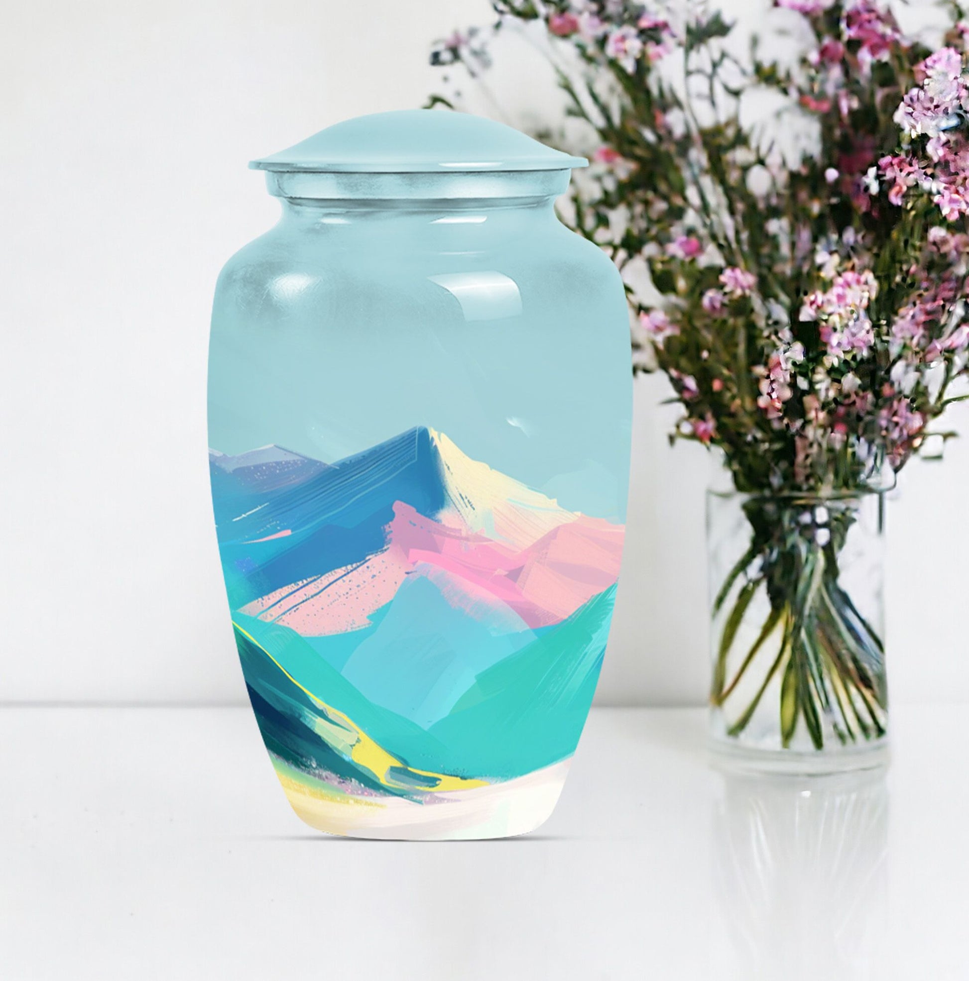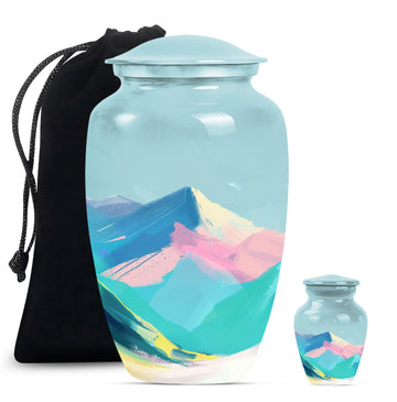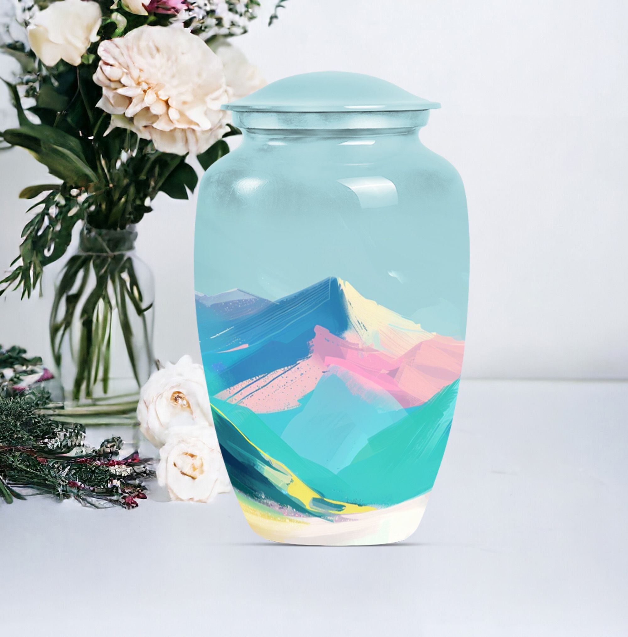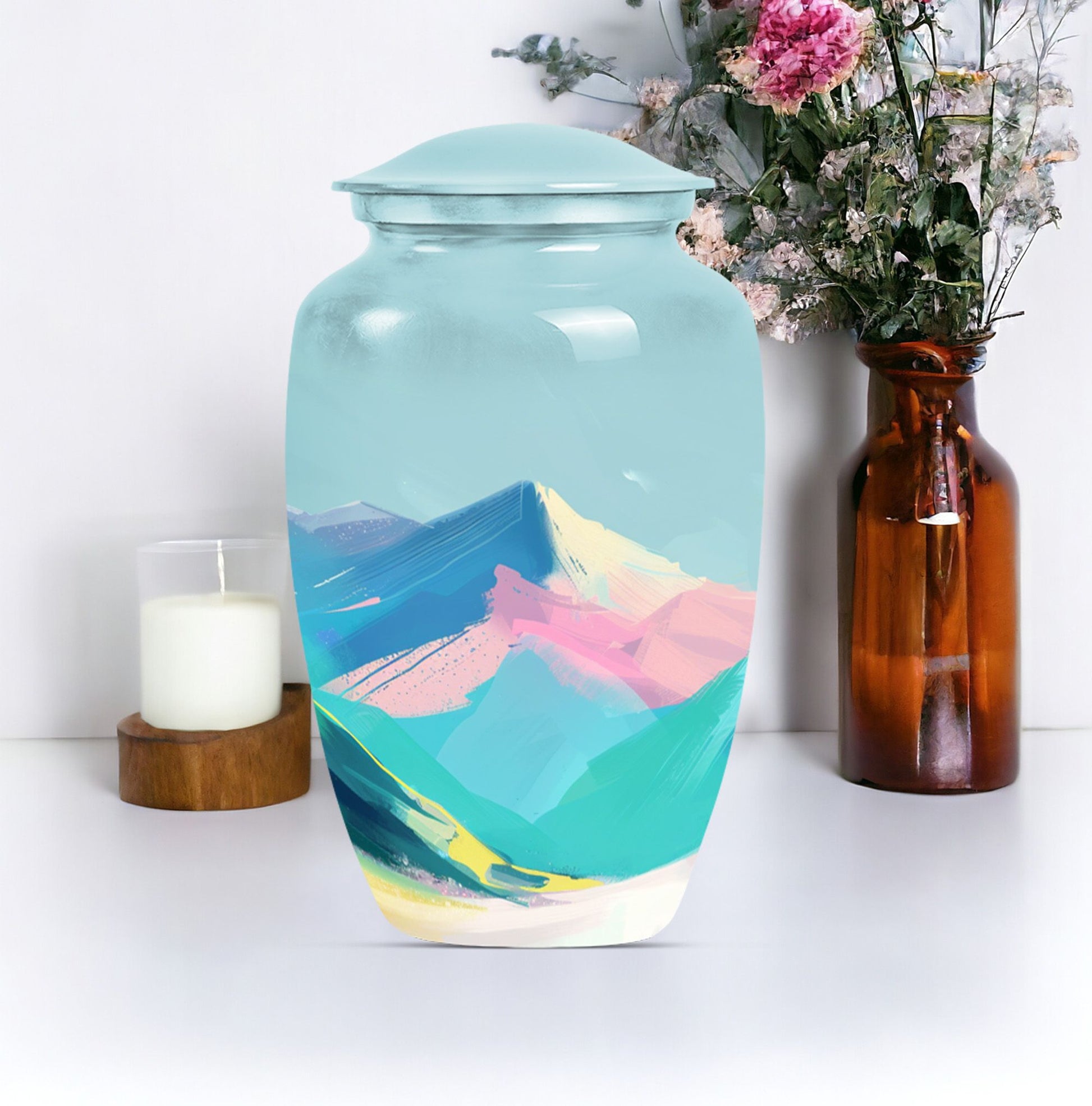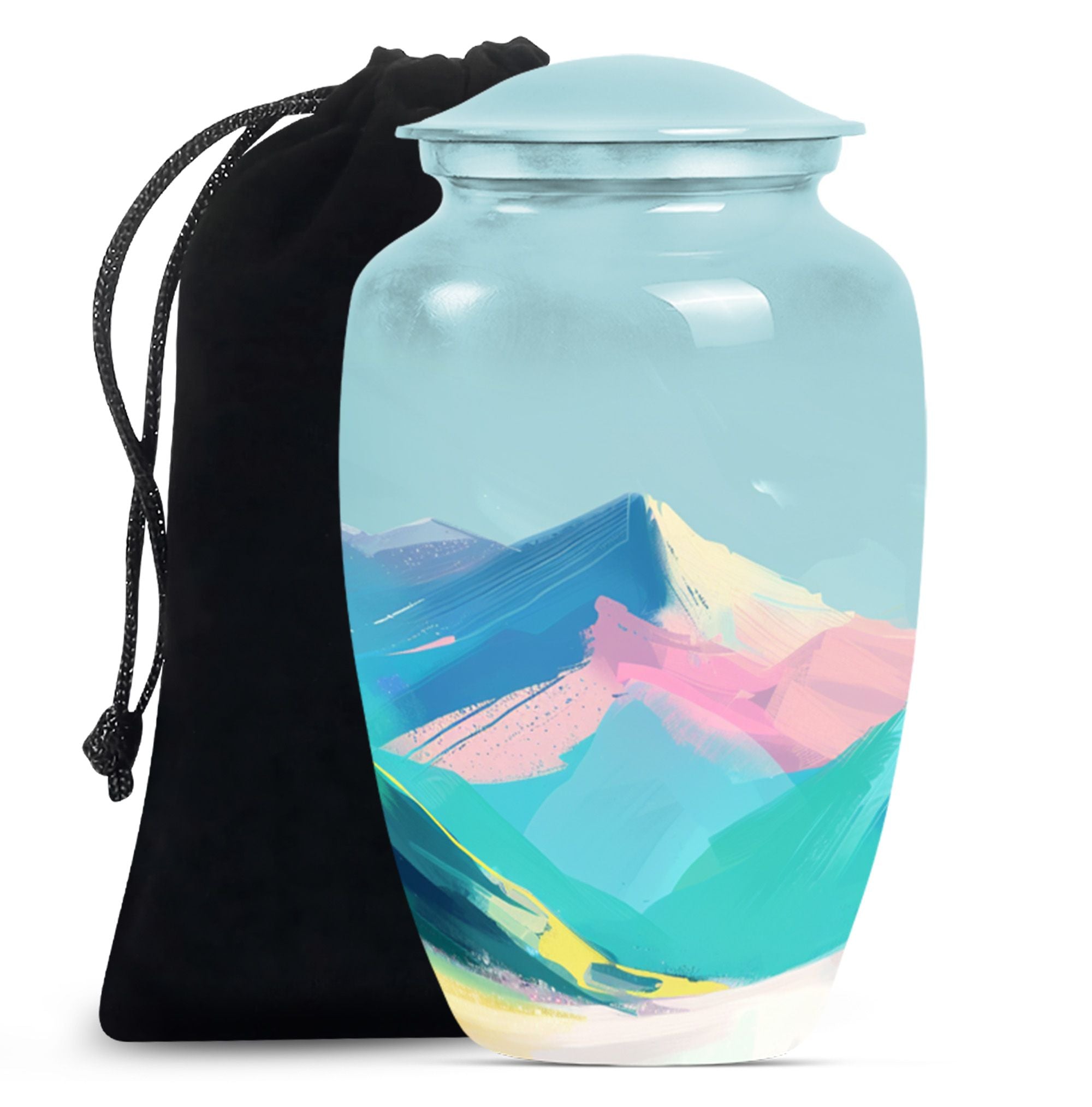 Cherish the memories of your loved ones with our unique MOUNTAINS Urn, a standout amongst burial urns specifically designed for cremation ashes. Our large urn, at a prominent 10 inch size, is both substantive and elegant, facilitating personal reverence and dignity. Manufactured from superior quality aluminium, the urn is robust, weighing in at 3.3 pounds, with dimensions of 10 inches in height. Our Purple Meadow Theme is not only visually captivating but also reflects tranquility, designed to offer solace at times of remembrance. Additionally, our urn can accommodate up to 200 cubic inches, ensuring ample space. The urn comes with a velvet pouch, providing a secure containment for the ashes and enhancing the overall respectful presentation. We offer the added virtue of personalization, allowing you to engrave names and keep the memories of your beloved alive. When searching for cremation urns for burial or urns for adult human ashes, remember our MOUNTAINS Urn, a perfect blend of sturdiness, subtle elegance, and personal touch.