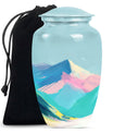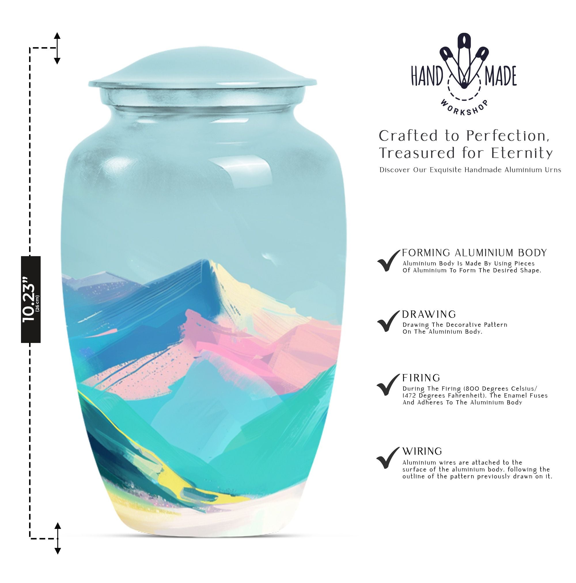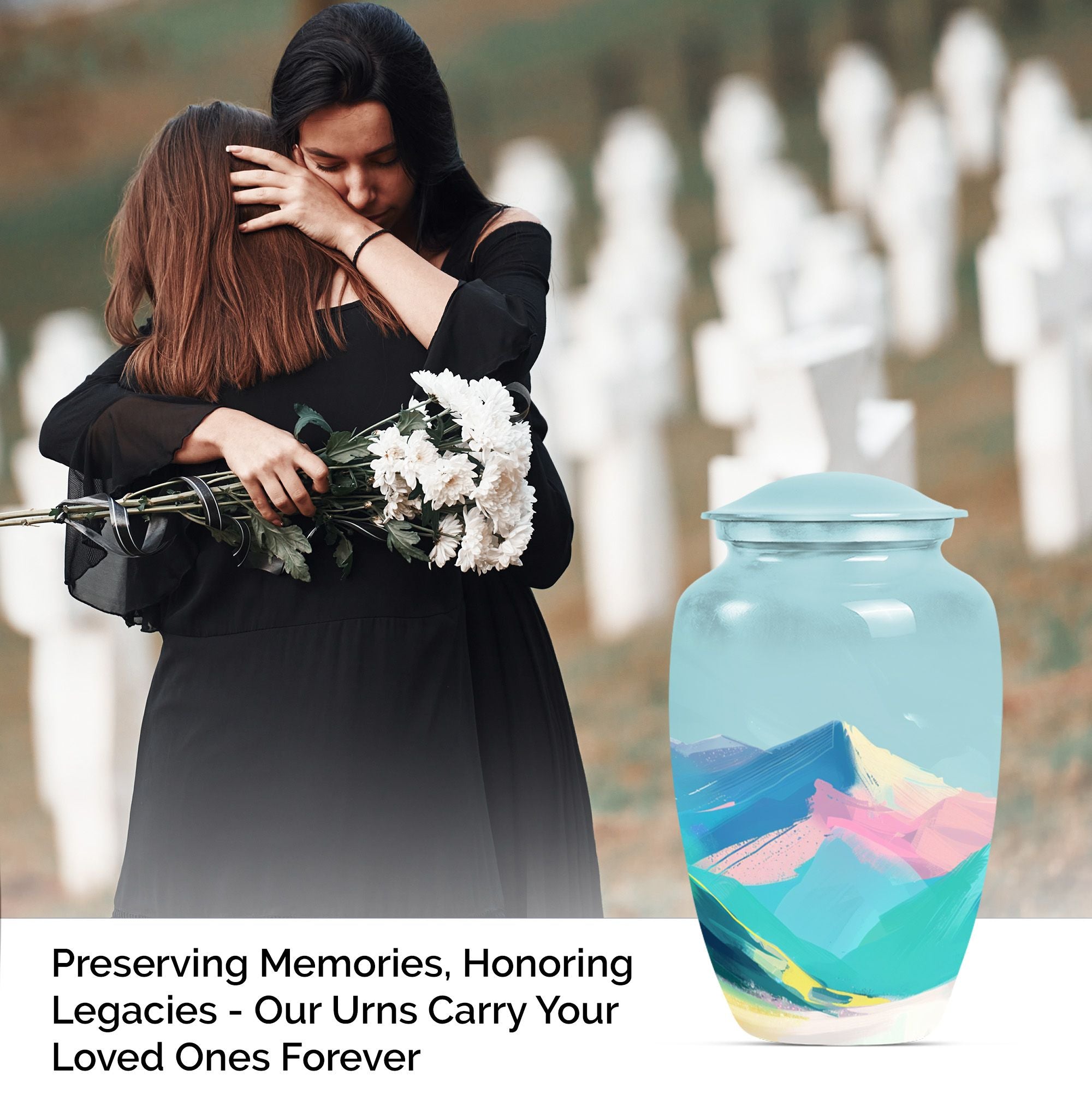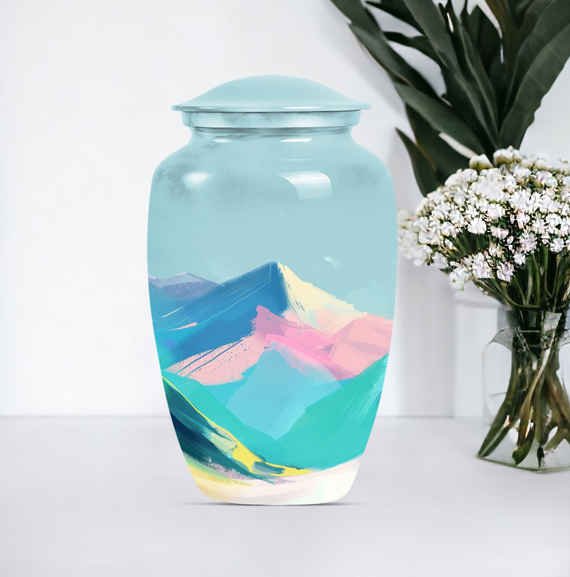 Cherish the memories of your loved ones with our unique MOUNTAINS Urn, a standout amongst burial urns specifically designed for cremation ashes. Our large urn, at a prominent 10 inch size, is both substantive and elegant, facilitating personal reverence and dignity. Manufactured from superior quality aluminium, the urn is robust, weighing in at 3.3 pounds, with dimensions of 10 inches in height. Our Purple Meadow Theme is not only visually captivating but also reflects tranquility, designed to offer solace at times of remembrance. Additionally, our urn can accommodate up to 200 cubic inches, ensuring ample space. The urn comes with a velvet pouch, providing a secure containment for the ashes and enhancing the overall respectful presentation. We offer the added virtue of personalization, allowing you to engrave names and keep the memories of your beloved alive. When searching for cremation urns for burial or urns for adult human ashes, remember our MOUNTAINS Urn, a perfect blend of sturdiness, subtle elegance, and personal touch.
