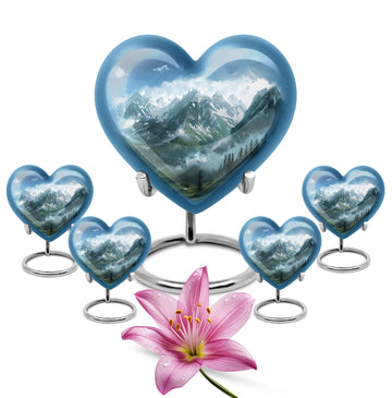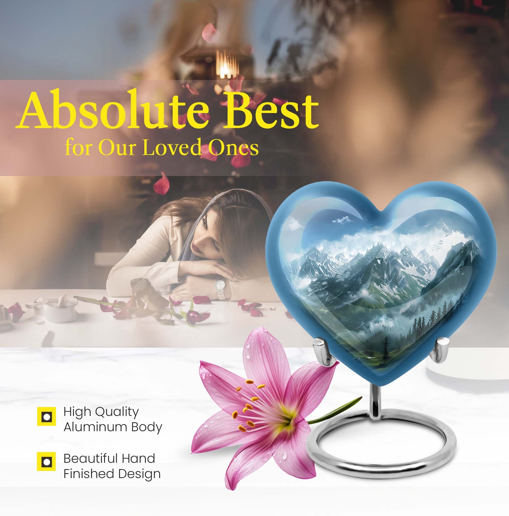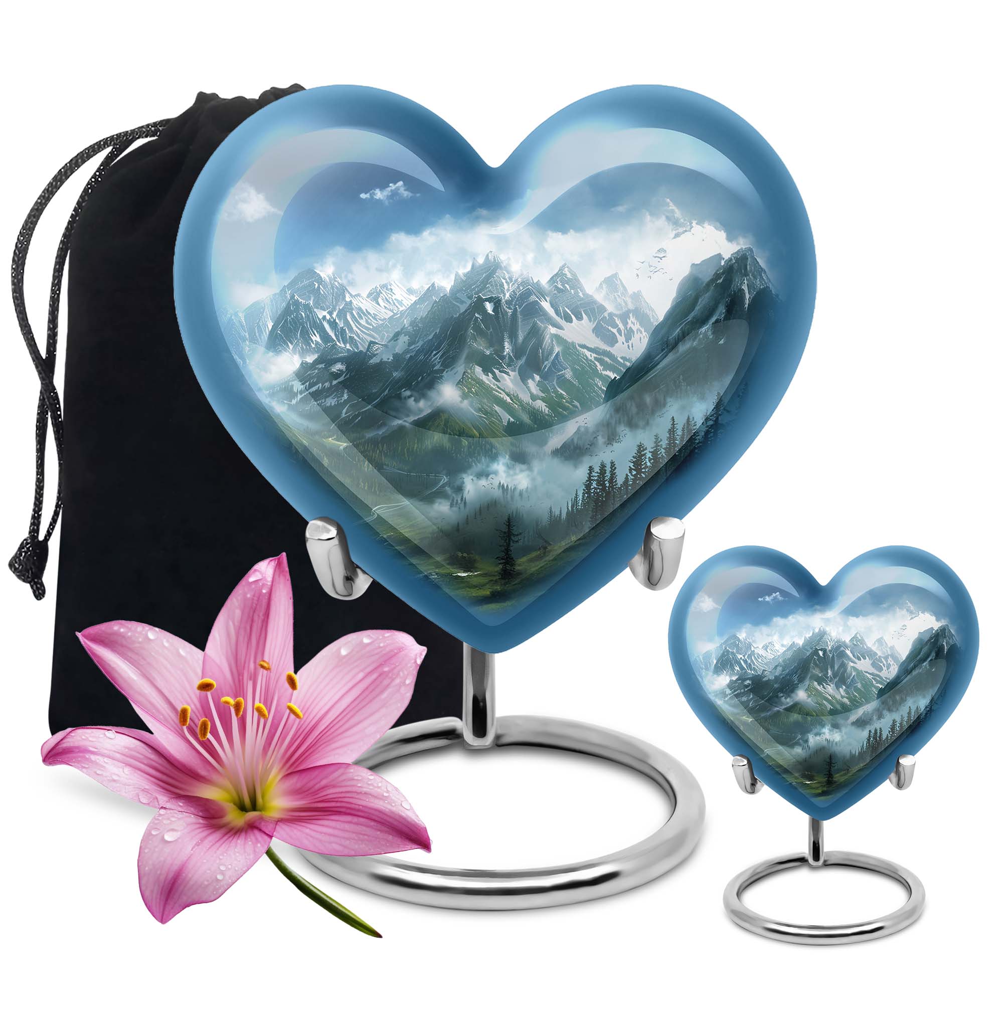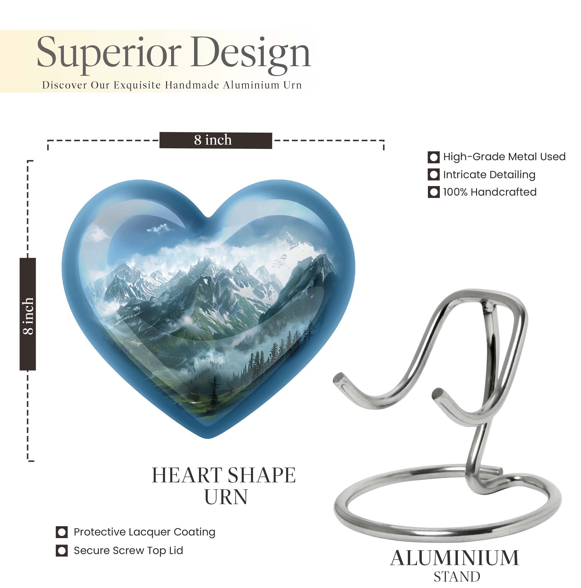 Honor your loved one and celebrate their life with our exclusive MOUNTAINS Urn. Made from superior quality aluminium, this funeral burial urn stands at a noticeable 10-inch height, boasting a beauty as enduring as your cherished memories. We understand your need for a special resting place for the remains of your dear person. Our urn comes with the capacity to hold 200 cubic inches of ashes. This large urn, weighing only 3.3 pounds, is designed in a symbolic heart shape, draped subtly in a calming Purple Meadow theme. It offers you a profound yet unspoken way to express your heartfelt affection, making it stand out among other adult cremation urns. We also acknowledge the value of individual sentiments; hence we offer personalizing options where you can engrave names of your choice. Moreover, a velvet pouch is provided for the protection and containment of the ashes. Make a meaningful choice for memorial ceremony supplies with our MOUNTAINS cremation urn, a remembrance as unique as the life it signifies.