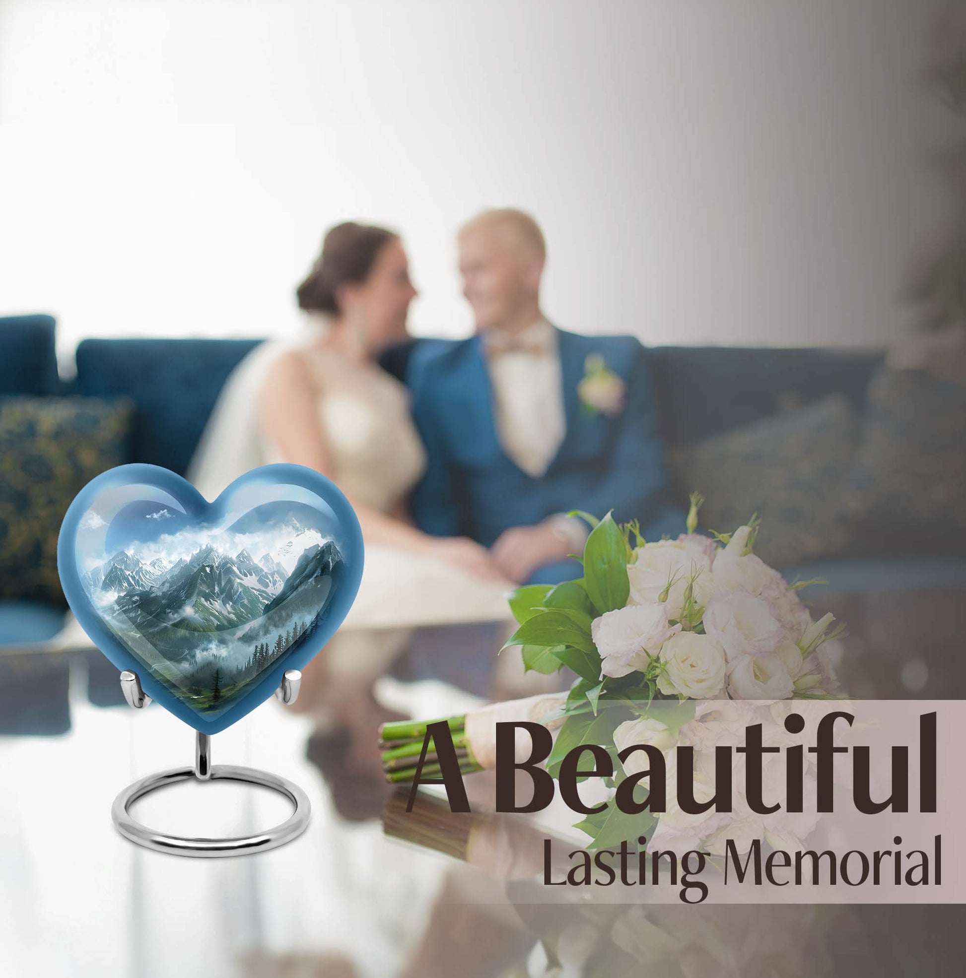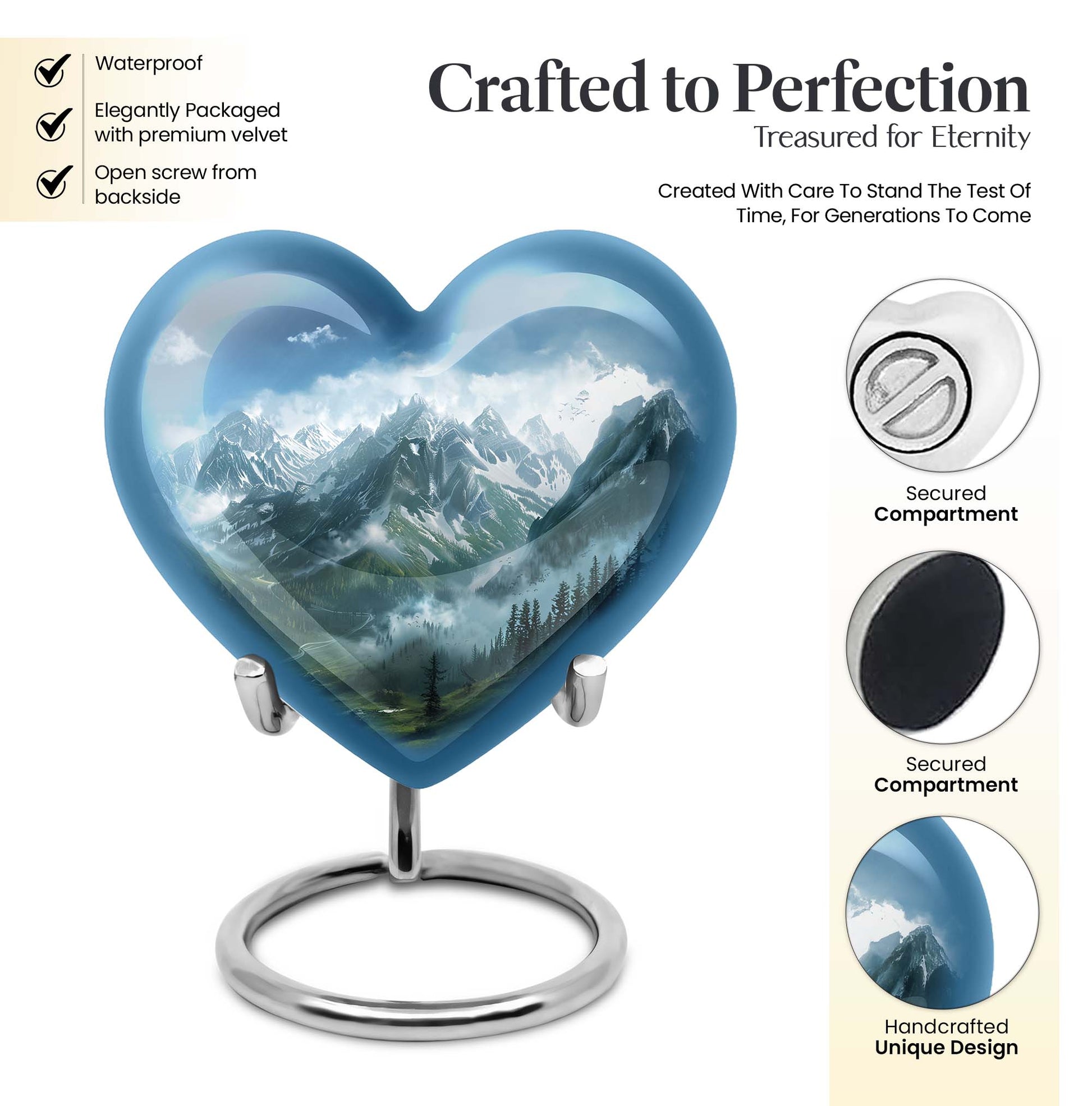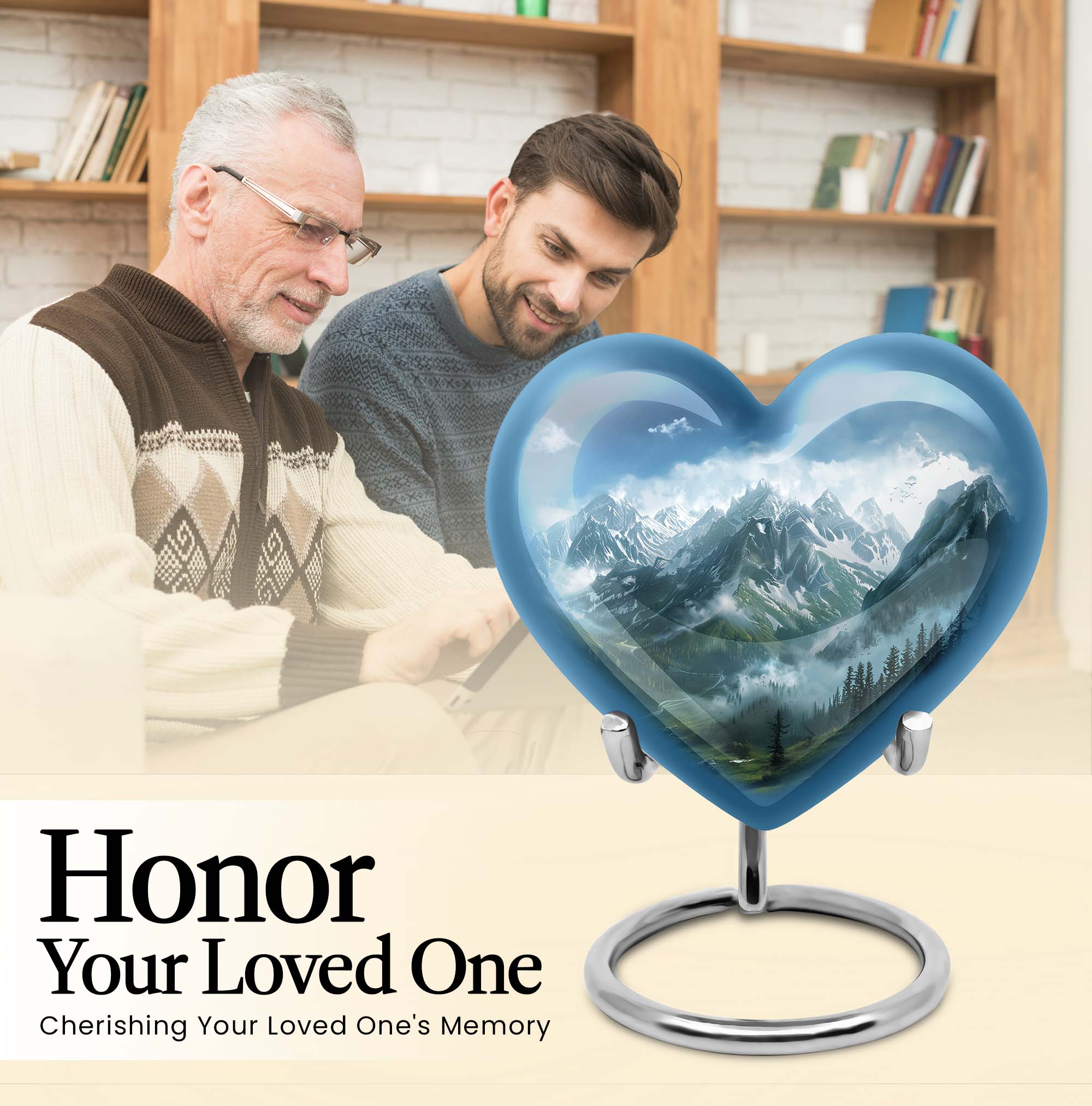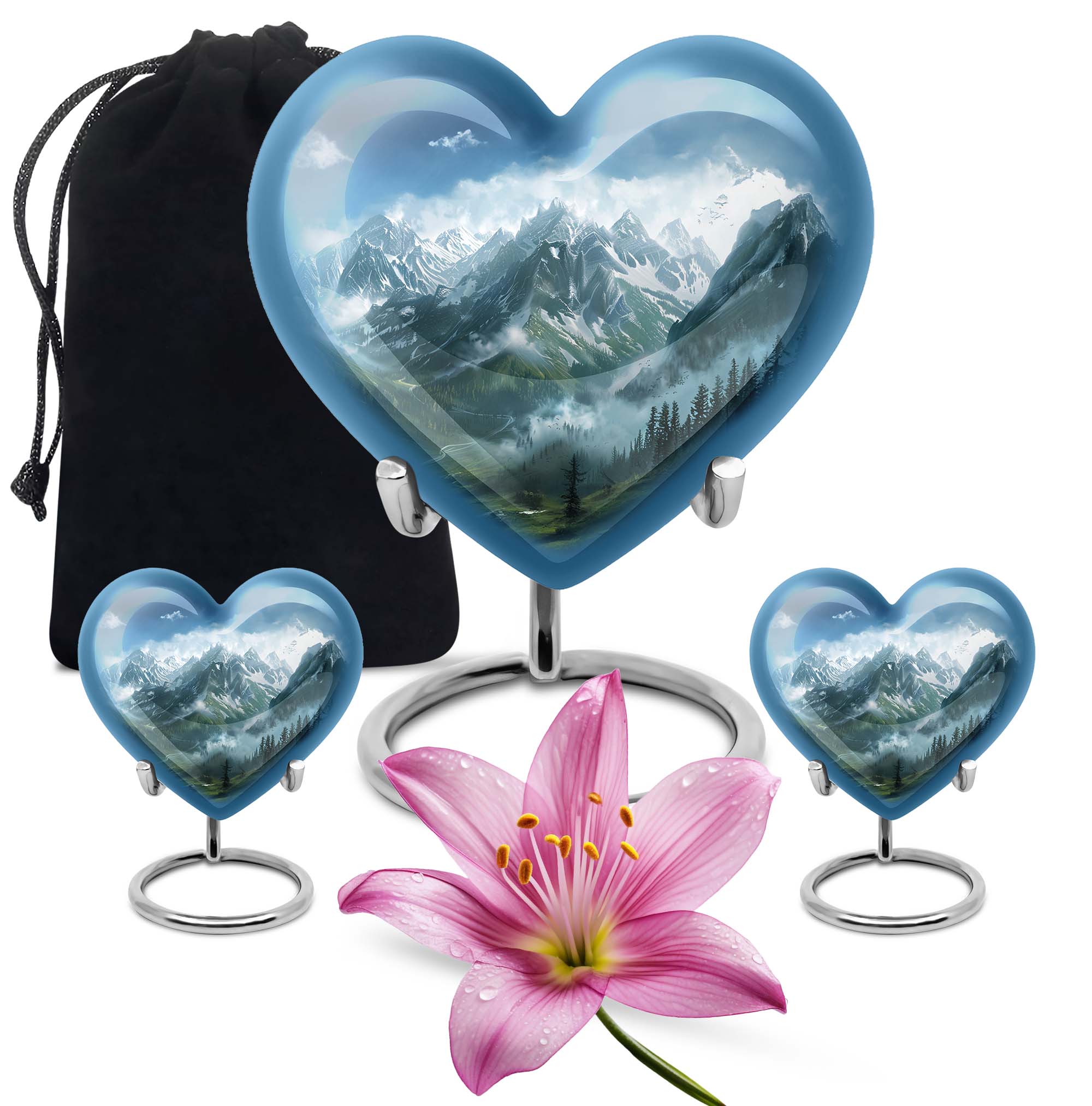 Honor your loved one and celebrate their life with our exclusive MOUNTAINS Urn. Made from superior quality aluminium, this funeral burial urn stands at a noticeable 10-inch height, boasting a beauty as enduring as your cherished memories. We understand your need for a special resting place for the remains of your dear person. Our urn comes with the capacity to hold 200 cubic inches of ashes. This large urn, weighing only 3.3 pounds, is designed in a symbolic heart shape, draped subtly in a calming Purple Meadow theme. It offers you a profound yet unspoken way to express your heartfelt affection, making it stand out among other adult cremation urns. We also acknowledge the value of individual sentiments; hence we offer personalizing options where you can engrave names of your choice. Moreover, a velvet pouch is provided for the protection and containment of the ashes. Make a meaningful choice for memorial ceremony supplies with our MOUNTAINS cremation urn, a remembrance as unique as the life it signifies.