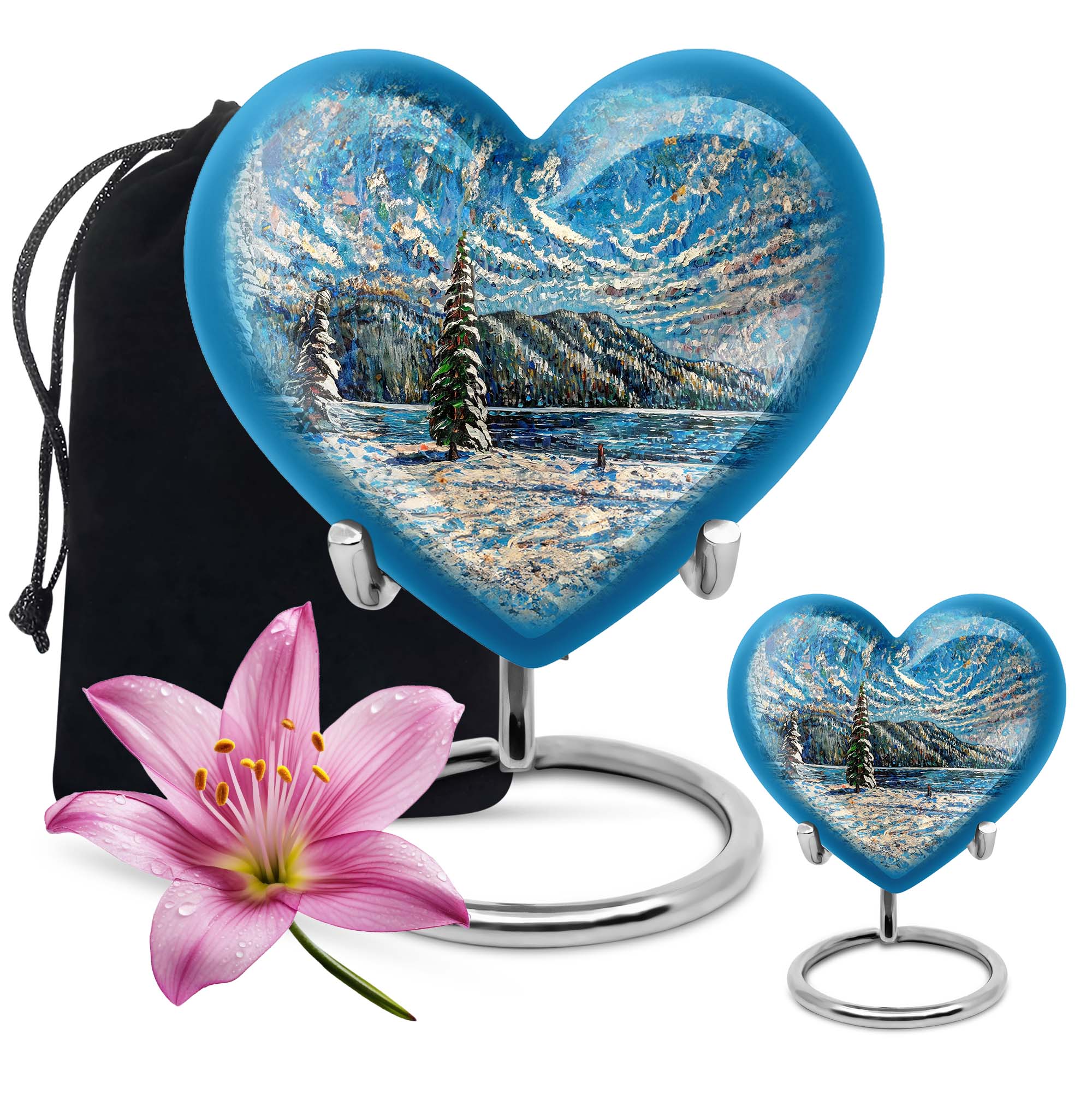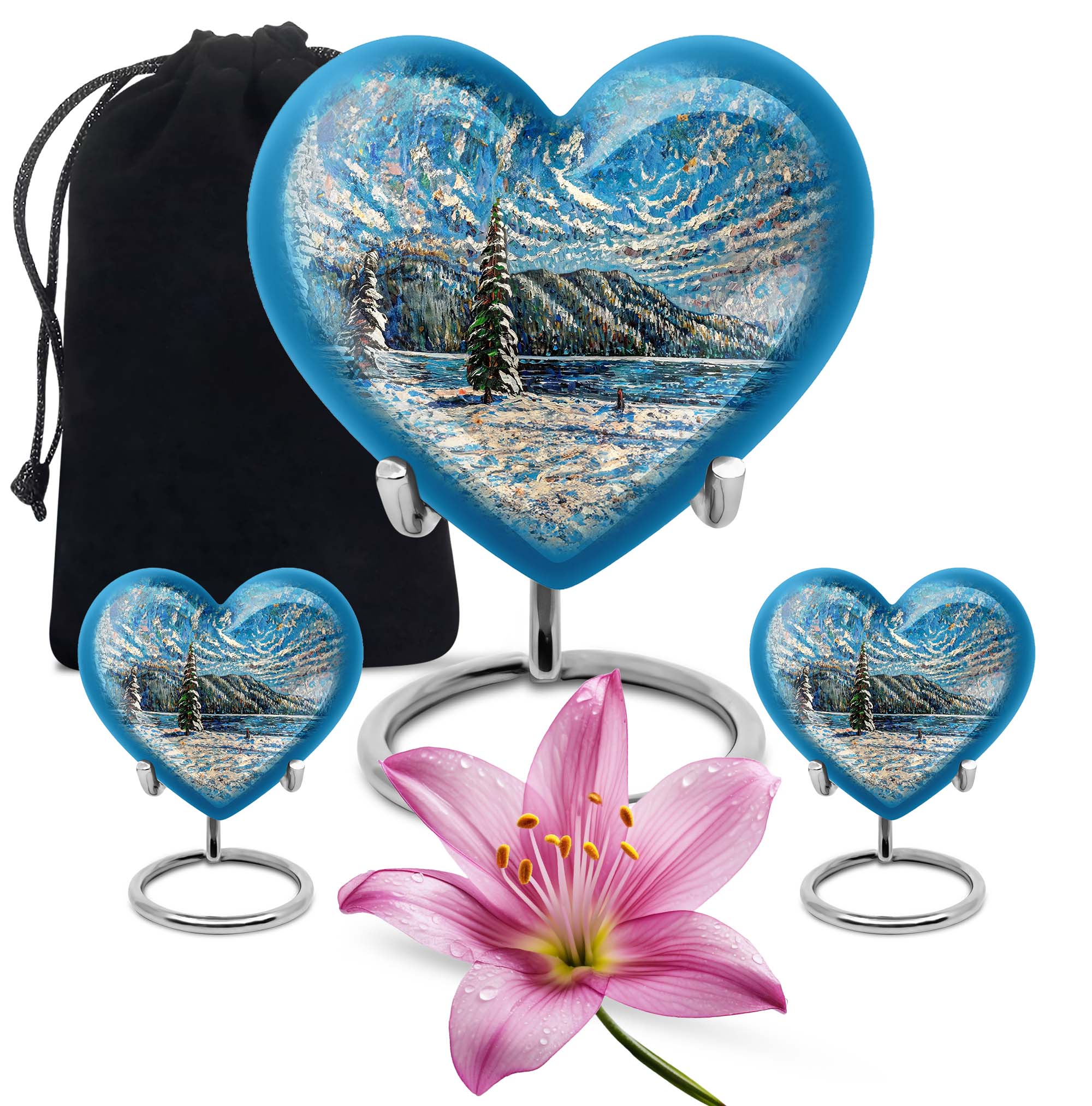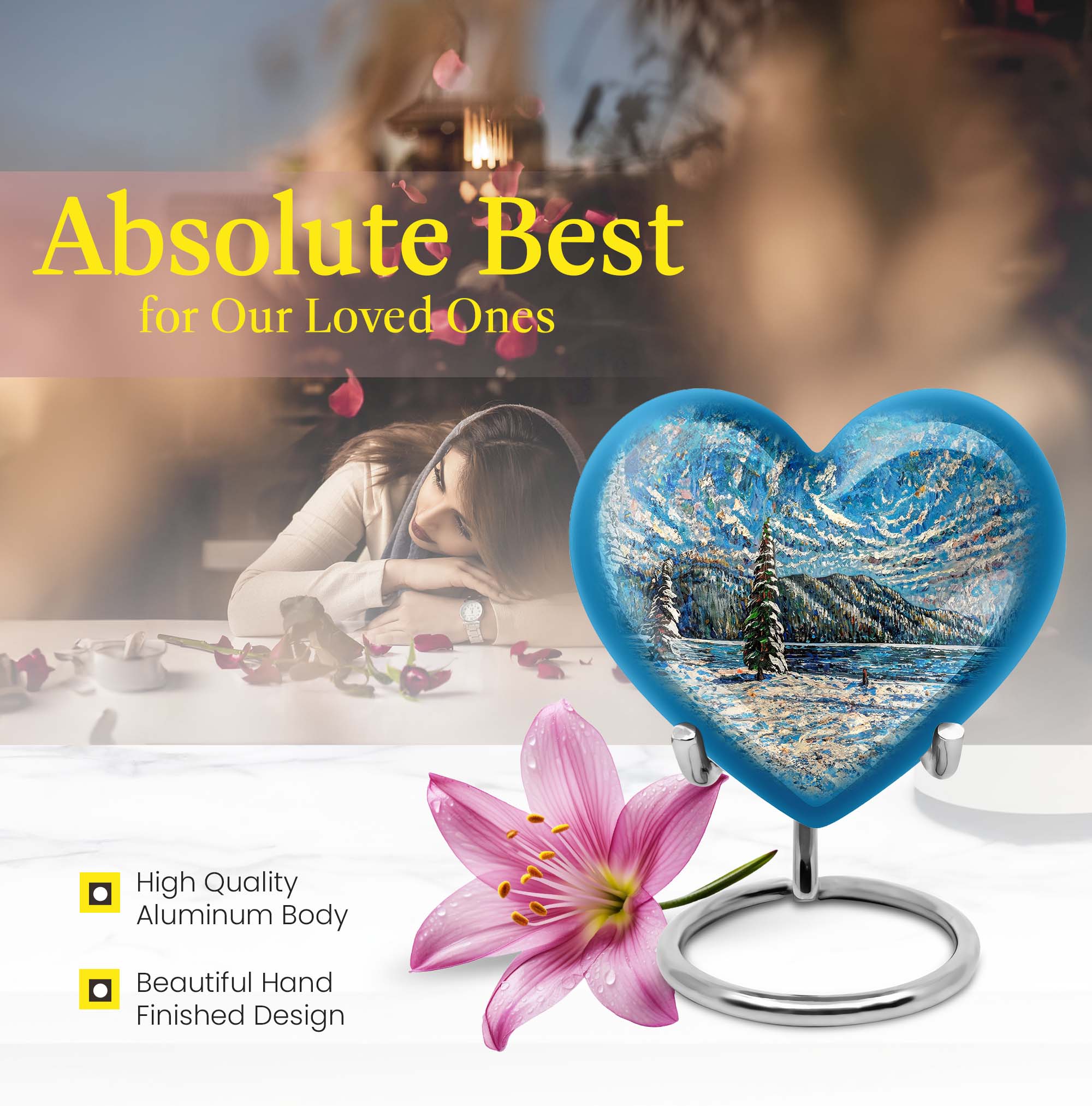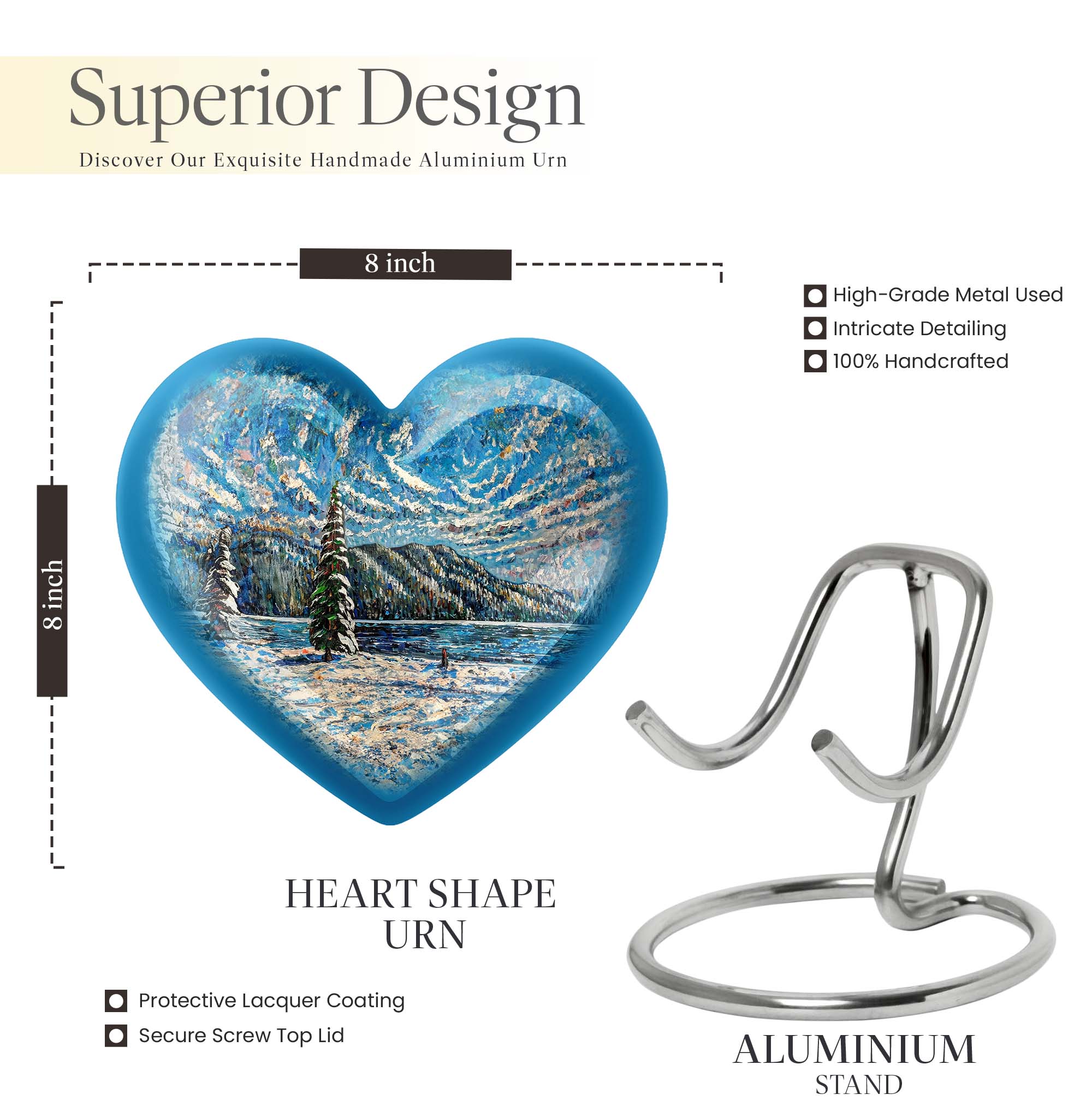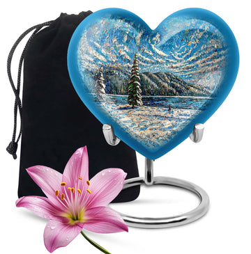 Preserve the cherished memories of your loved ones with our spectacular Mountains Urn. This abstract-themed cremation urn serves as an ideal commemoration to your departed. It comes in a grand 10-inch size, carefully fabricated from high-quality aluminium ensuring long-term durability. Despite its ample capacity of 200 cubic inches, this large urn weighs just 3.3 pounds. It is designed to securely hold the ashes of adult men and women, making it an ideal choice for burial funeral urns. Its notable heart urn design provides a unique, captivating appeal adding a sentimental value to each piece. To add an extra touch, you can customize the urn with engraved names, making it a truly unique memento. It comes with a refined velvet pouch for the safekeeping of the ashes. For a fitting tribute to your dearly departed, consider this urn that cleverly merges tangible remembrance with the sentiment of the heart.