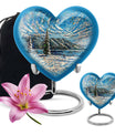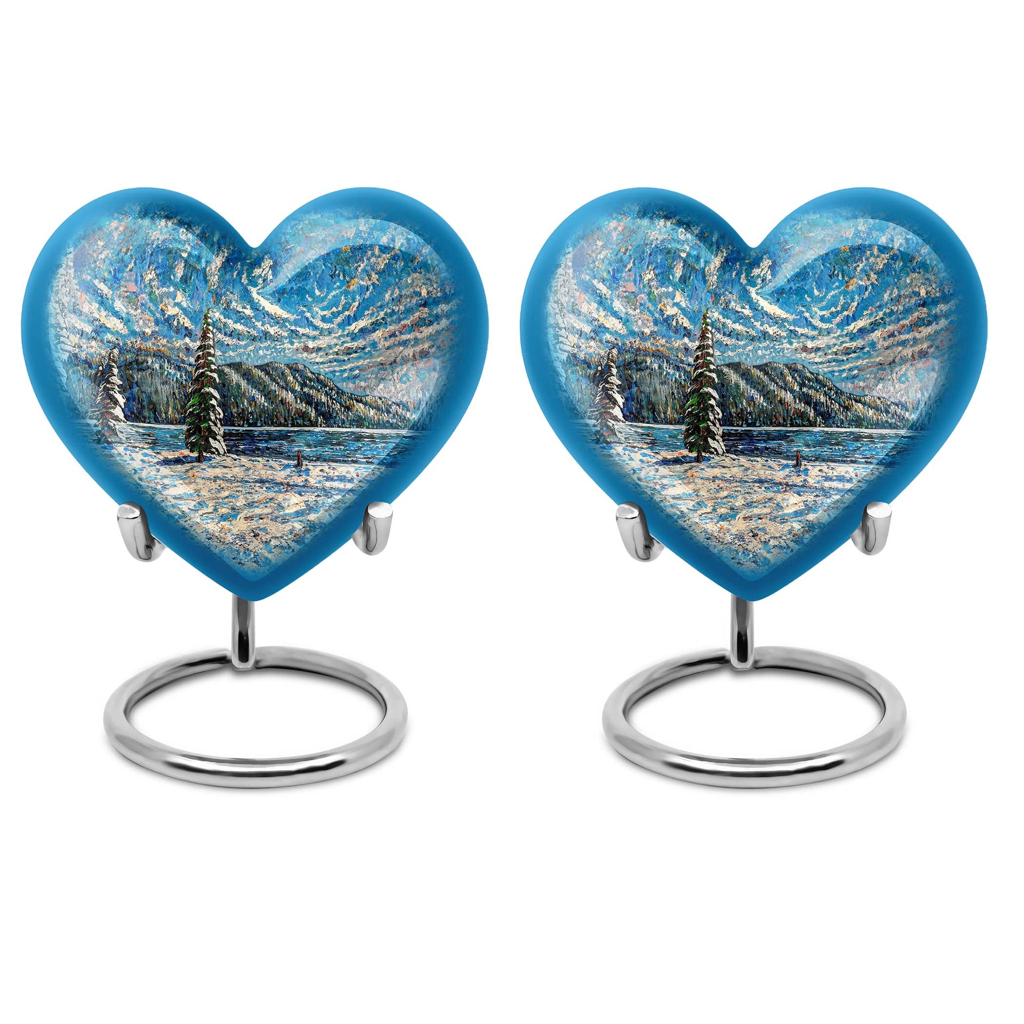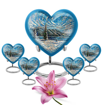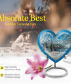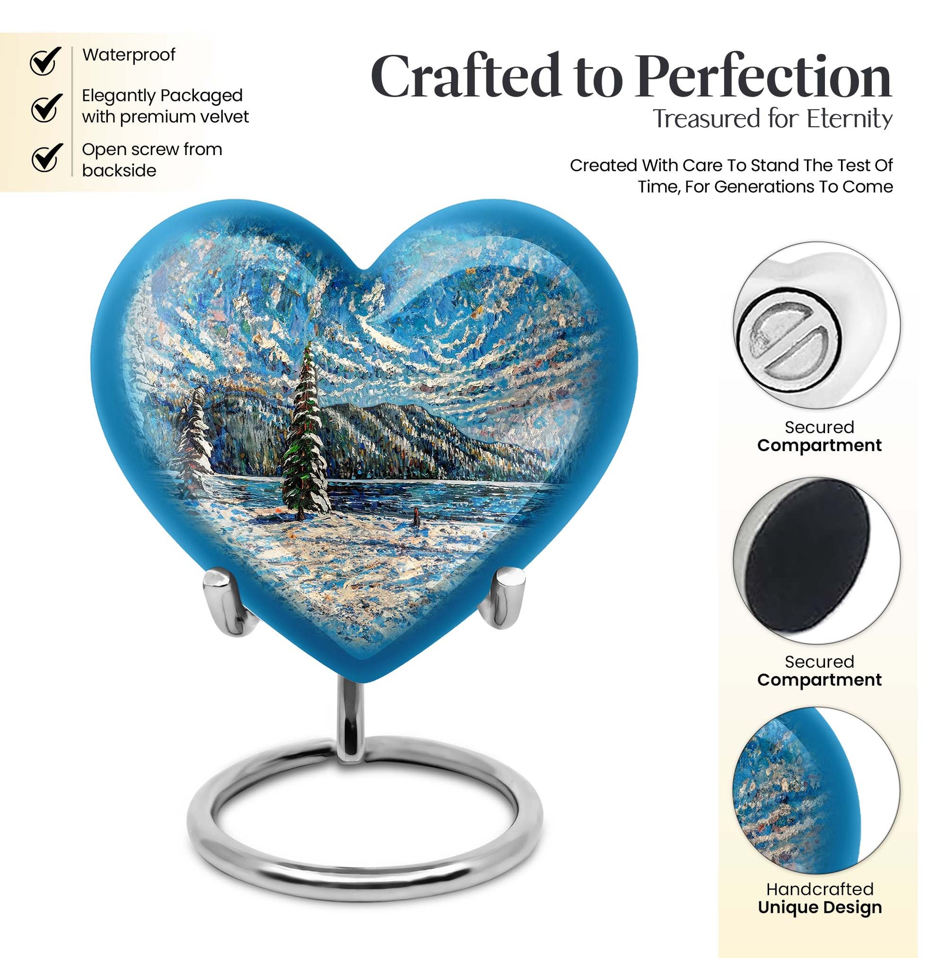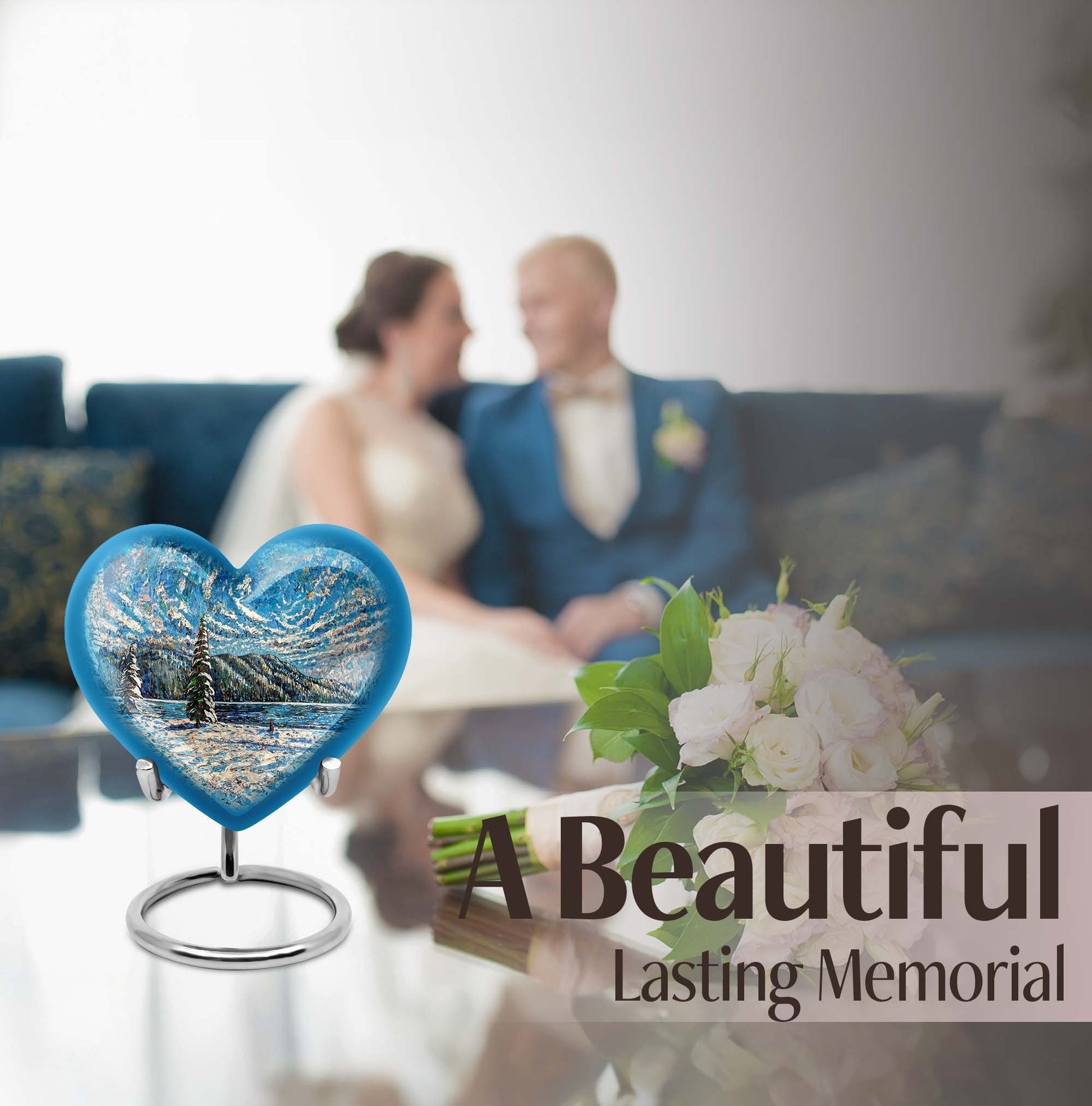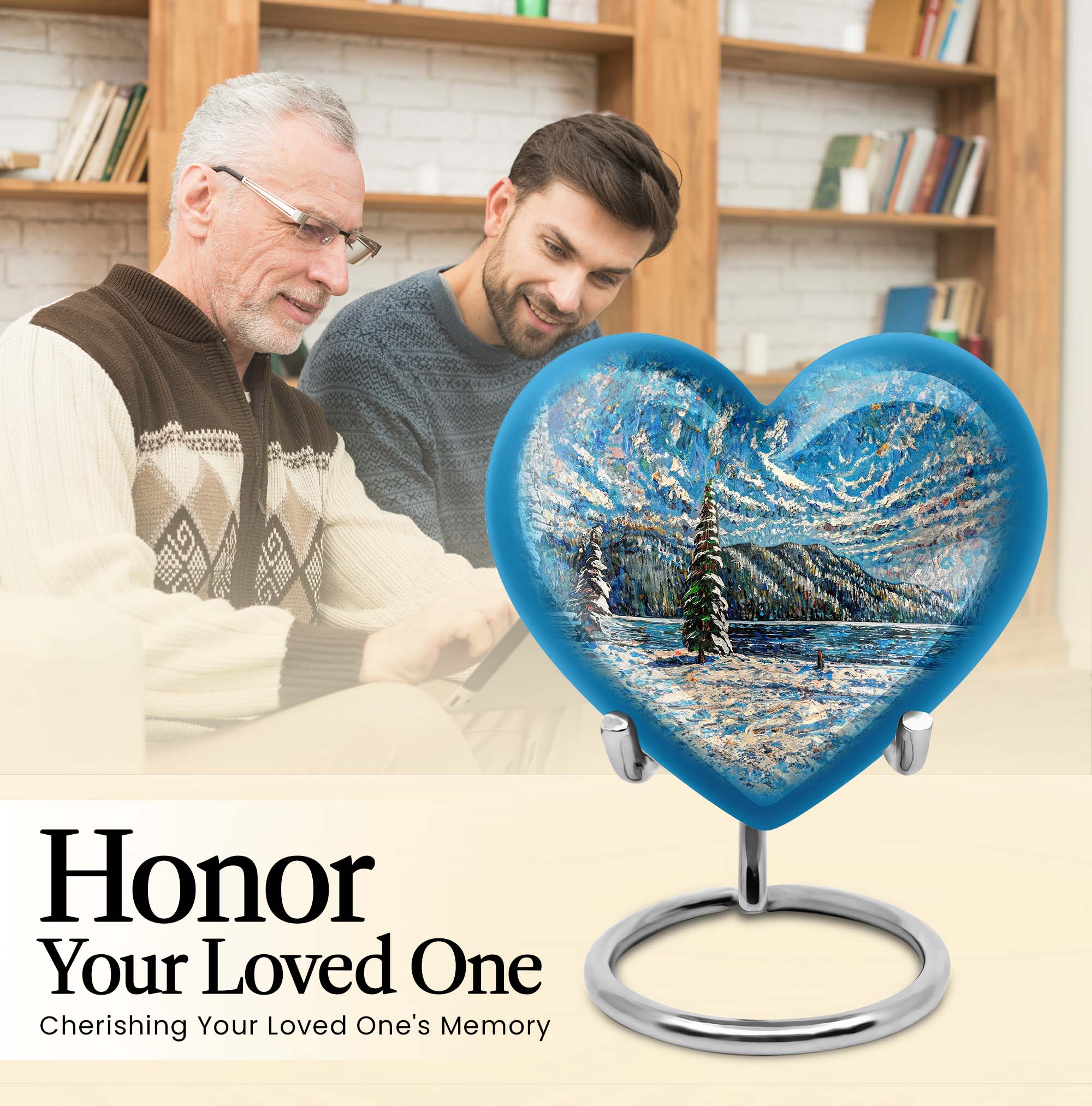 Preserve the cherished memories of your loved ones with our spectacular Mountains Urn. This abstract-themed cremation urn serves as an ideal commemoration to your departed. It comes in a grand 10-inch size, carefully fabricated from high-quality aluminium ensuring long-term durability. Despite its ample capacity of 200 cubic inches, this large urn weighs just 3.3 pounds. It is designed to securely hold the ashes of adult men and women, making it an ideal choice for burial funeral urns. Its notable heart urn design provides a unique, captivating appeal adding a sentimental value to each piece. To add an extra touch, you can customize the urn with engraved names, making it a truly unique memento. It comes with a refined velvet pouch for the safekeeping of the ashes. For a fitting tribute to your dearly departed, consider this urn that cleverly merges tangible remembrance with the sentiment of the heart.
