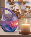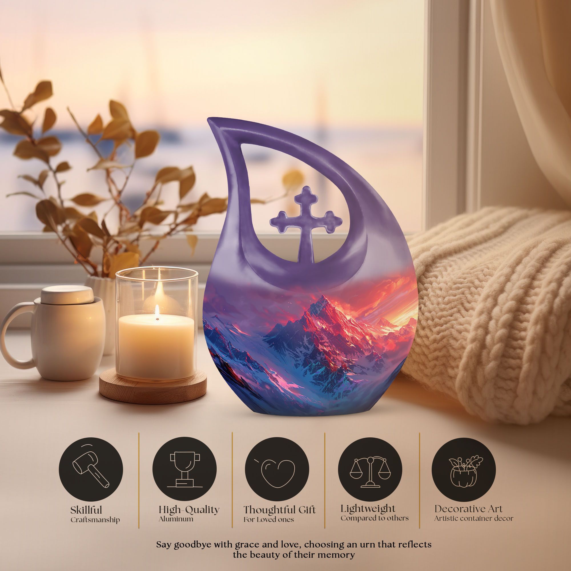 Expertly handcrafted from durable aluminum, this cremation urn for men and women features a stunning mountain landscape design inspired by the grandeur of Everest. Shades of silver, blue, and white create a peaceful, majestic effect, while the smooth finish brings an elegant touch to any memorial setting. With a secure screw-top lid, this large urn for female & male ensures your loved one’s ashes are preserved safely for generations.