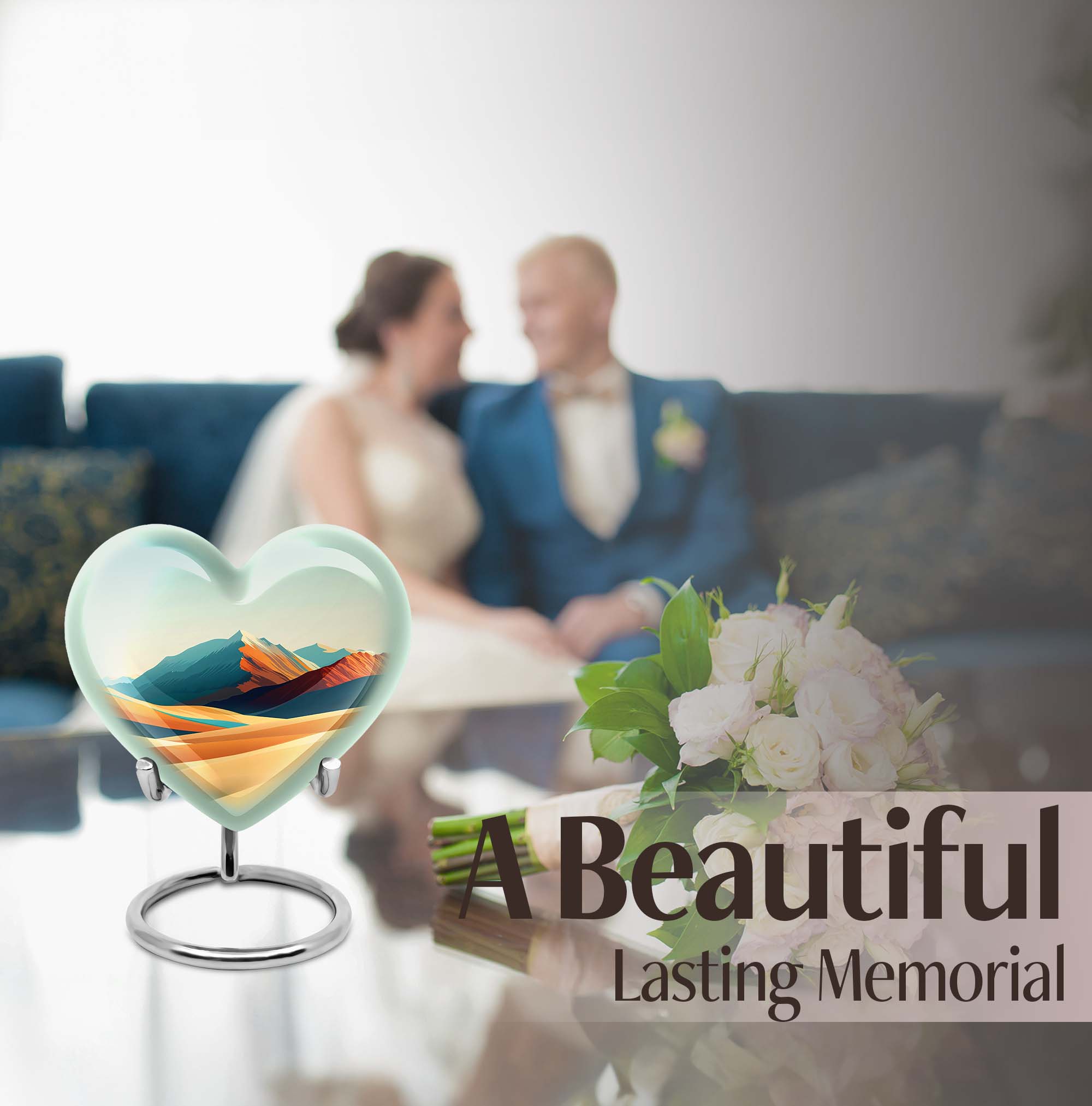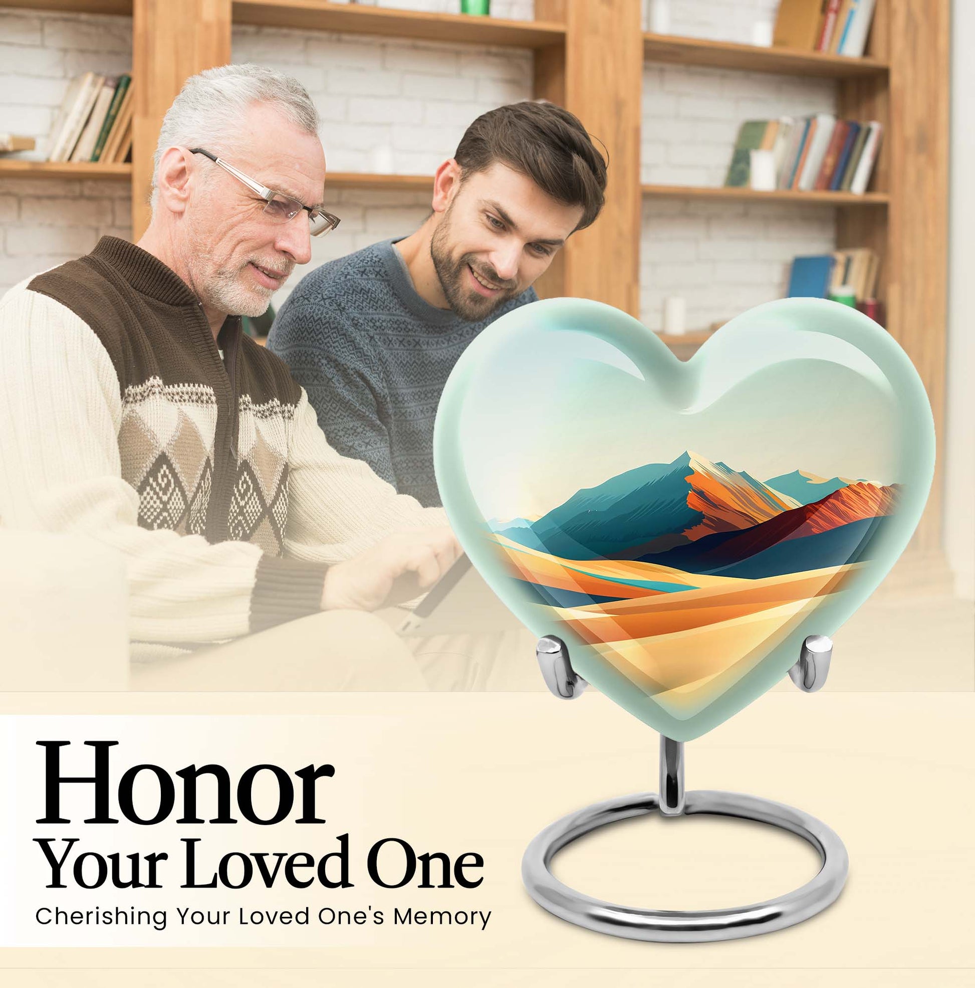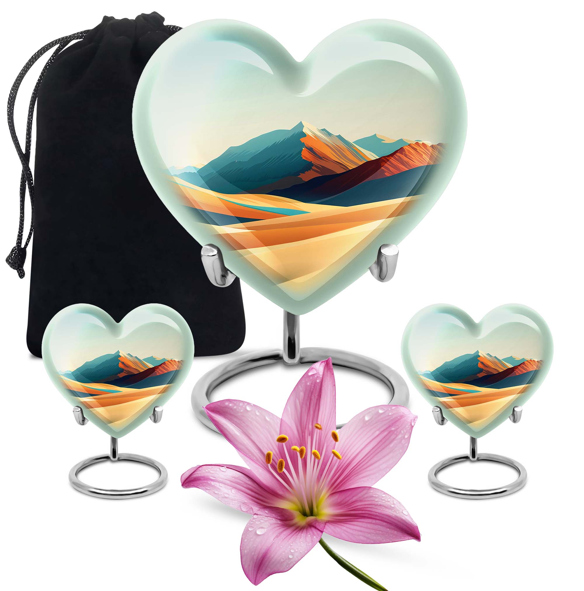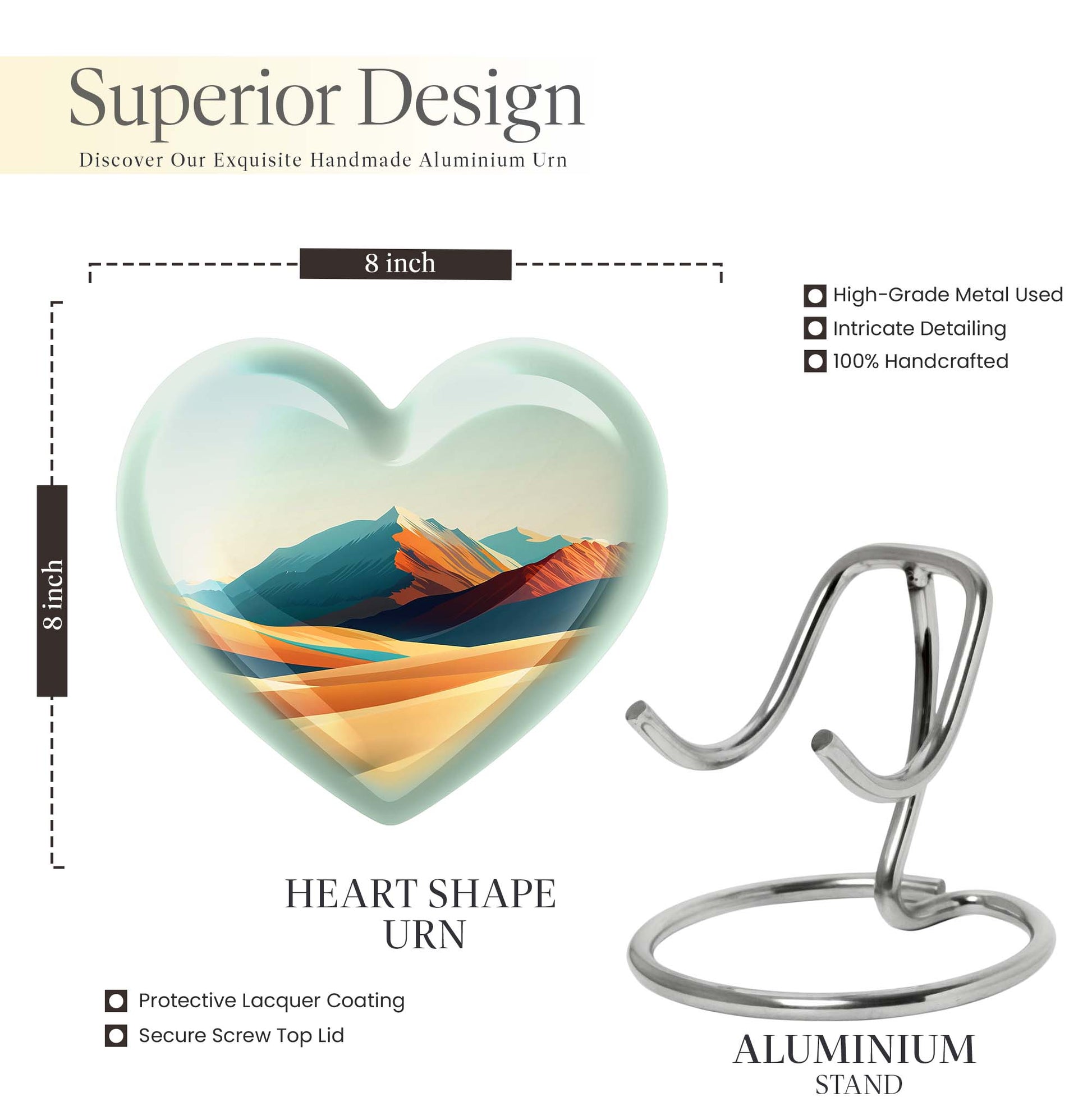 Honor your departed loved ones with this meticulously crafted heart urinal - a touching symbol of everlasting love and remembrance. This cremation urn, designed for adults and seniors, stands impressively at 10 inches in height, embodying an abstract theme within its elegant 200 cubic inch capacity. It strikes a balance between resilience and elegance, being made from durable and sophisticated aluminum. Weighing just 3.3 pounds, it's spacious enough to hold the heartfelt memories conveyed by the ashes. This 'mountains urn' ensures care and respect towards your departed dear ones. With the option to personalize with engraved names, this cremation urn for dad manifests your sentiments and gives a unique touch to memorializing your loved one. The package also includes a velvet pouch providing discreet and respectful containment of ashes. Ideal for human ash burial, this large urn amplifies the profound connection between love, loss, and remembrance.