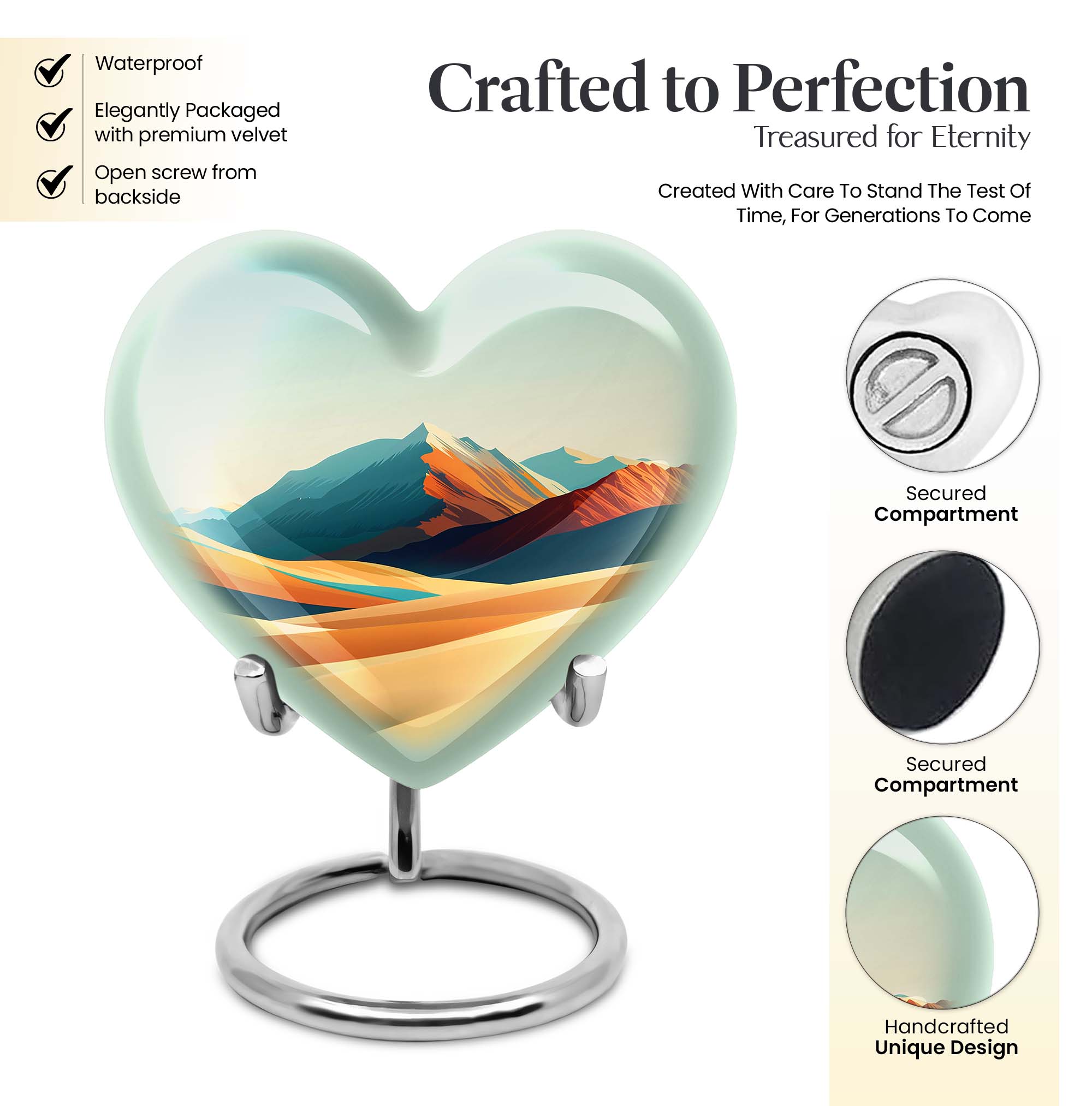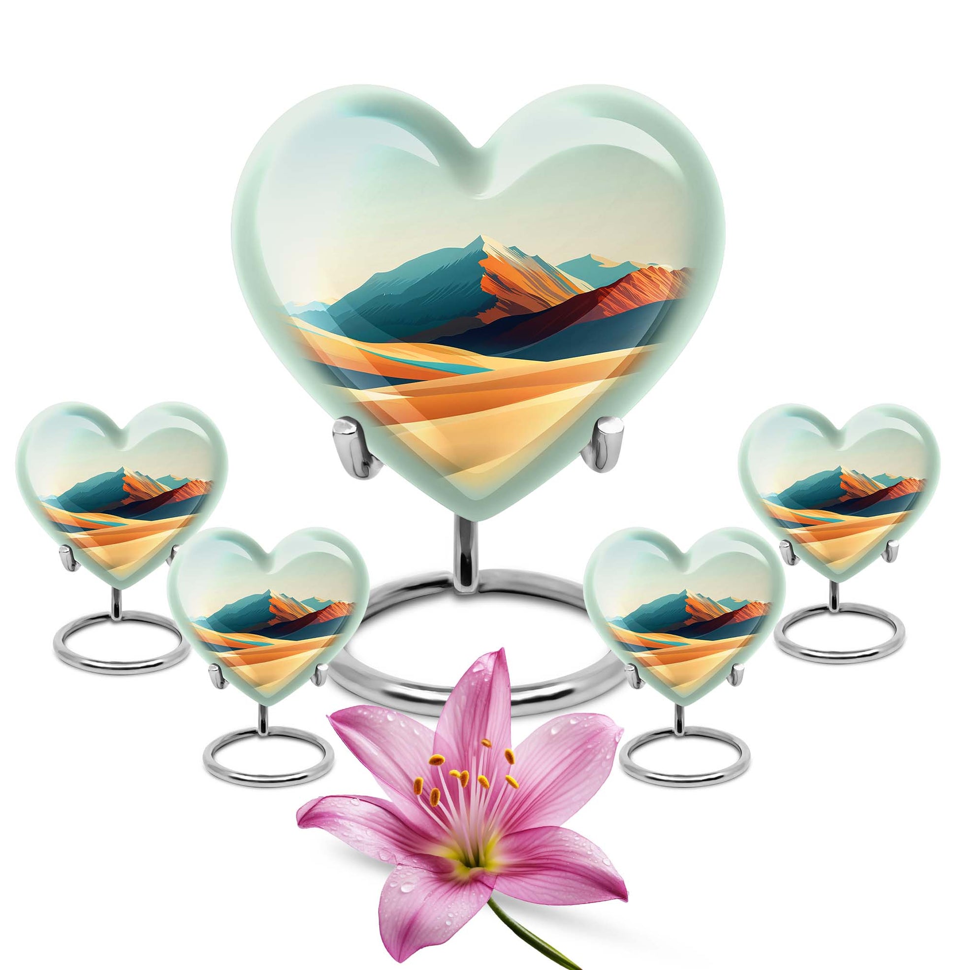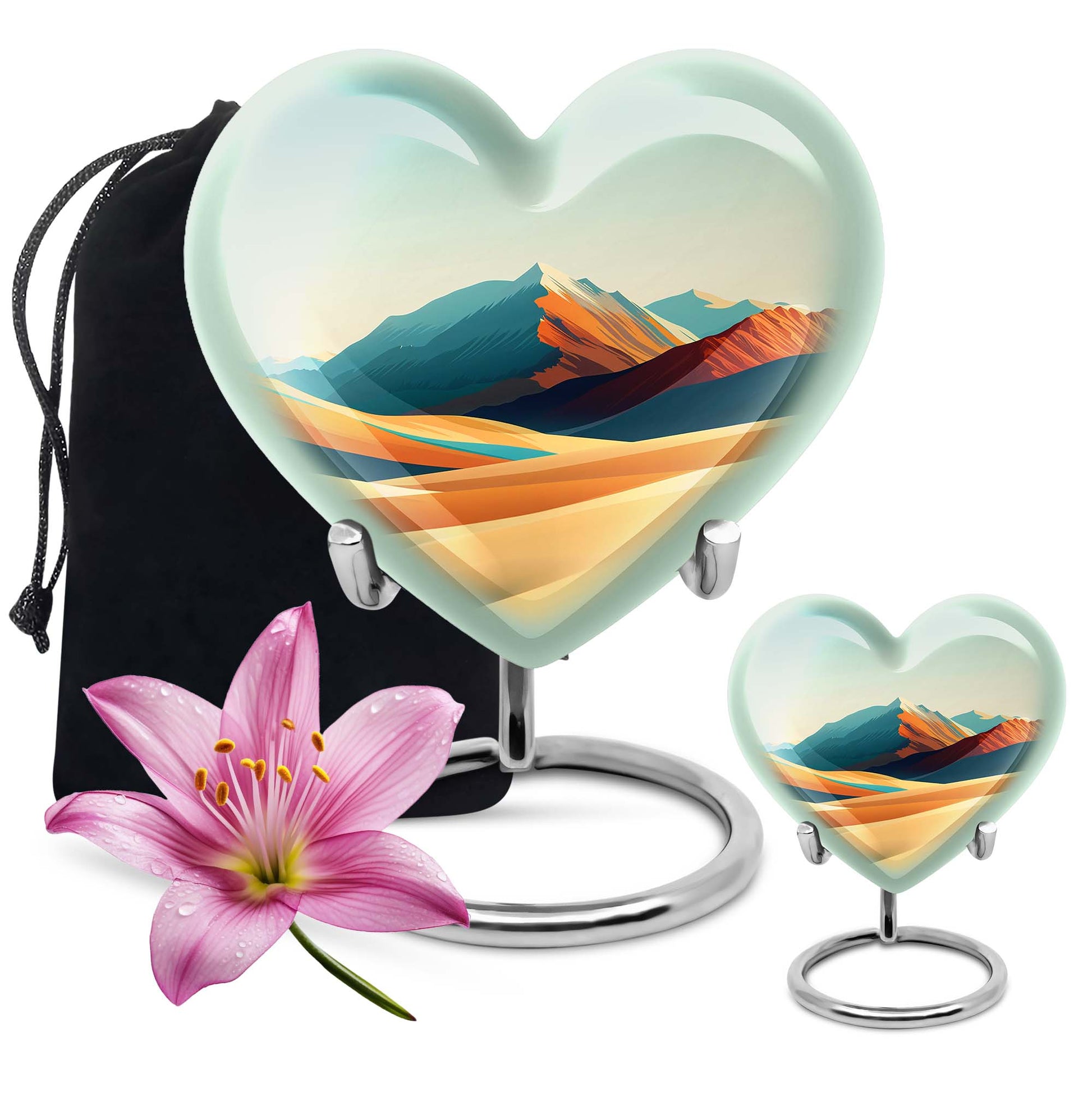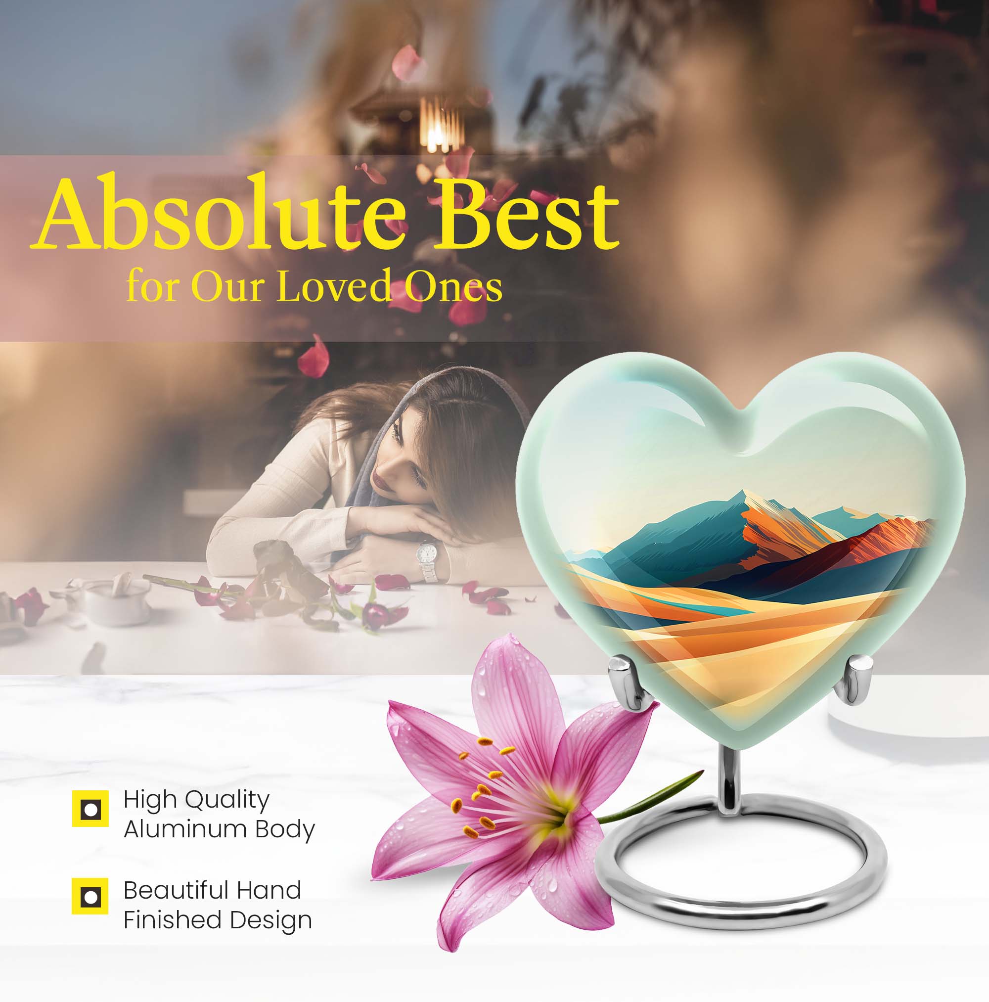 Honor your departed loved ones with this meticulously crafted heart urinal - a touching symbol of everlasting love and remembrance. This cremation urn, designed for adults and seniors, stands impressively at 10 inches in height, embodying an abstract theme within its elegant 200 cubic inch capacity. It strikes a balance between resilience and elegance, being made from durable and sophisticated aluminum. Weighing just 3.3 pounds, it's spacious enough to hold the heartfelt memories conveyed by the ashes. This 'mountains urn' ensures care and respect towards your departed dear ones. With the option to personalize with engraved names, this cremation urn for dad manifests your sentiments and gives a unique touch to memorializing your loved one. The package also includes a velvet pouch providing discreet and respectful containment of ashes. Ideal for human ash burial, this large urn amplifies the profound connection between love, loss, and remembrance.