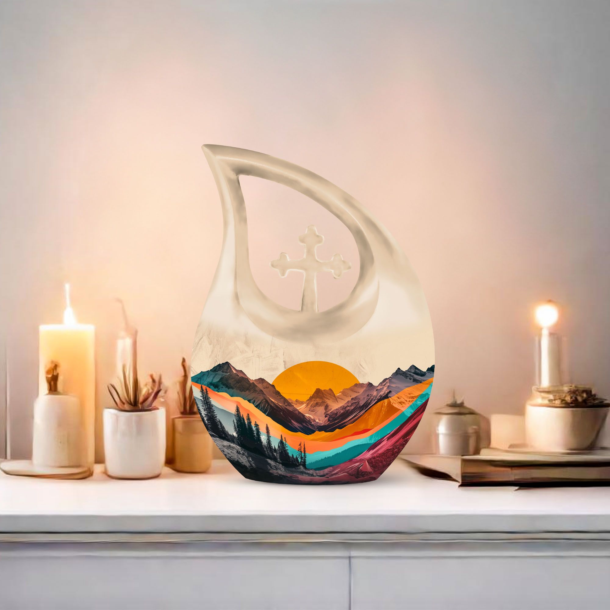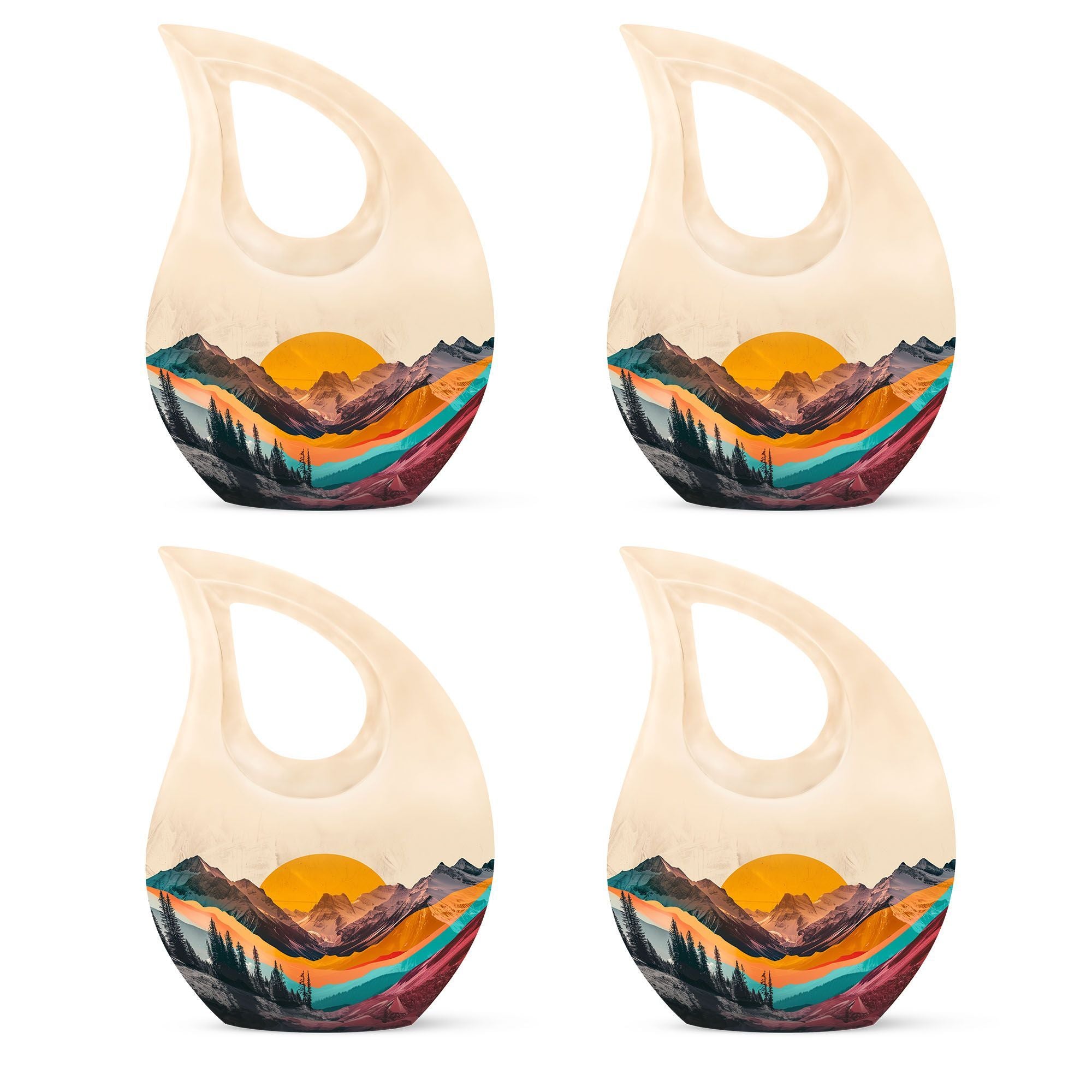 Crafted from durable aluminum, this adult cremation urn features a breathtaking mountain valley design in rich natural hues that reflect dignity and tranquility. The polished surface and secure screw-top lid ensure protection and timeless elegance. Available as a cremation urns set, it includes smaller cremation ashes keepsake urns — perfect for family members to share in remembrance. Each piece in this cremation urns for human ashes adult set is designed to safeguard precious memories while bringing visual harmony to any memorial display.