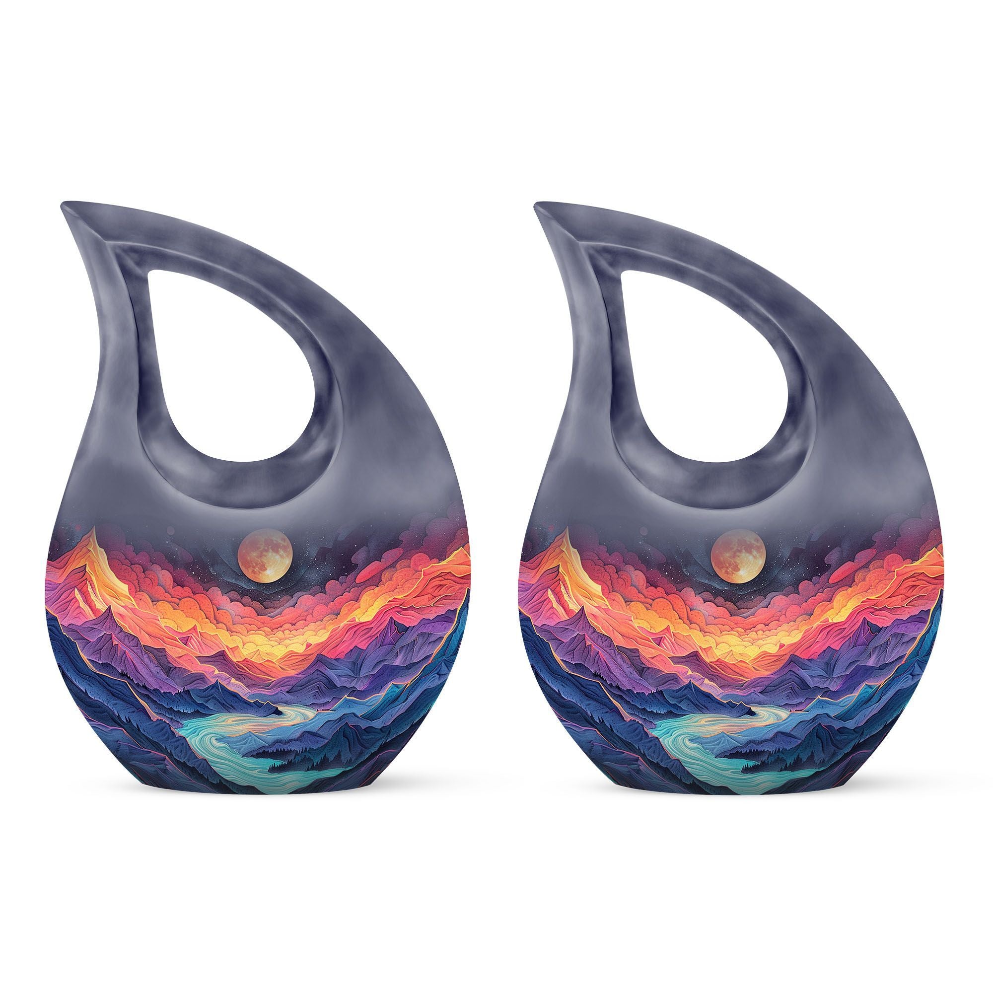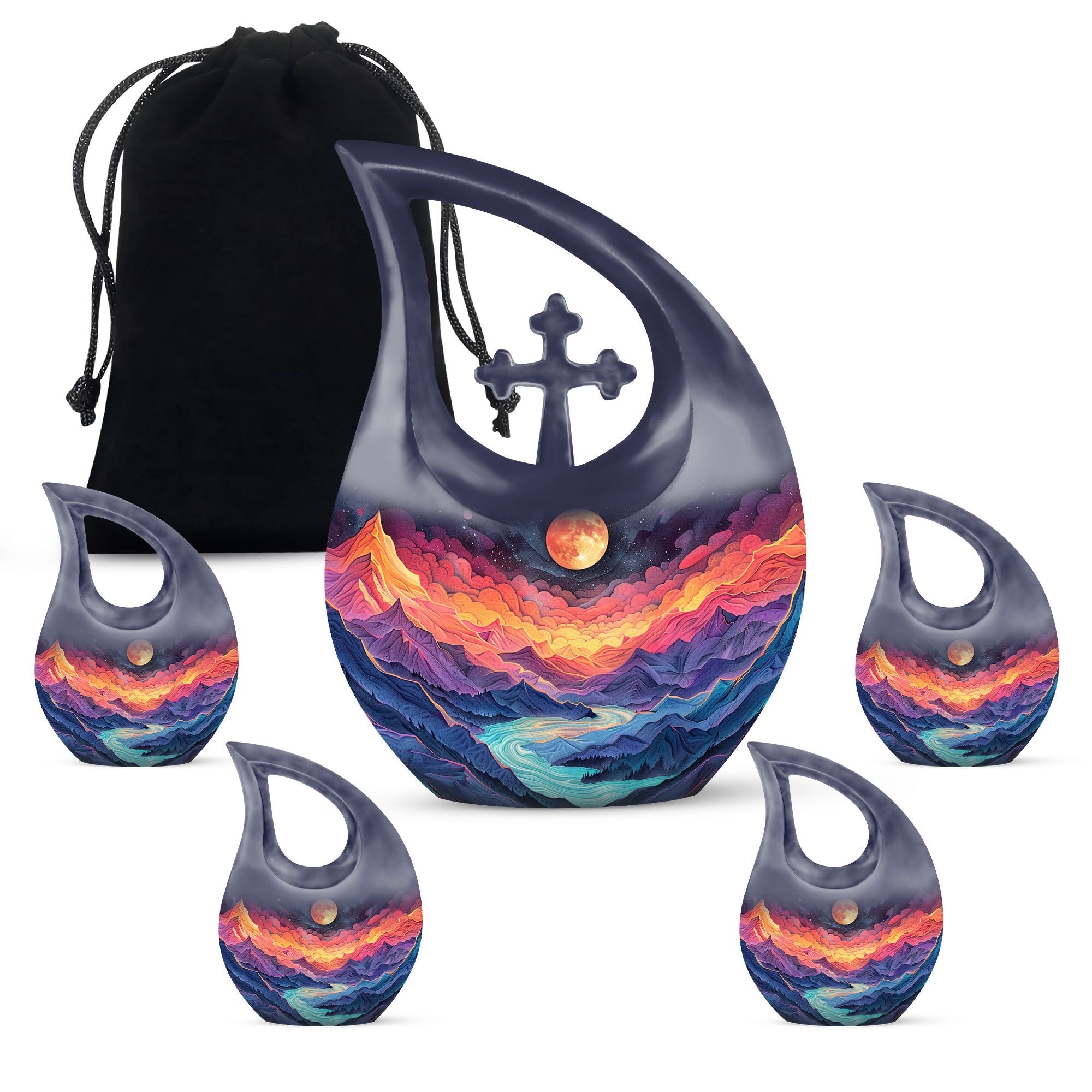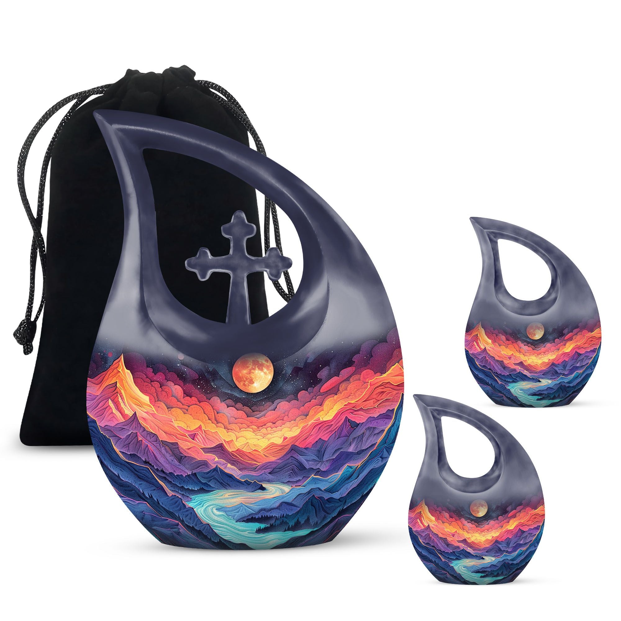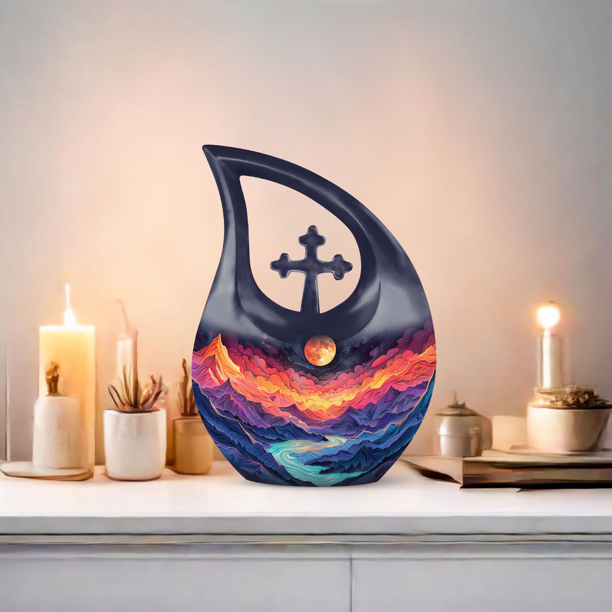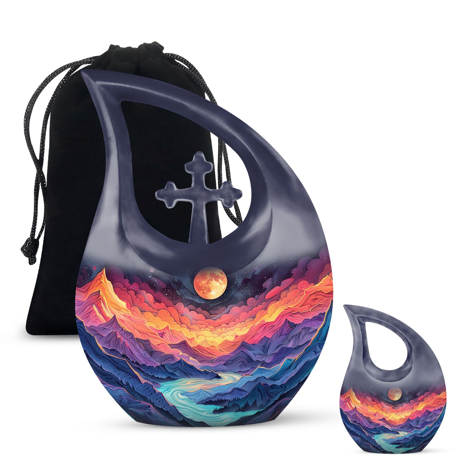 Crafted with precision from durable aluminum, this large and keepsake urn for funeral features a hand-painted mountain scene in soothing tones of blue, white, and gold. Each detail reflects tranquility and remembrance. The 10-inch large urn safely holds the full remains of an adult, while the matching small size keepsake urns allow family members to share a portion of ashes — a perfect option for urns for ashes adult female mom or urns for adult male memorials.