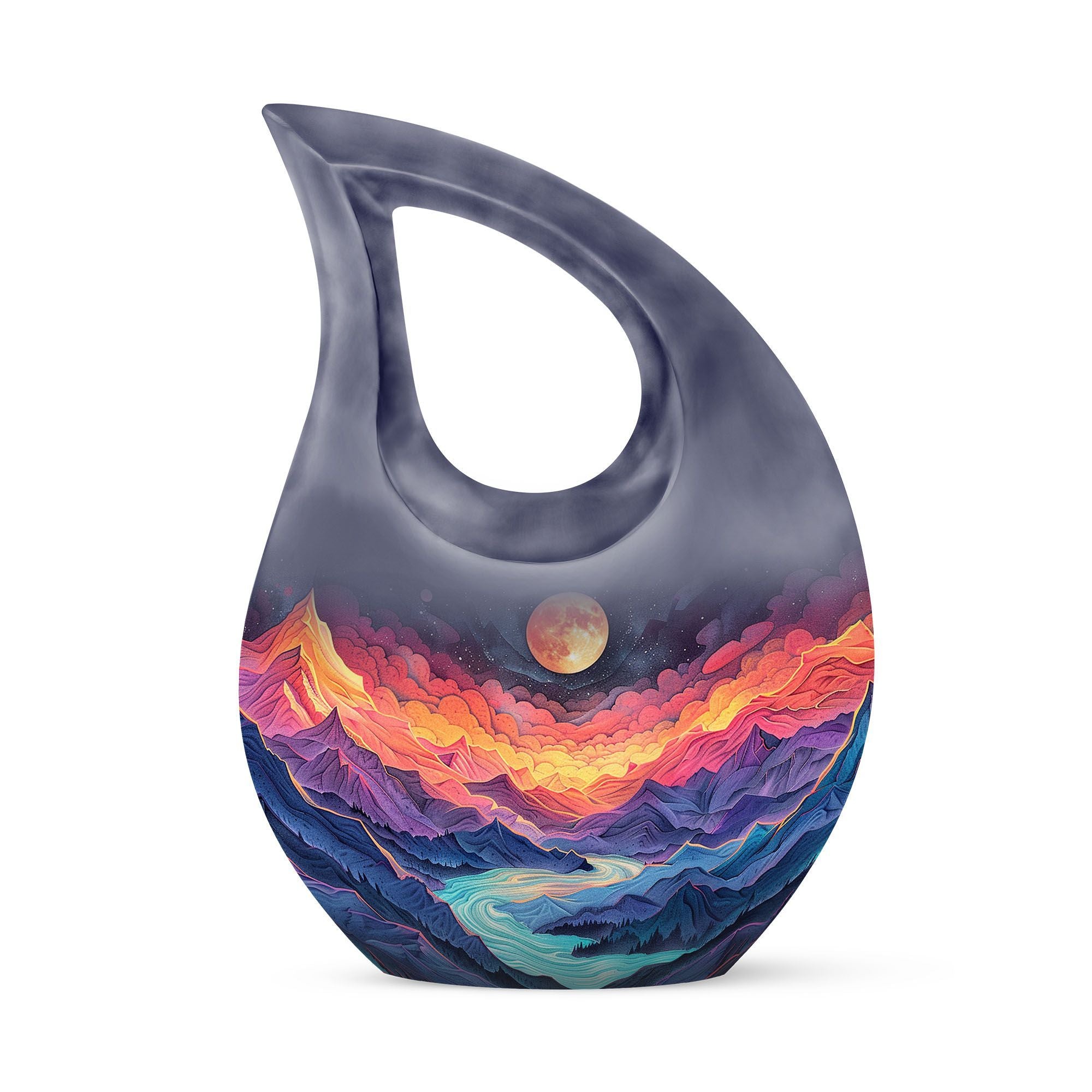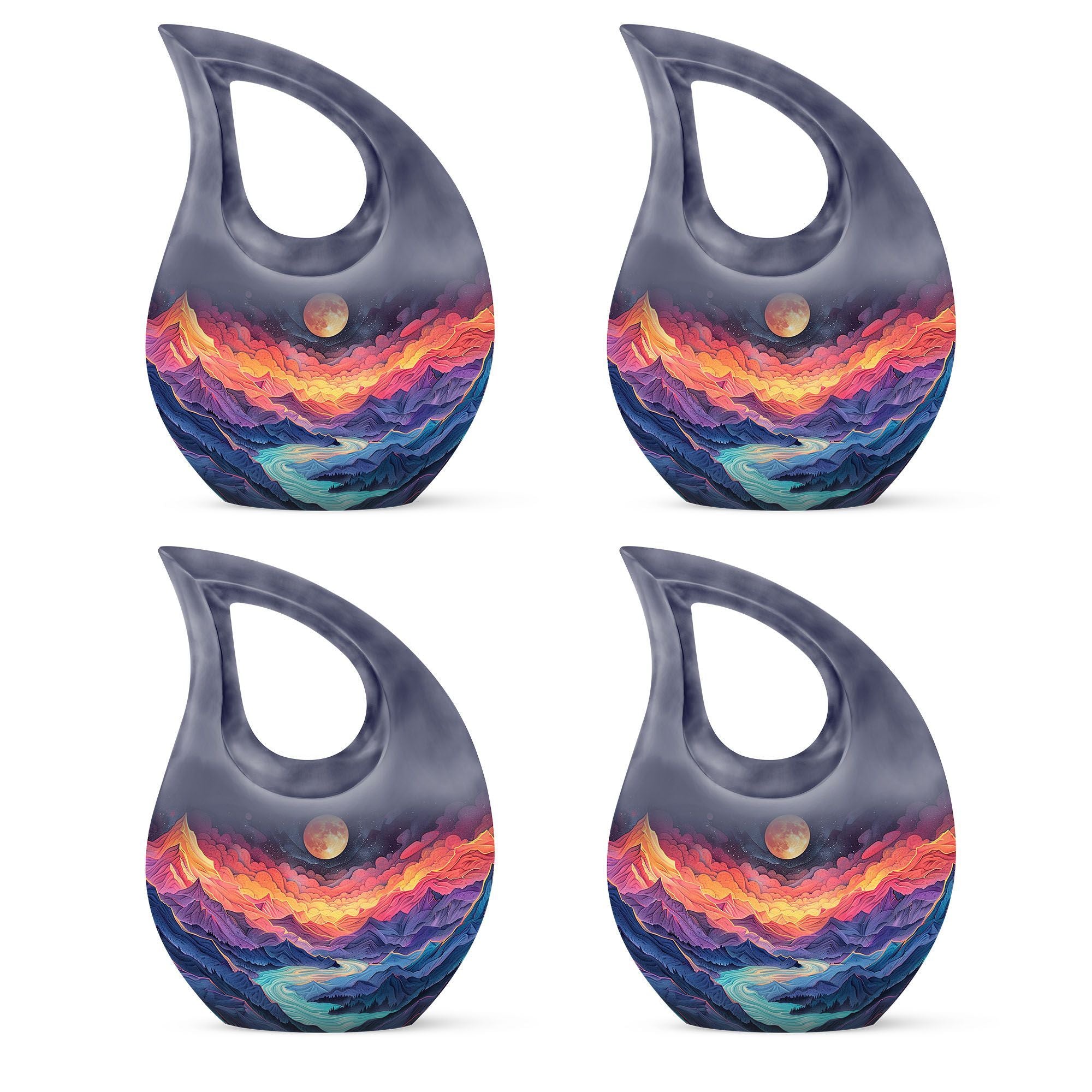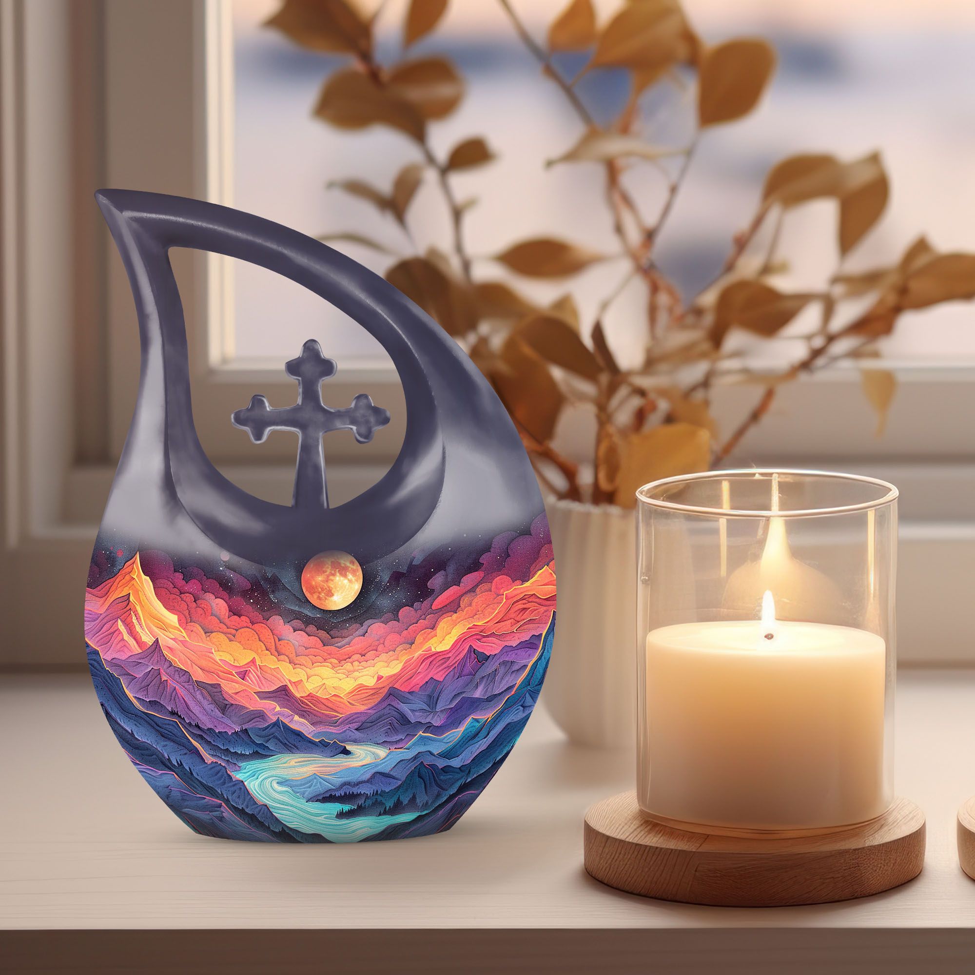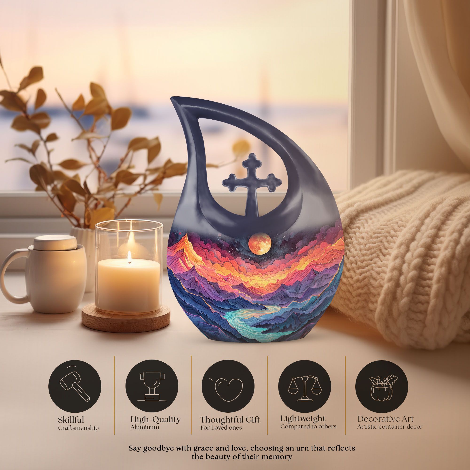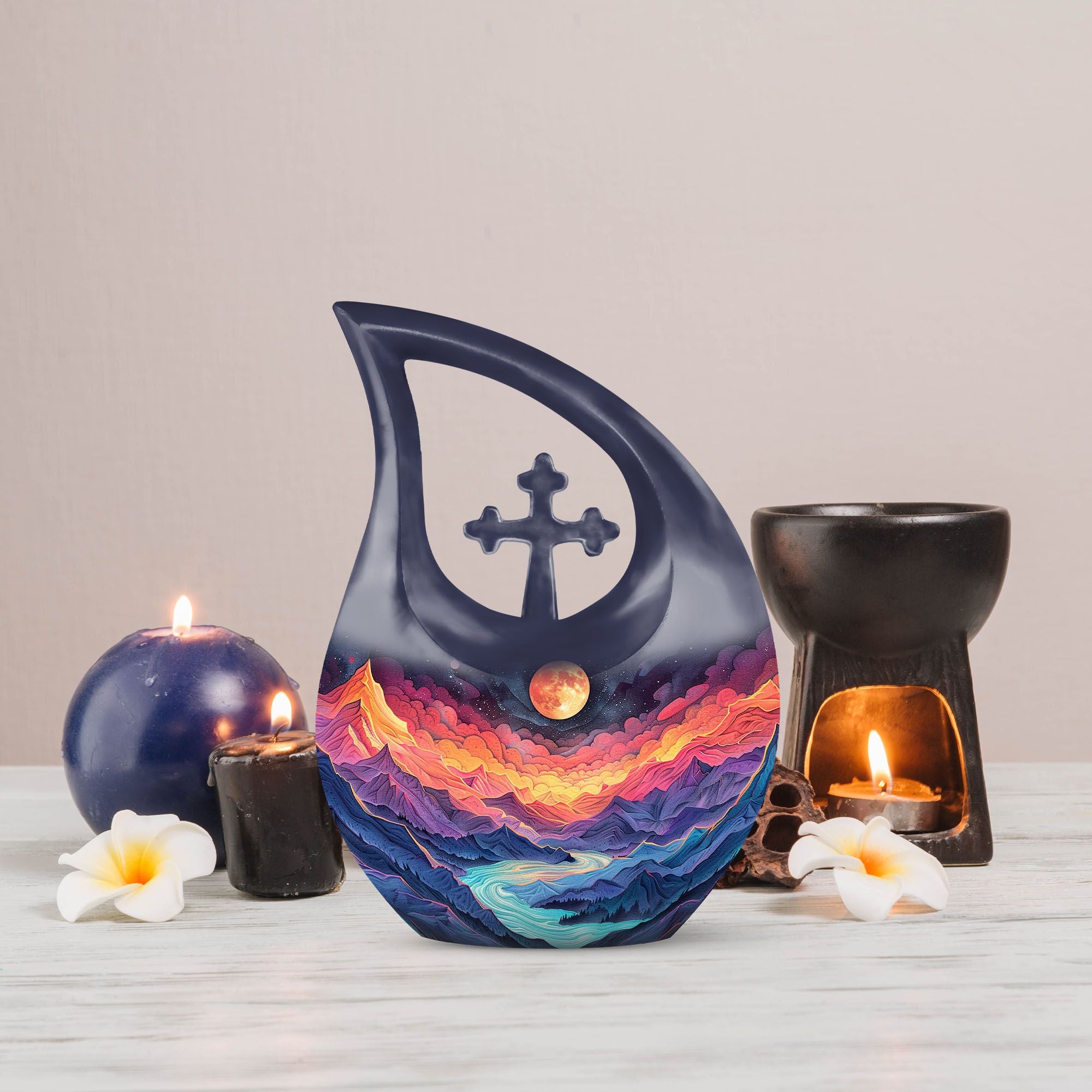 Crafted with precision from durable aluminum, this large and keepsake urn for funeral features a hand-painted mountain scene in soothing tones of blue, white, and gold. Each detail reflects tranquility and remembrance. The 10-inch large urn safely holds the full remains of an adult, while the matching small size keepsake urns allow family members to share a portion of ashes — a perfect option for urns for ashes adult female mom or urns for adult male memorials.