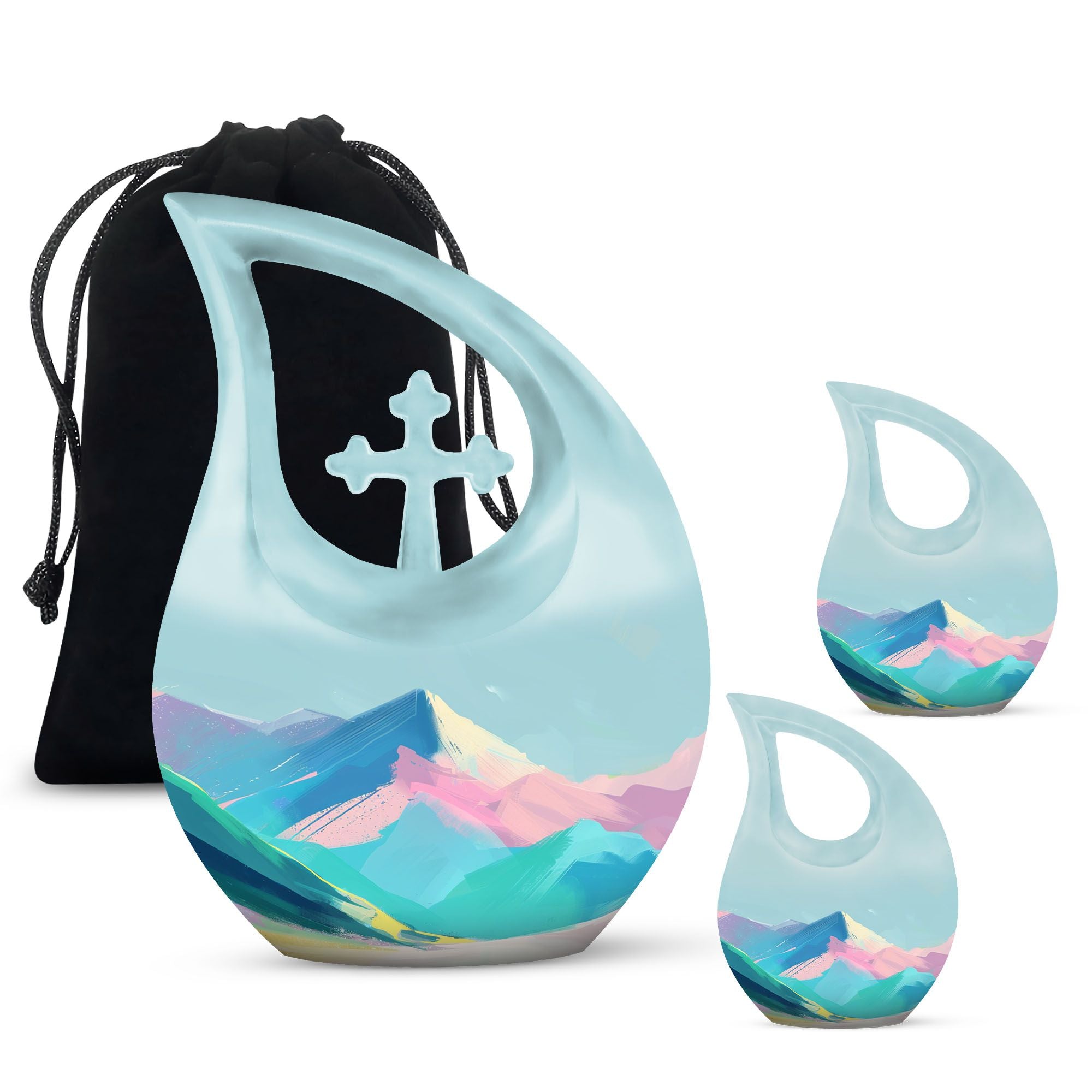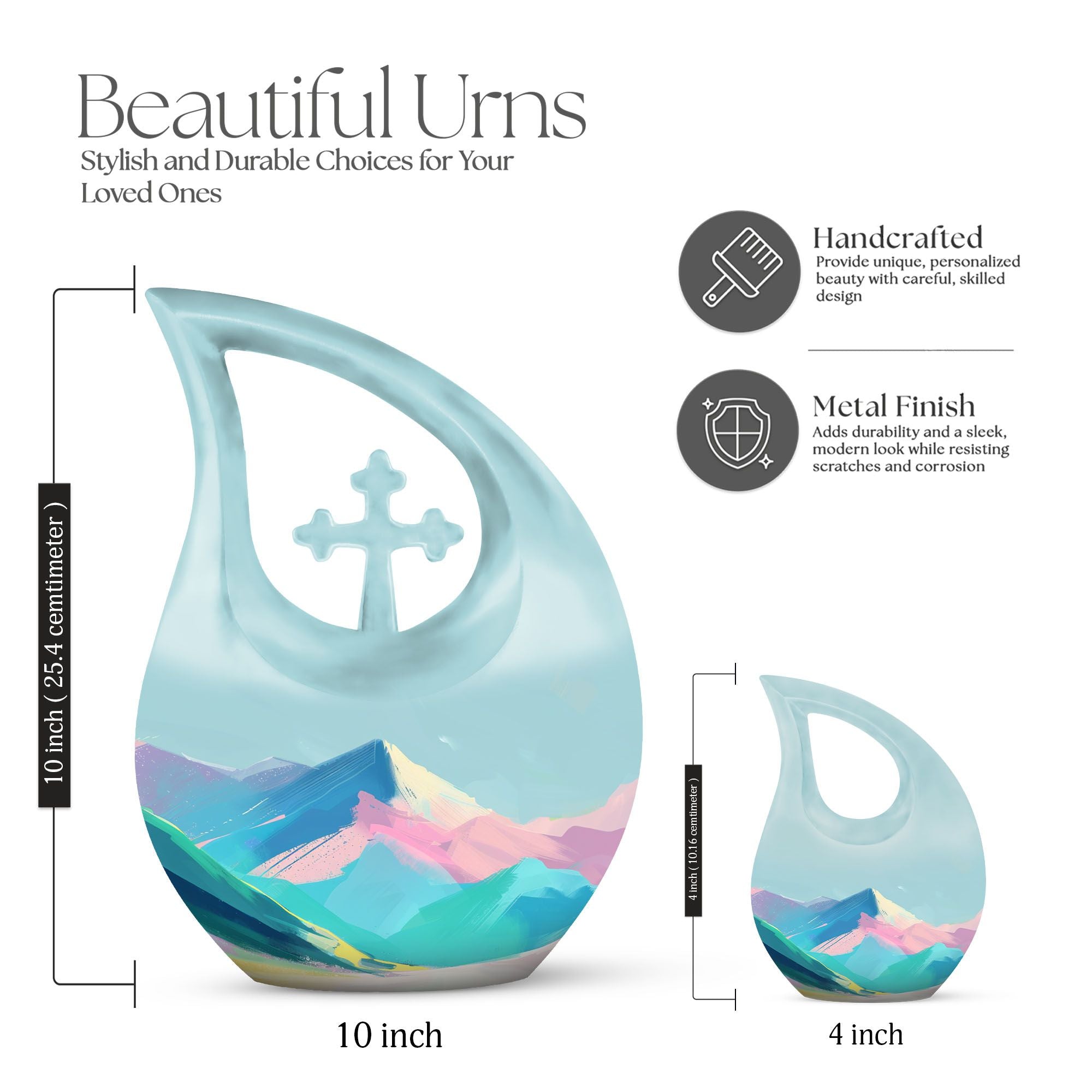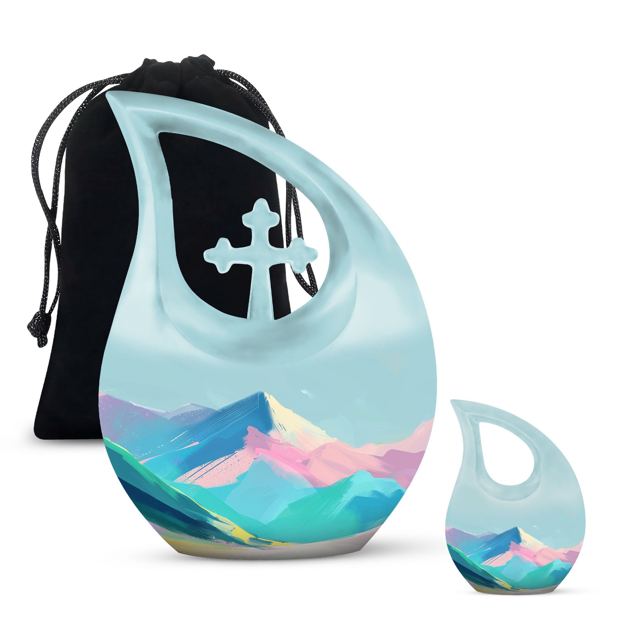 Expertly handcrafted, this nature art urn combo set showcases a stunning mountain landscape with vivid details and a smooth, polished finish. Made from durable aluminum, it ensures longevity and protection for your loved one’s ashes. The secure screw-top lid provides peace of mind, while its elegant design makes it a centerpiece of remembrance for home or burial use. Ideal as a large urn for human ashes, urn mom ashes large, or cremation urn for women.