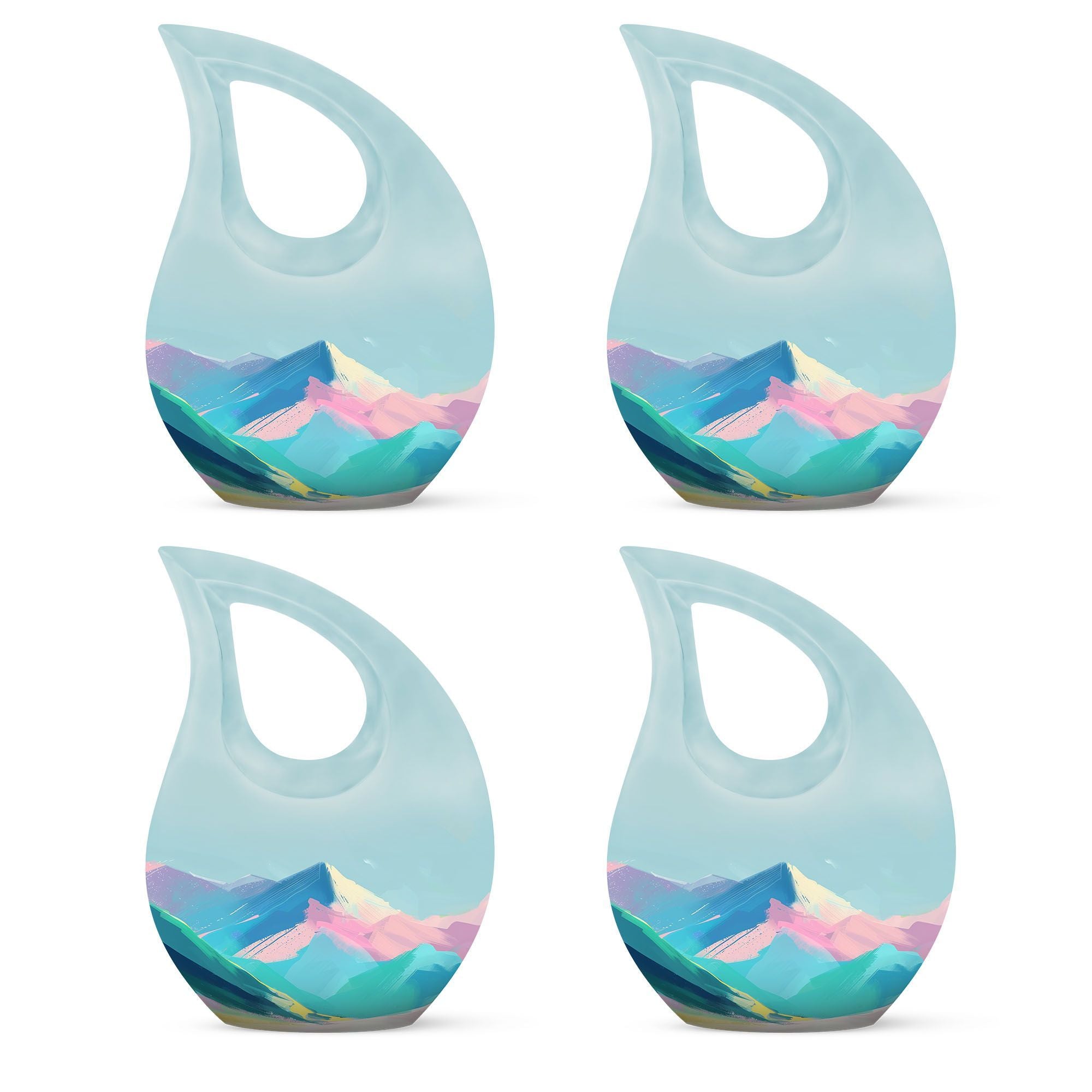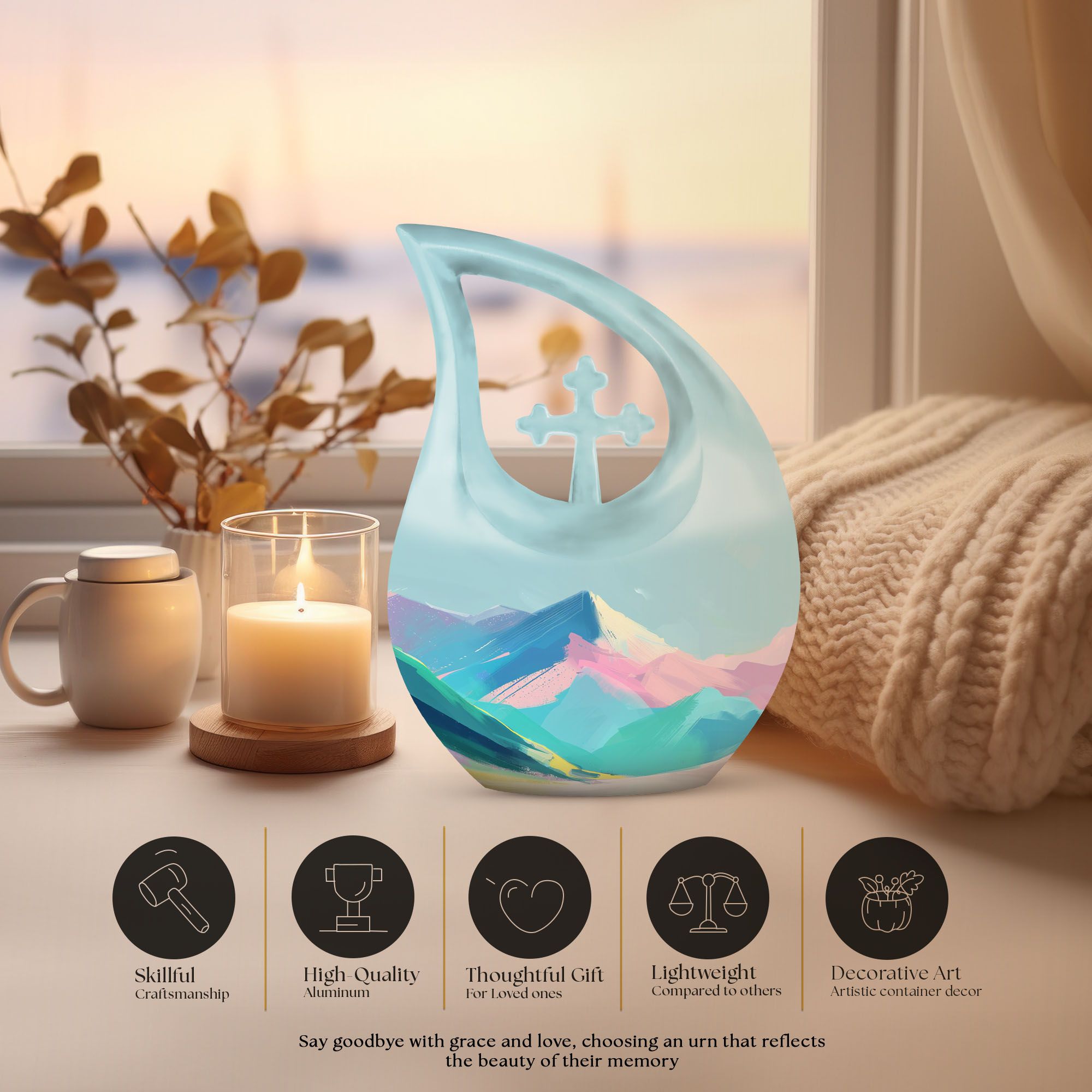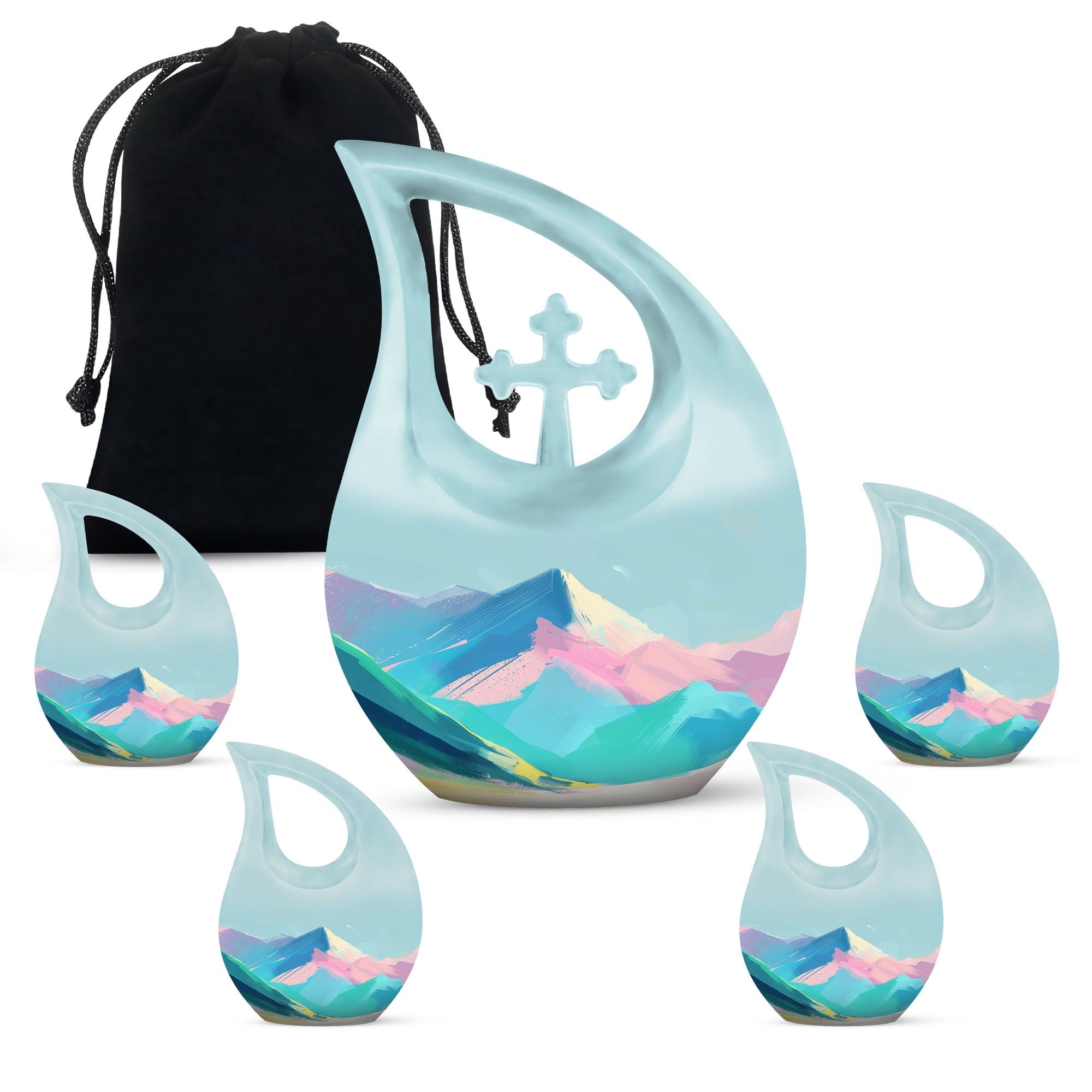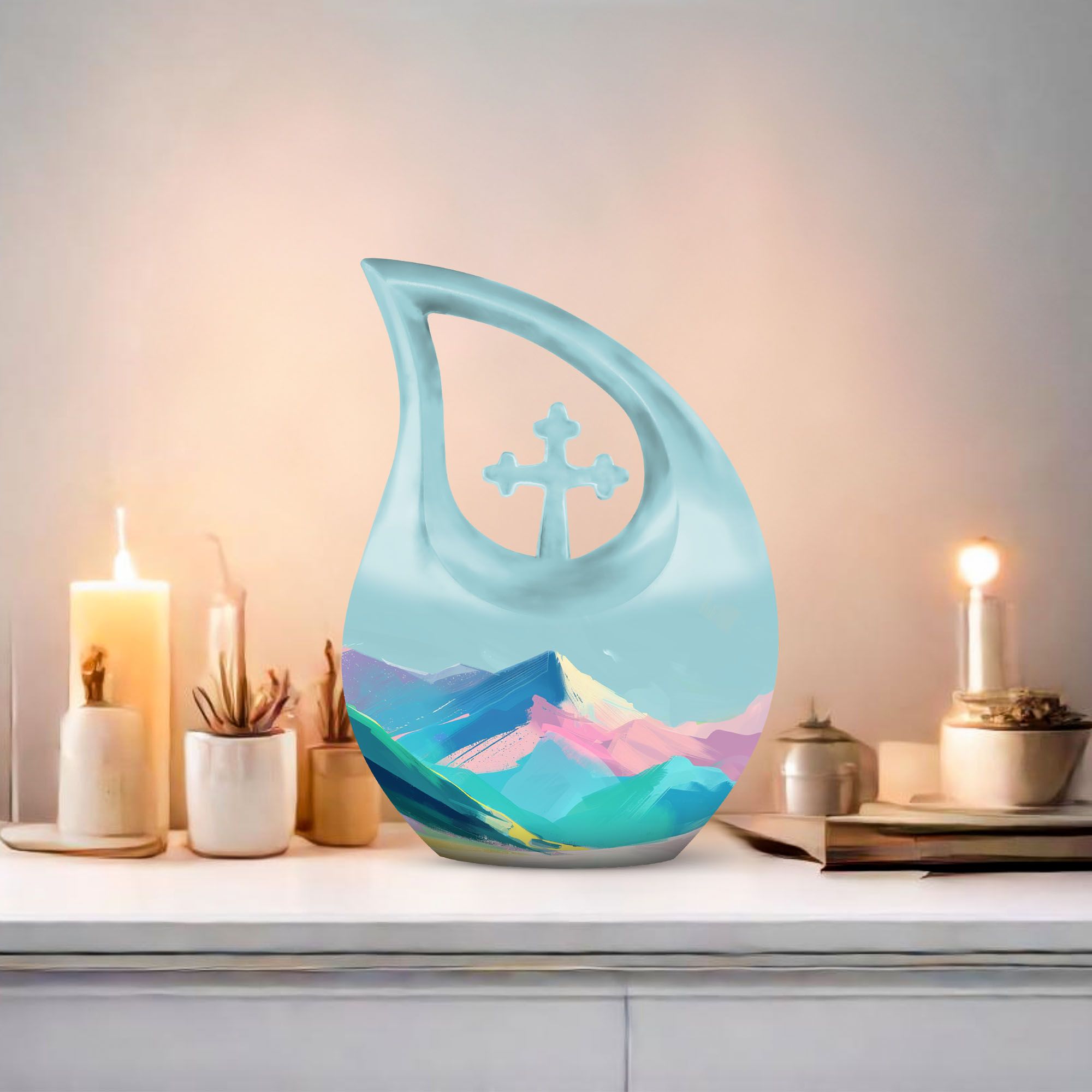 Expertly handcrafted, this nature art urn combo set showcases a stunning mountain landscape with vivid details and a smooth, polished finish. Made from durable aluminum, it ensures longevity and protection for your loved one’s ashes. The secure screw-top lid provides peace of mind, while its elegant design makes it a centerpiece of remembrance for home or burial use. Ideal as a large urn for human ashes, urn mom ashes large, or cremation urn for women.