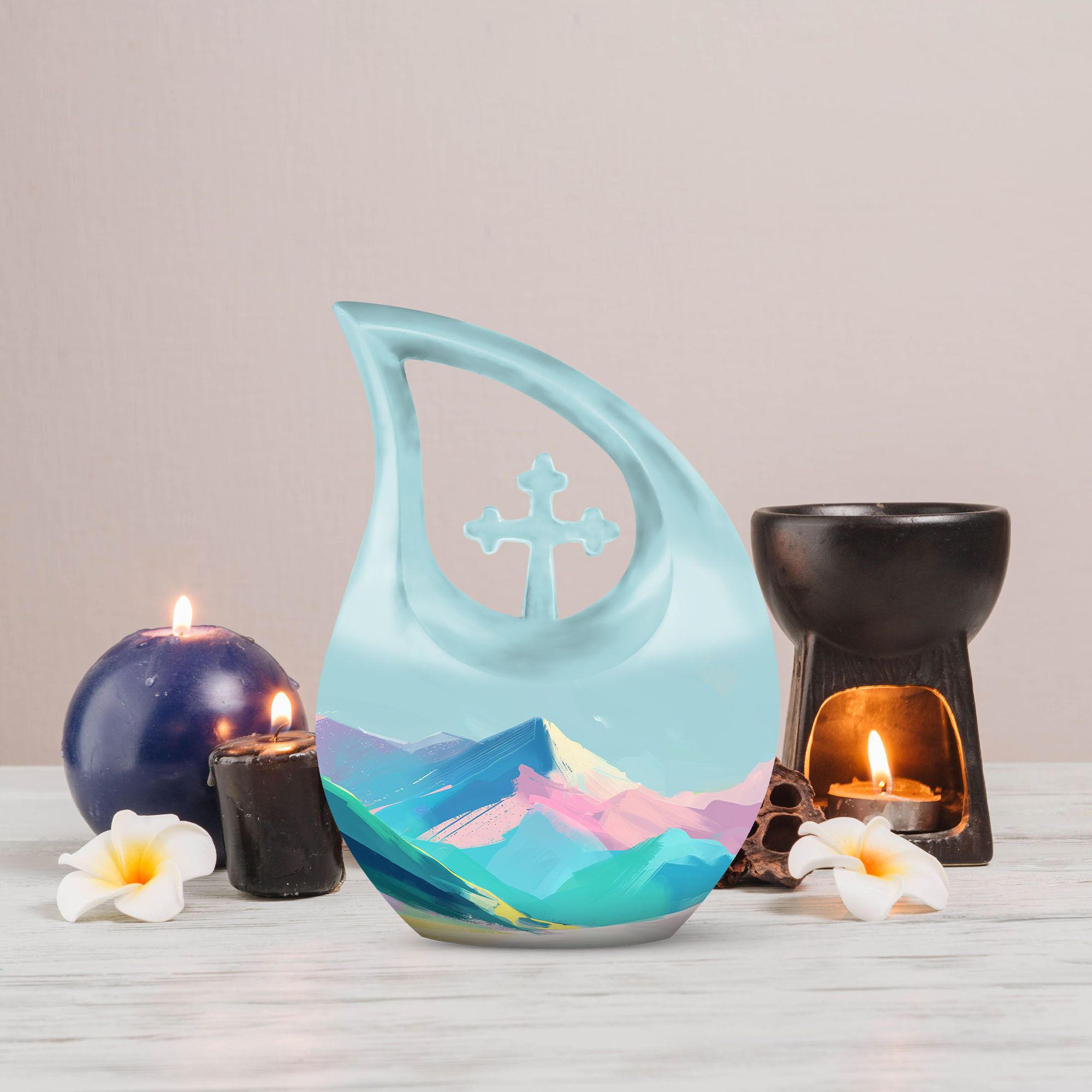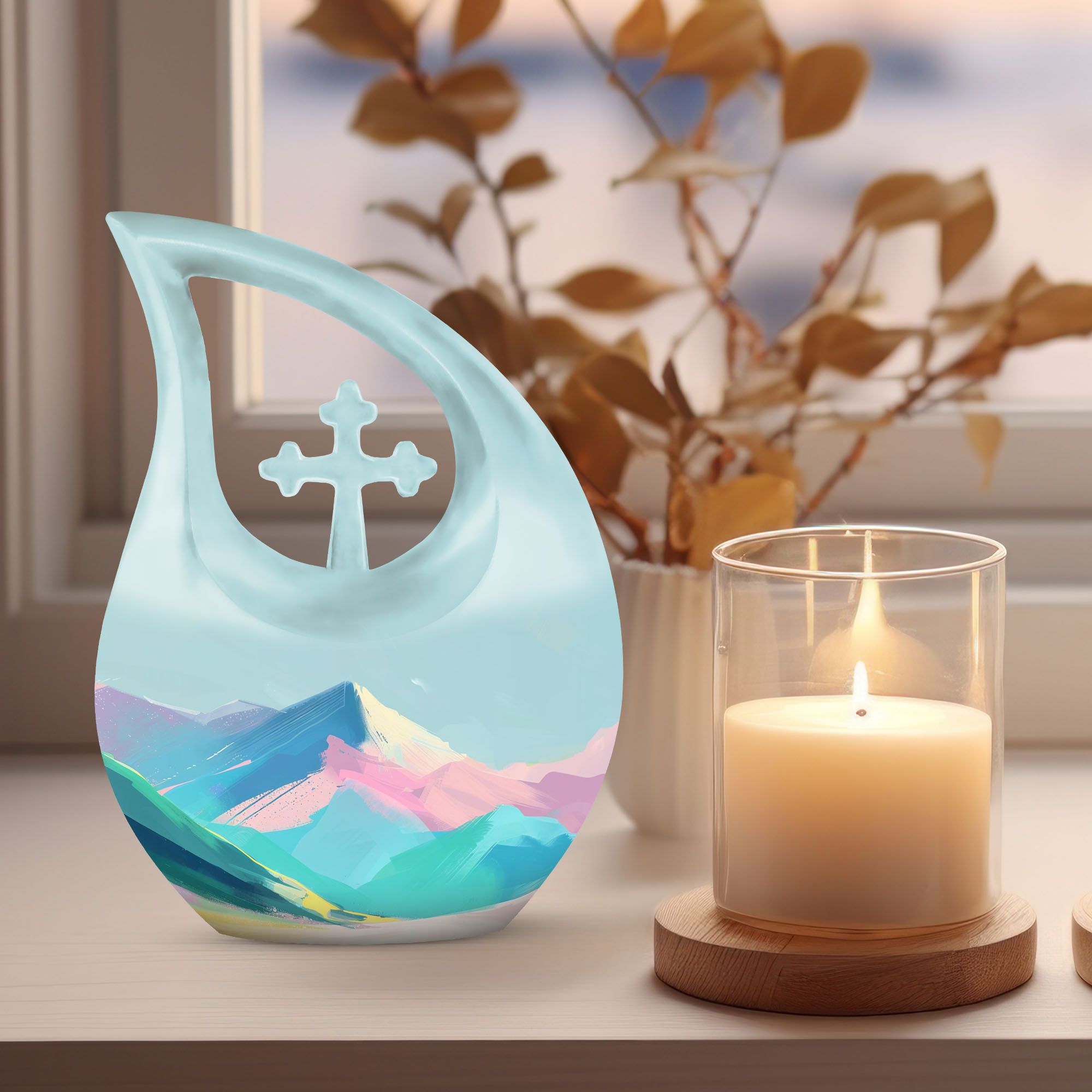 The Mountain Artwork Urn for Cremation Ashes is a heartfelt tribute inspired by the serene beauty of nature. Designed to symbolize strength, peace, and eternal rest, this urn captures the spirit of those who found joy and comfort in the great outdoors. Perfect for both men and women, this large adult urn provides a timeless way to honor life’s journey.