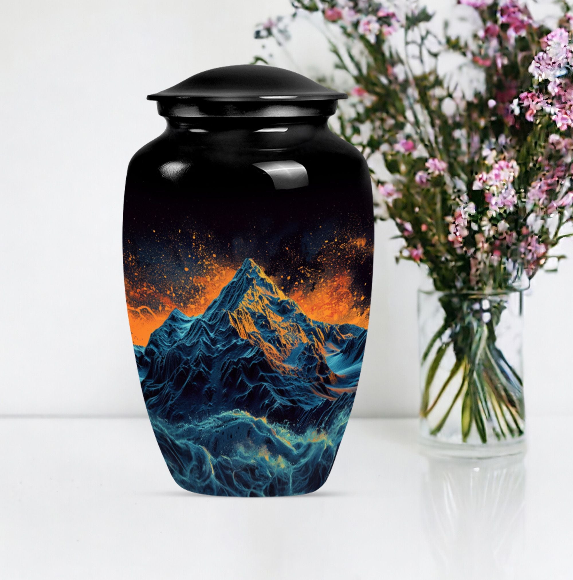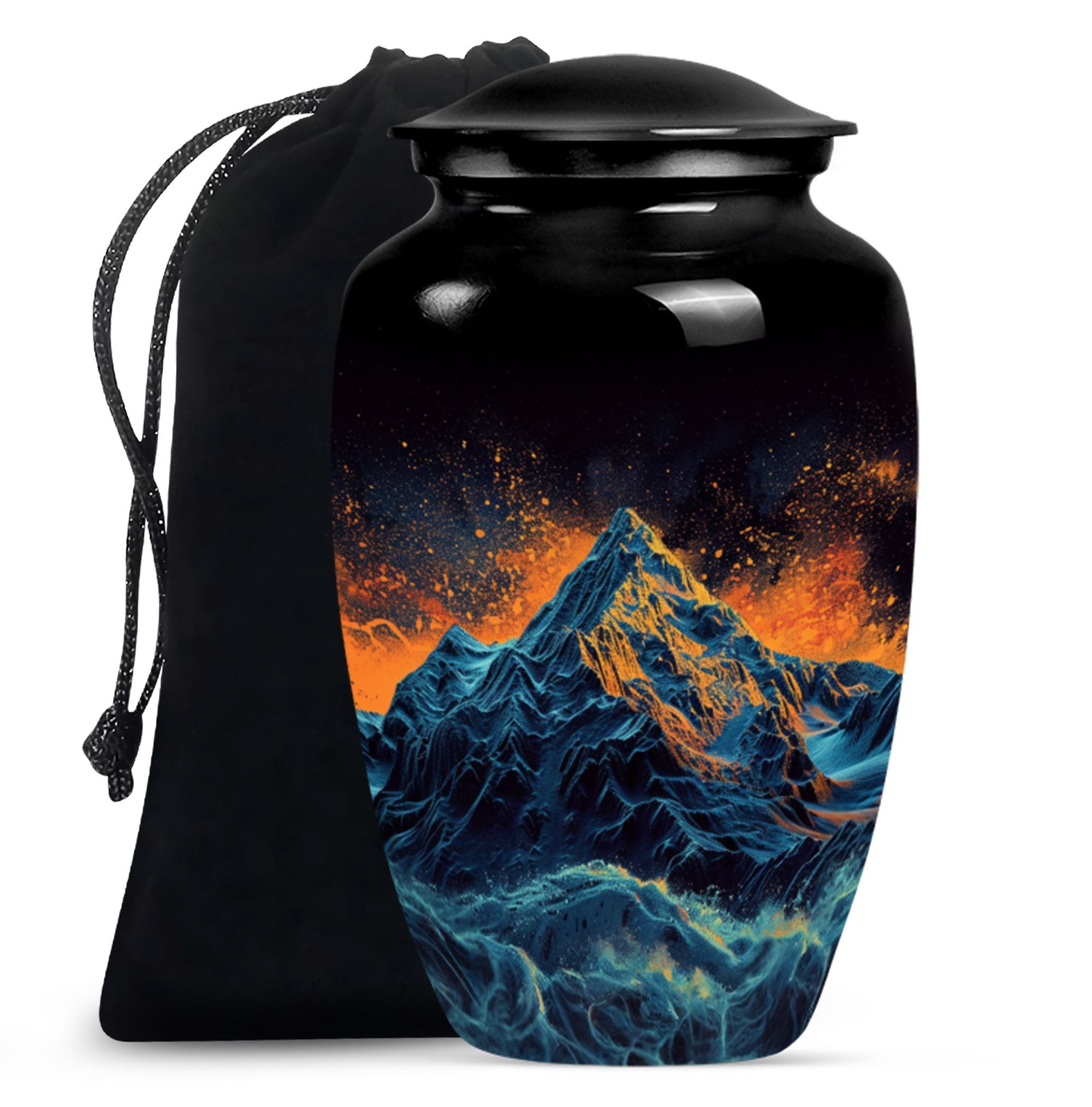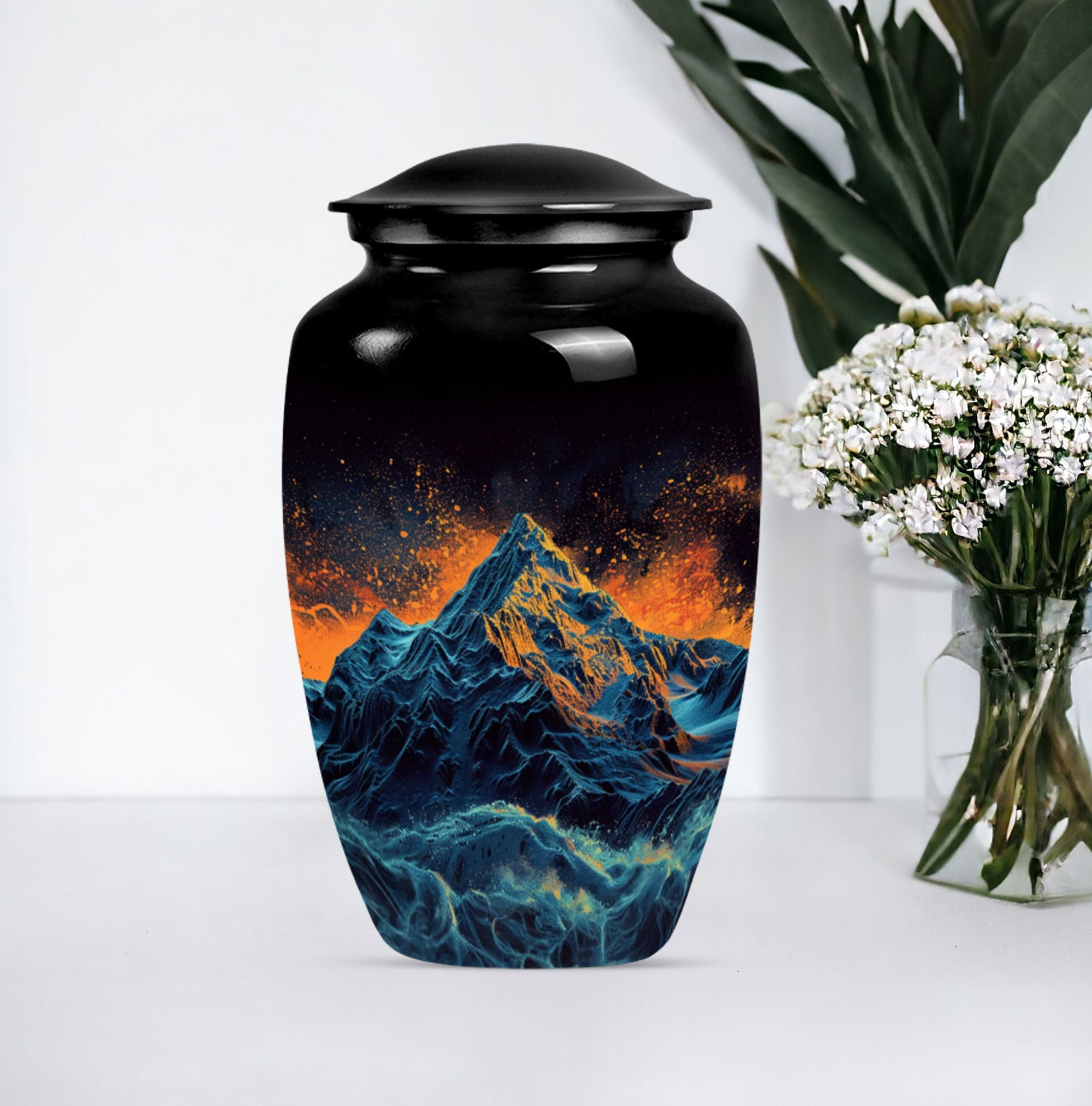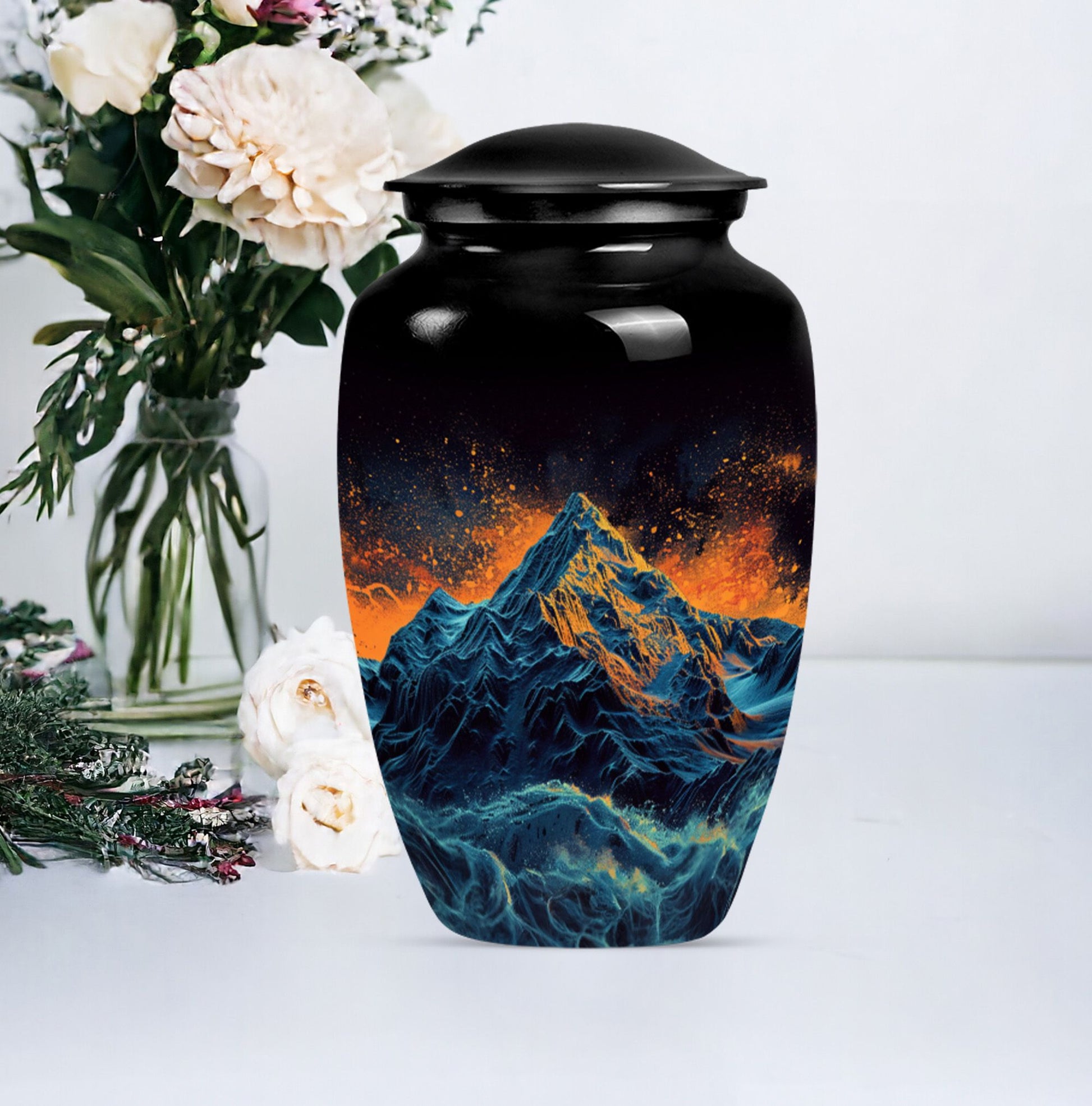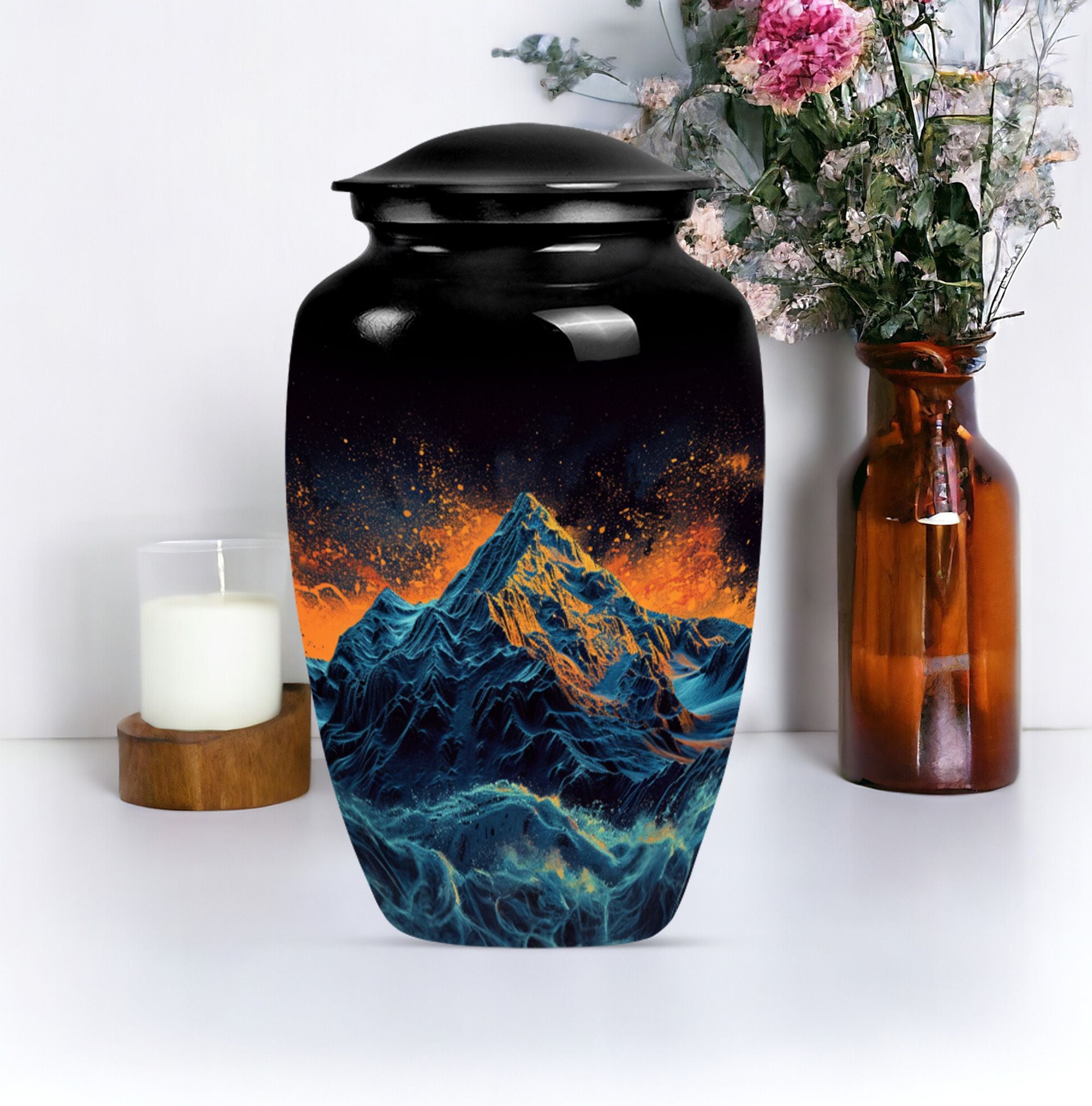 Connect with a sense of peace and honor the memory of your loved one with our uniquely distinctive mountains Urn. A beautiful homage to their life, this memorial adult urn features an abstract theme harmonizing eternal serenity with profound respect. Crafted using resilient Aluminium, this large urn is characterized by a commanding height of 10 inches and can adeptly accommodate up to 200 cubic inches of remains, making it suitable for adults and seniors. Weighing a stable 3.3 pounds, the urn is robust, yet sleek. An added delight is our special customization option that allows you to personalize the urn with engraved names to keep the memory of your dear ones alive. The package also includes a soft velvet pouch, adding an extra touch of warmth when preserving the ashes. Seeking an eternal resting place for your beloved or a cremation urn that genuinely symbolizes your feelings? Look no further. Take note, this is not just a burial accessory; it is a token of love and respect to honor the departed. Opt for our funeral burial urns, the perfect emblem of affection and remembrance.