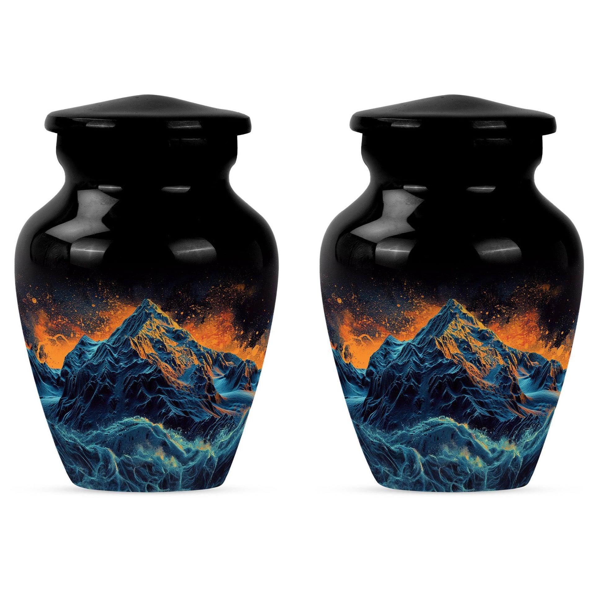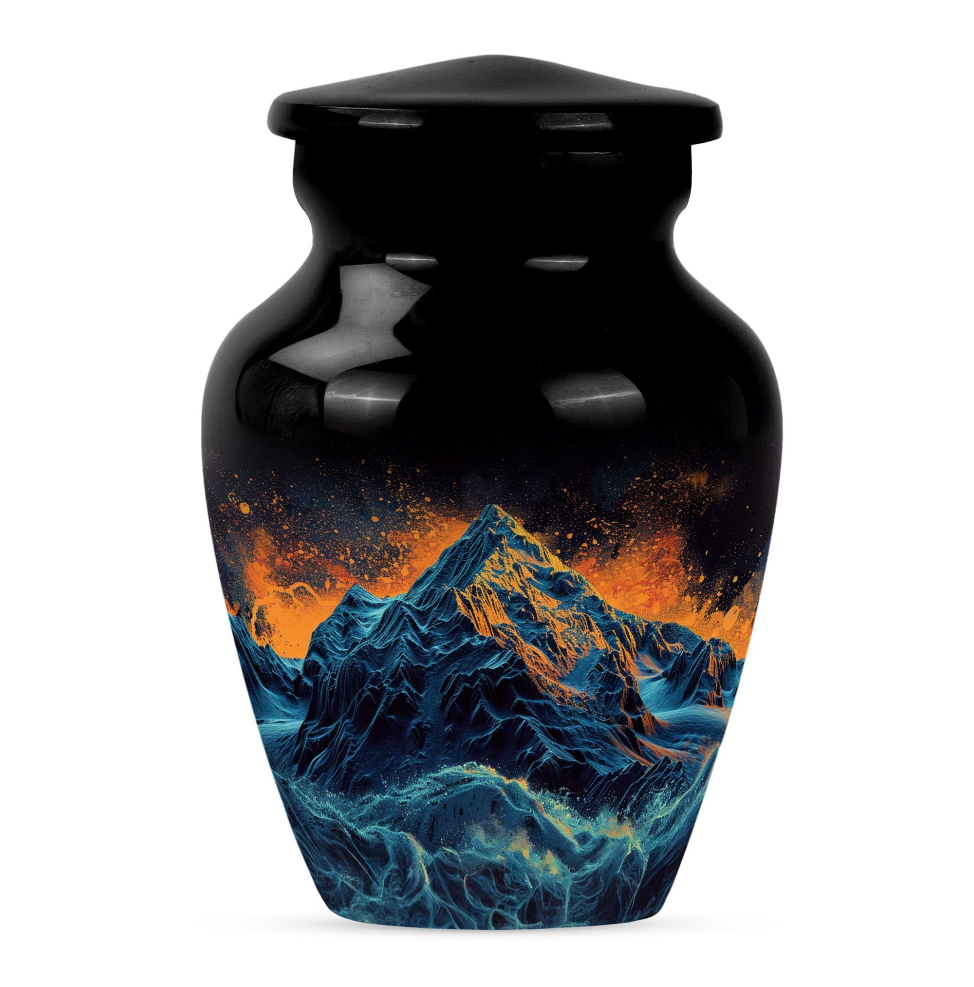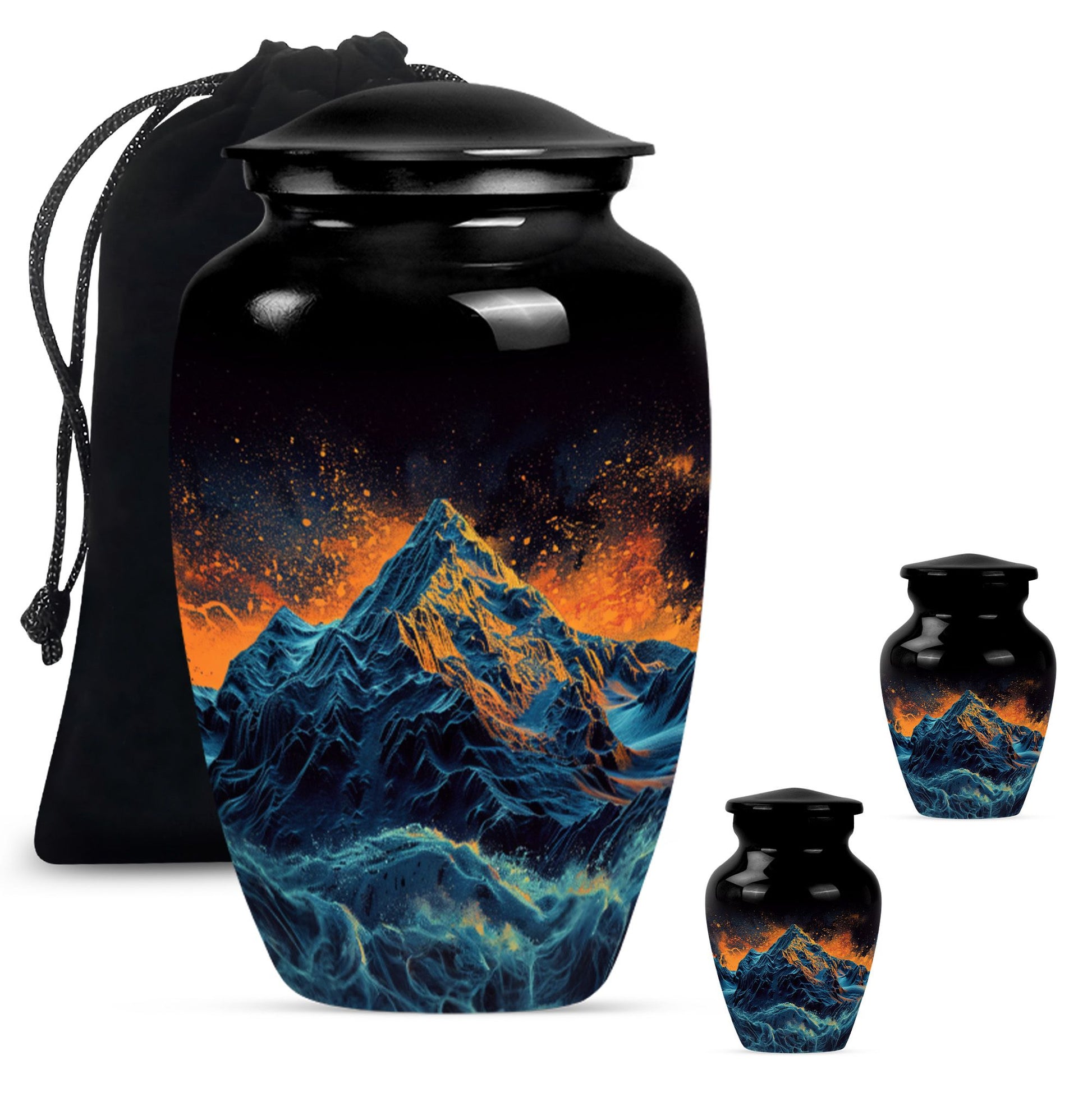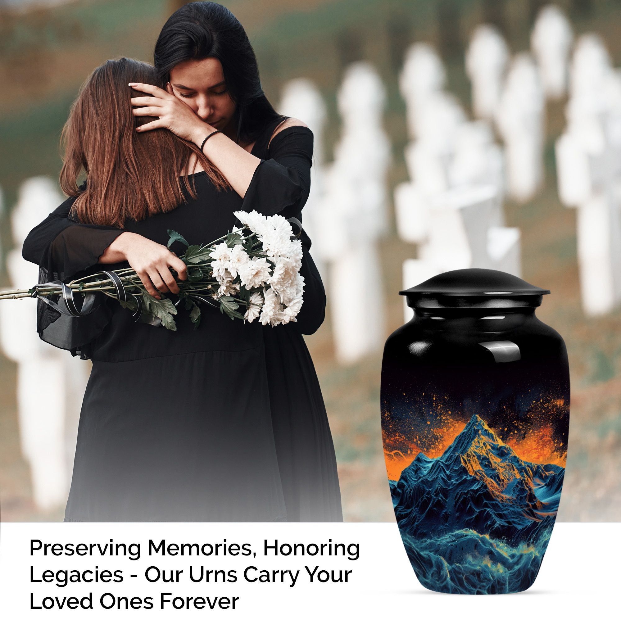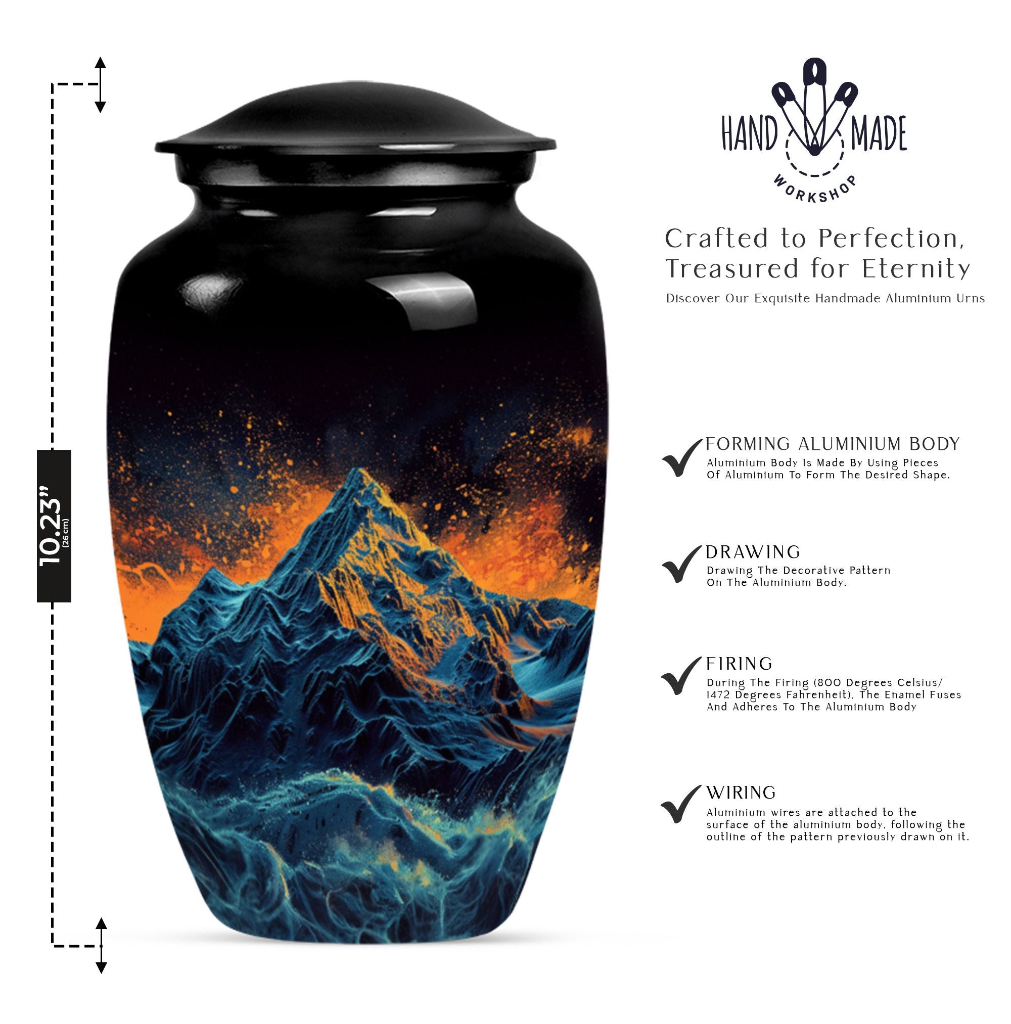 Connect with a sense of peace and honor the memory of your loved one with our uniquely distinctive mountains Urn. A beautiful homage to their life, this memorial adult urn features an abstract theme harmonizing eternal serenity with profound respect. Crafted using resilient Aluminium, this large urn is characterized by a commanding height of 10 inches and can adeptly accommodate up to 200 cubic inches of remains, making it suitable for adults and seniors. Weighing a stable 3.3 pounds, the urn is robust, yet sleek. An added delight is our special customization option that allows you to personalize the urn with engraved names to keep the memory of your dear ones alive. The package also includes a soft velvet pouch, adding an extra touch of warmth when preserving the ashes. Seeking an eternal resting place for your beloved or a cremation urn that genuinely symbolizes your feelings? Look no further. Take note, this is not just a burial accessory; it is a token of love and respect to honor the departed. Opt for our funeral burial urns, the perfect emblem of affection and remembrance.