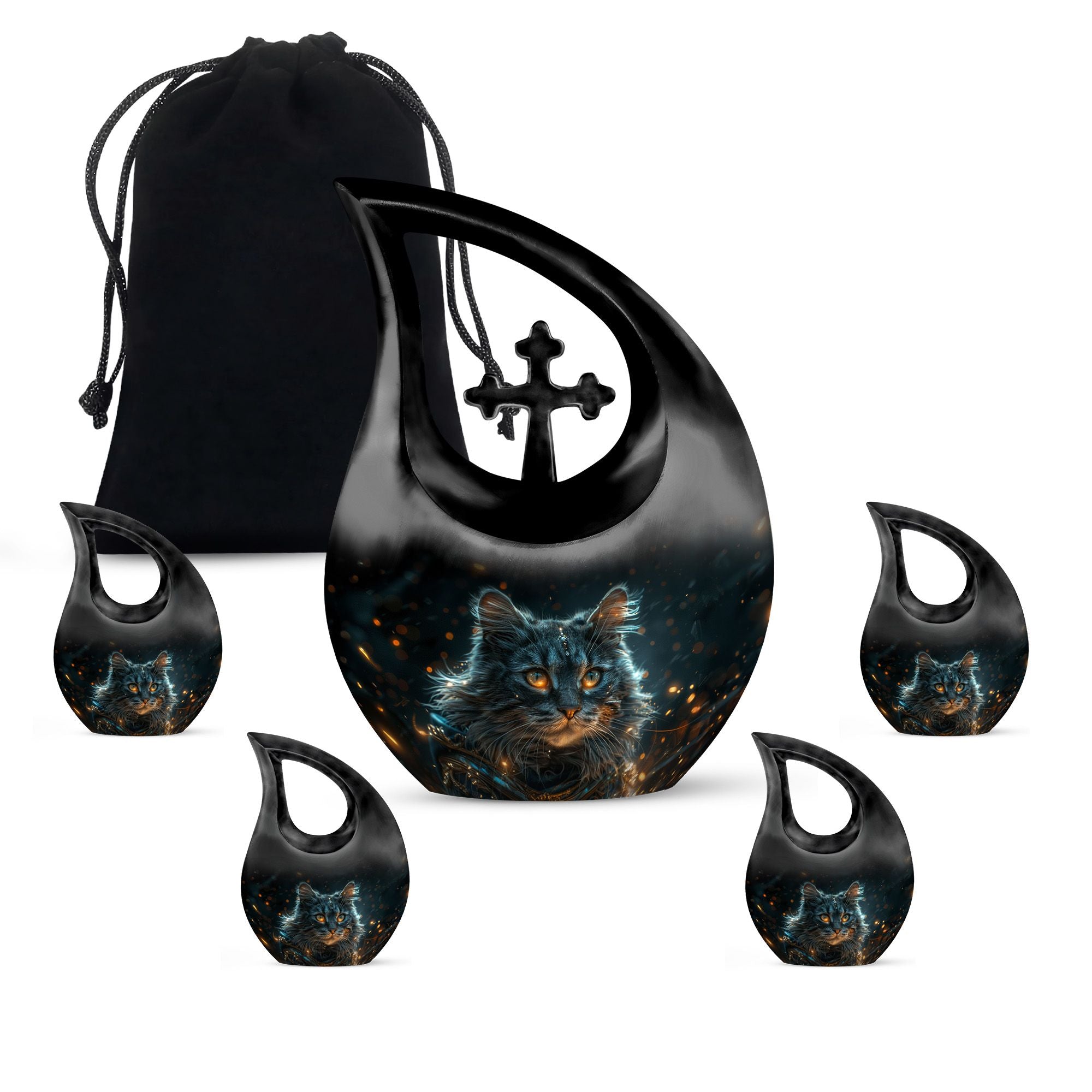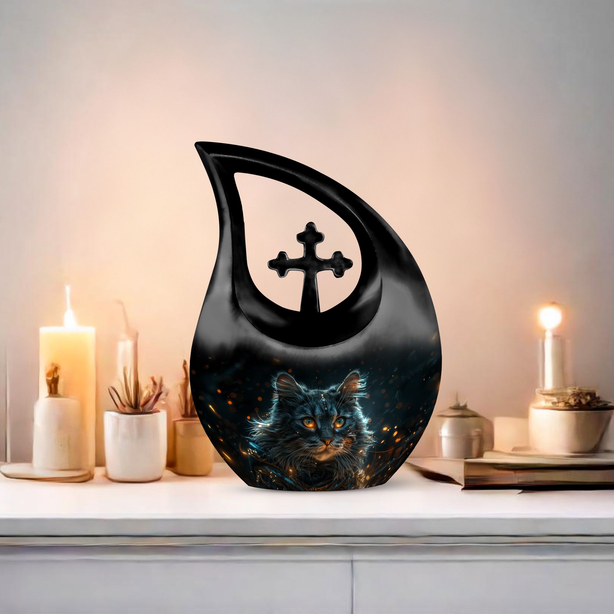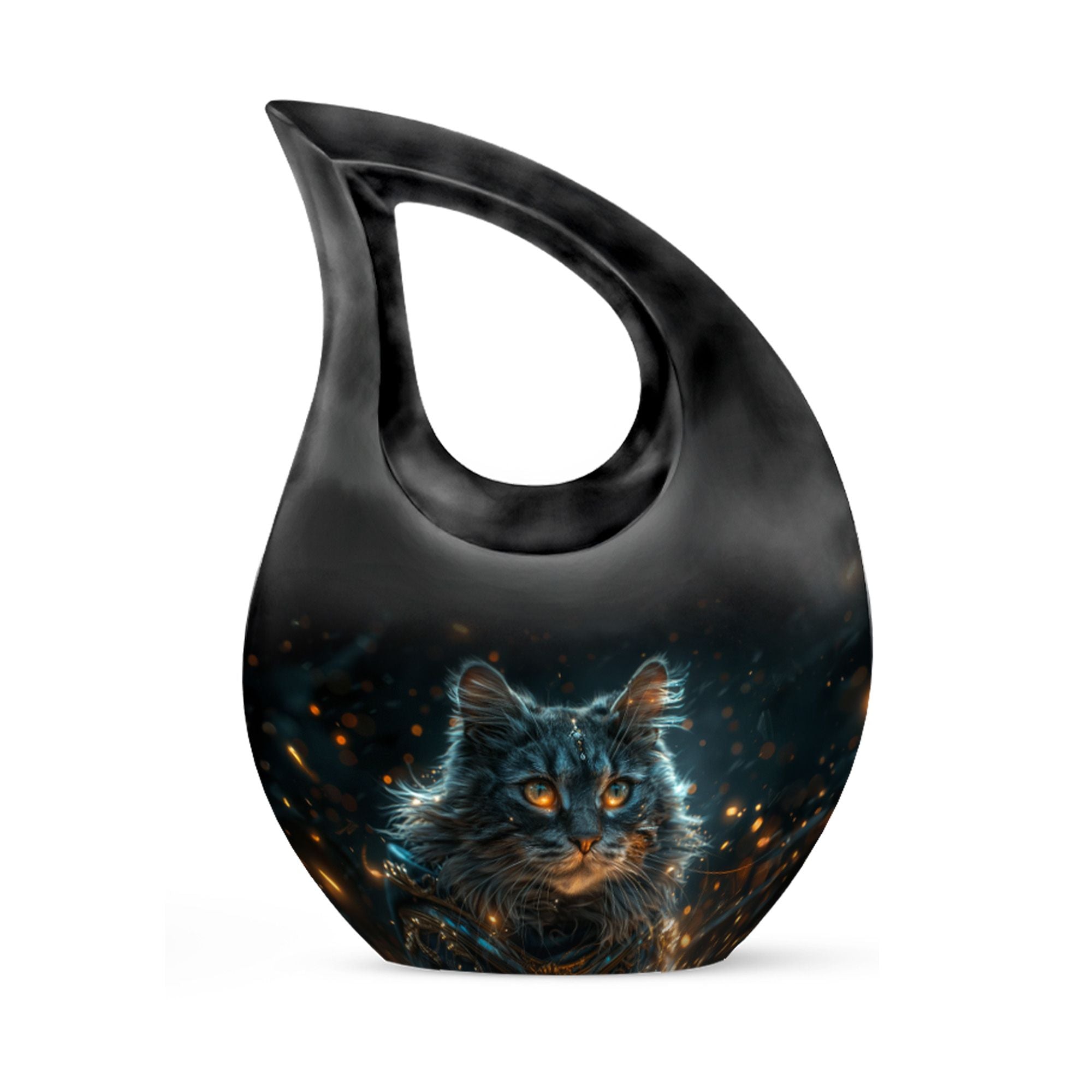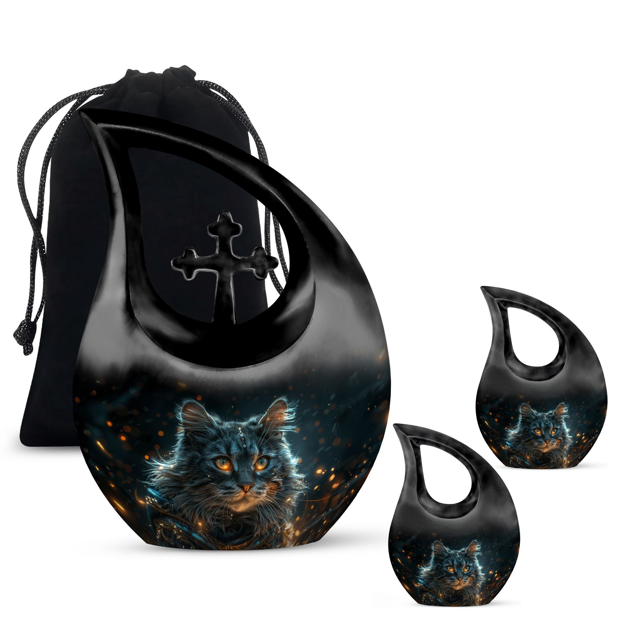 Convey love to your dearly departed with our Mystic Gaze Urn, a masterpiece from our small urns for ashes range. At 10 inches in height and a capacity of 200 cubic inches, this urn is made of prime-quality aluminium, promising prolonged durability. Its weight is a substantial 3.3 pounds, adding to the product's robust structure. The urn showcases a sleek 'Cross Drop' design, reflecting a deep connection with the spiritual realm. Your purchase package will include a velvet pouch for a homely containment of the remnants. The urn offers a unique customization option, allowing you to personalize it with engraved names. Catering to various needs, it is apt for various scenarios like Burial Urns For Human Ashes, Ashes Holders For Cremation, or as a modern urn. Let the Mystic Gaze Urn become an enduring tribute to your loved one's beautiful life journey.