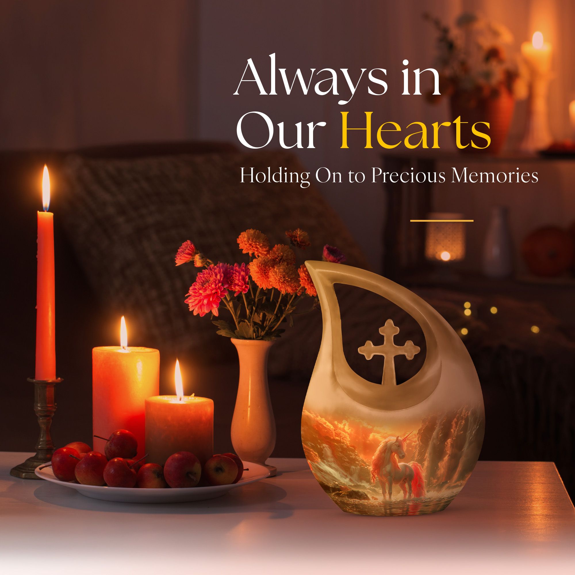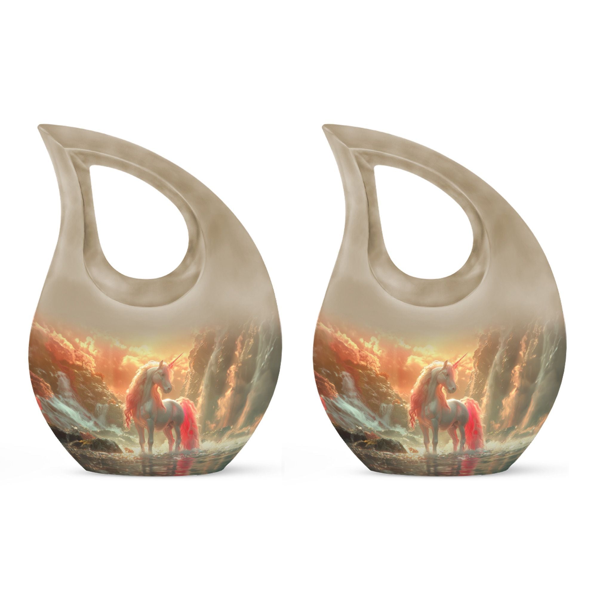 Cherish the memory of your beloved with our 'Mystical Dawn Unicorn Urn'. This masterpiece portrays the union of spirituality and purity through its 'Cross Drop' design. Ideal for adults or seniors, our large urn stands 10 inches tall with a substantial capacity of 200 cubic inches. It's crafted from durable aluminium, ensuring longevity and resistance to wear over time. Our urn weighs around 3.3 pounds and can house the remains securely. Each urn comes with a velvet pouch to hold the ashes. One of the unique features of our urn is its personalization option – utilize the engraving services to inscribe the name of the departed, crafting a touching tribute that lasts for ages. Whether you're searching for 'Remembrance Urns For Ashes', 'Cremation Urn Liners' or 'Urns that don't look like Urns', our 'Mystical Dawn Unicorn Urn' is designed to cater to your needs. Honour your loved ones in the most unforgettable way with our handcrafted urn.