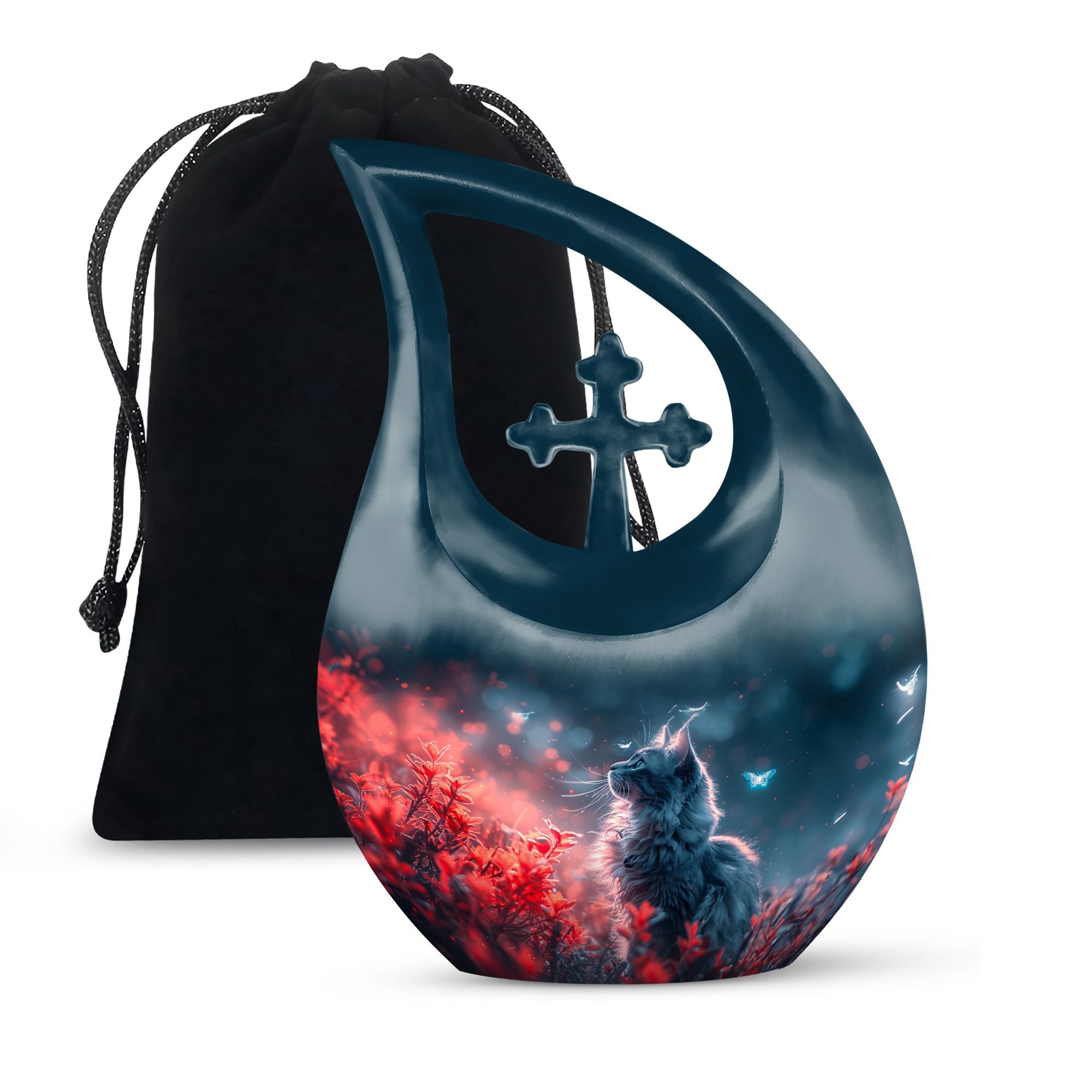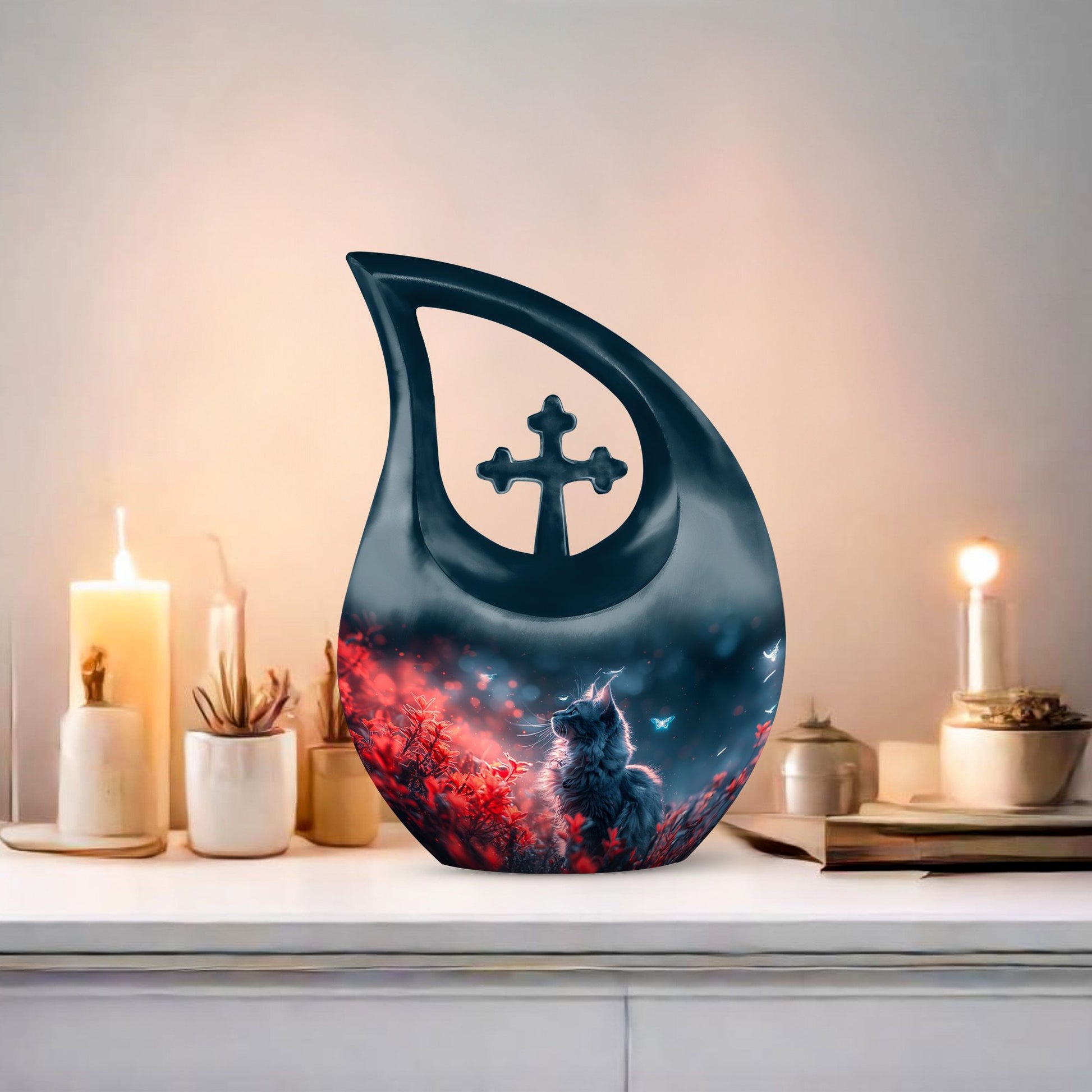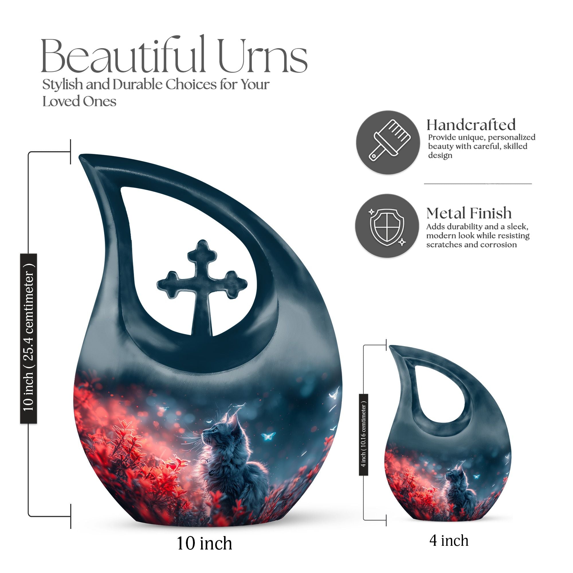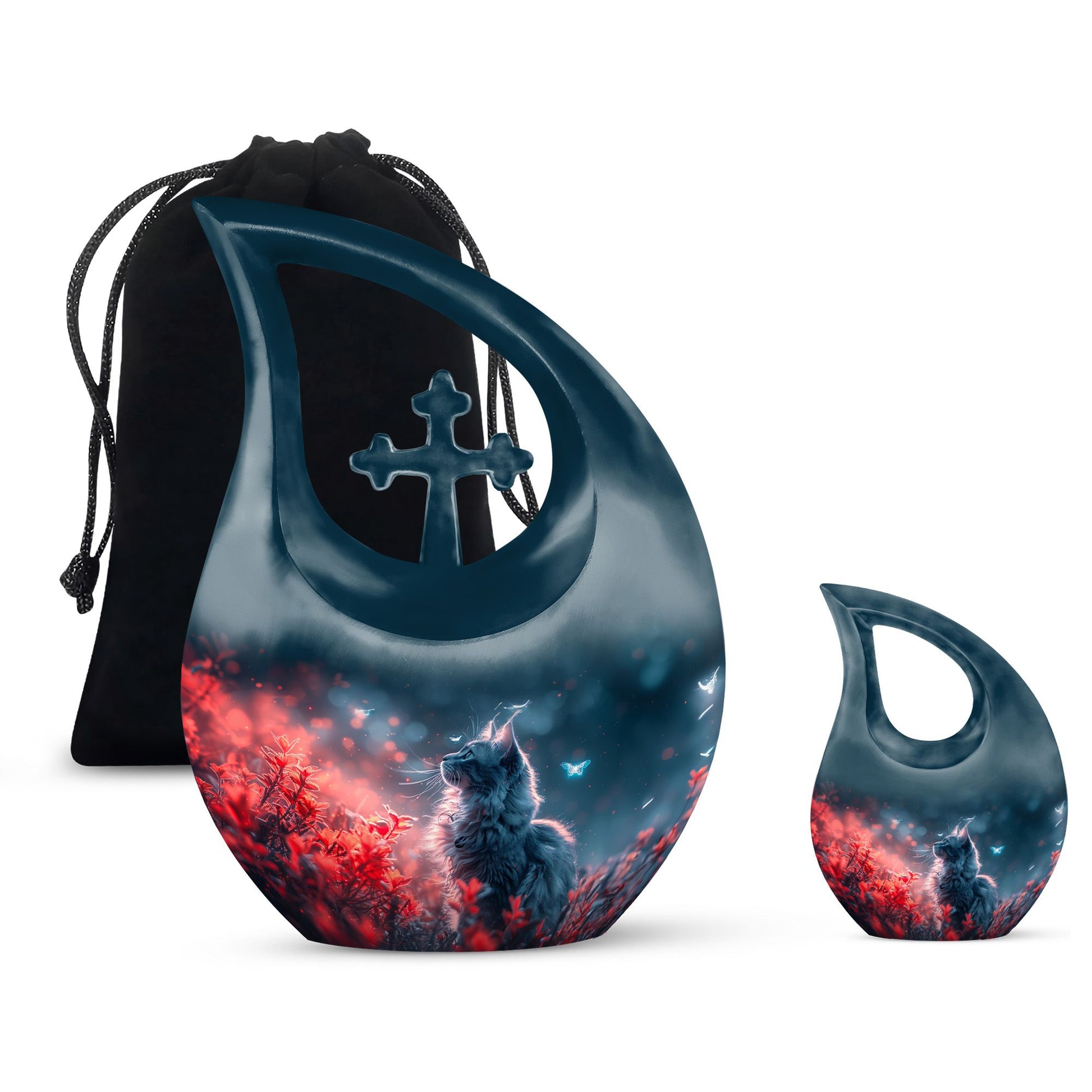 Imbued with enduring sentiment, the 'Mystical Whiskers Urn' presents a compassionate choice for the safe containment of the cherished ashes of a loved one. Enhanced by the exquisitely crafted 'Cross Drop' pattern, the urn appreciates the transient beauty of life. Standing at an impressive size of 10 inches in height, this large monument is a worthy tribute, offering a capacity of lofty 200 cubic inches. It bears a refined weight of 3.3 pounds, constructed from the sturdy build of Aluminium, upholding its promise of long-lasting companionship. The 'Together Again Companion Urn' invokes the power of unity and togetherness in commemoration. Personalizing this urn by engraving names stands as a mark of your intimate connection to the departed soul. Providing a soft velvet pouch for the ashes, the subtle care encapsulated makes this urn a standout among other memorial urns. Add a remarkable touch to your remembrance with this blend of elegance and devotion. Ideal for those seeking urns for men's ashes, bio urn for humans, tall urns, and the best urns.