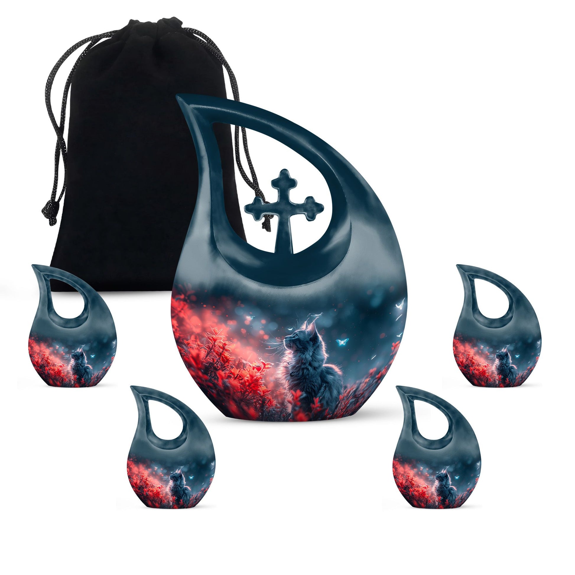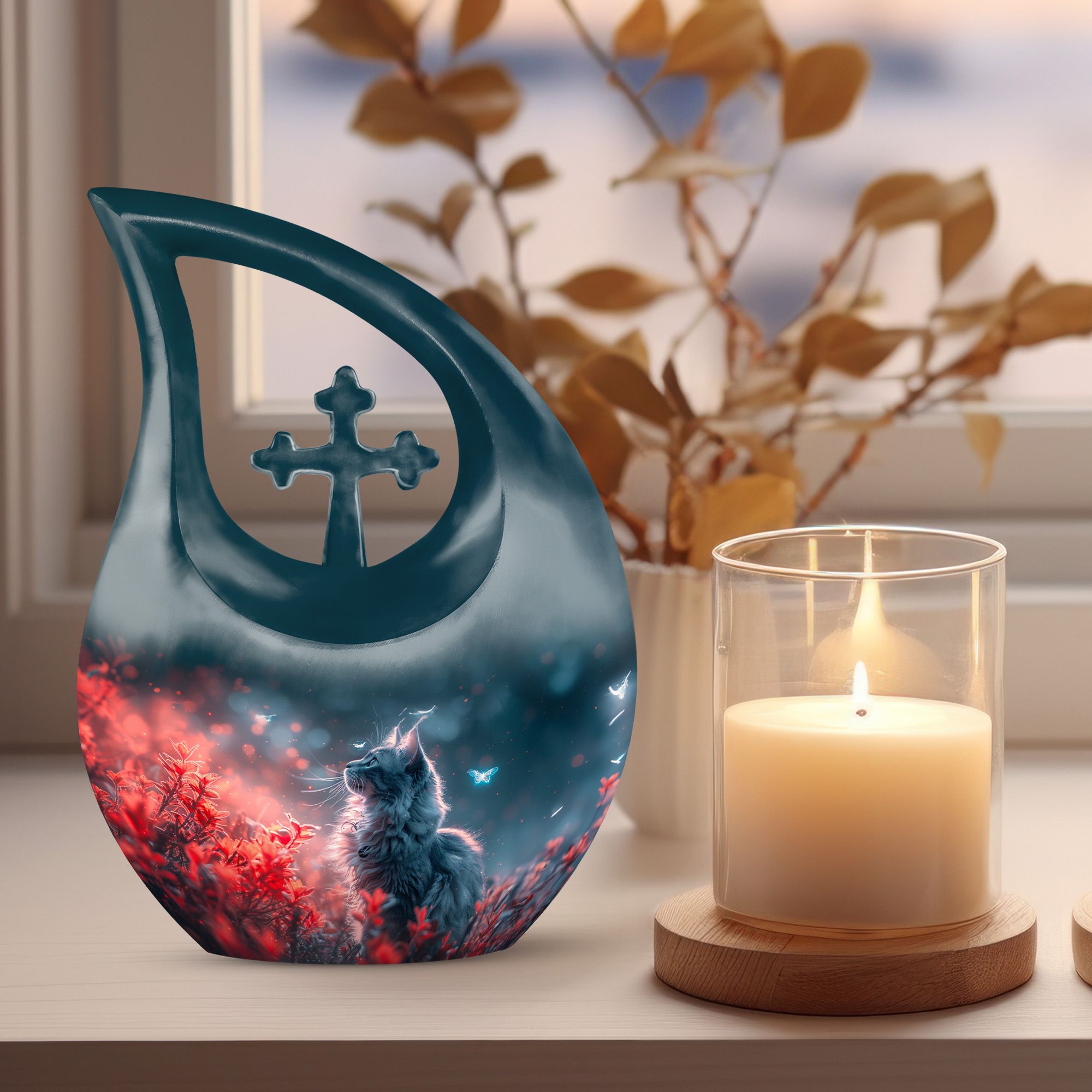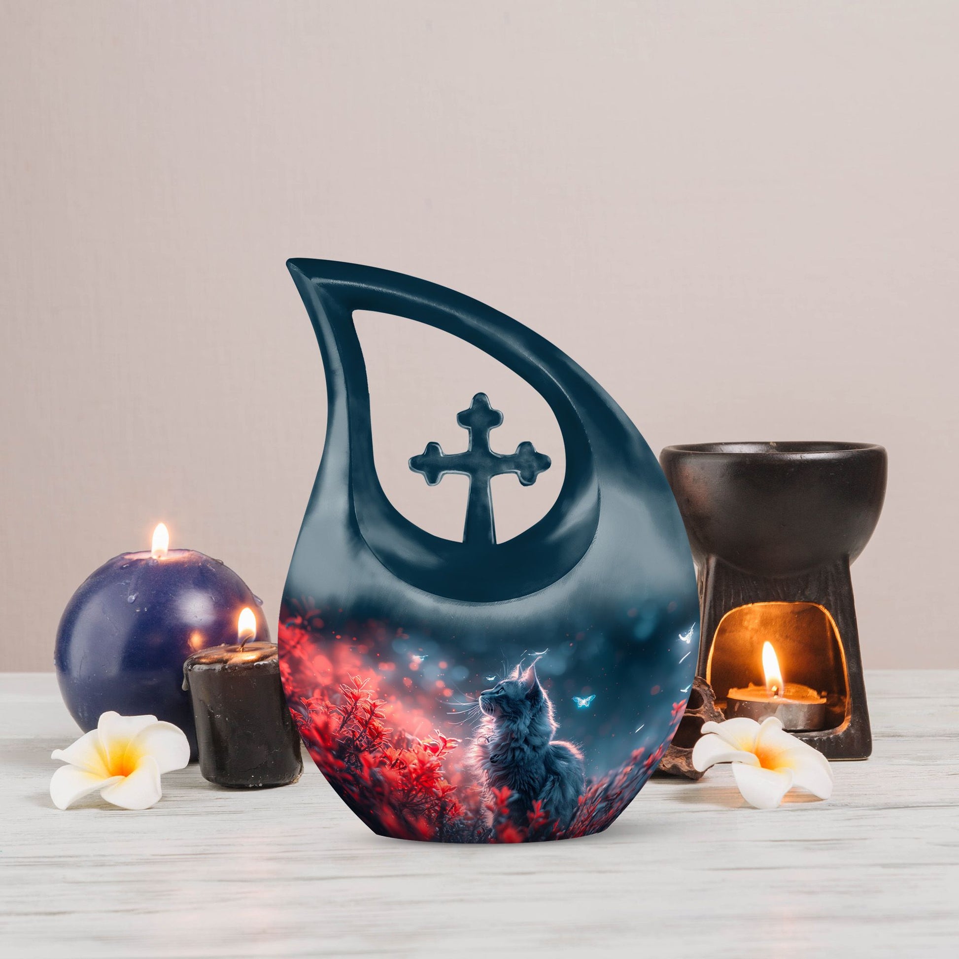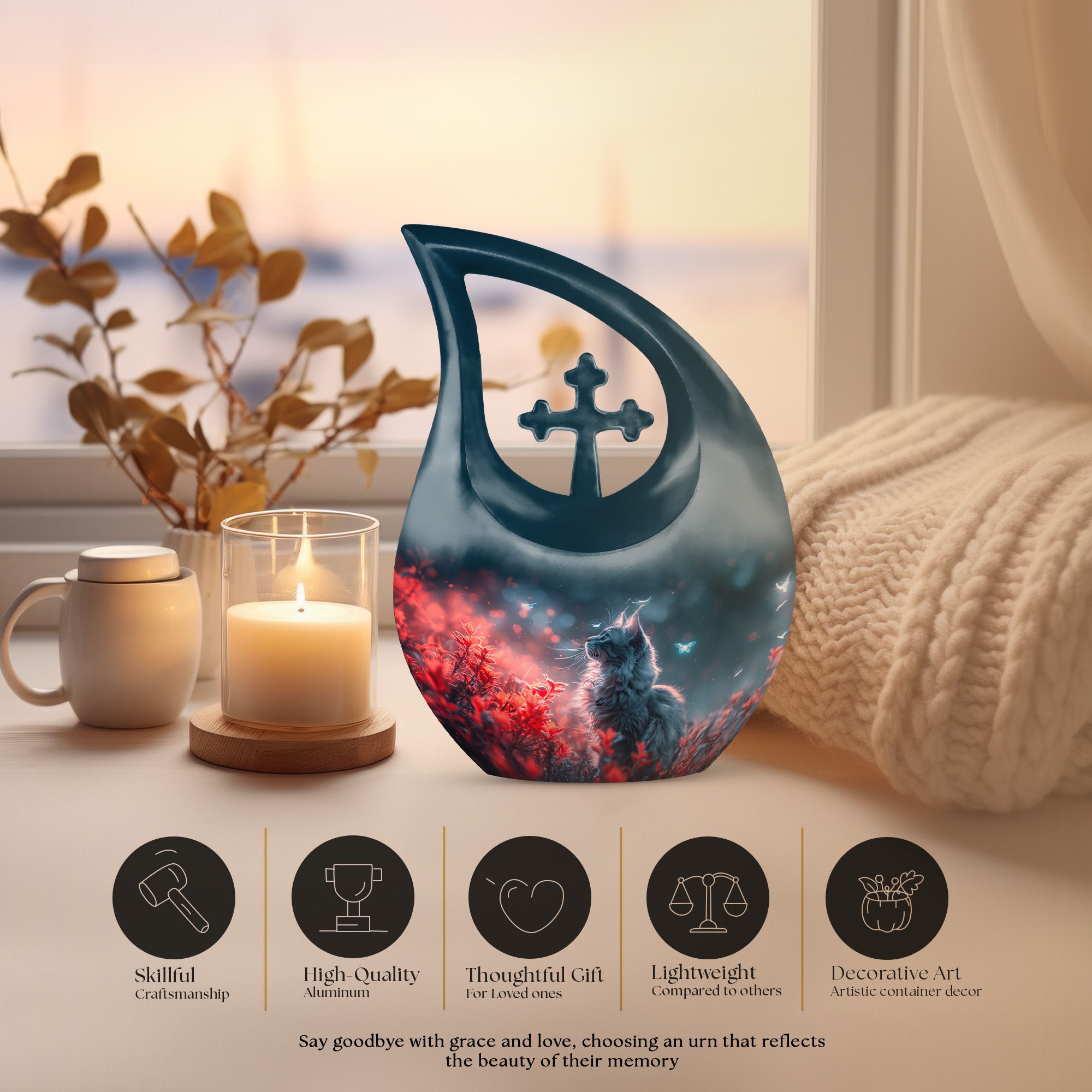Imbued with enduring sentiment, the 'Mystical Whiskers Urn' presents a compassionate choice for the safe containment of the cherished ashes of a loved one. Enhanced by the exquisitely crafted 'Cross Drop' pattern, the urn appreciates the transient beauty of life. Standing at an impressive size of 10 inches in height, this large monument is a worthy tribute, offering a capacity of lofty 200 cubic inches. It bears a refined weight of 3.3 pounds, constructed from the sturdy build of Aluminium, upholding its promise of long-lasting companionship. The 'Together Again Companion Urn' invokes the power of unity and togetherness in commemoration. Personalizing this urn by engraving names stands as a mark of your intimate connection to the departed soul. Providing a soft velvet pouch for the ashes, the subtle care encapsulated makes this urn a standout among other memorial urns. Add a remarkable touch to your remembrance with this blend of elegance and devotion. Ideal for those seeking urns for men's ashes, bio urn for humans, tall urns, and the best urns.