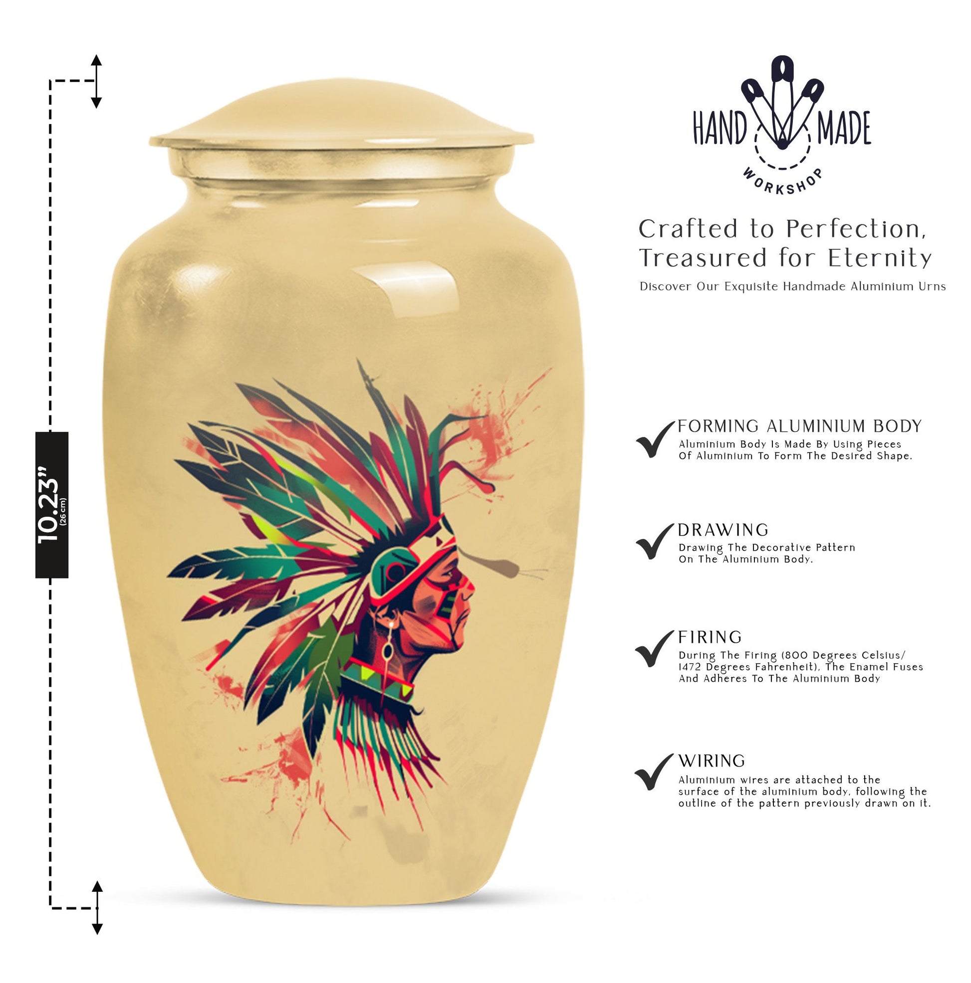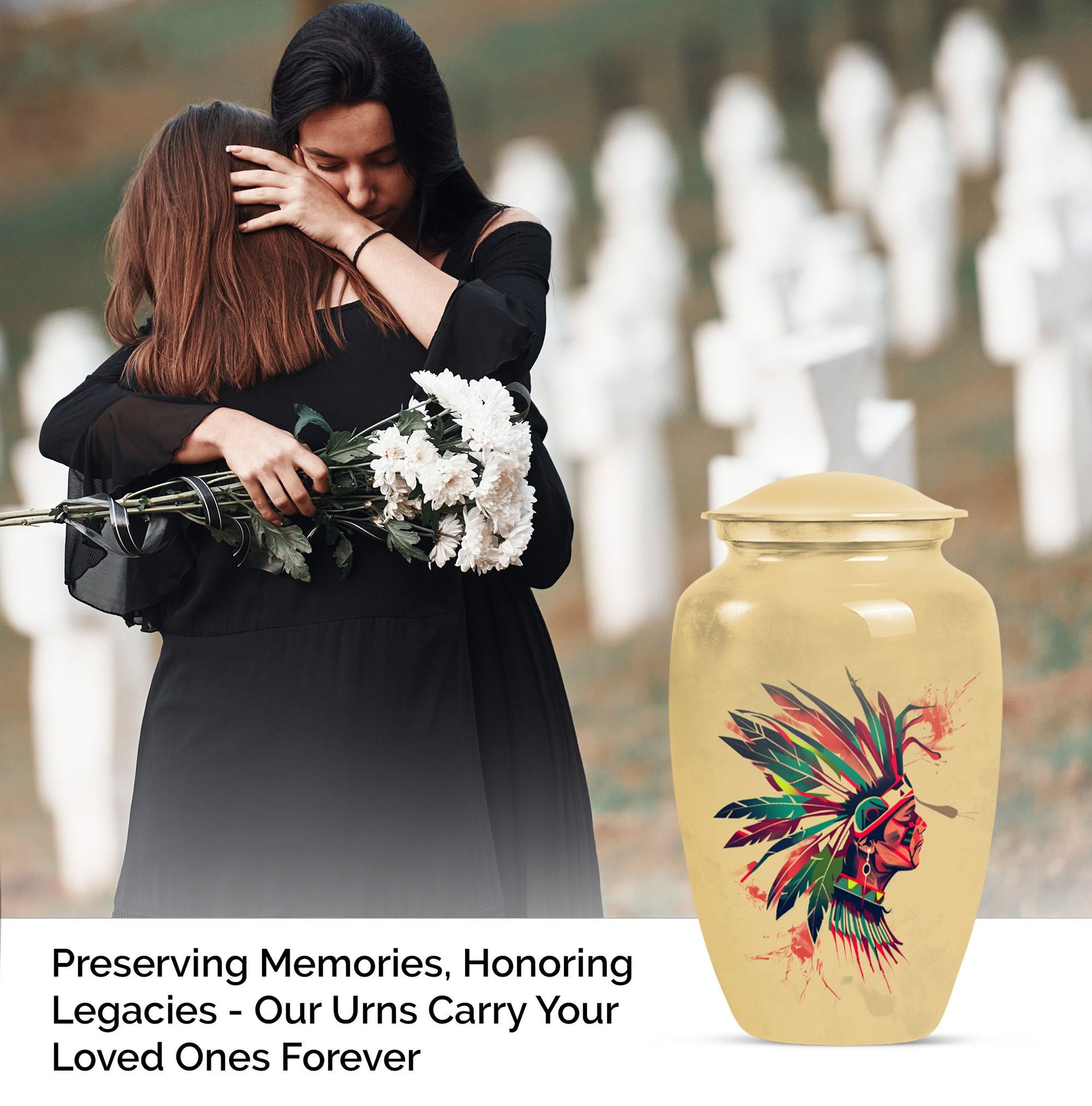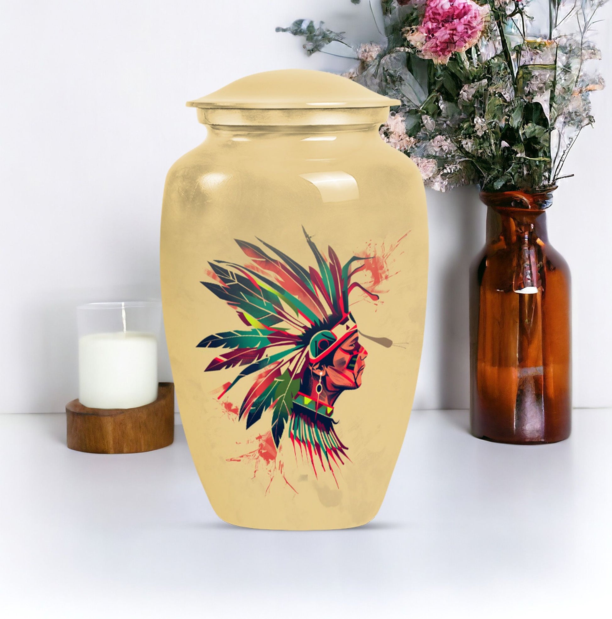 Evoke a sense of serene remembrance with our native american funeral ash urn, a timeless piece built to reverently preserve the memories of your loved ones. This large urn, standing tall at 10 inches with a substantial capacity of 200 cubic inches, offers an embracing haven for ashes. Crafted out of robust aluminium, it's significant in its weight of 3.3 pounds, reflecting its lasting durability. The classic urn style, coupled with an abstract theme, adds a touch of tranquility and grace. We understand that every memory is precious; hence we offer an option to personalize this urn with engraved names, making it as unique as the life it honors. Along with the urn, you'll receive a soft velvet pouch for secure containment and discreet storage of ashes. If you are searching for 'memorial urns', 'urns for human ashes', or specifically 'metal urns for adult human ashes', or a special 'memorial urn for mom ashes', this hand-finished, original masterpiece is an excellent choice. Remember your dear ones in a sacred and dignified manner with this unique urn.