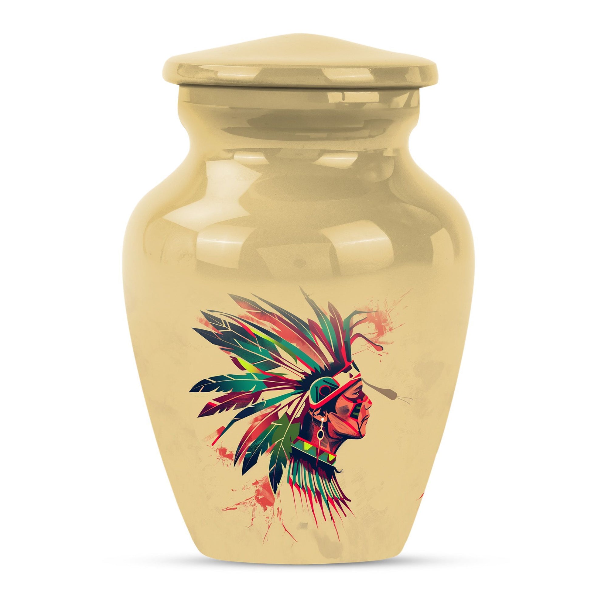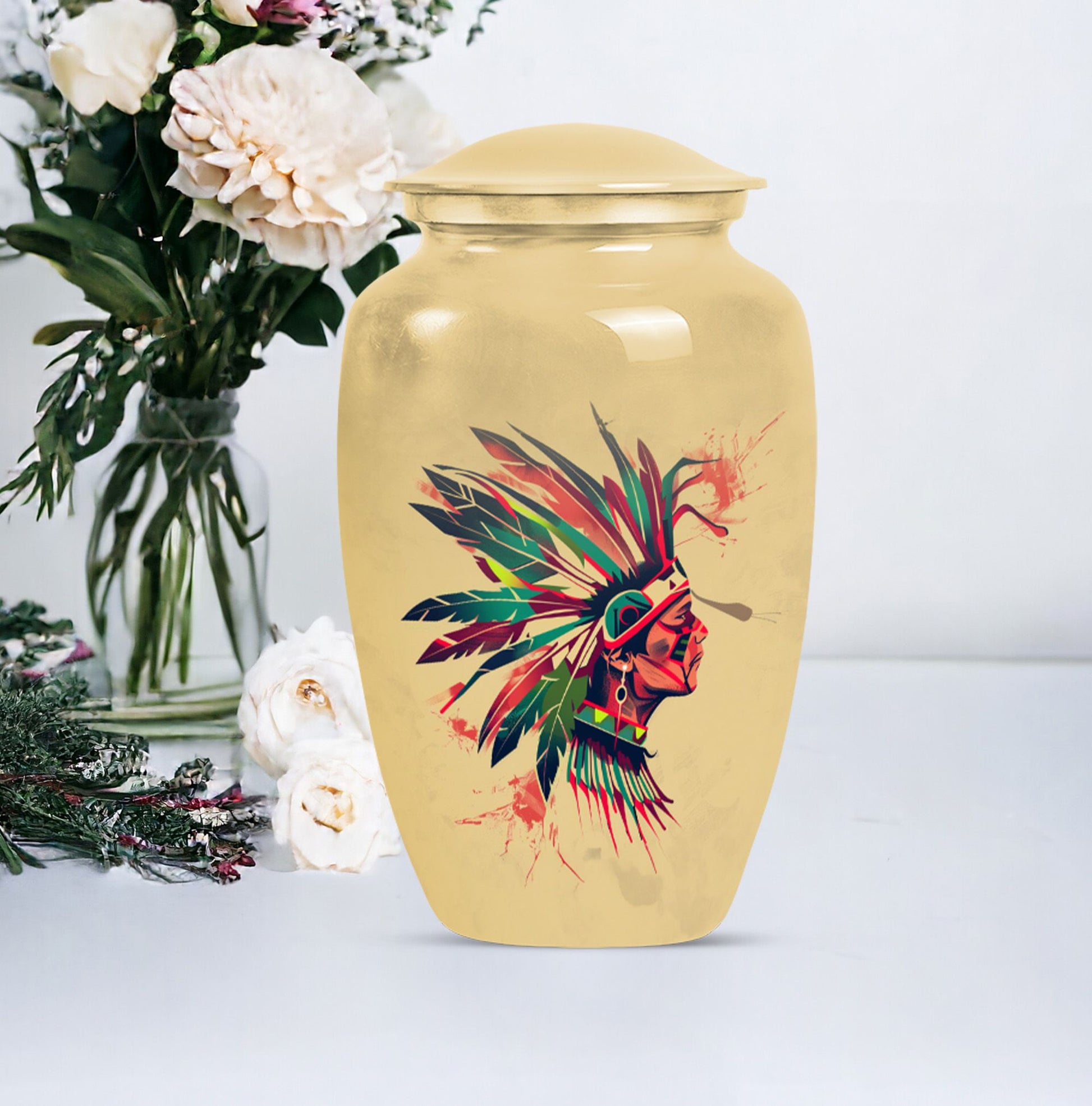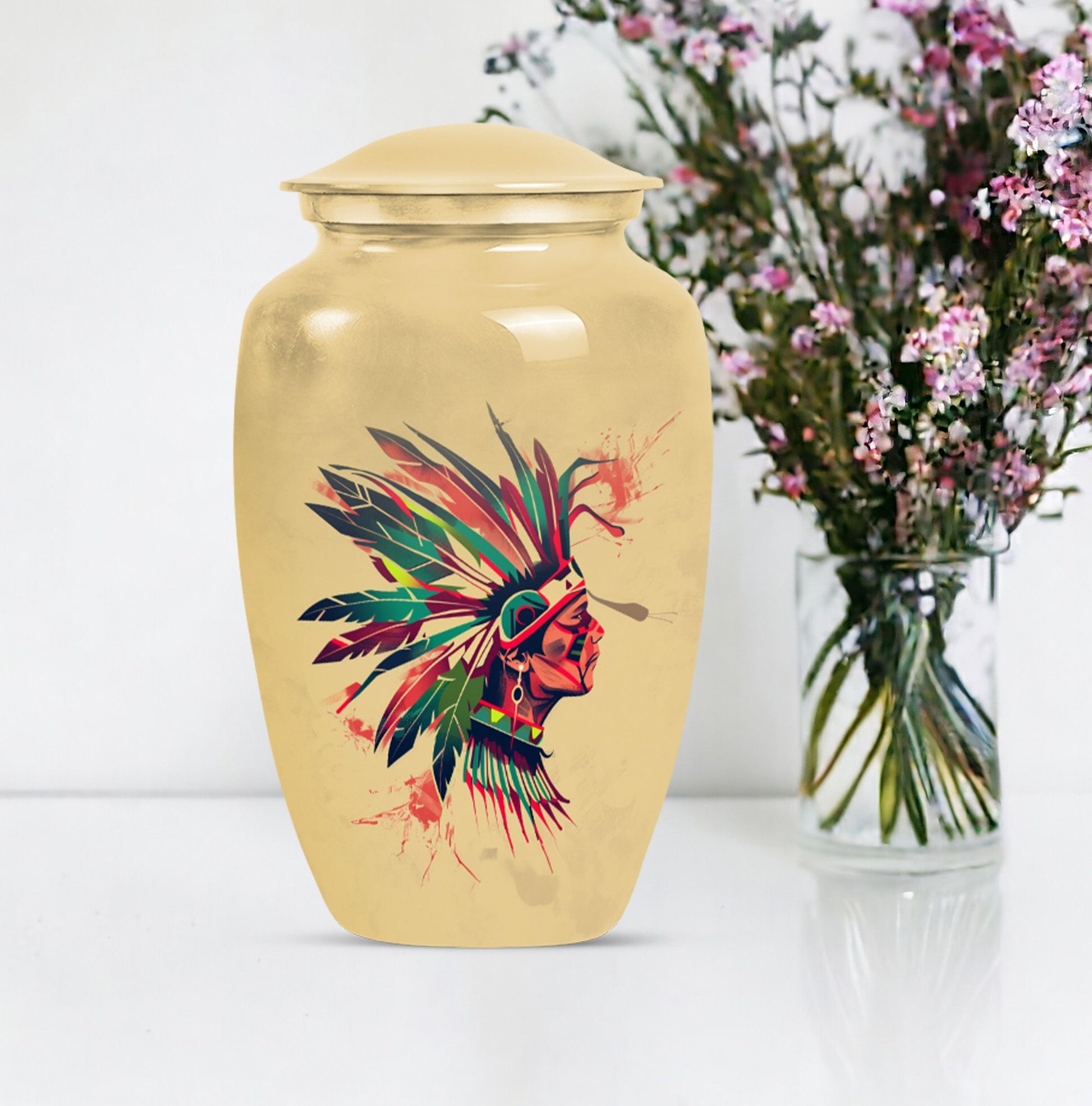 Evoke a sense of serene remembrance with our native american funeral ash urn, a timeless piece built to reverently preserve the memories of your loved ones. This large urn, standing tall at 10 inches with a substantial capacity of 200 cubic inches, offers an embracing haven for ashes. Crafted out of robust aluminium, it's significant in its weight of 3.3 pounds, reflecting its lasting durability. The classic urn style, coupled with an abstract theme, adds a touch of tranquility and grace. We understand that every memory is precious; hence we offer an option to personalize this urn with engraved names, making it as unique as the life it honors. Along with the urn, you'll receive a soft velvet pouch for secure containment and discreet storage of ashes. If you are searching for 'memorial urns', 'urns for human ashes', or specifically 'metal urns for adult human ashes', or a special 'memorial urn for mom ashes', this hand-finished, original masterpiece is an excellent choice. Remember your dear ones in a sacred and dignified manner with this unique urn.