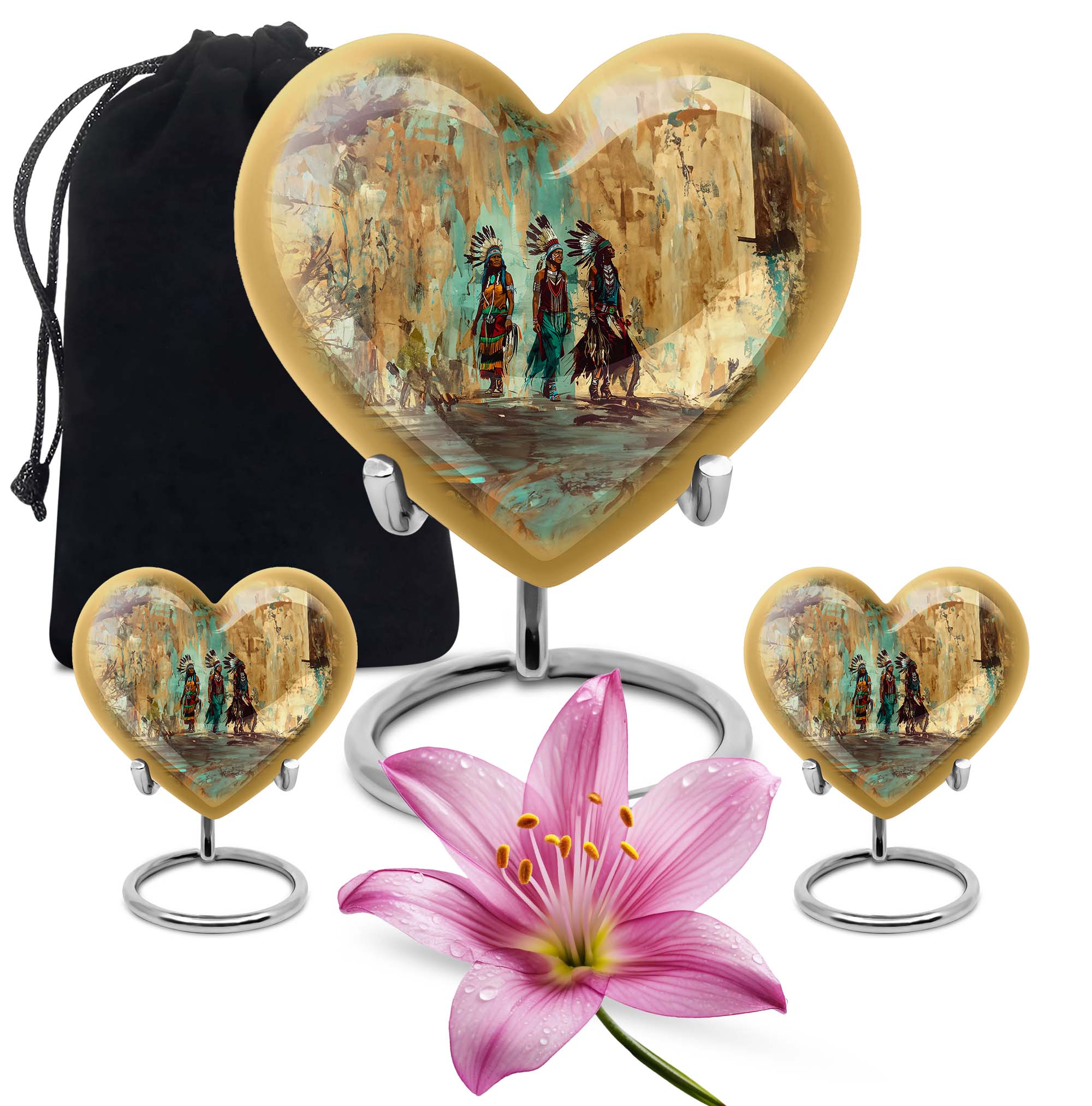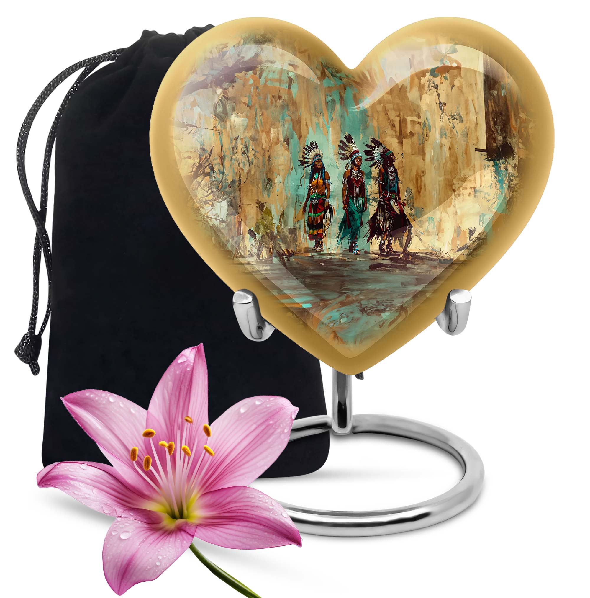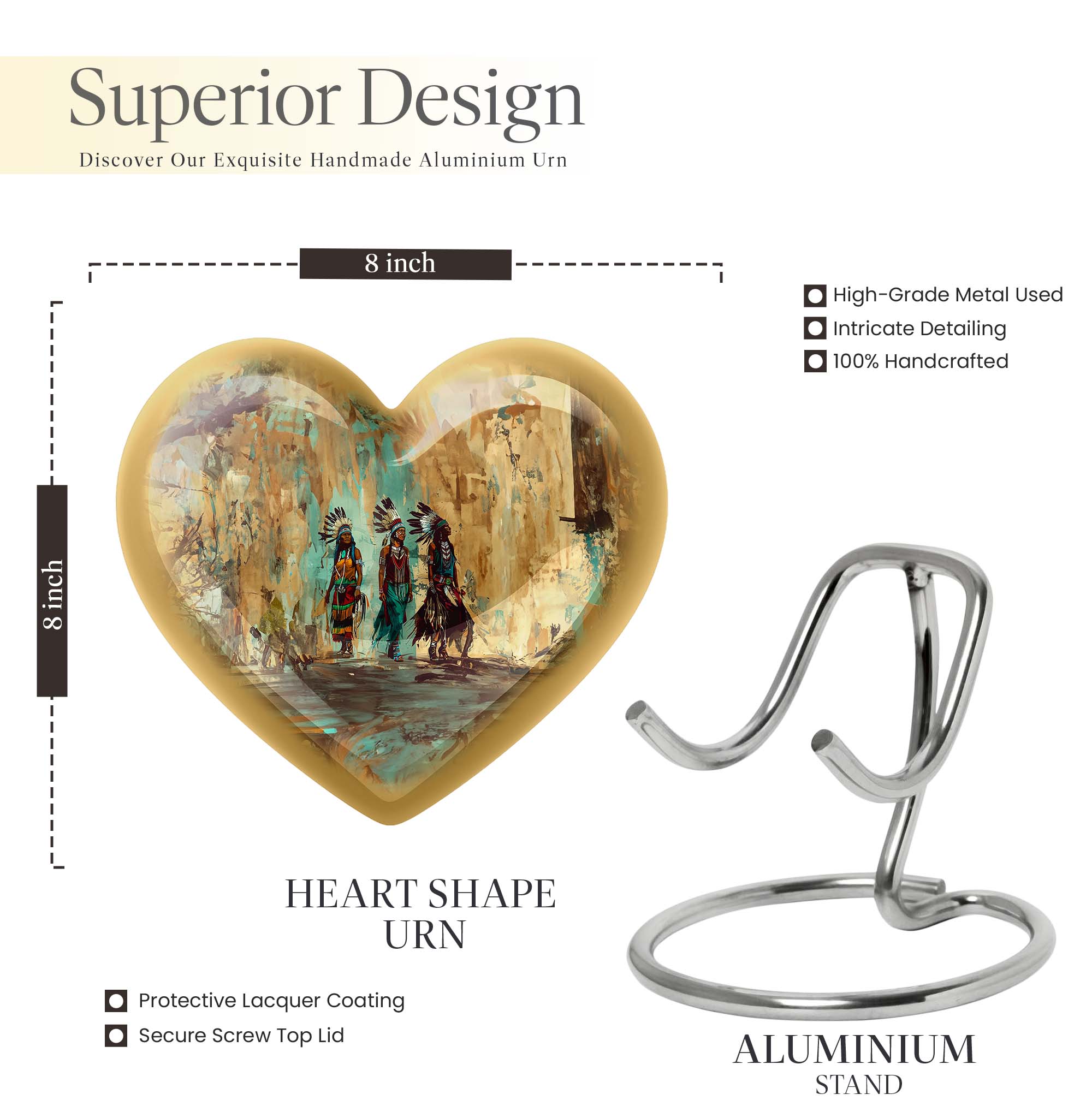 Introducing our Native American Urn, a representation of rich tradition and spiritual belief. Tailored with a heart urn structure, this burial medium size urn is a striking tribute to your loved ones. Standing at 10 inches in height and possessing a capacity of 200 cubic inches, this cremation urn brings a sense of tranquility during difficult times. Made from resilient aluminium, it weighs a sturdy 3.3 pounds, promising longevity and durability. The abstract theme of this large urn strikes a delicate balance between avant-garde artistry and timeless culture. The urn comes with a plush velvet pouch, ensuring safe and respectful containment of ashes. We also provide an option to personalize your urn by engraving names, making it a unique monument of remembrance. Our product is a thoughtful choice amongst cremation urns for women, ash adult earns ashes, artistic urns, and metal urns for burial in ground large, reflecting a perfect union of convention and individuality.