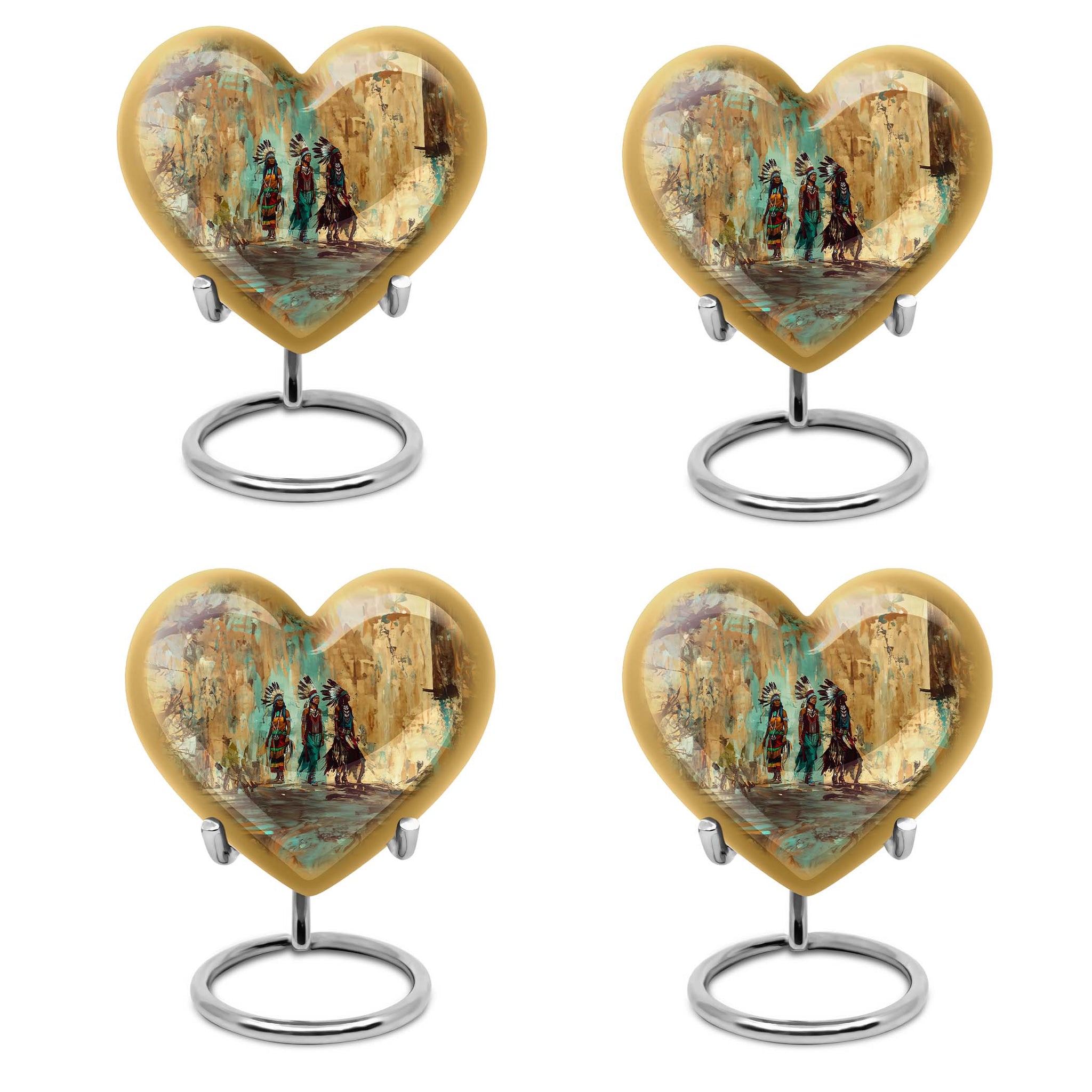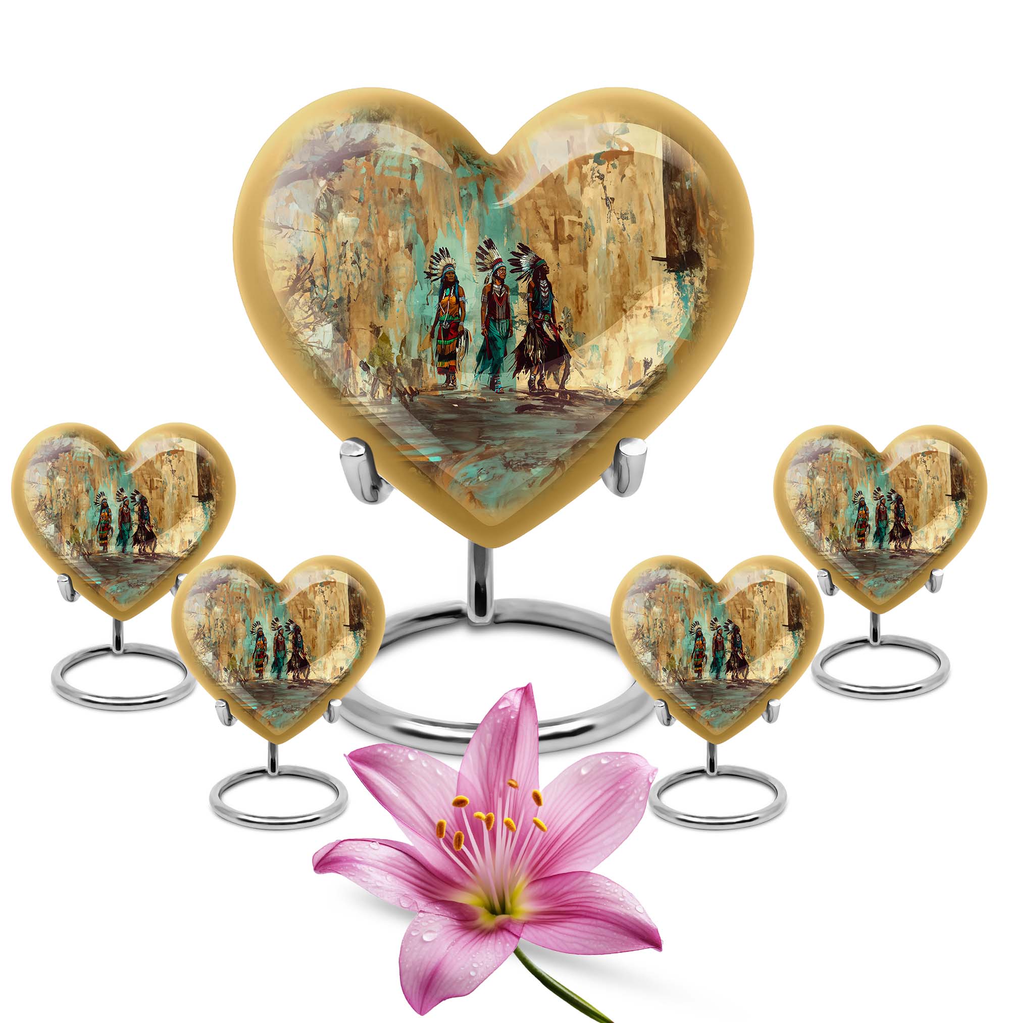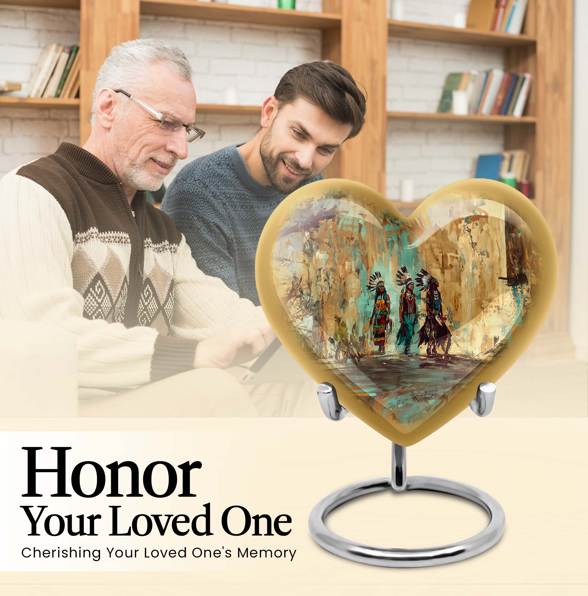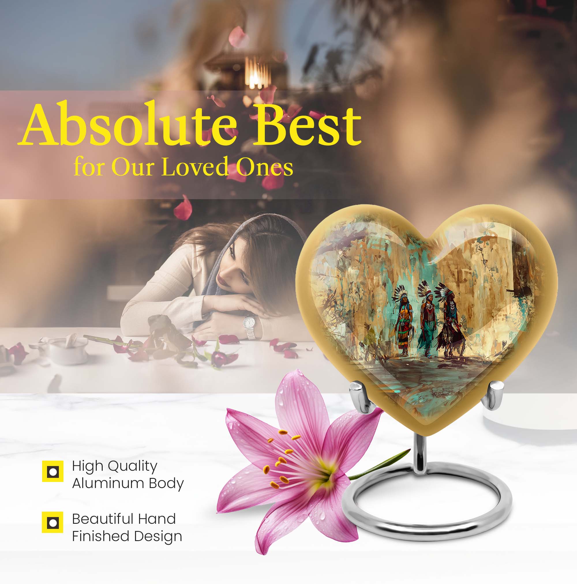 Introducing our Native American Urn, a representation of rich tradition and spiritual belief. Tailored with a heart urn structure, this burial medium size urn is a striking tribute to your loved ones. Standing at 10 inches in height and possessing a capacity of 200 cubic inches, this cremation urn brings a sense of tranquility during difficult times. Made from resilient aluminium, it weighs a sturdy 3.3 pounds, promising longevity and durability. The abstract theme of this large urn strikes a delicate balance between avant-garde artistry and timeless culture. The urn comes with a plush velvet pouch, ensuring safe and respectful containment of ashes. We also provide an option to personalize your urn by engraving names, making it a unique monument of remembrance. Our product is a thoughtful choice amongst cremation urns for women, ash adult earns ashes, artistic urns, and metal urns for burial in ground large, reflecting a perfect union of convention and individuality.