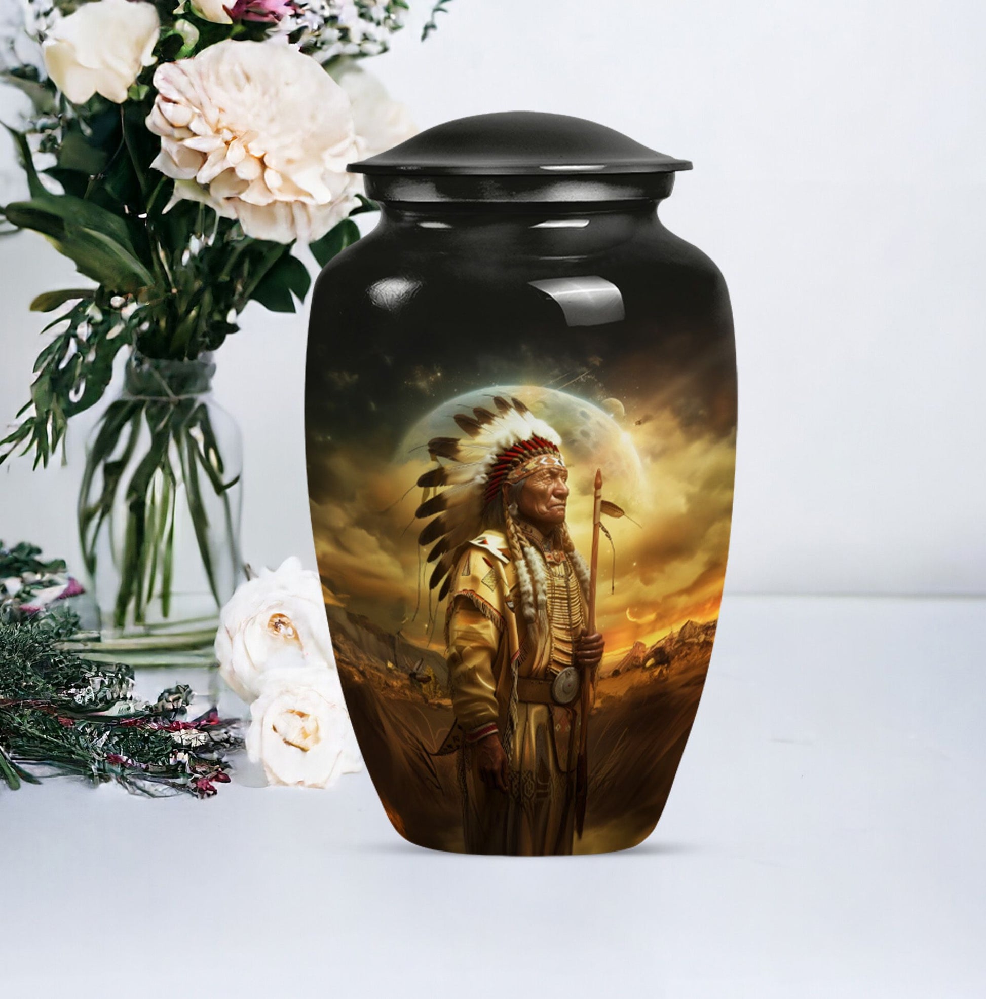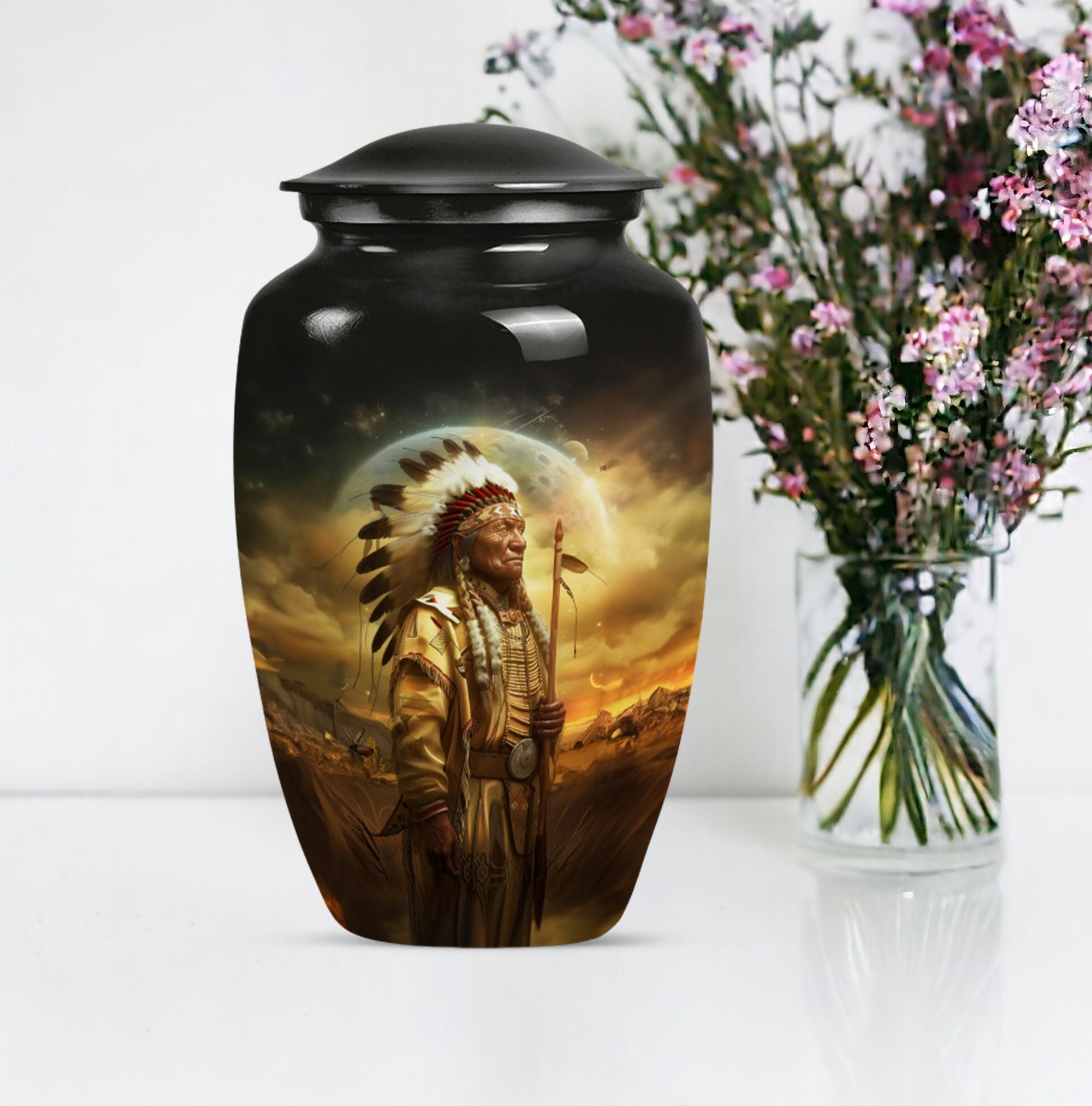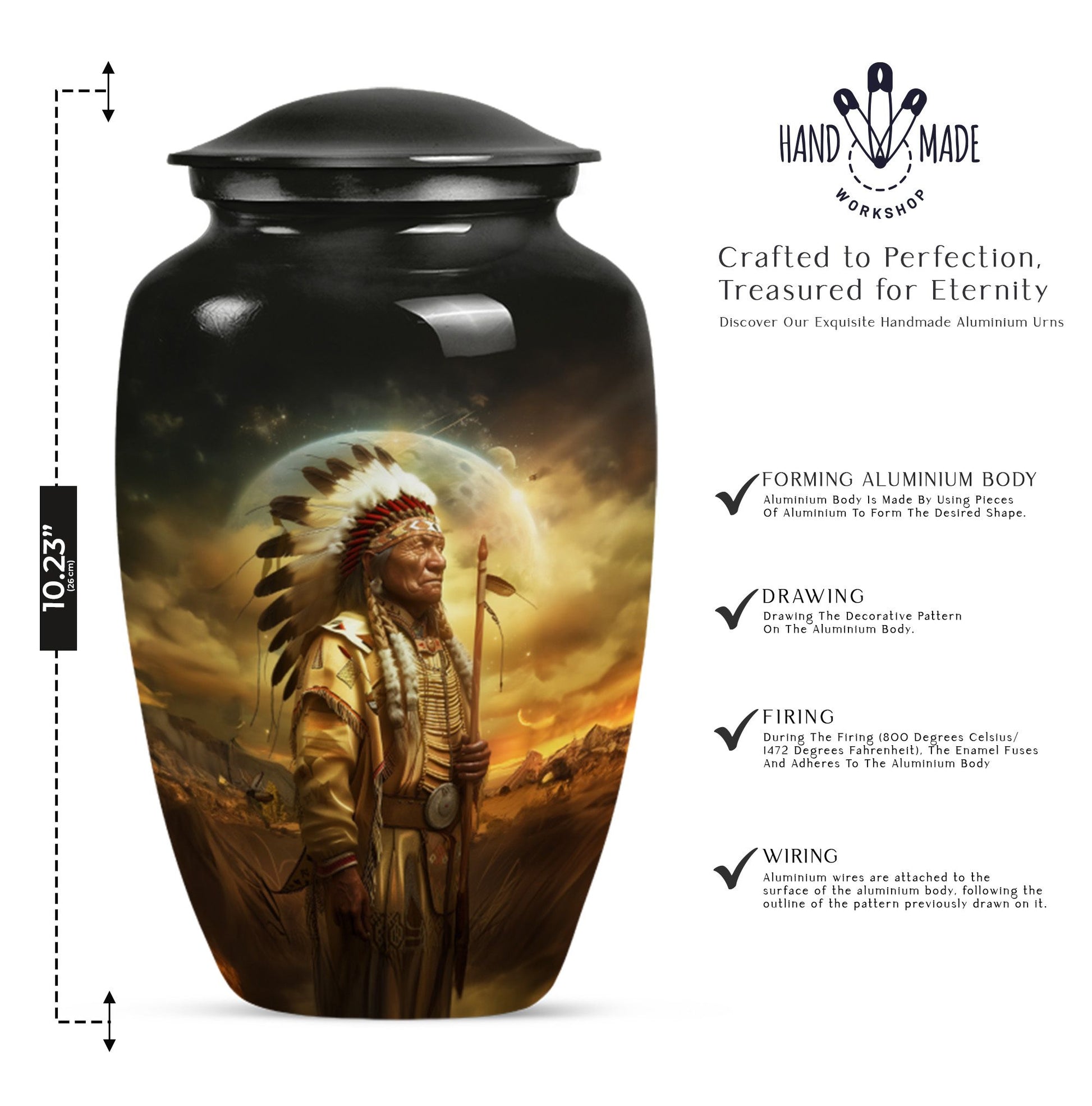 Introducing our Large Aluminium Native American Urn, a timeless tribute to commemorate your loved ones. This cremation urn caters perfectly to the adult male segment. At 10 inches tall and weighing 3.3 pounds, our memorial urn exudes a solemn charm. Large yet manageable, it holds an impressive 200 cubic inches, ensuring ample space for honoring the departed. The package comes complete with a velvet pouch for safe containment of the ashes. Considering everyone's unique journey, we offer customization options like engraved names, making the urn all the more personal. This artefact stands out with an abstract theme that respects both men and women ashes alike. Whether you're looking for funeral metal urns or burial urns for in-ground interment, our urn serves the purpose. Offering you not just an object, but a testament of remembrance that withstands the test of time.