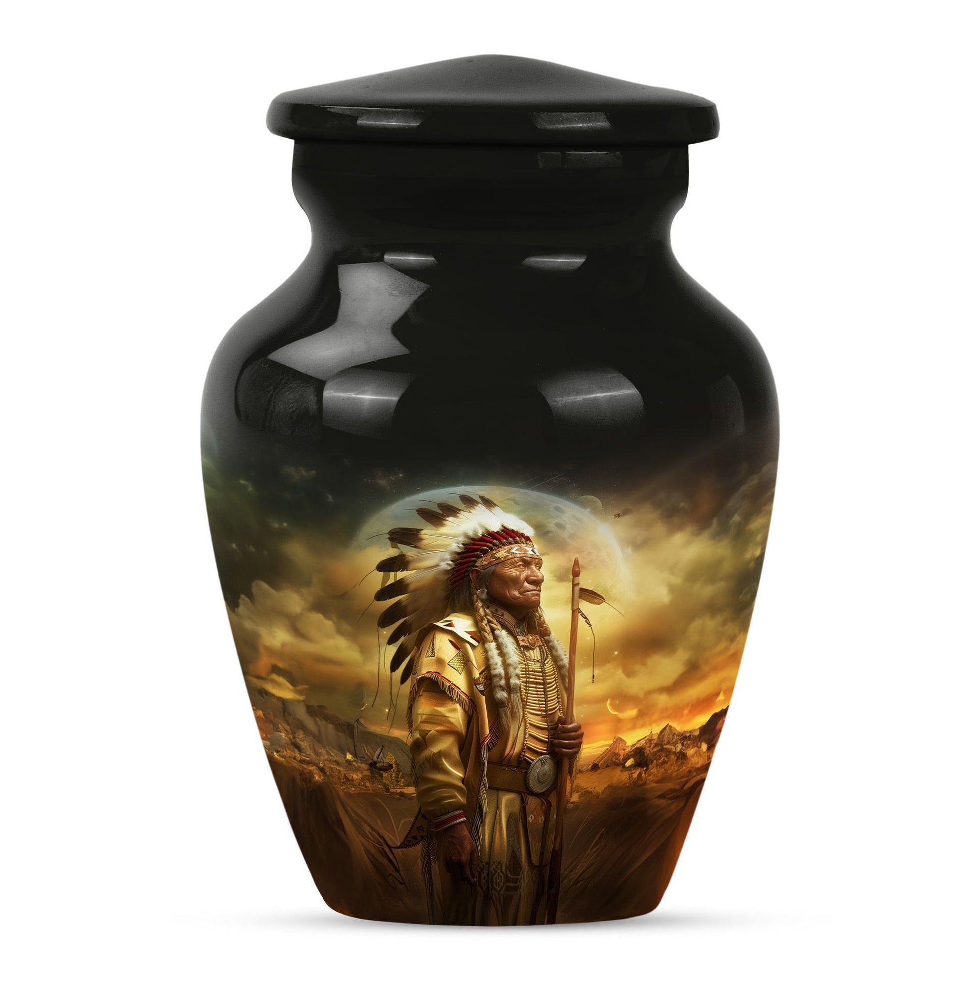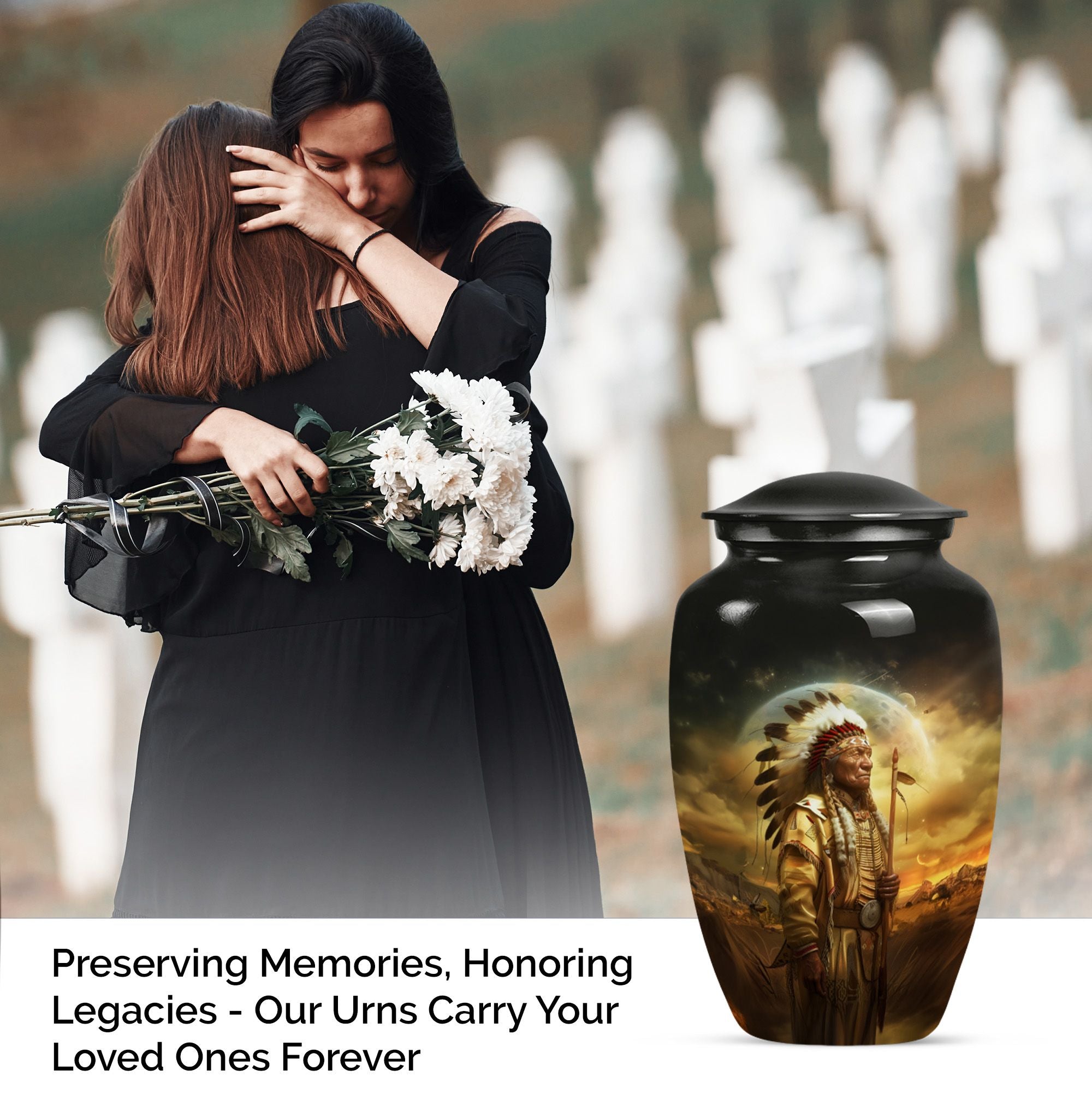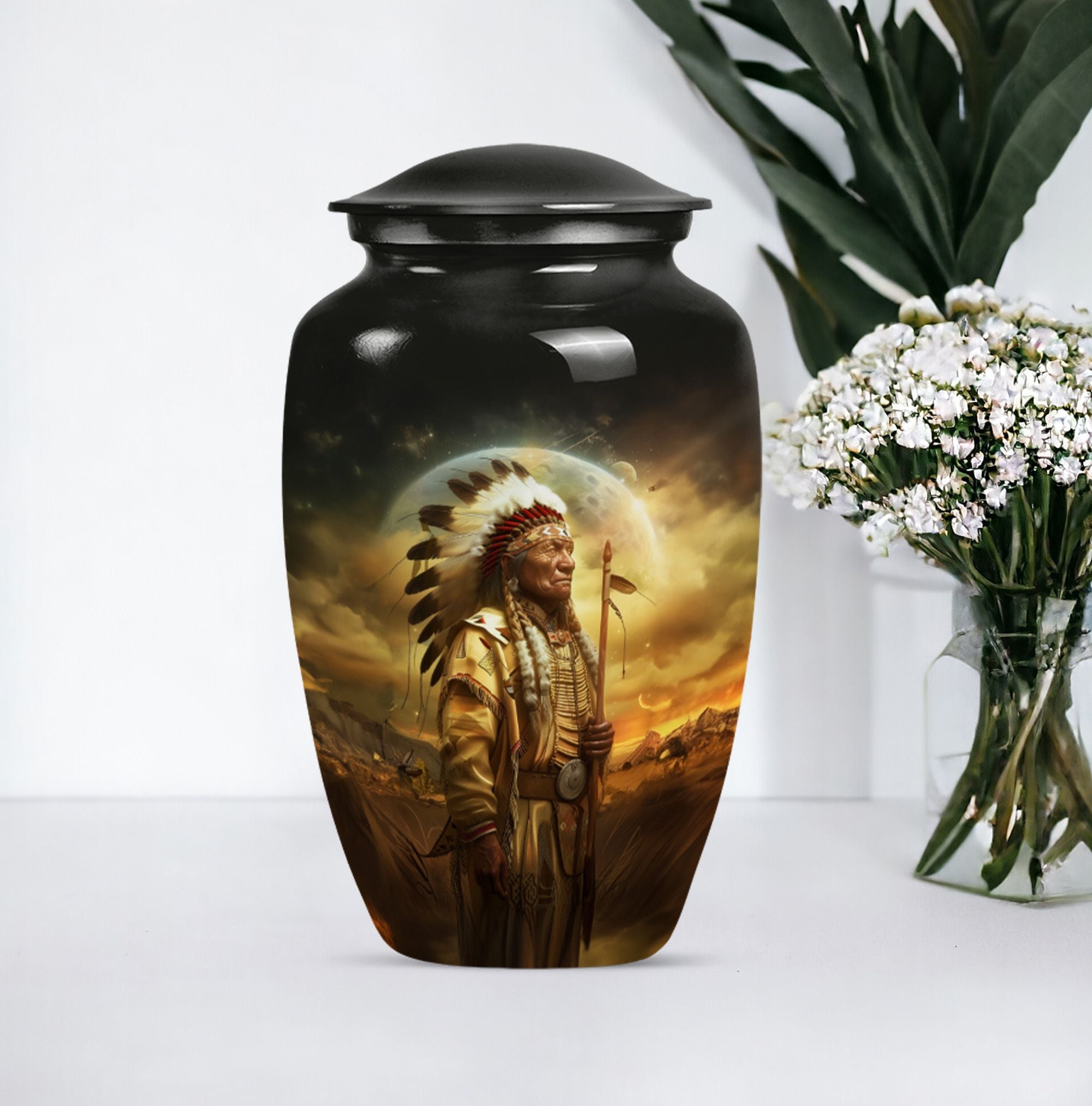 Introducing our Large Aluminium Native American Urn, a timeless tribute to commemorate your loved ones. This cremation urn caters perfectly to the adult male segment. At 10 inches tall and weighing 3.3 pounds, our memorial urn exudes a solemn charm. Large yet manageable, it holds an impressive 200 cubic inches, ensuring ample space for honoring the departed. The package comes complete with a velvet pouch for safe containment of the ashes. Considering everyone's unique journey, we offer customization options like engraved names, making the urn all the more personal. This artefact stands out with an abstract theme that respects both men and women ashes alike. Whether you're looking for funeral metal urns or burial urns for in-ground interment, our urn serves the purpose. Offering you not just an object, but a testament of remembrance that withstands the test of time.