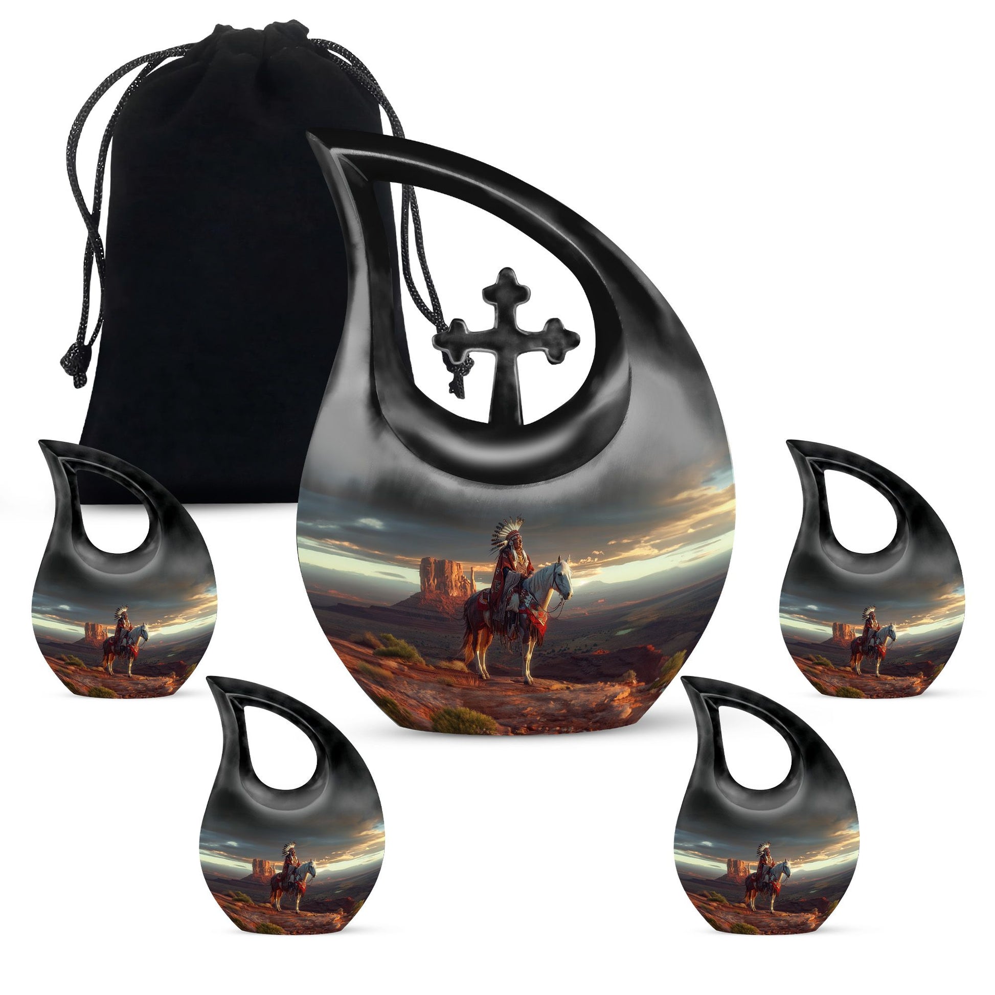 The urn features intricate Native Americanβinspired artwork, symbolizing strength, protection, and spiritual guidance. Made from durable aluminium, it can be purchased as part of cremation urns large & small combo sets or as an individual funeral urn. Its secure screw-top lid keeps funeral urn ashes safe, while the refined craftsmanship ensures long-lasting beauty. Whether you need funeral urns for ashes adult or funeral urns for human ashes small, this piece is created to meet diverse memorial needs.