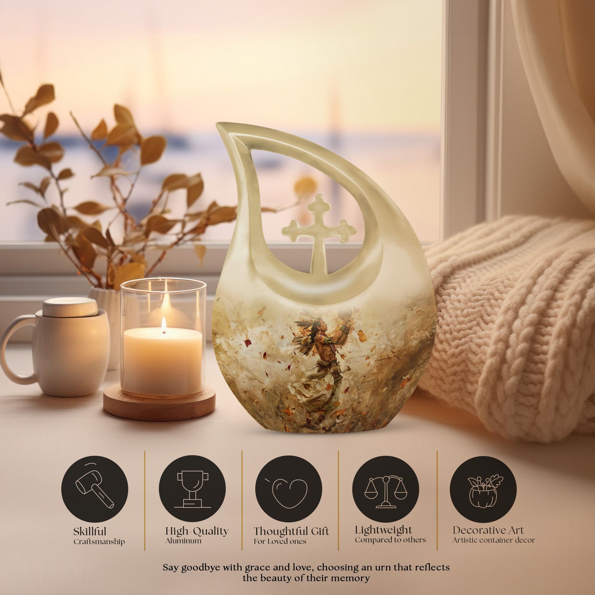 A touching tribute that blends cultural meaning with timeless beauty, this urn offers a peaceful way to honor a life rooted in love, heritage, and memory.