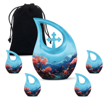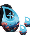 This design also supports families choosing small keepsake urns for ashes or a small keepsake urn to hold a personal portion of remains. Whether selected as an urn for cremations or as part of small ashes keepsake sets, it offers comfort through its calming ocean theme.