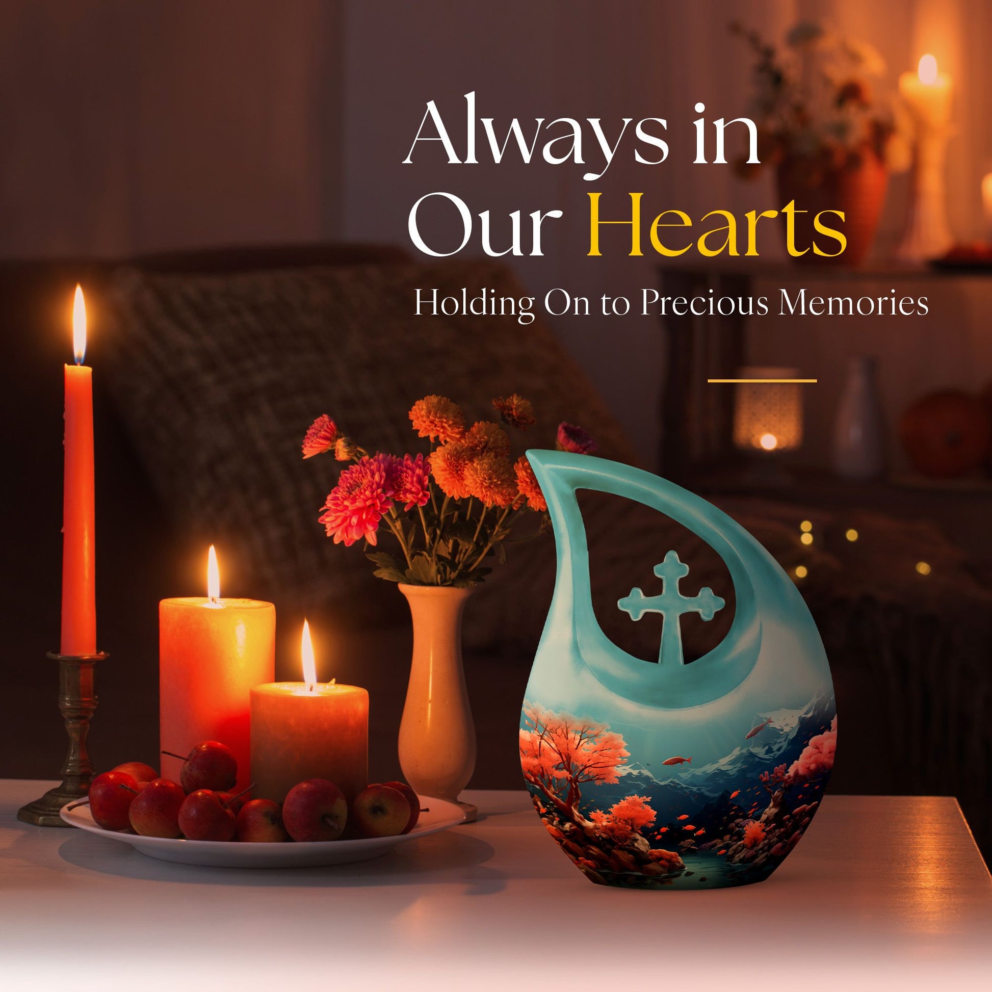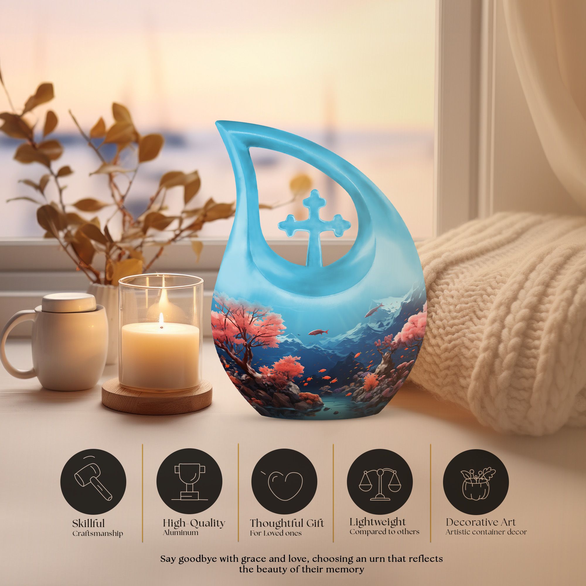 Crafted from durable aluminum, this urn features a detailed underwater-inspired design with soft ocean tones and flowing aquatic elements. Its secure screw-top lid ensures long-term protection, making it a dependable choice among cremation urns adults or cremation urns ashes for burial or display. It pairs beautifully with cremation keepsakes ashes or small urns for human ashes keepsake pieces when loved ones wish to share ashes among family members.