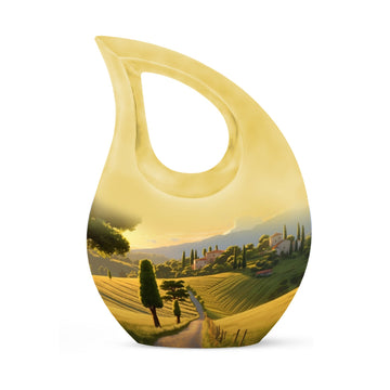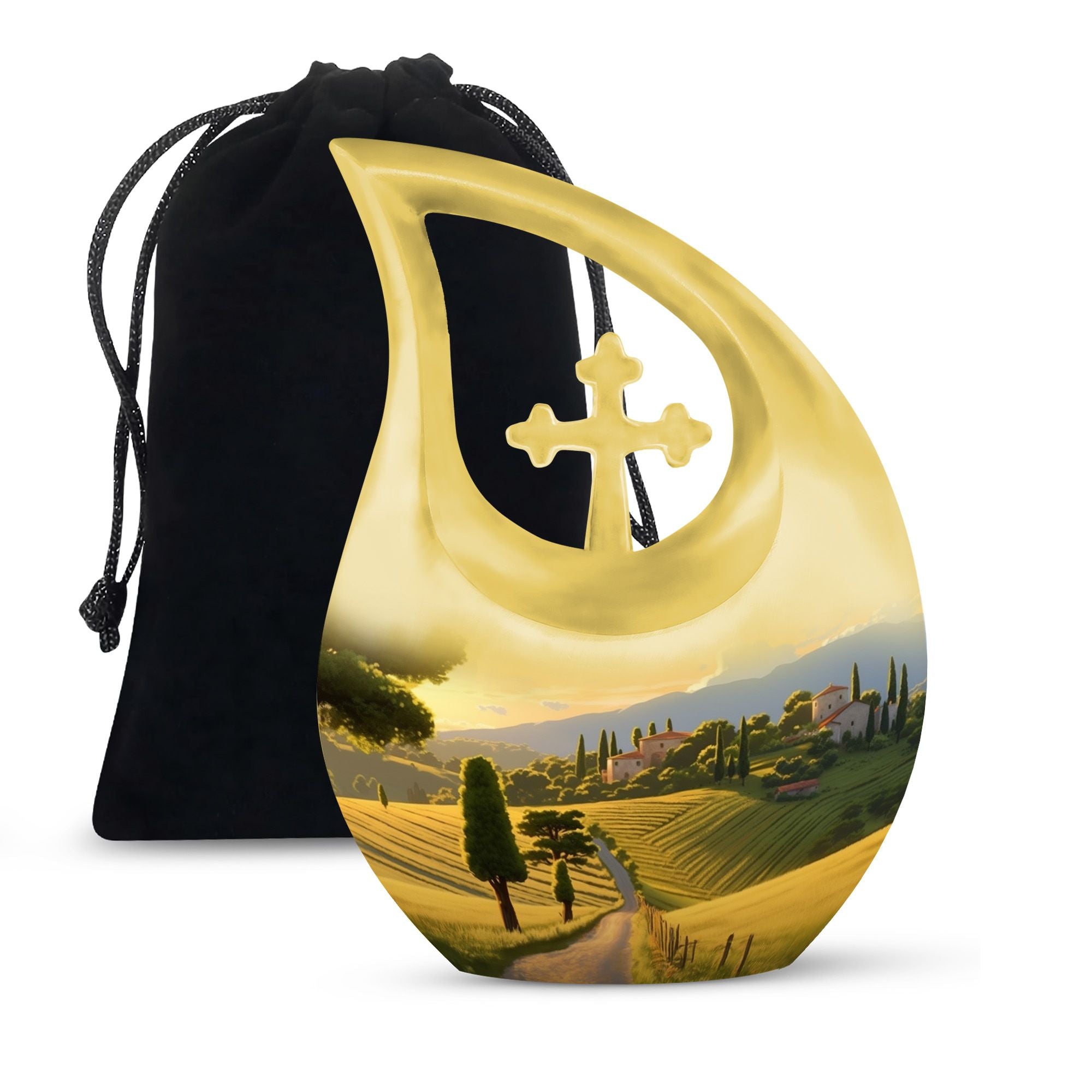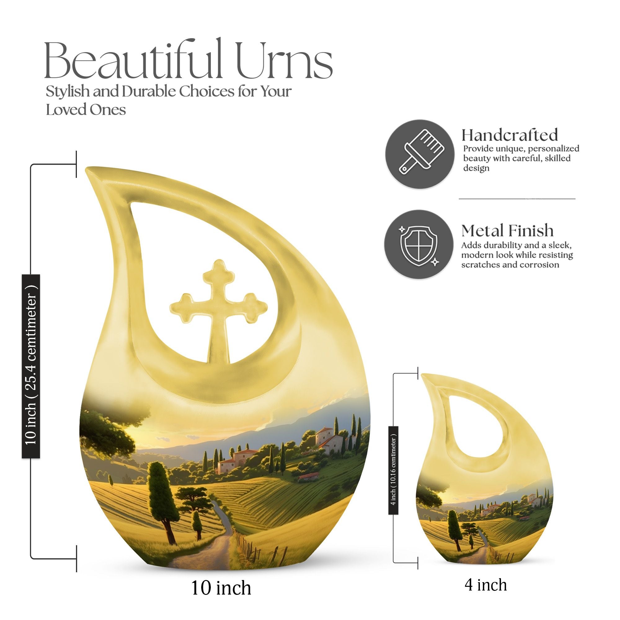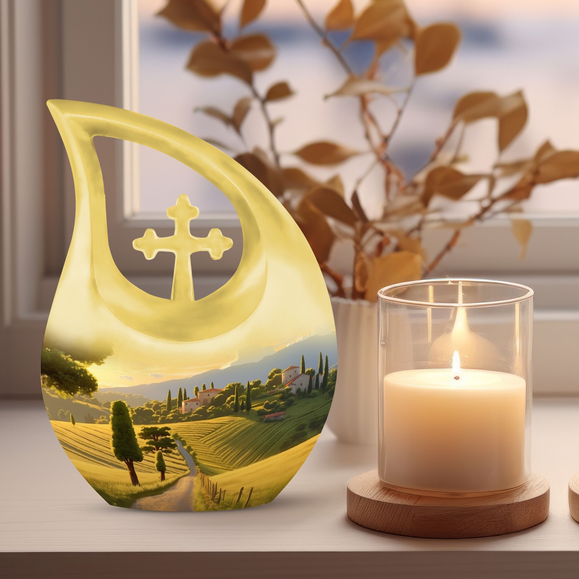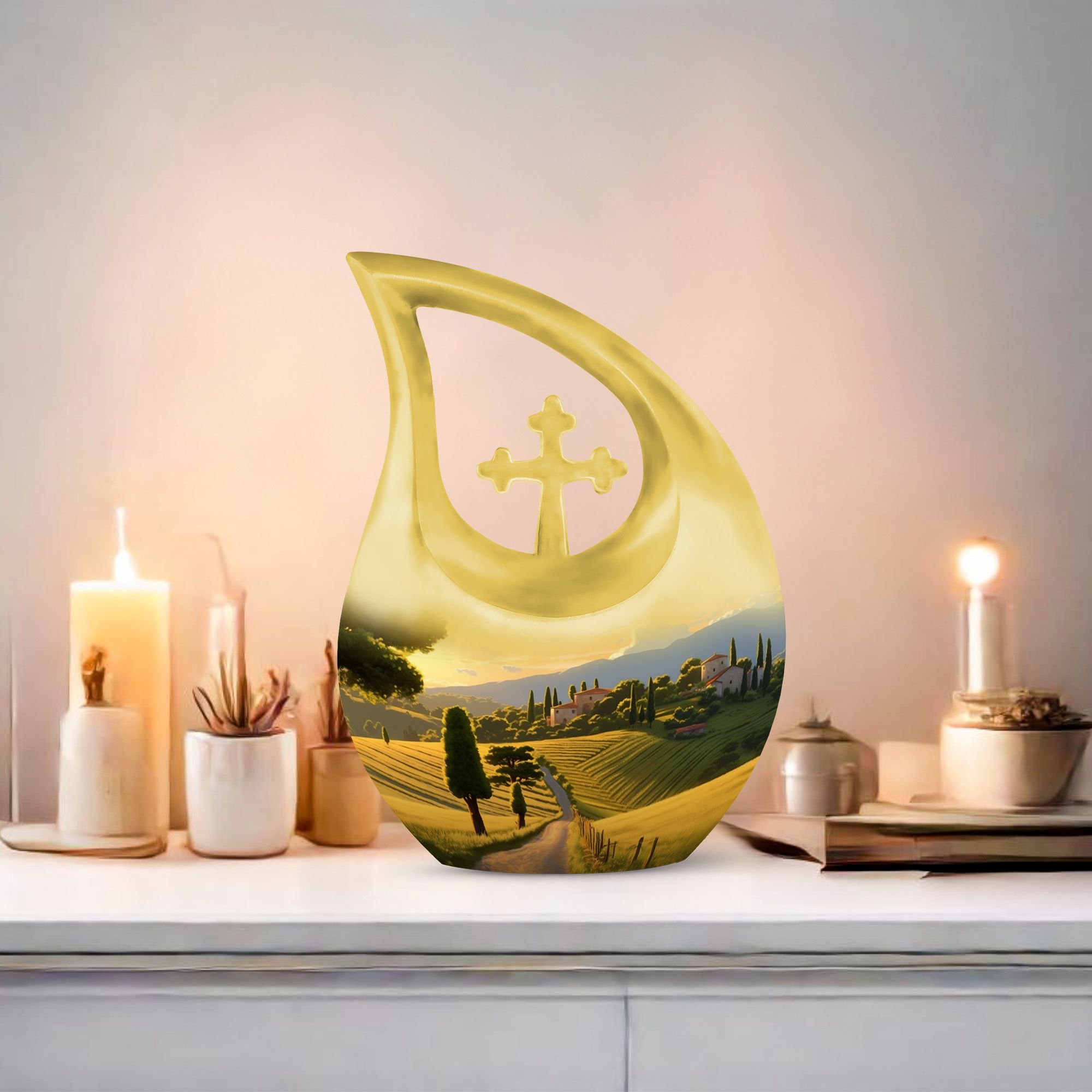 Crafted from durable aluminum, this urn features a calming scenic view inspired by natural landscapes—symbolizing hope, tranquility, and eternal rest. Its secure screw-top lid ensures long-term protection, making it an ideal burial urn for ashes or cremation urns for human ashes adult burial. Whether chosen for a memorial display or selected as one of the burial urns for human ashes, its strength and design provide lasting reassurance. It also pairs beautifully with small burial urns for adult human ashes for families who wish to share portions of ashes.