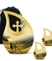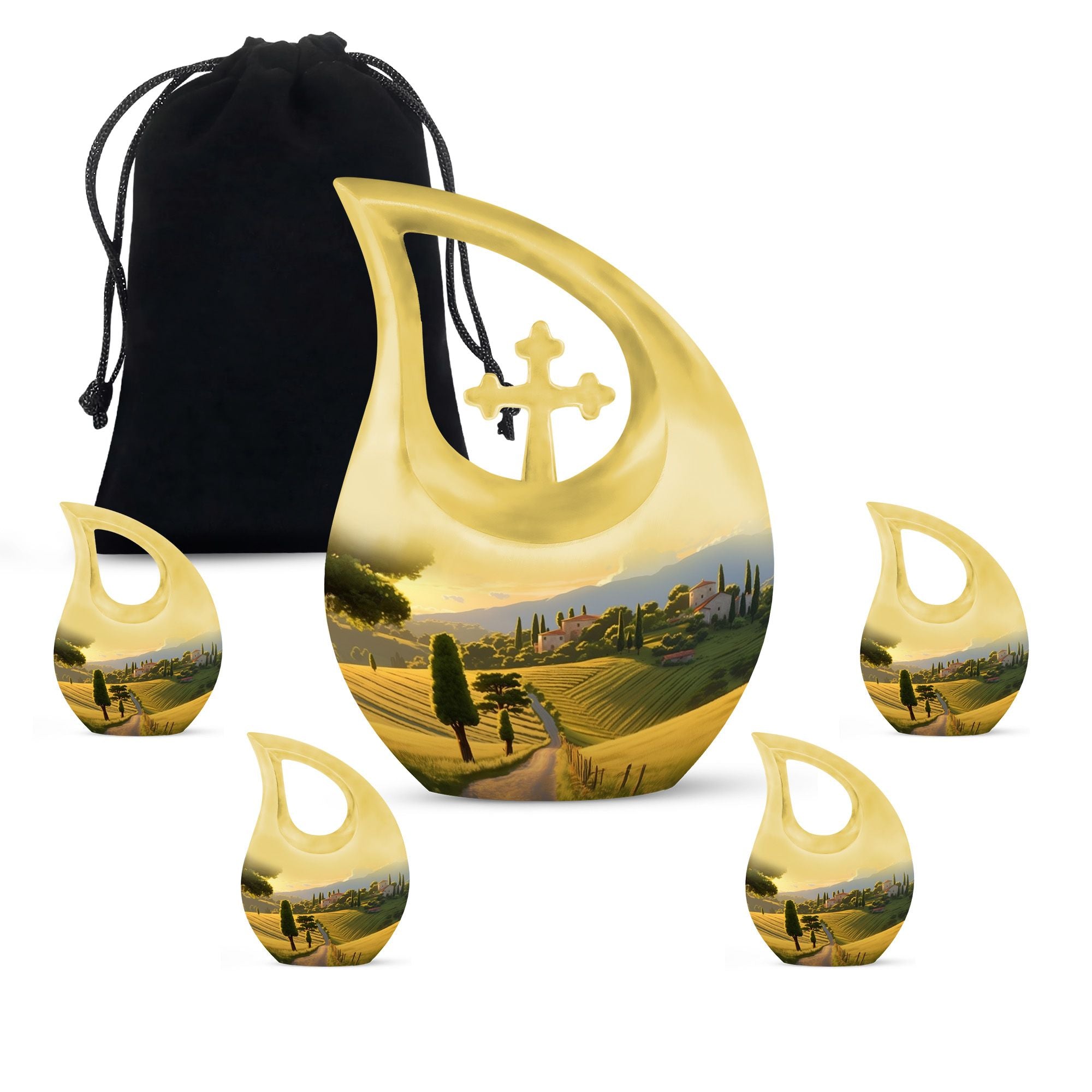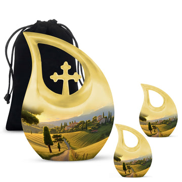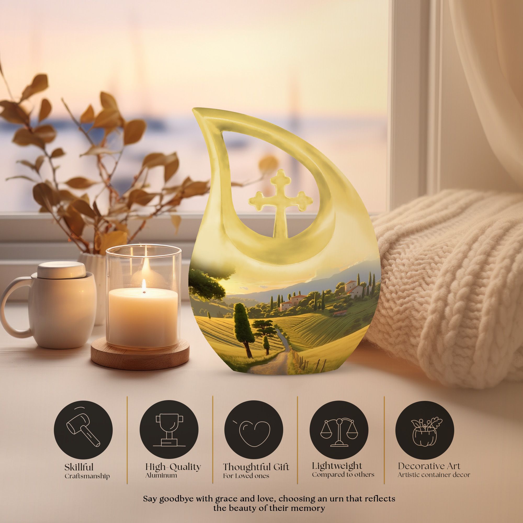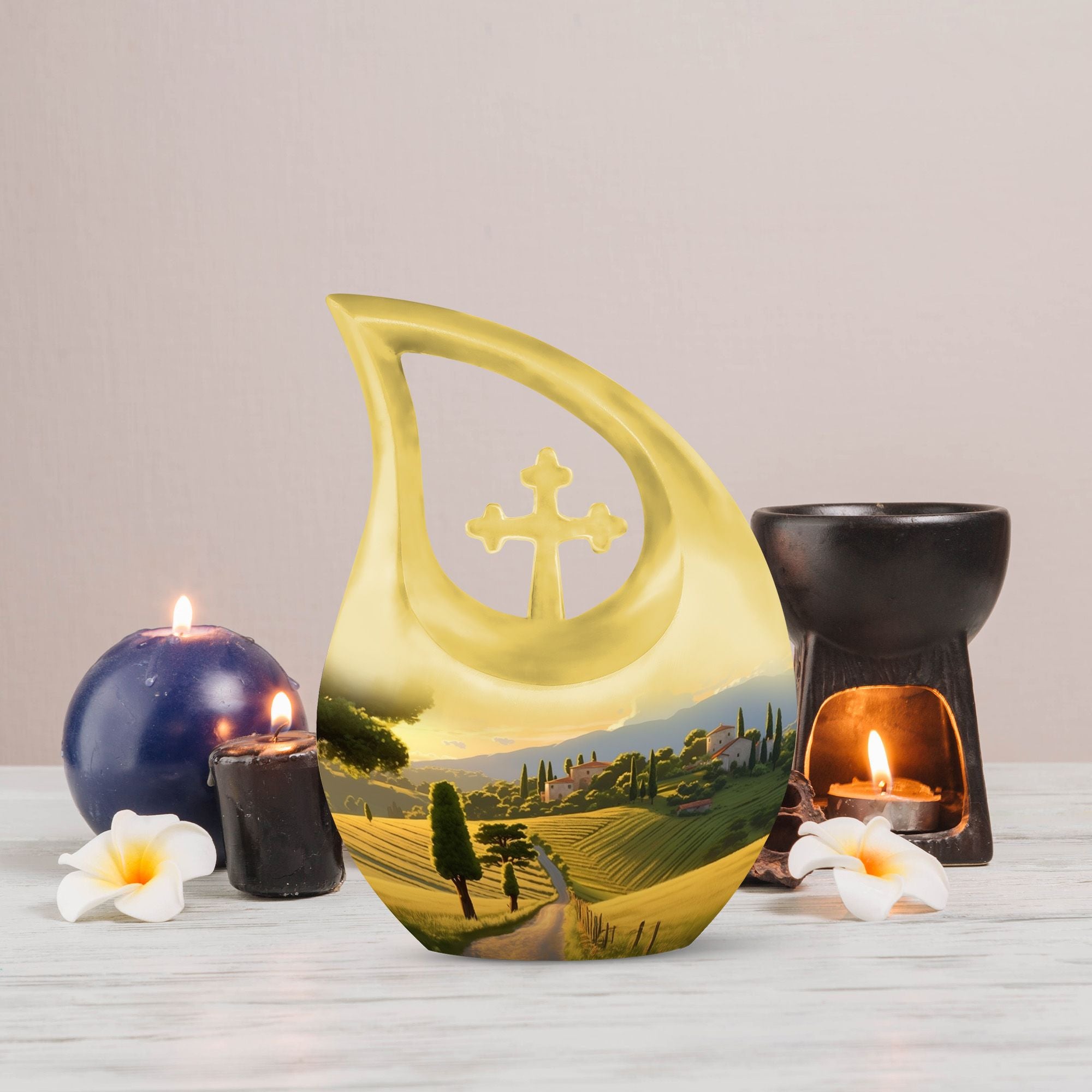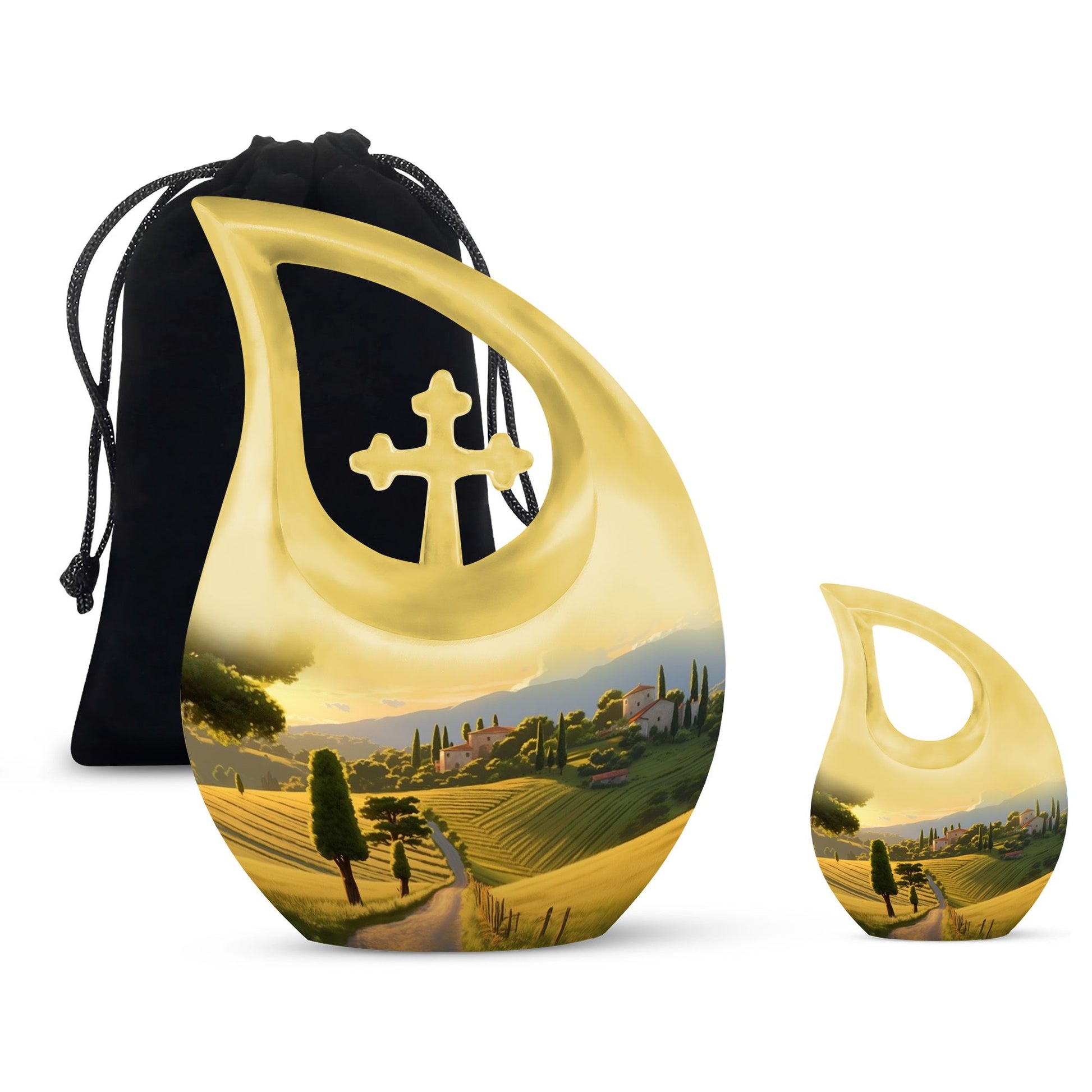Crafted from durable aluminum, this urn features a calming scenic view inspired by natural landscapes—symbolizing hope, tranquility, and eternal rest. Its secure screw-top lid ensures long-term protection, making it an ideal burial urn for ashes or cremation urns for human ashes adult burial. Whether chosen for a memorial display or selected as one of the burial urns for human ashes, its strength and design provide lasting reassurance. It also pairs beautifully with small burial urns for adult human ashes for families who wish to share portions of ashes.