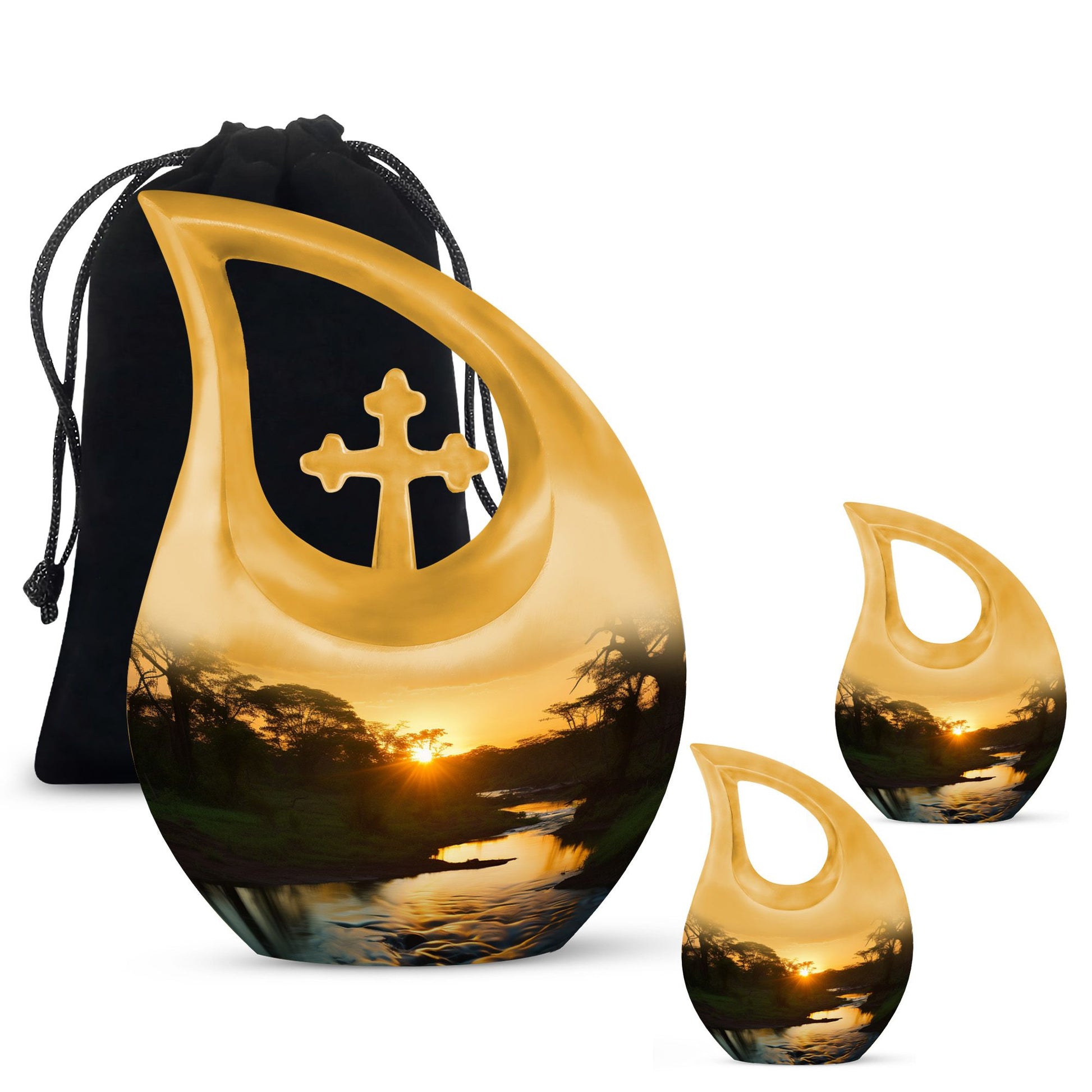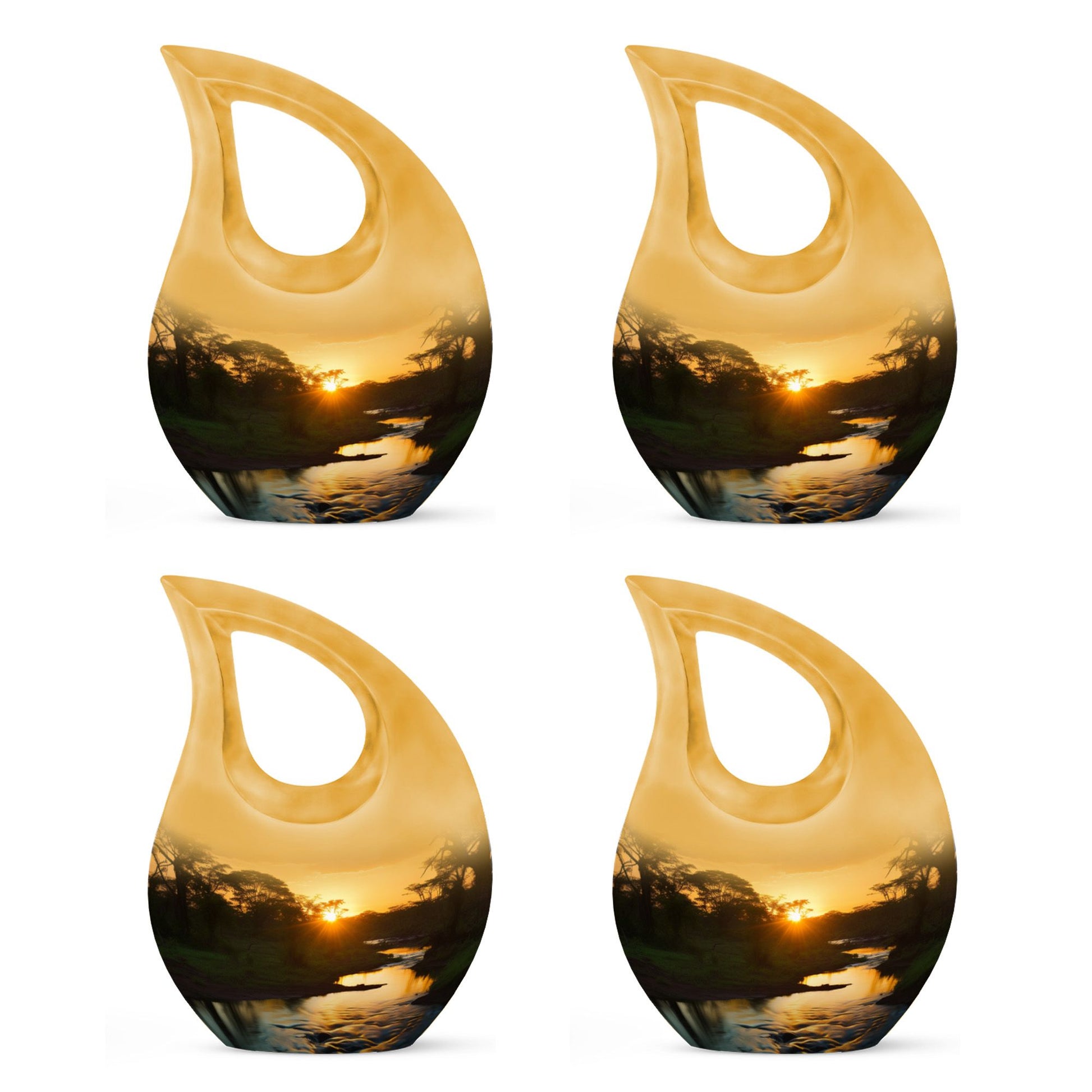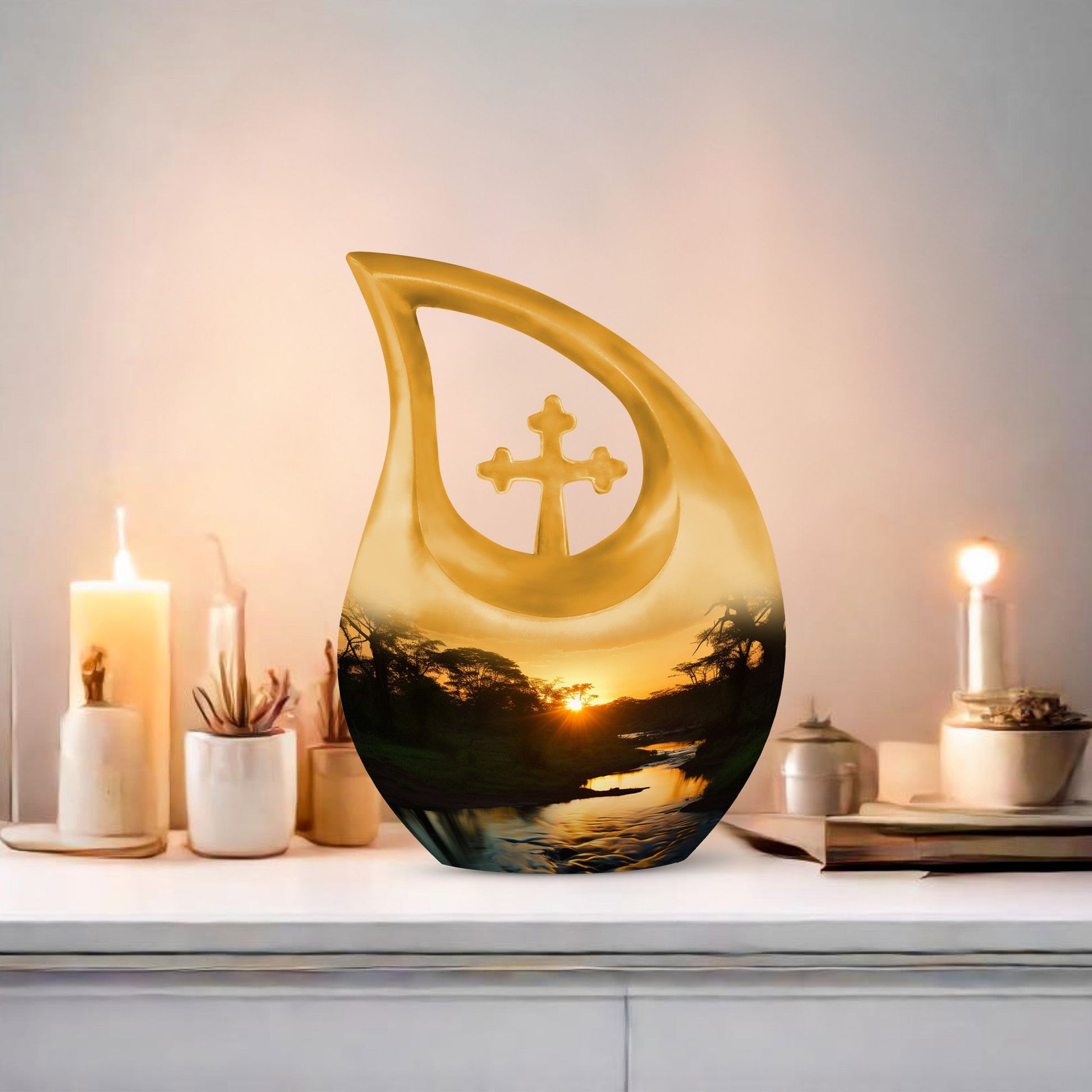 Crafted from durable aluminum, this adult size cremation urn features a radiant sunset landscape with soft horizon tones that evoke hope and lasting love. Its secure screw-top lid ensures long-term protection, making it a dependable cremation urn for adult families who prefer burial or display. The design also pairs beautifully with small urns for cremation ashes, mini cremation urns, or a cremation urn mom selection when honoring shared family memories. Whether used with cremation keepsake urns for human ashes adult or as a standalone tribute, it brings both beauty and strength.