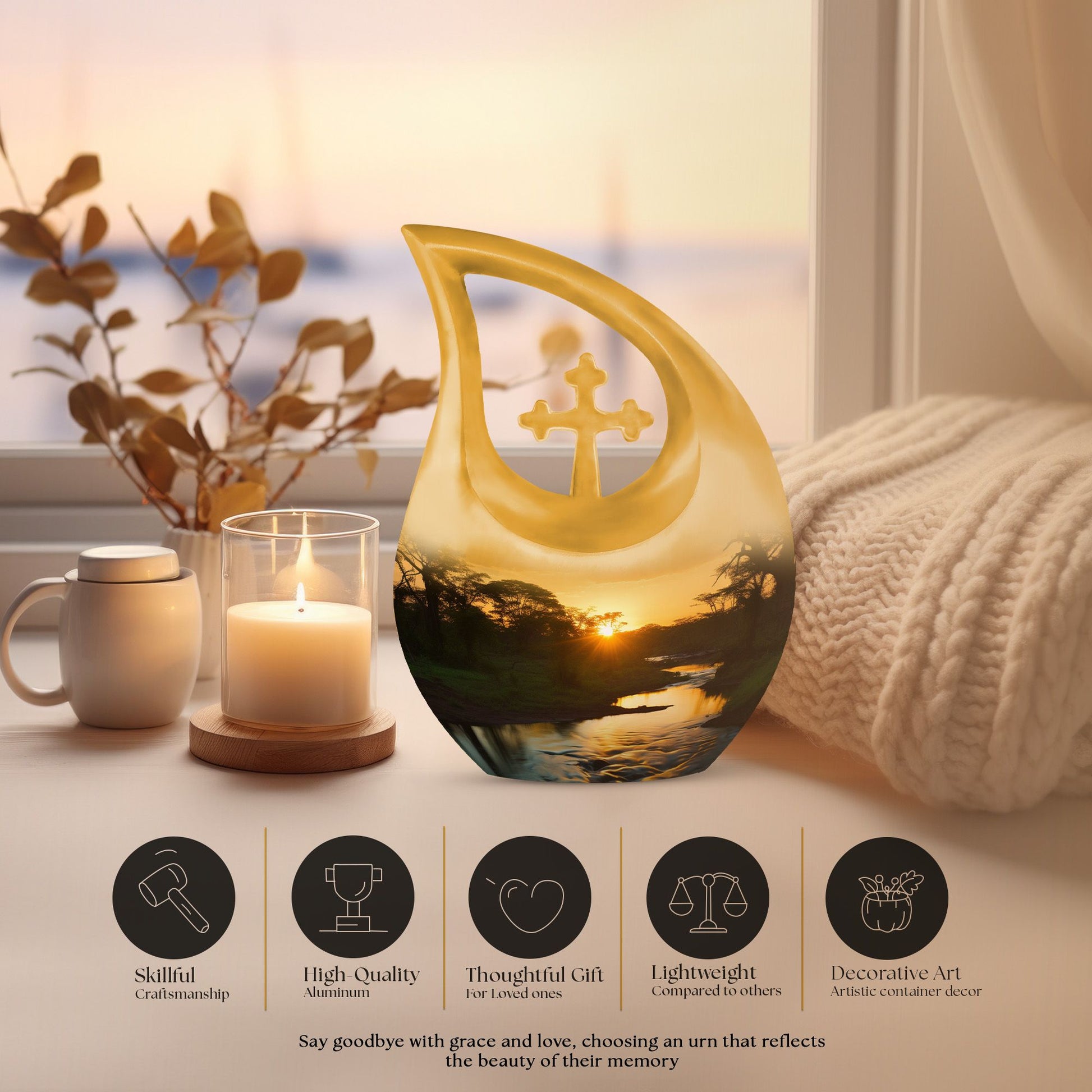 The Sunset Cremation Urn for Burial offers a warm and heartfelt way to honor a cherished life. Designed for families seeking an urn for adult male ashes or cremation urns for adults, this sunset-inspired memorial symbolizes peace, comfort, and a gentle transition into eternal rest. Its serene colors create a meaningful tribute suitable for any remembrance ceremony.