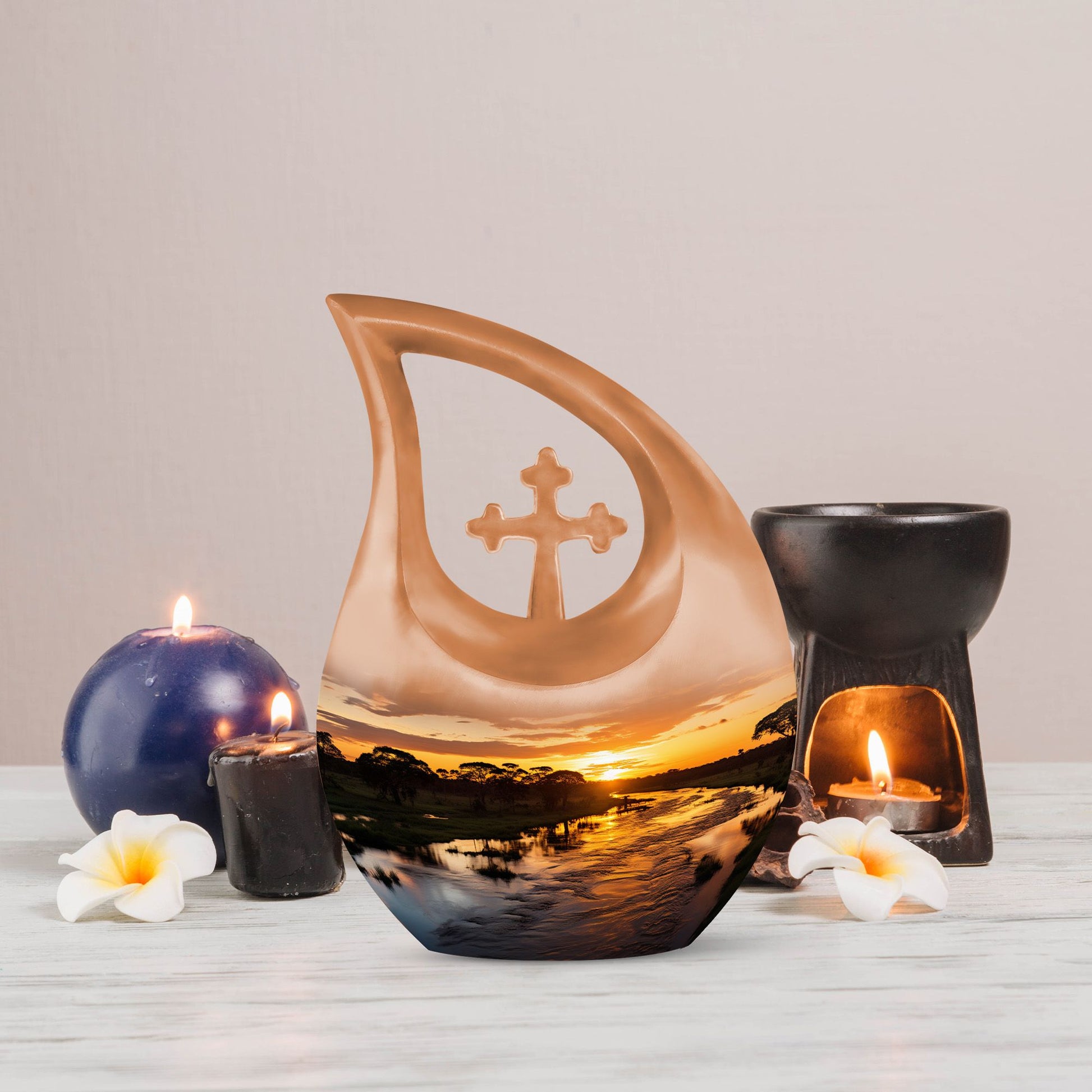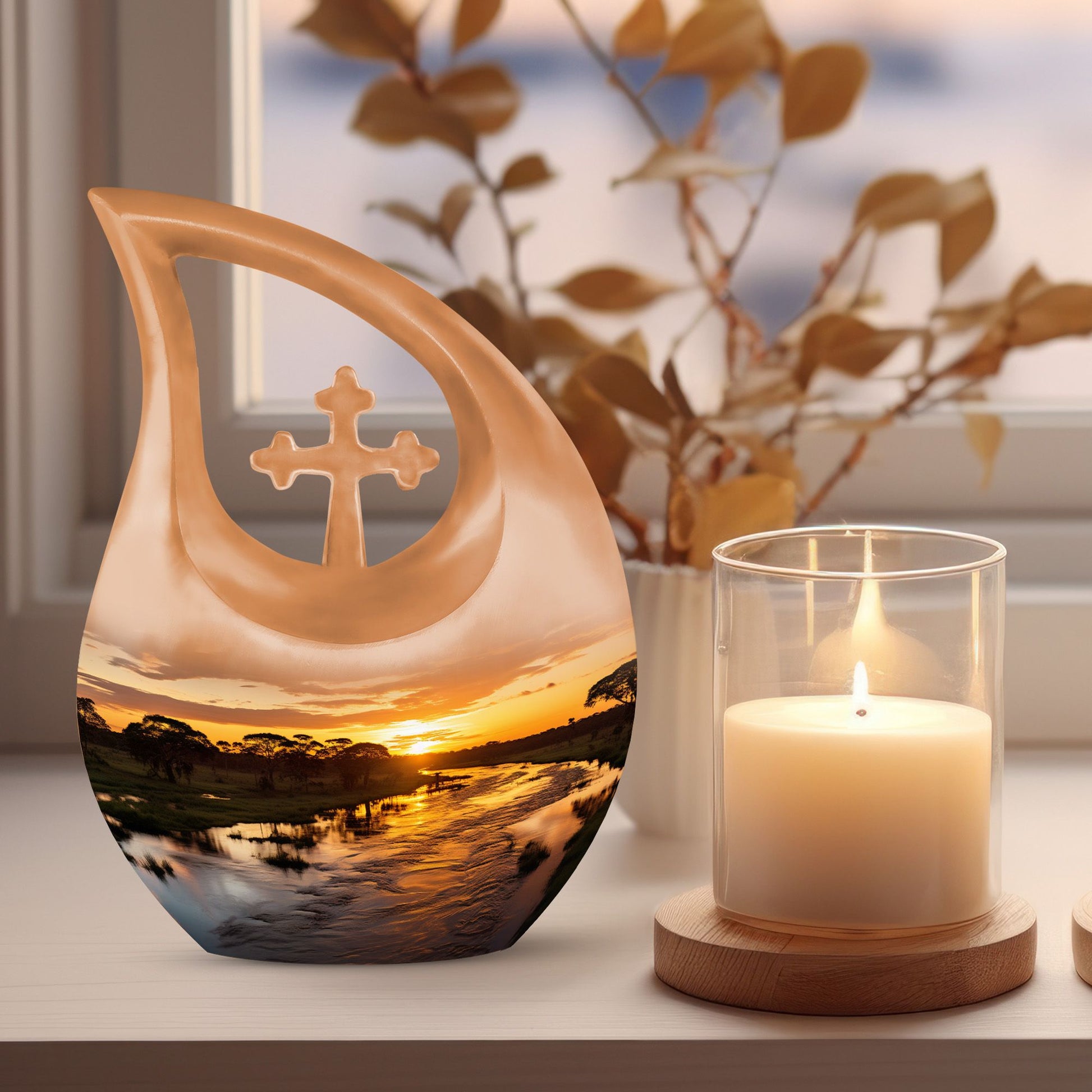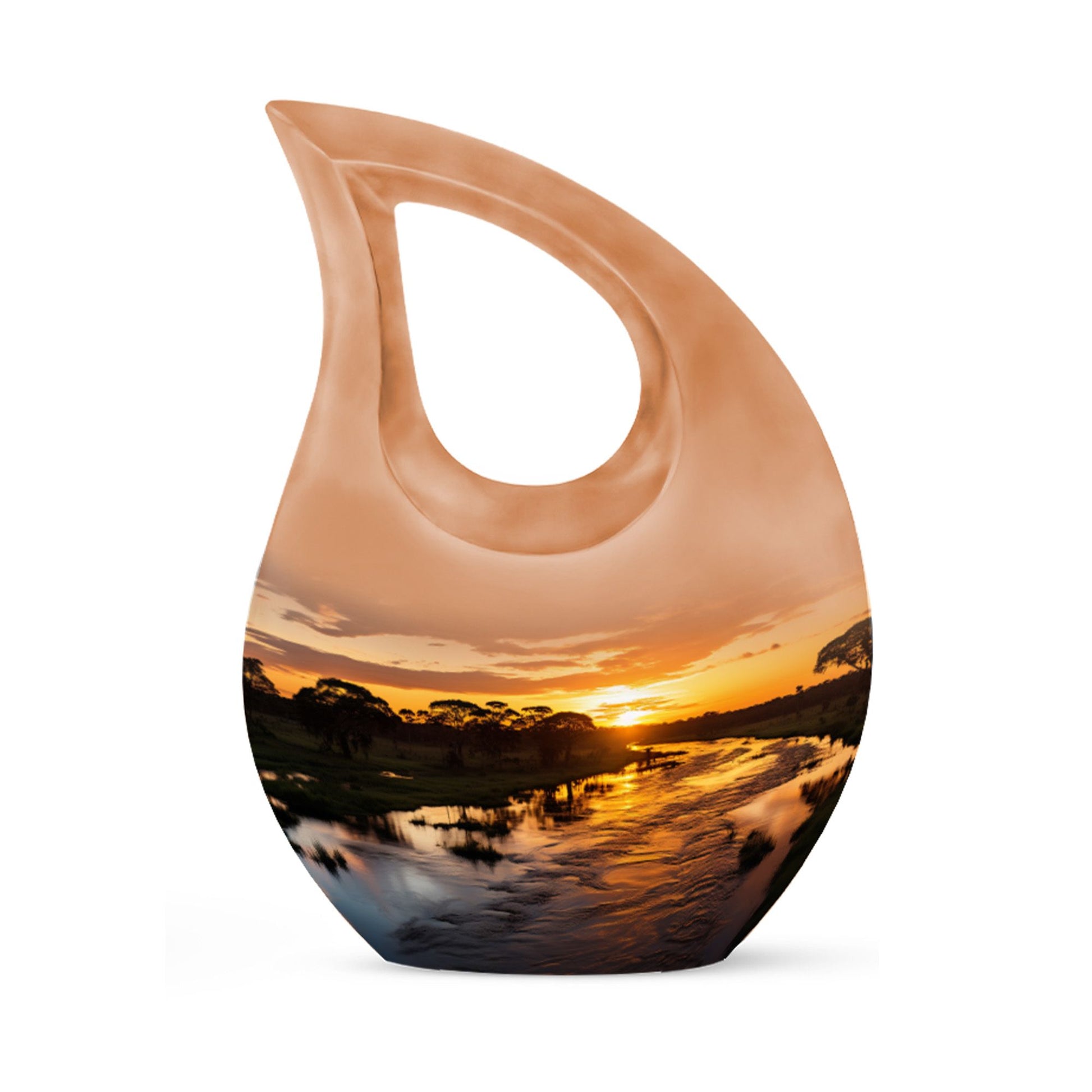 The River Themed Sunset Urn for Adults offers a warm, heartfelt tribute inspired by glowing sunset colors reflecting over a calm river. Created for families seeking a large urn mom or an urn large adult male, this design symbolizes peace, reflection, and the enduring beauty of cherished memories.