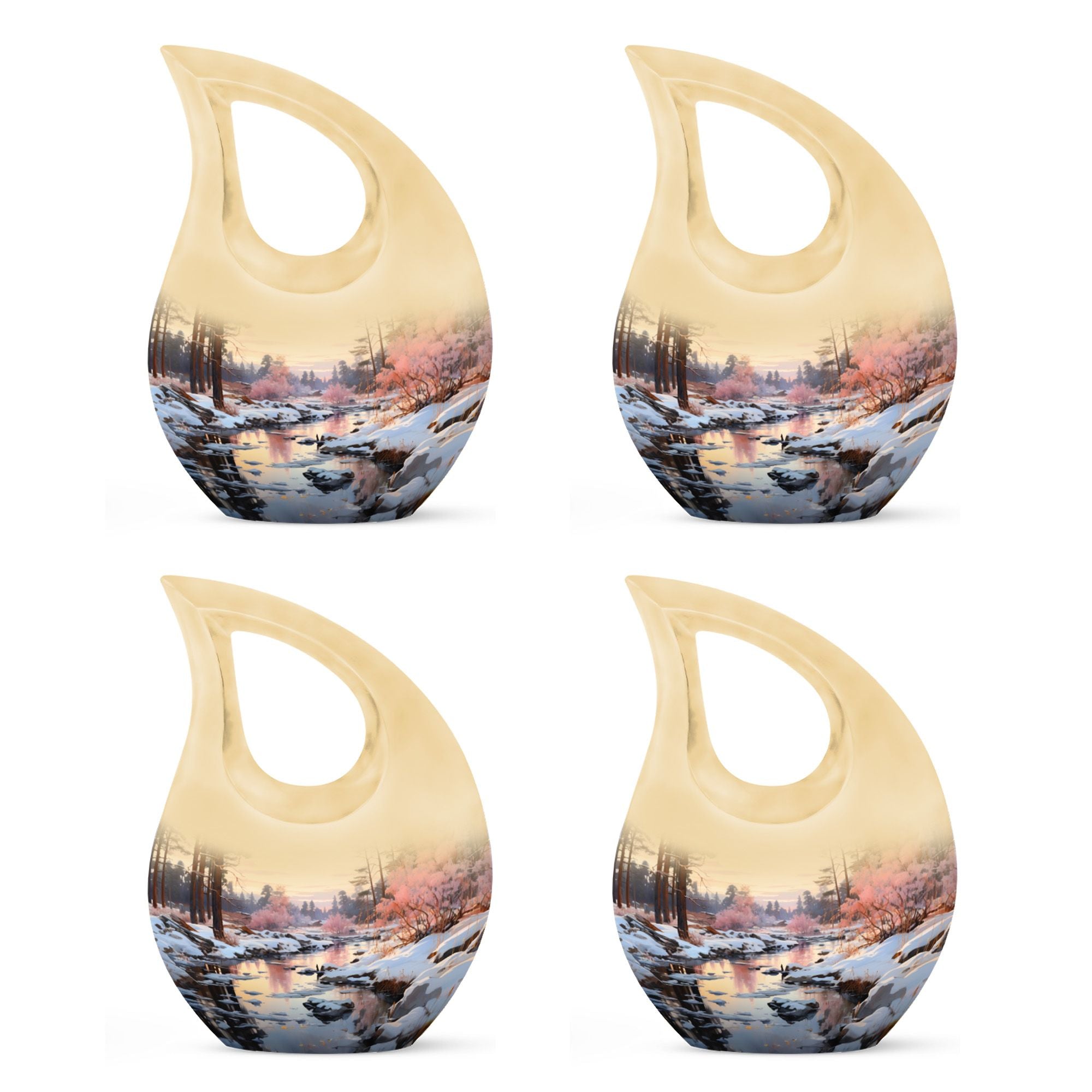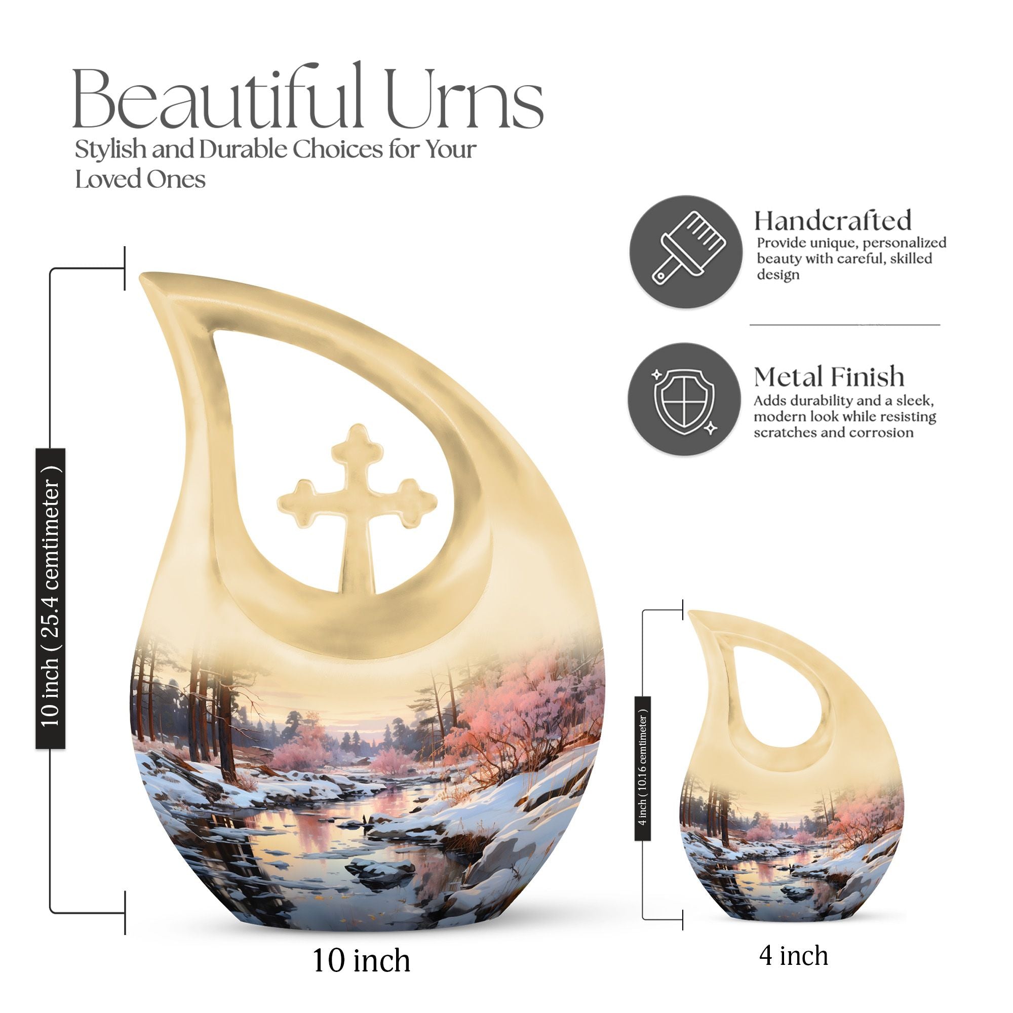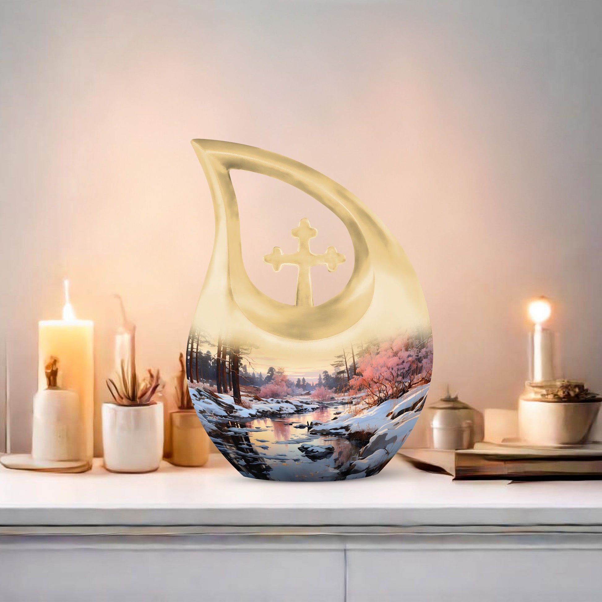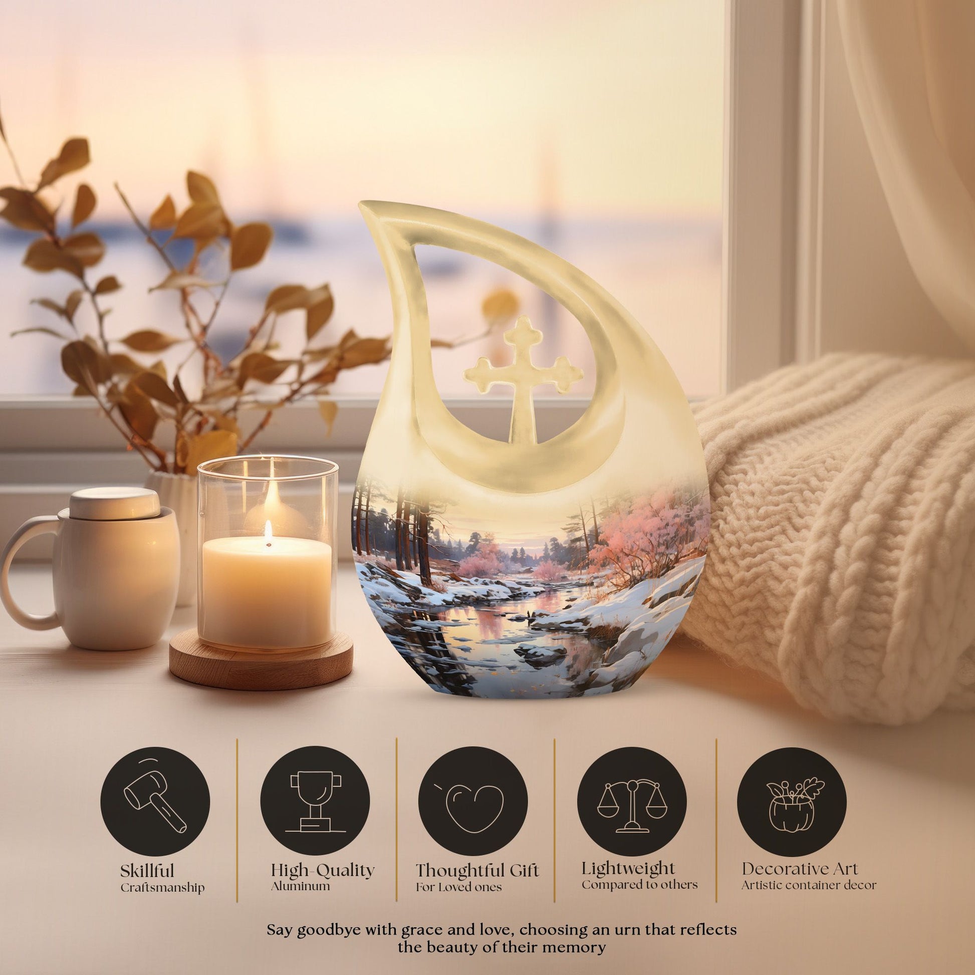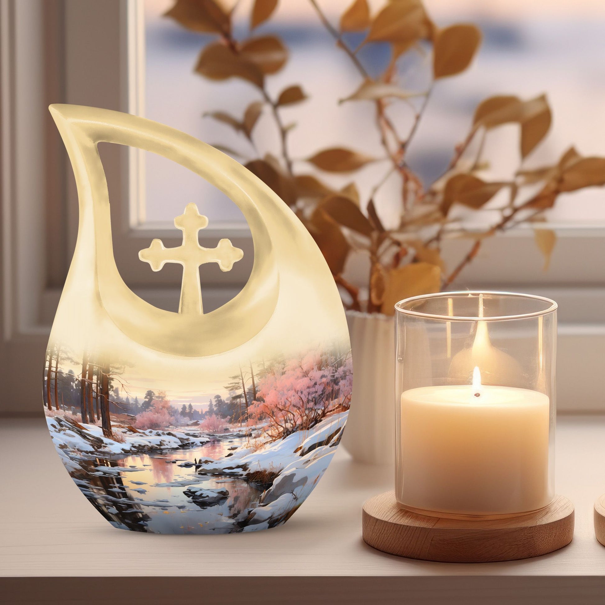 Crafted from durable aluminum, this urn features a serene landscape design with gentle natural tones that bring a sense of tranquility. The secure screw-top lid ensures long-term protection, making it a reliable choice among adult urns for human ashes men or adult urns for human ashes women. Families may pair it with mini small urns for men, a mini urn for ashes for women, or cremation keepsakes for men to share a portion of ashes with loved ones. Its versatile style also suits those seeking funeral urns for women or an urn for men & women that blends beautifully into any memorial space.