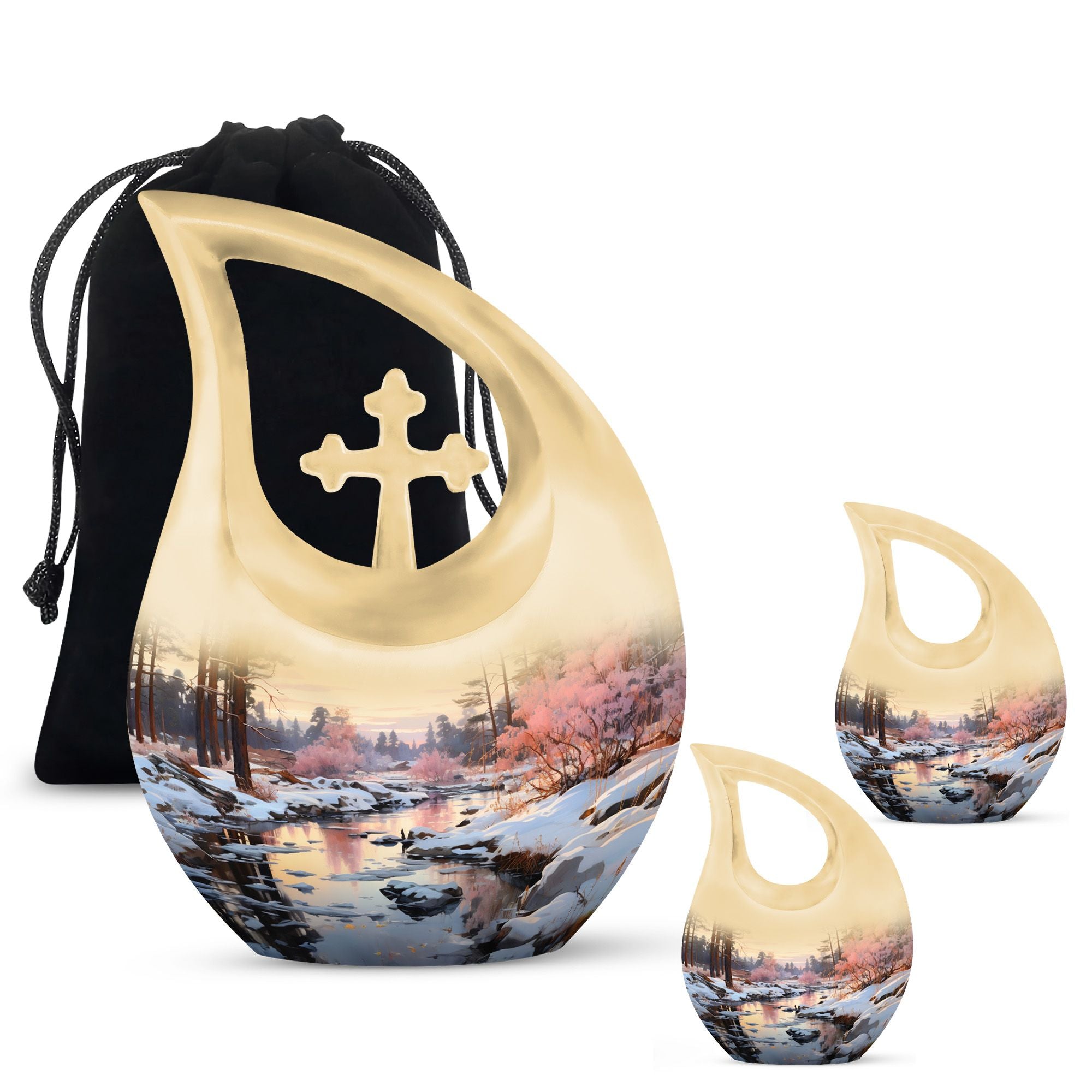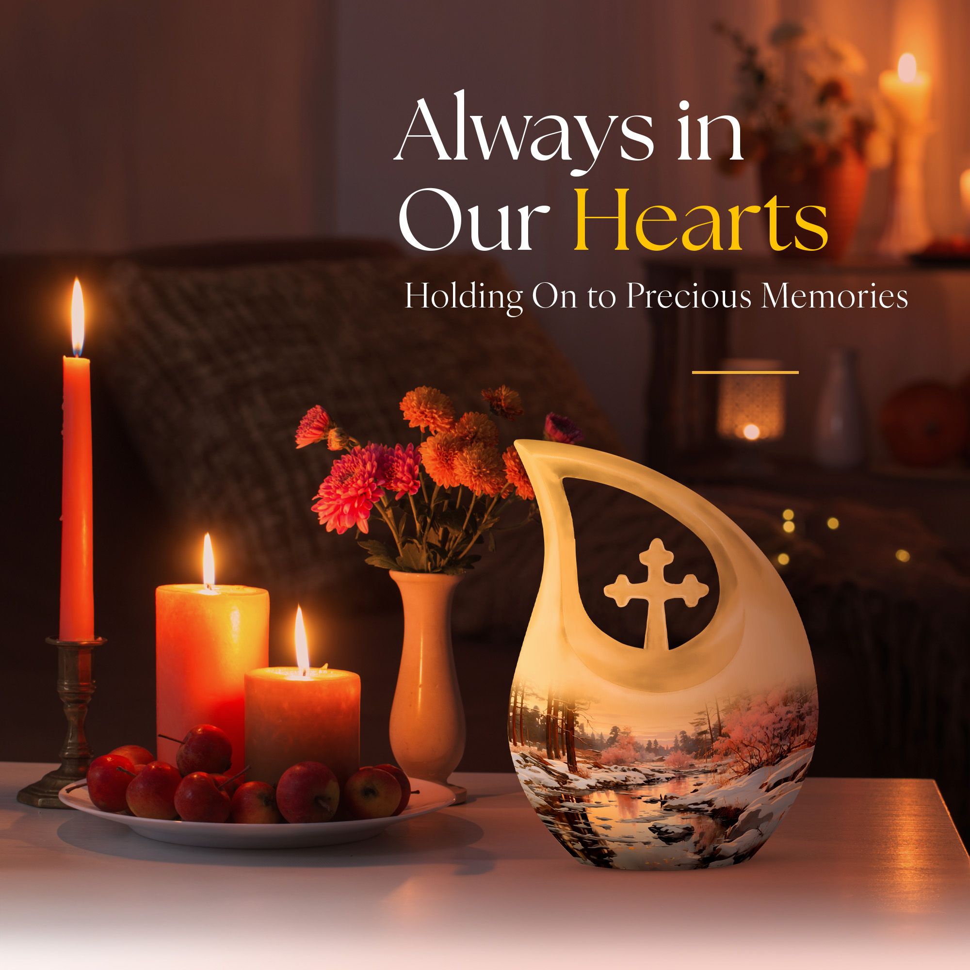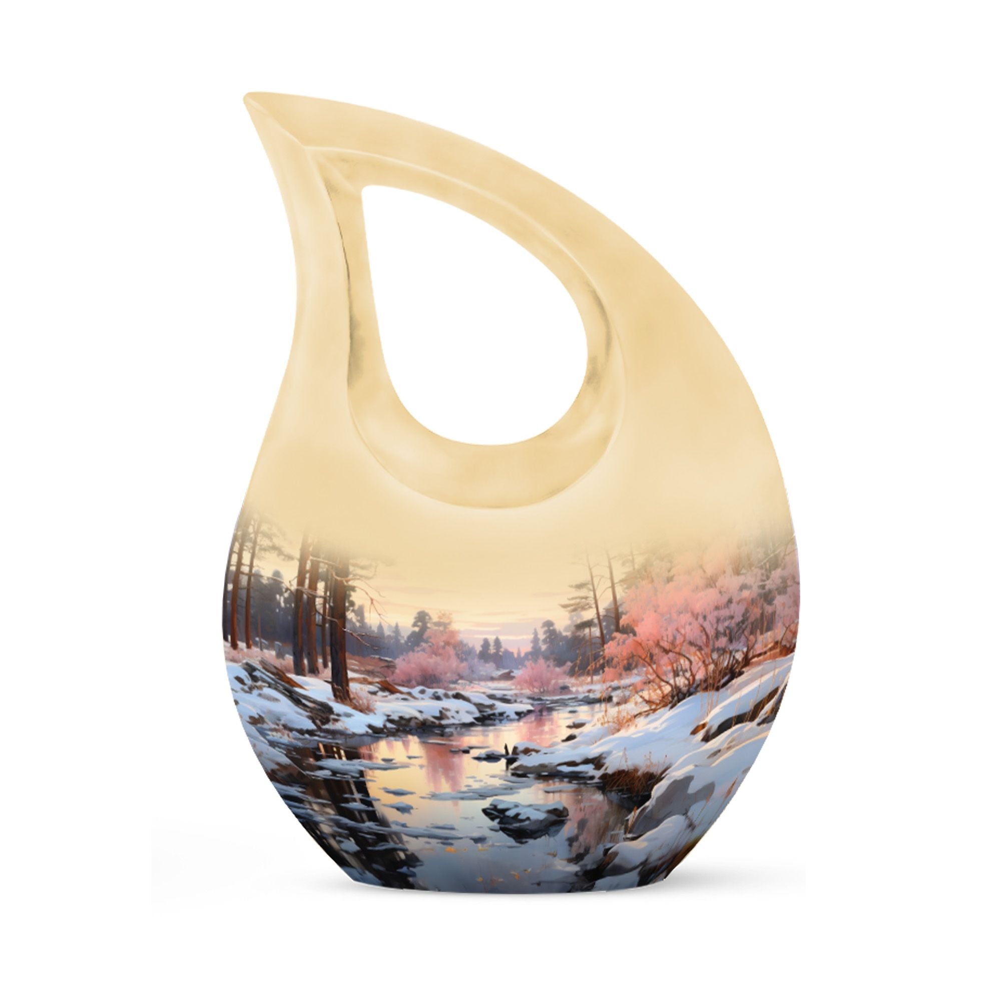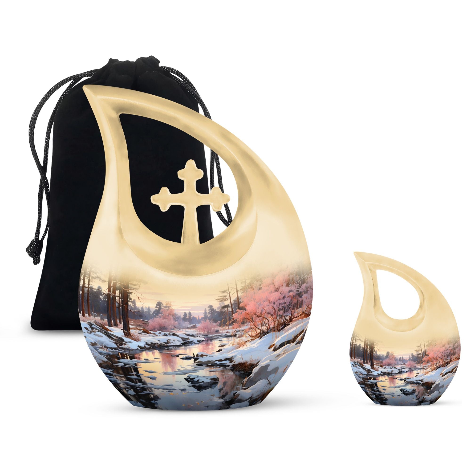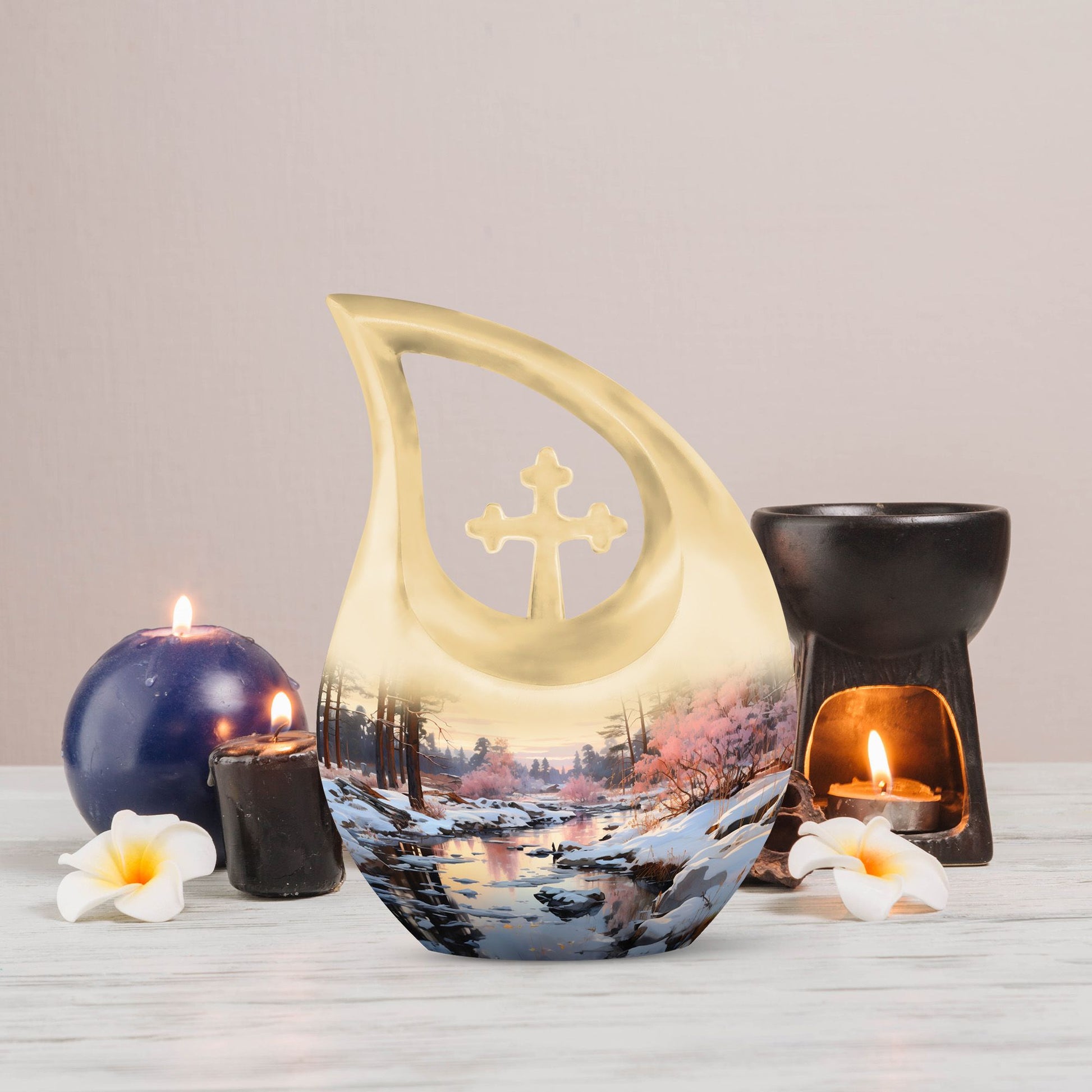 Crafted from durable aluminum, this urn features a serene landscape design with gentle natural tones that bring a sense of tranquility. The secure screw-top lid ensures long-term protection, making it a reliable choice among adult urns for human ashes men or adult urns for human ashes women. Families may pair it with mini small urns for men, a mini urn for ashes for women, or cremation keepsakes for men to share a portion of ashes with loved ones. Its versatile style also suits those seeking funeral urns for women or an urn for men & women that blends beautifully into any memorial space.