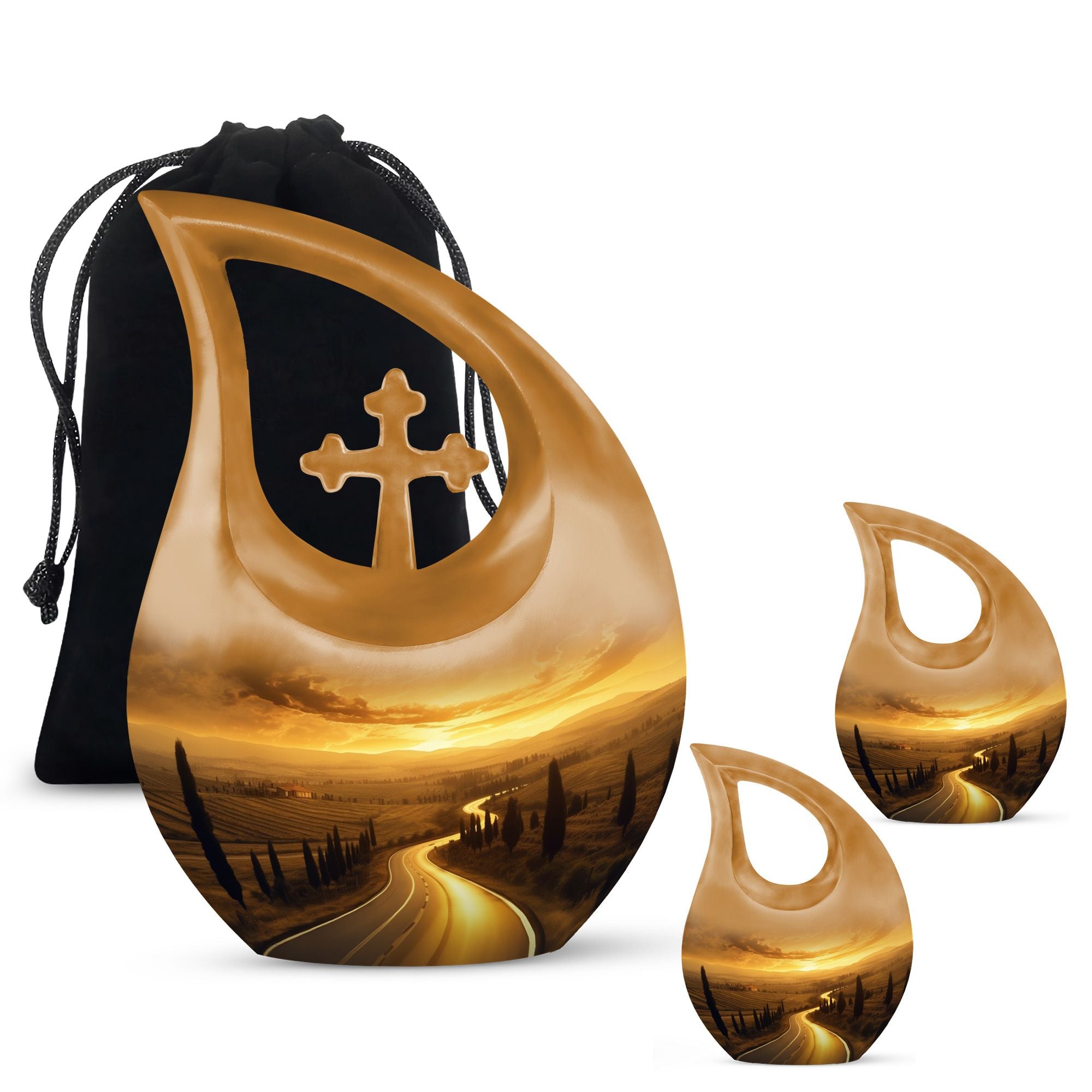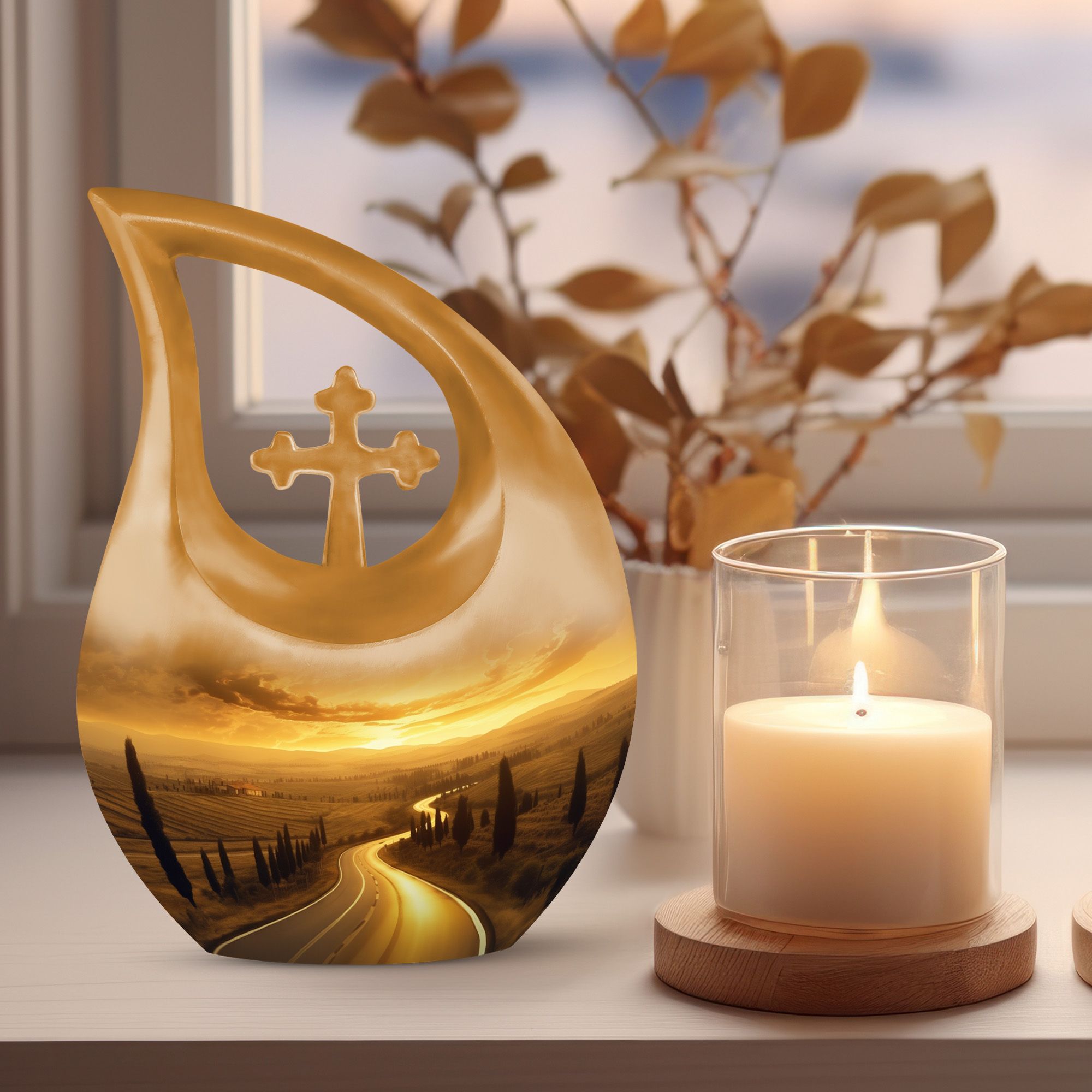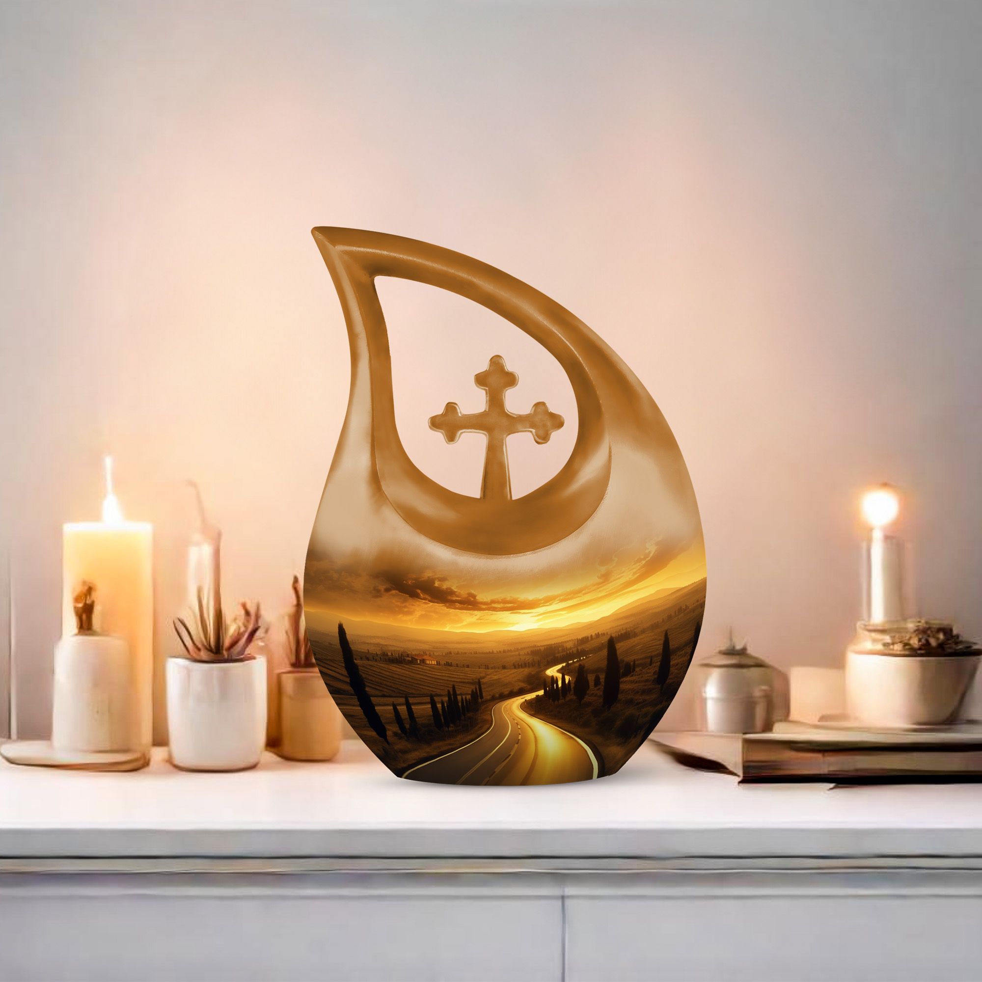 Crafted with durable aluminum and featuring a serene roadway leading into a glowing horizon, this urn blends symbolism and strength. The full-size vessel serves beautifully as an urn for ashes adult male dad, while its matching pieces support families needing small urns for ashes adult male, mini urn for ashes adult male, or urns for cremation ashes female. The secure screw-top lid ensures lasting protection, while the polished finish creates a comforting display for any home or memorial setting.