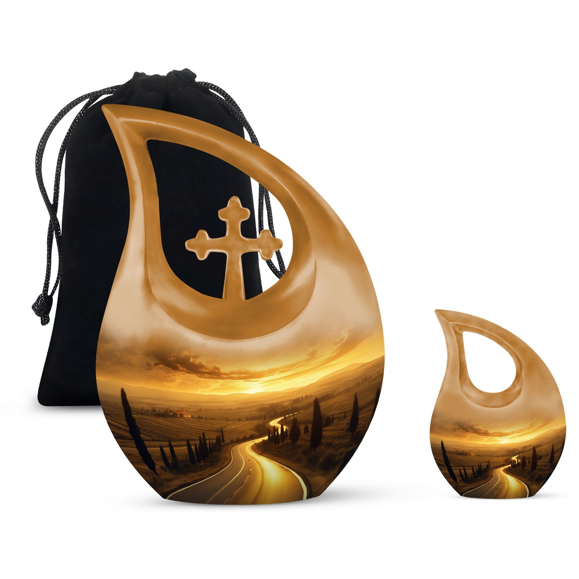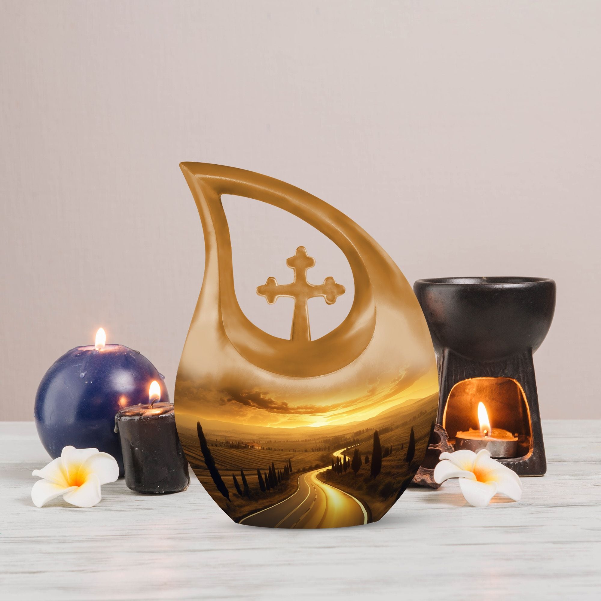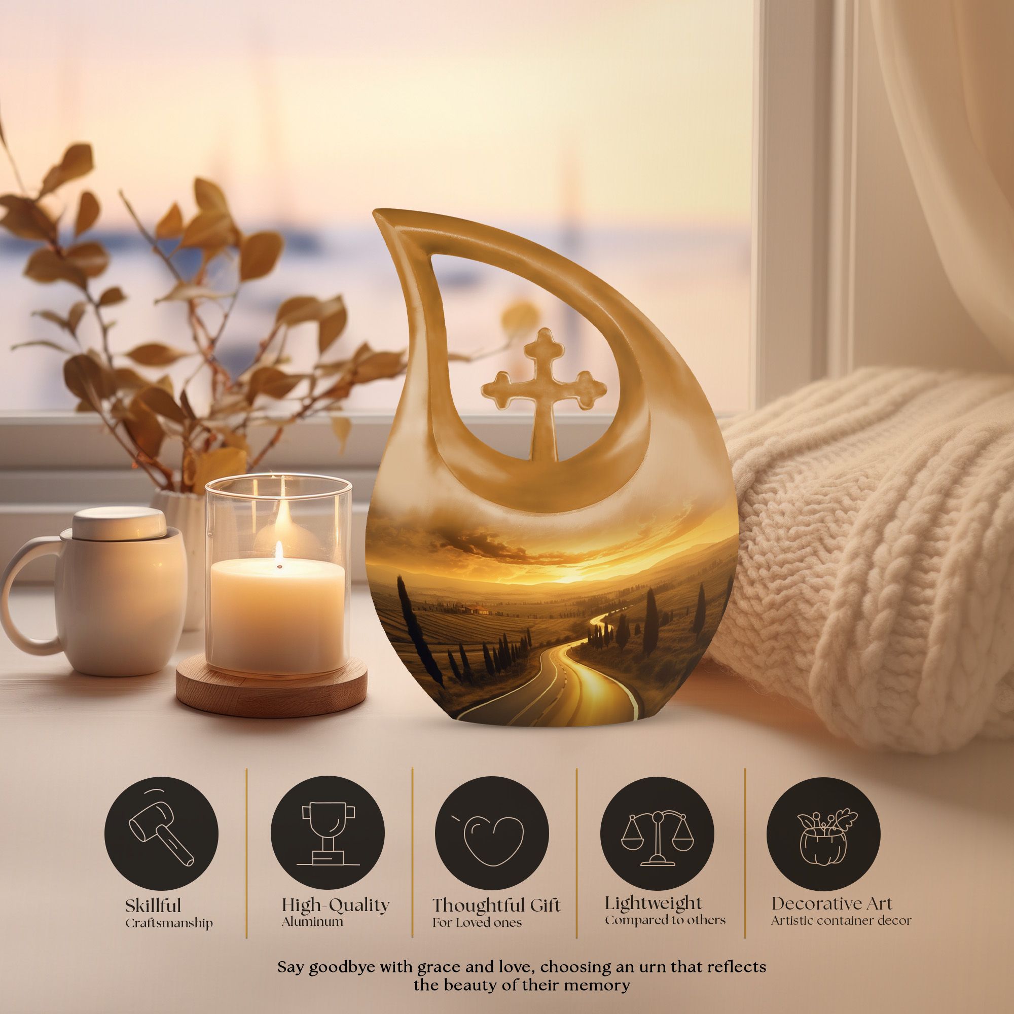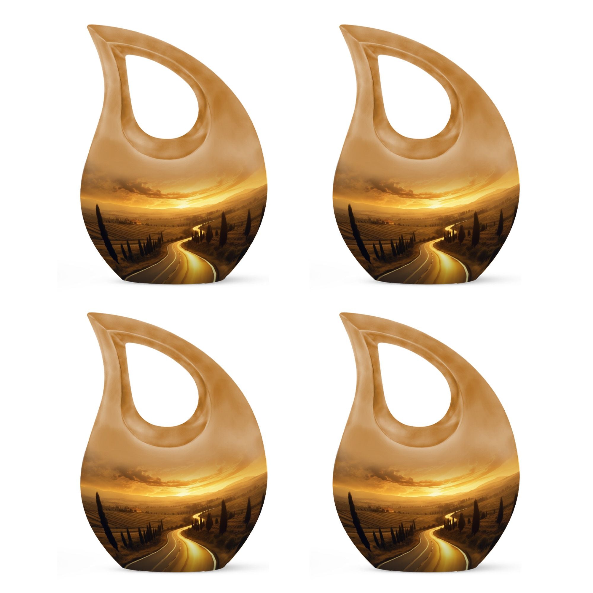 Crafted with durable aluminum and featuring a serene roadway leading into a glowing horizon, this urn blends symbolism and strength. The full-size vessel serves beautifully as an urn for ashes adult male dad, while its matching pieces support families needing small urns for ashes adult male, mini urn for ashes adult male, or urns for cremation ashes female. The secure screw-top lid ensures lasting protection, while the polished finish creates a comforting display for any home or memorial setting.